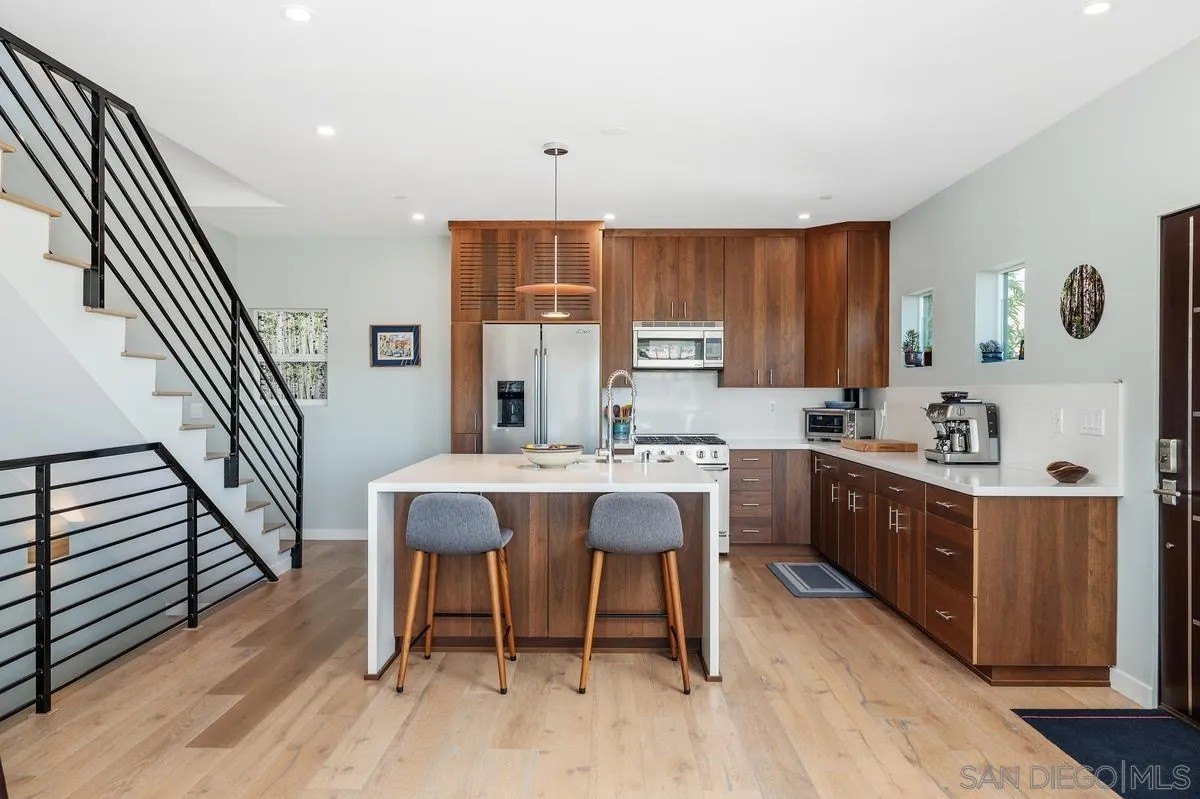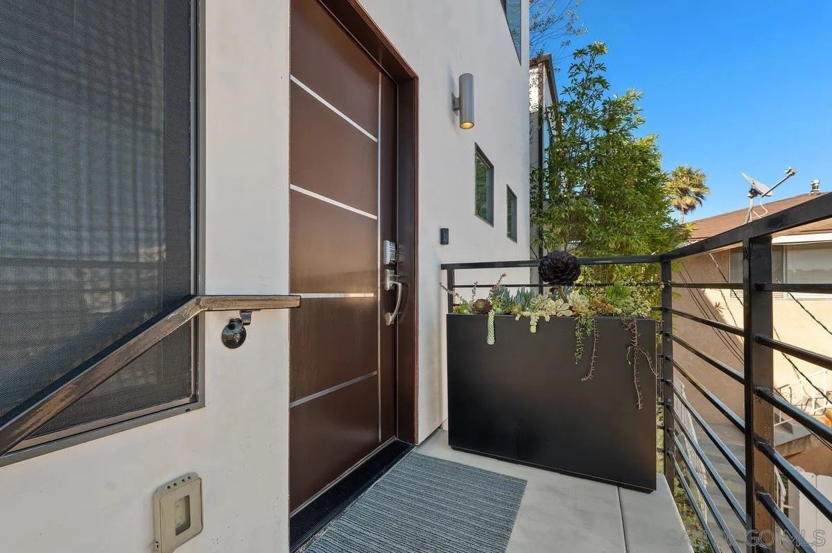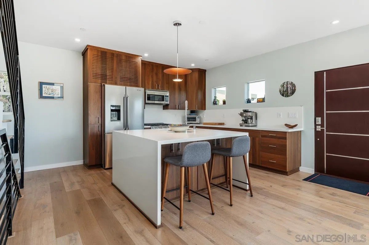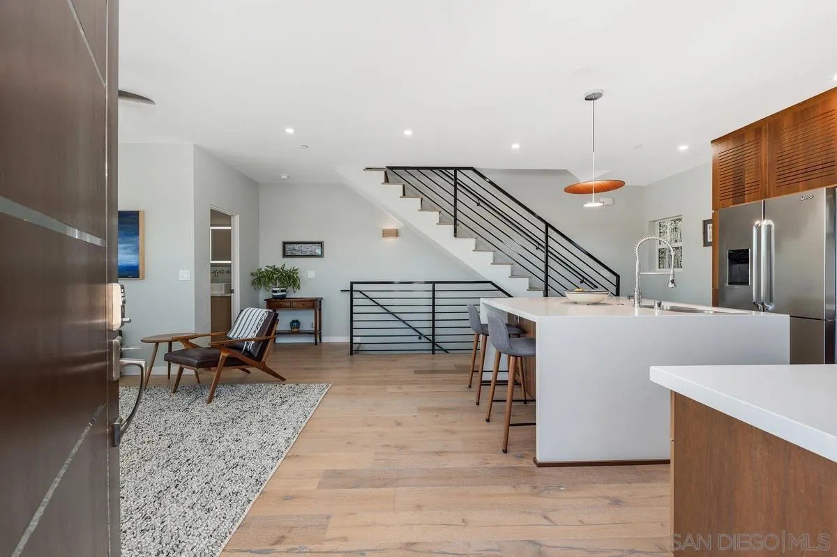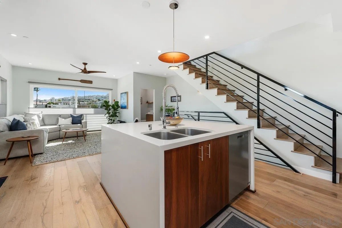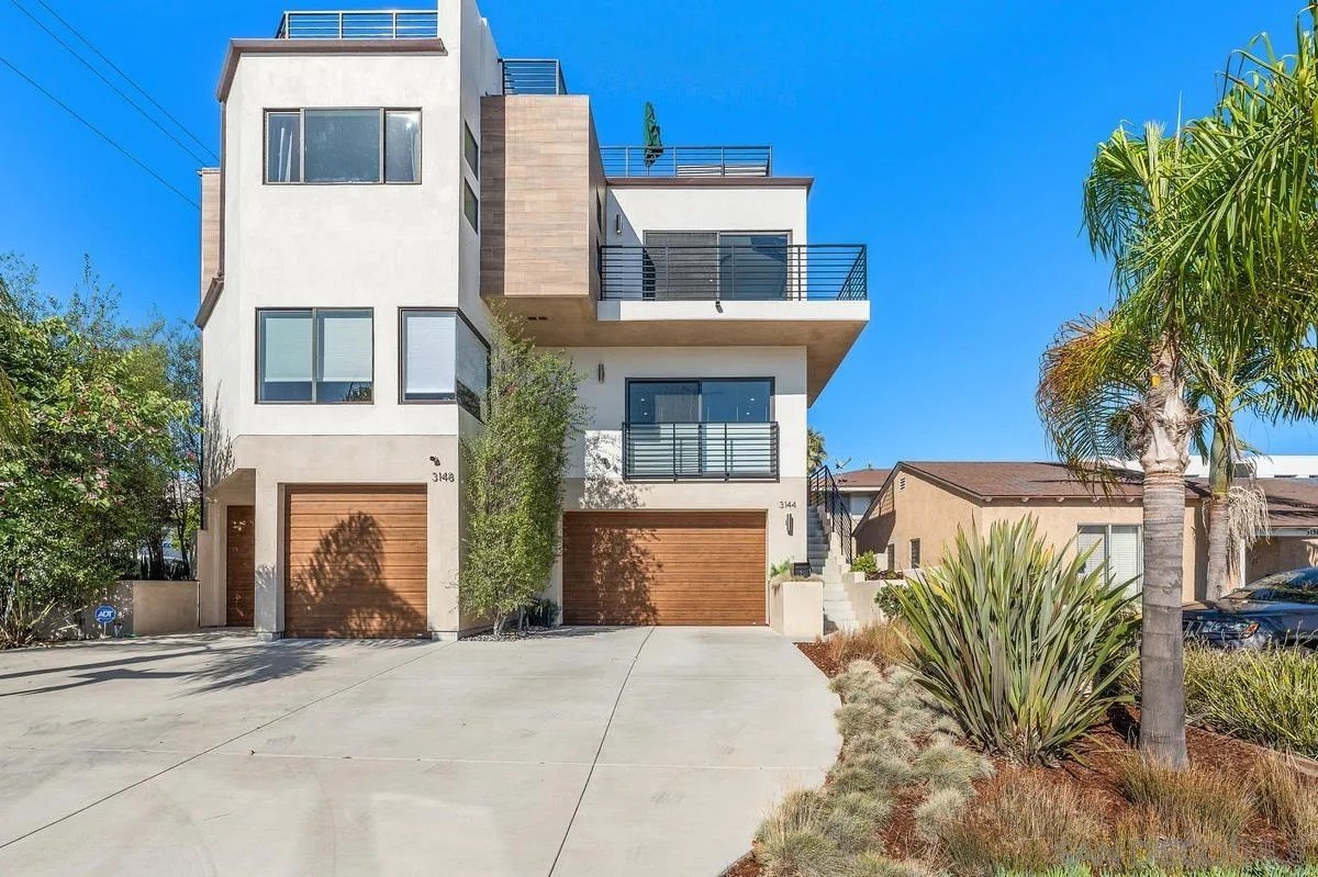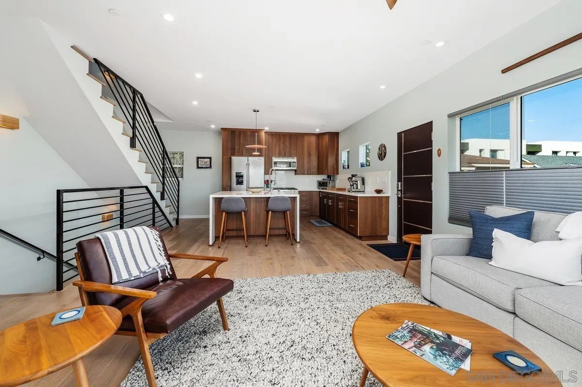 Just three blocks from the Bay in the heart of Point Loma Village, this luxury townhome in the Emerson Corner Complex blends modern design with everyday convenience and stunning views. Built in 2017, the home features an open floor plan with engineered Baltic Oak flooring, Shinnoki cabinetry, a Dacor appliance package, and a white quartz waterfall-edge island with designer lighting. Both upstairs bedrooms include ensuite baths with bay views, while the primary suite offers a private wraparound balcony and custom Elfa walk-in closet. Enjoy panoramic vistas from the private rooftop deck, complete with gas hookup, water spigot, and sink access - perfect for entertaining and watching the Big Bay Boom on the 4th of July! Additional highlights include dual-zone A/C, tankless water heater, LED lighting, Emtek digital hardware, and a smart-home system with Lutron lighting, Ring security, and MyQ garage controls. The two-car garage is equipped with an insulated Martin door with ultra-quiet smart opener. Living here grants easy access to some of Point Loma's most popular spots, including Mitch's seafood, Jimmy Famous Tavern, Ketch, Old Venice, to name a few, and an easy walk to live music at Humphrey's by the Bay. Nearby Shelter Island and Liberty Station add even more dining, entertainment, and coastal recreation options, all just minutes from your front door. With its rare combination of style, comfort, and a walkable waterfront location, this home captures the best of Point Loma living.