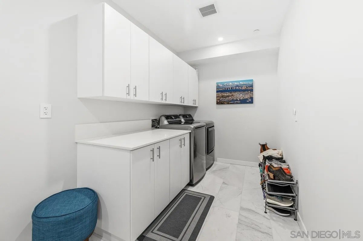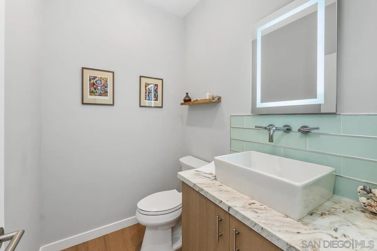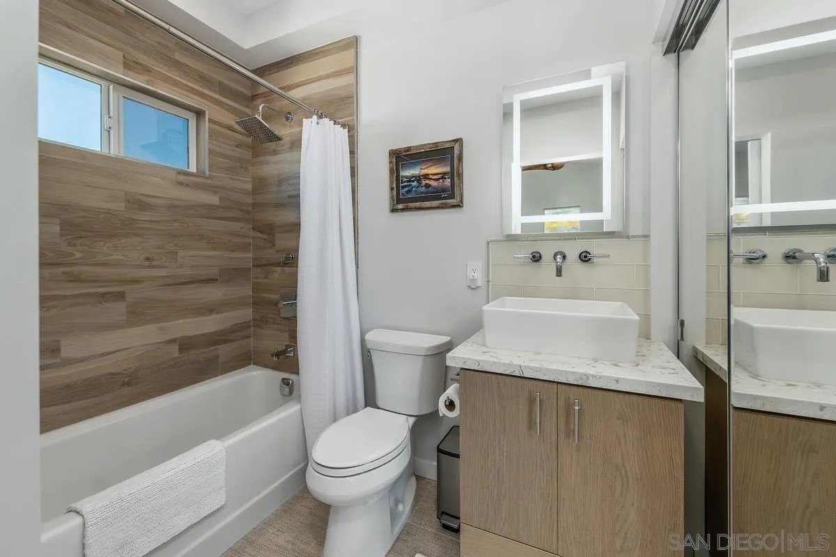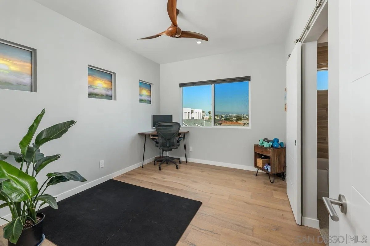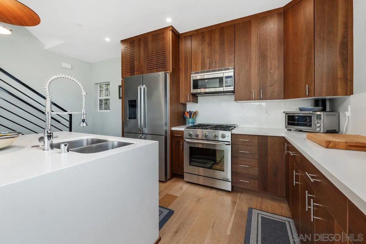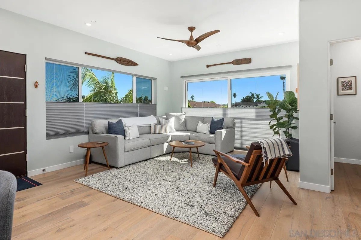 Just three blocks from the Bay in the heart of Point Loma Village, this luxury townhome in the Emerson Corner Complex blends modern design with everyday convenience and stunning views. Built in 2017, the home features an open floor plan with engineered Baltic Oak flooring, Shinnoki cabinetry, a Dacor appliance package, and a white quartz waterfall-edge island with designer lighting. Both upstairs bedrooms include ensuite baths with bay views, while the primary suite offers a private wraparound balcony and custom Elfa walk-in closet. Enjoy panoramic vistas from the private rooftop deck, complete with gas hookup, water spigot, and sink access - perfect for entertaining and watching the Big Bay Boom on the 4th of July! Additional highlights include dual-zone A/C, tankless water heater, LED lighting, Emtek digital hardware, and a smart-home system with Lutron lighting, Ring security, and MyQ garage controls. The two-car garage is equipped with an insulated Martin door with ultra-quiet smart opener. Living here grants easy access to some of Point Loma's most popular spots, including Mitch's seafood, Jimmy Famous Tavern, Ketch, Old Venice, to name a few, and an easy walk to live music at Humphrey's by the Bay. Nearby Shelter Island and Liberty Station add even more dining, entertainment, and coastal recreation options, all just minutes from your front door. With its rare combination of style, comfort, and a walkable waterfront location, this home captures the best of Point Loma living.