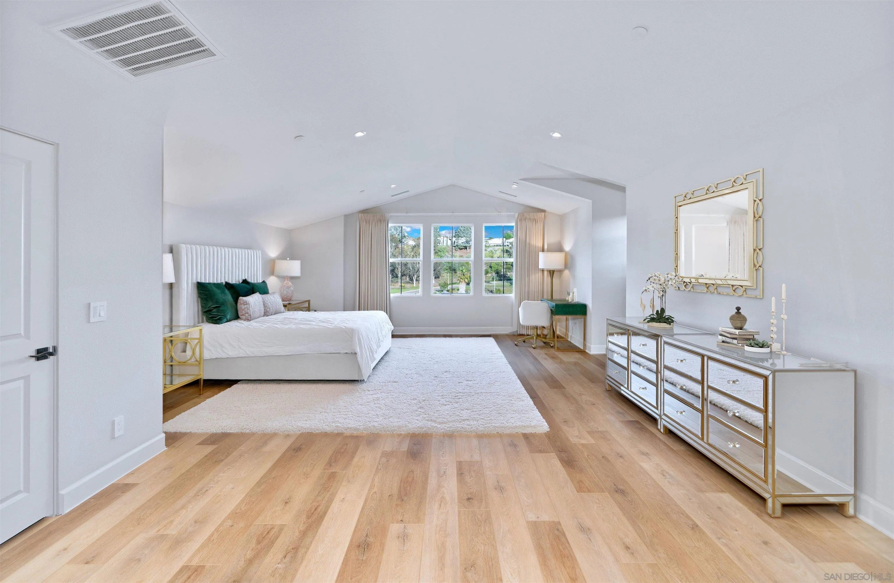 Welcome to 1259 Berryman, a modern coastal retreat in The Enclave, a private community of only 19 distinguished homes in Encinitas. Ideally located minutes to beaches, downtown, shopping, and dining, this property offers privacy and convenience. Set on a flat, 0.51-acre lot, the home features seamless indoor/outdoor living with a south-facing backyard that includes a pool & spa with automatic cover, putting green, outdoor shower, covered kitchen with BBQ + Green Egg grill, fireplace, TV, and a charming playhouse. The 5BR/5.5BA floor plan lives like a single level with dual primary suites-one on the main level and another upstairs-plus an attached ADU with private entry, kitchen, bedroom, and family room. Interiors are enhanced with over $175K in custom lighting, a La Cantina screen door, temperature-controlled wine room, and designer finishes throughout. Additional upgrades include Thermador appliances, Lutron lighting controls, motorized shades, custom drapery, soundproof windows, epoxy garage with EV rough-in, owned solar, and full smart-home integration. A rare blend of coastal convenience, thoughtful design, and resort-style amenities.