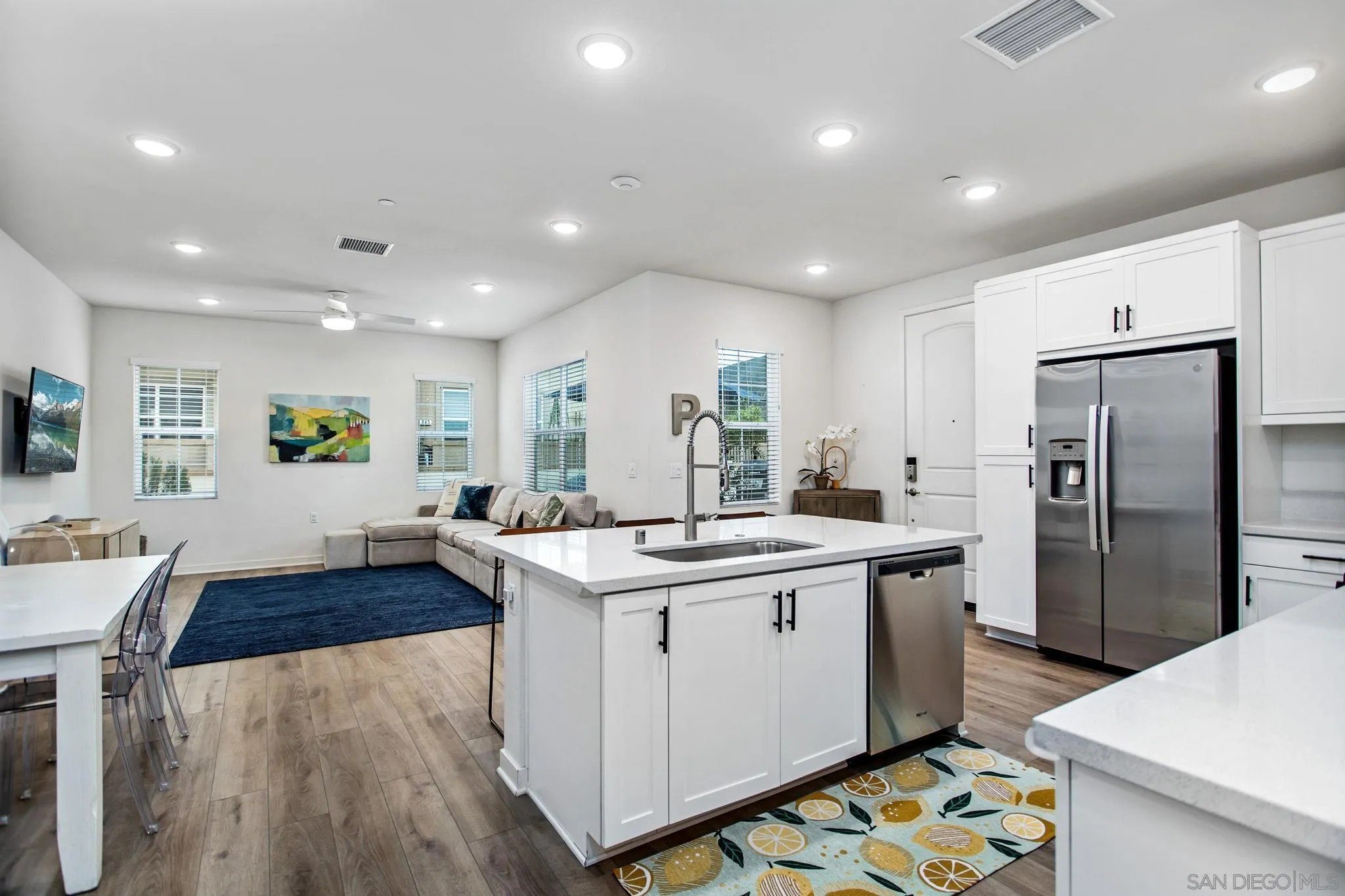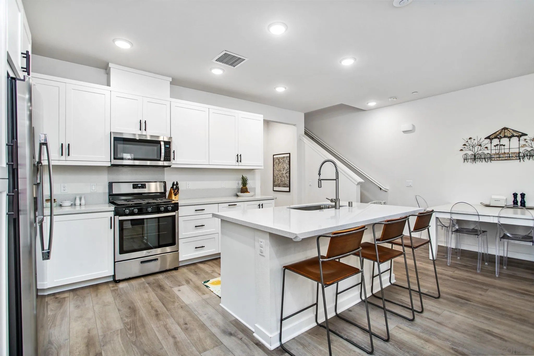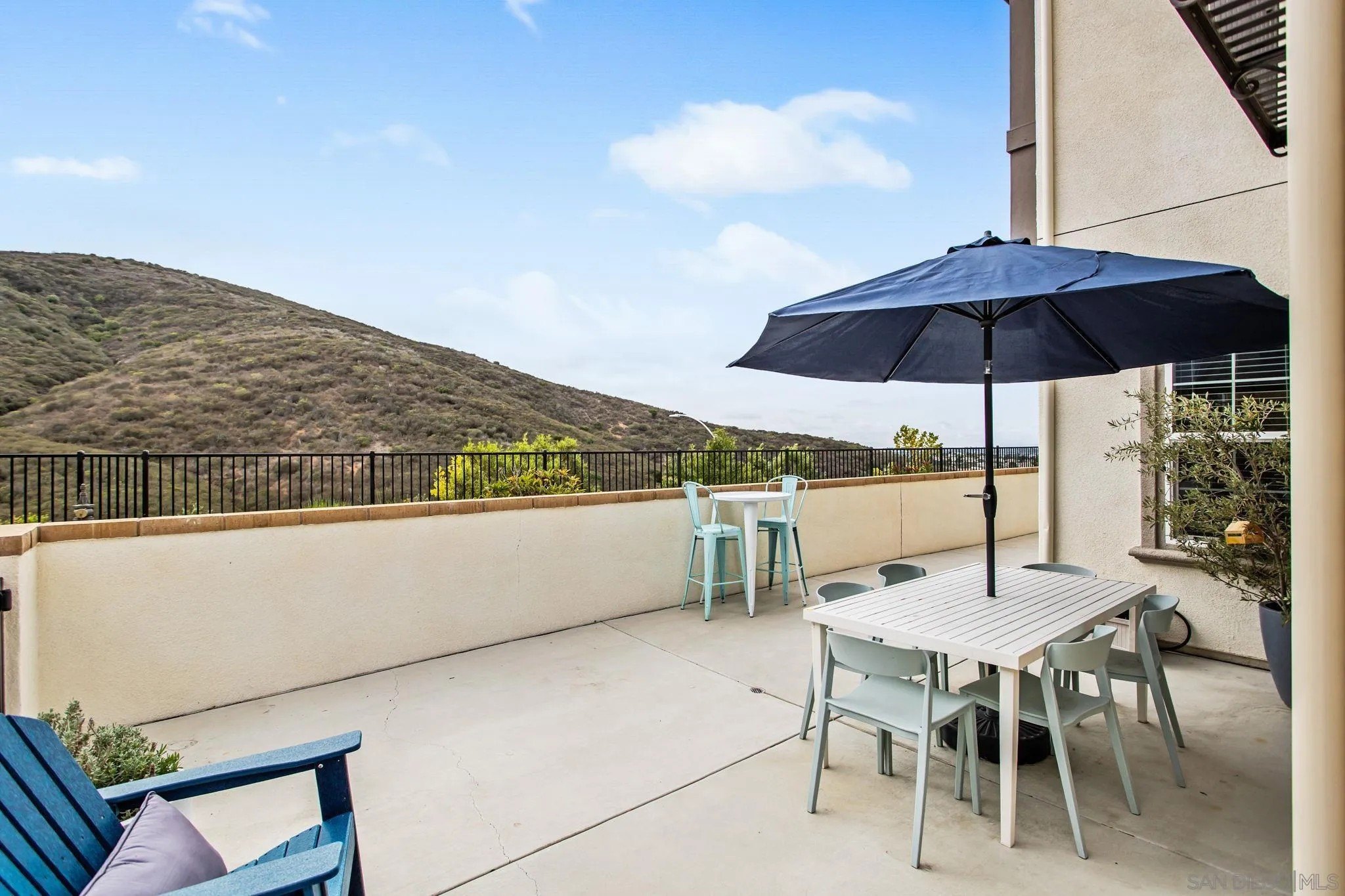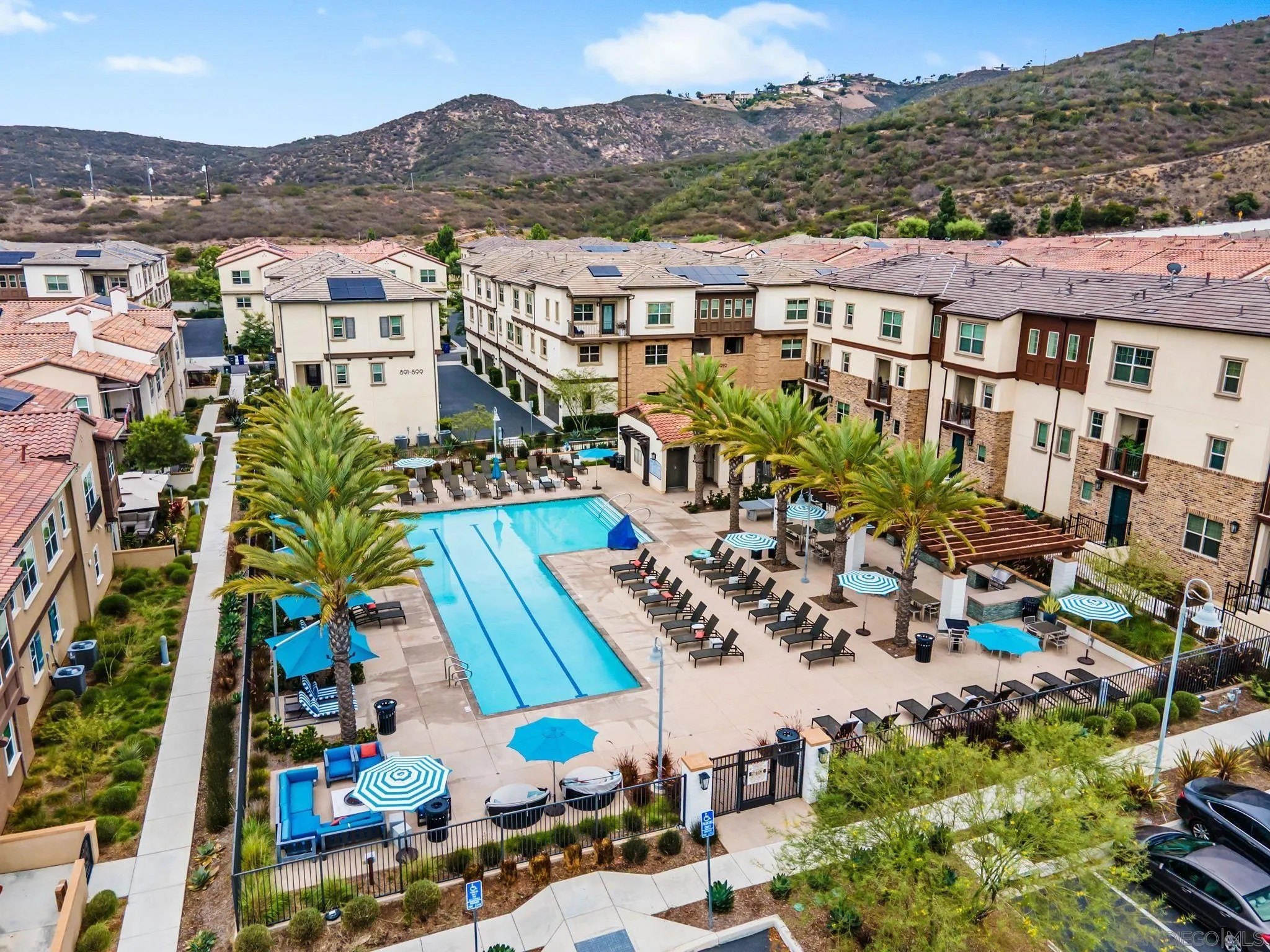 Welcome to Rancho Tesoro! This beautiful corner-unit townhome, built in 2021, is filled with natural light and modern charm. The open floor plan highlights a stylish kitchen with crisp white cabinetry, stainless steel appliances, and a center island with breakfast bar seating that flows into the living room. Upstairs, the spacious primary suite offers a walk-in closet, spa-like en-suite bath, and a Juliette balcony that welcomes in fresh breezes while framing hillside views. Additional features include energy-efficient solar, a private patio with mountain views, and an attached two-car garage. Nestled within the gated communities of Latitude and Skyhaus, residents enjoy resort-style amenities including a sparkling pool, playground, and scenic trails, with a nearby reservoir for fishing and nature walks. Served by highly rated Double Peak K-8 and Mission Hills High School, this home is the perfect blend of comfort, community, and convenience.