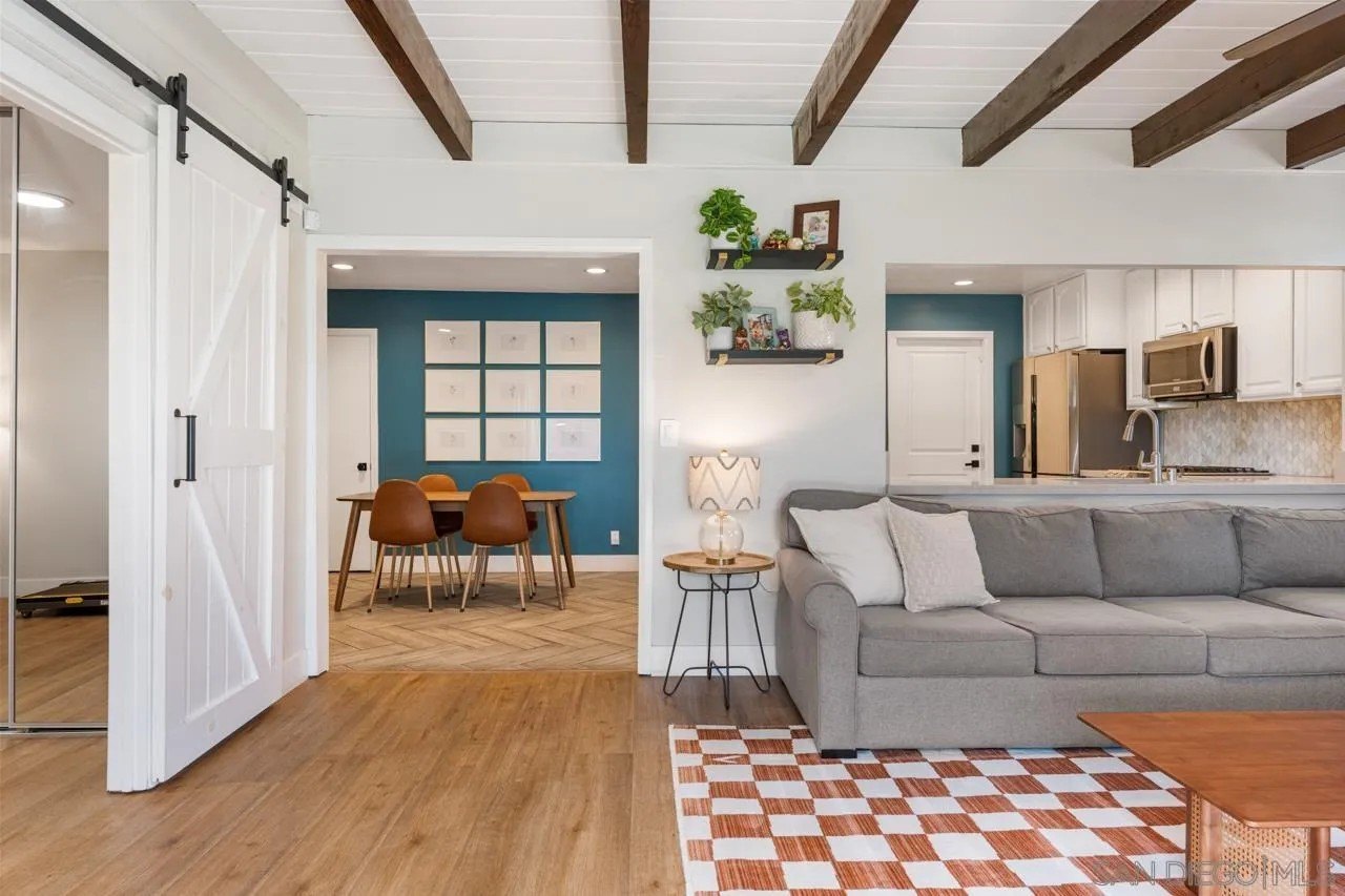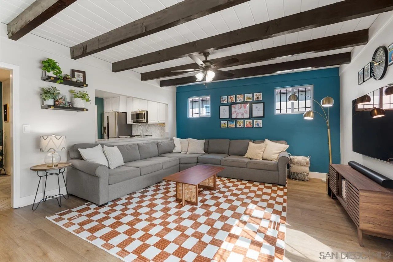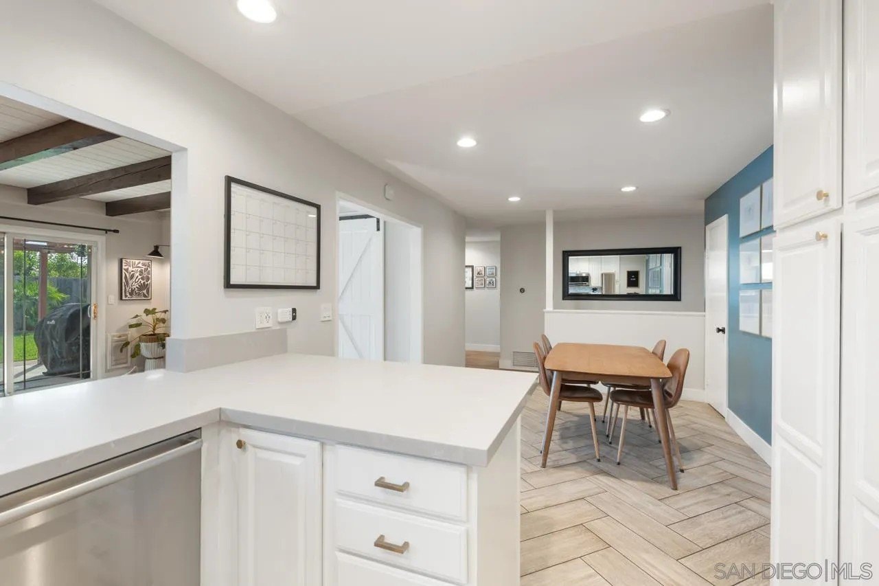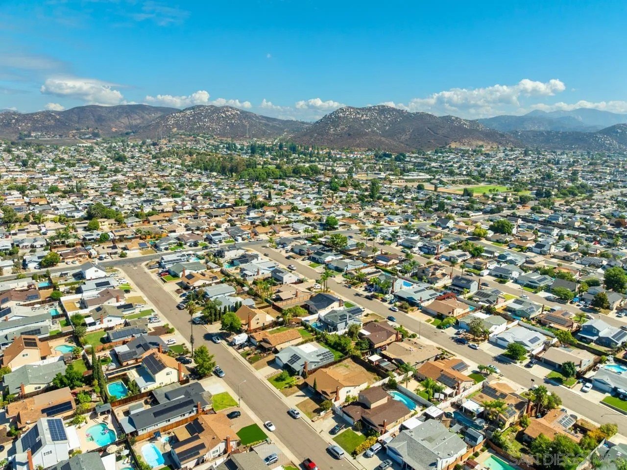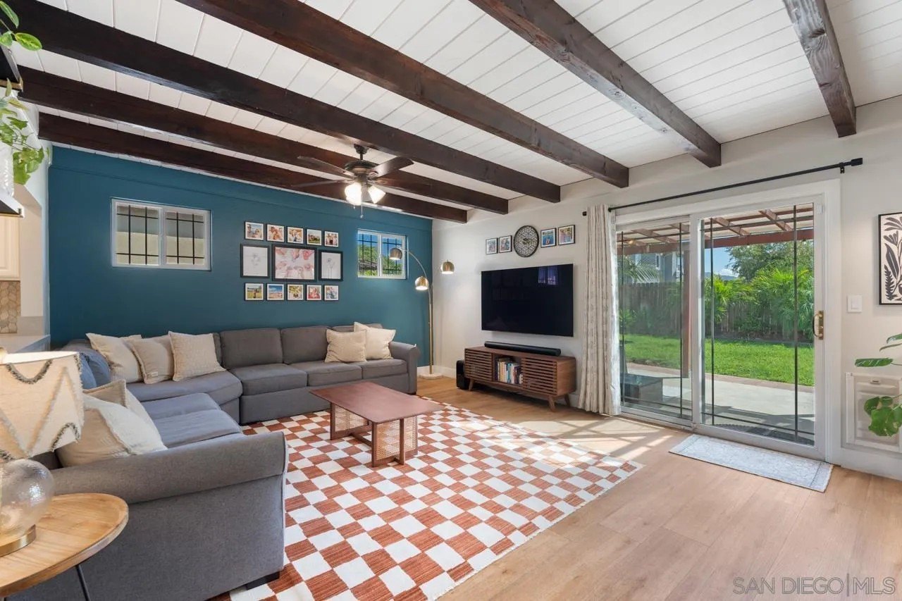 Welcome to 10113 Gem Tree Way in North Santee! Nearly every surface has been updated. The bright kitchen offers quartz counters, marble backsplash, and peninsula seating open to spacious living areas. Family room with vaulted, beamed ceilings connects to a flex room via barn doors, ideal for office, playroom, or guest space. Front living room with fireplace and shutters adds another retreat. Down the hall: three bedrooms, remodeled primary bath, mirrored closets, and LVP flooring. Garage includes workbench, loft storage, and laundry. Backyard features patio, lawn, and peek-a-boo mountain views. Move-in ready with paid solar, EV charger, Nest thermostat, central A/C & heat, plus newer roof and exterior paint. Minutes to Santee Lakes, Trader Joe's, Target, Costco, Sprouts, library, coffee shops, Woodglen Vista Park, Santana High, and two TK-8 schools. A true East County gem!