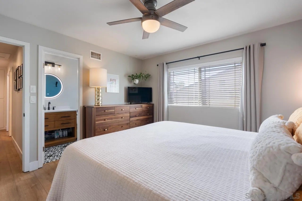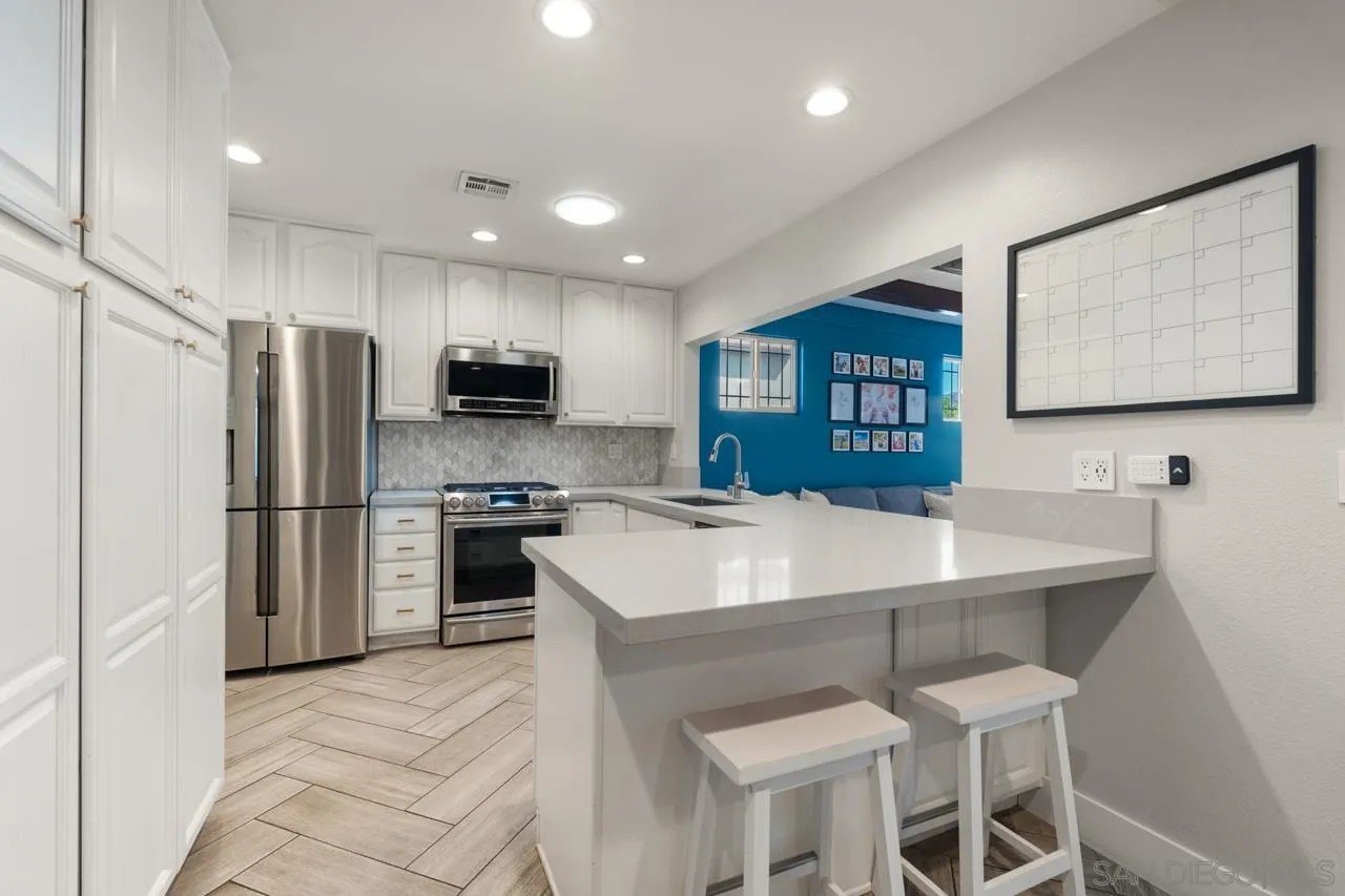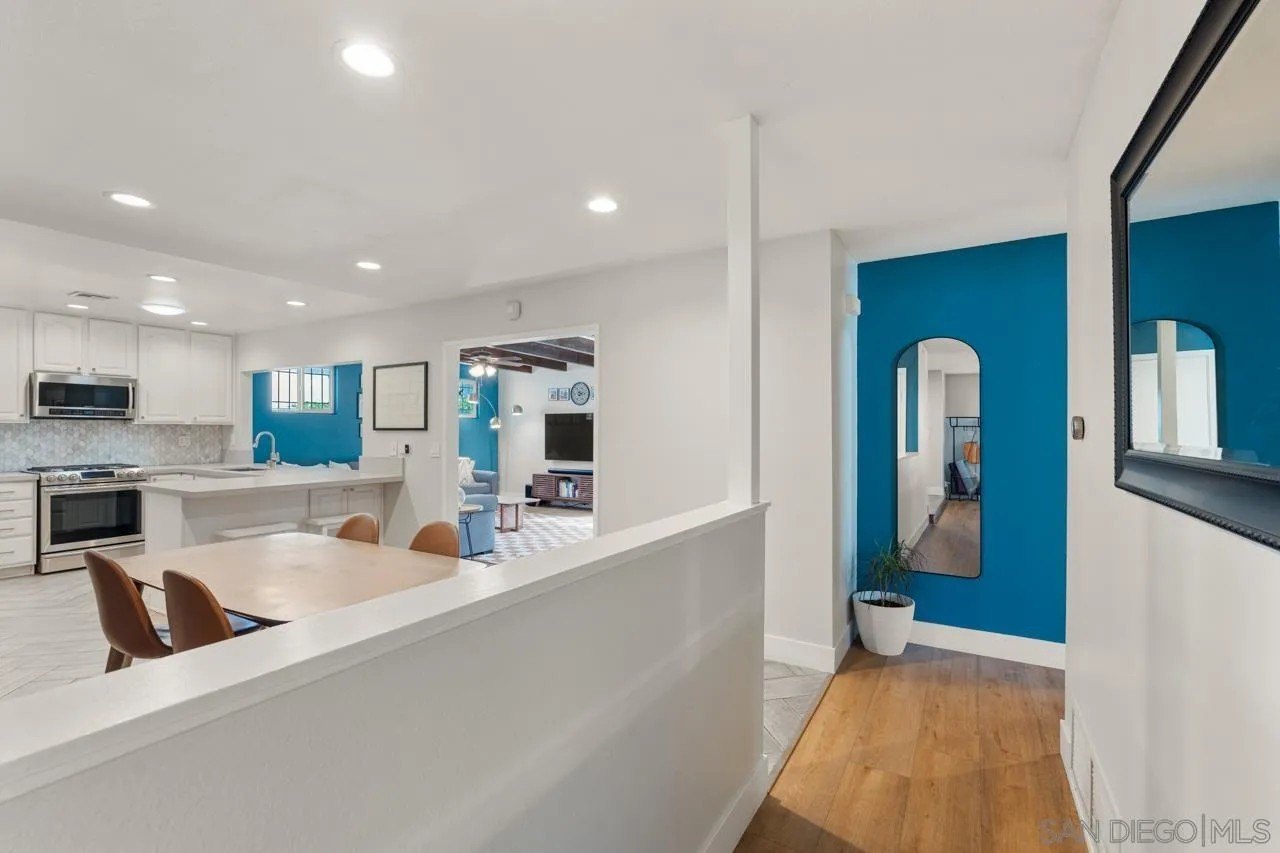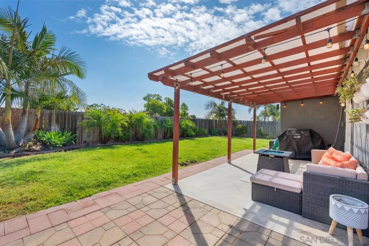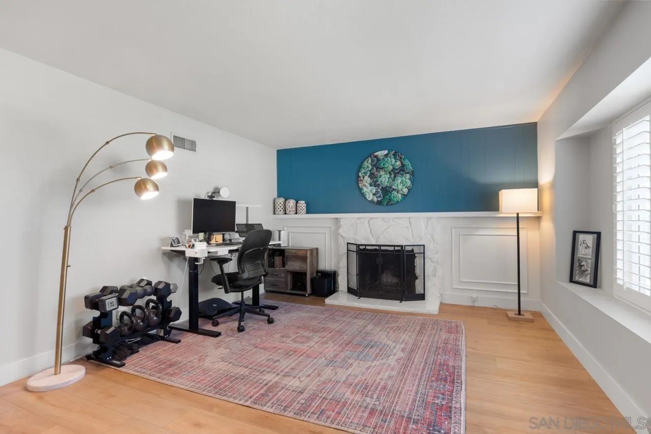Welcome to 10113 Gem Tree Way in North Santee! Nearly every surface has been updated. The bright kitchen offers quartz counters, marble backsplash, and peninsula seating open to spacious living areas. Family room with vaulted, beamed ceilings connects to a flex room via barn doors, ideal for office, playroom, or guest space. Front living room with fireplace and shutters adds another retreat. Down the hall: three bedrooms, remodeled primary bath, mirrored closets, and LVP flooring. Garage includes workbench, loft storage, and laundry. Backyard features patio, lawn, and peek-a-boo mountain views. Move-in ready with paid solar, EV charger, Nest thermostat, central A/C & heat, plus newer roof and exterior paint. Minutes to Santee Lakes, Trader Joe's, Target, Costco, Sprouts, library, coffee shops, Woodglen Vista Park, Santana High, and two TK-8 schools. A true East County gem!