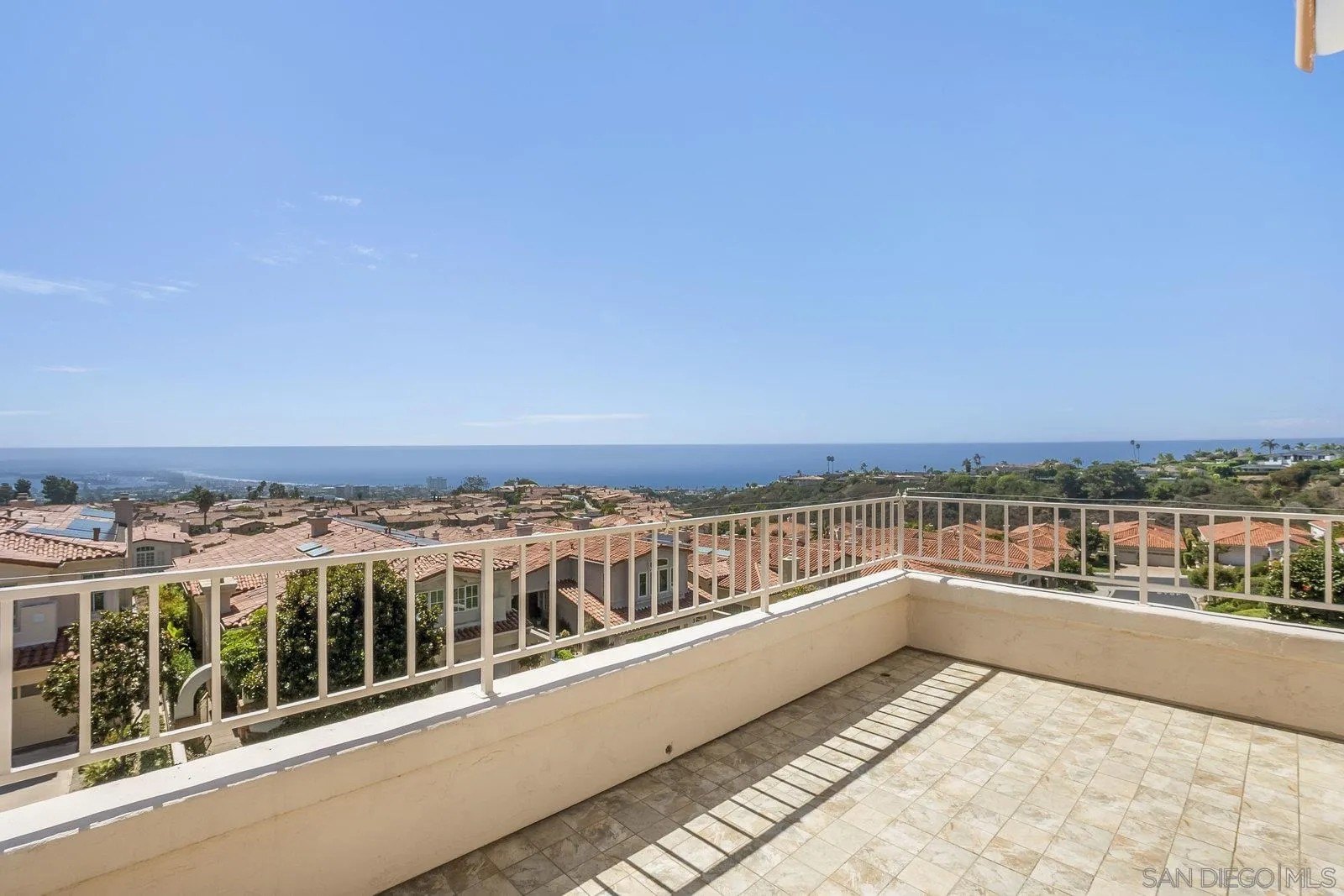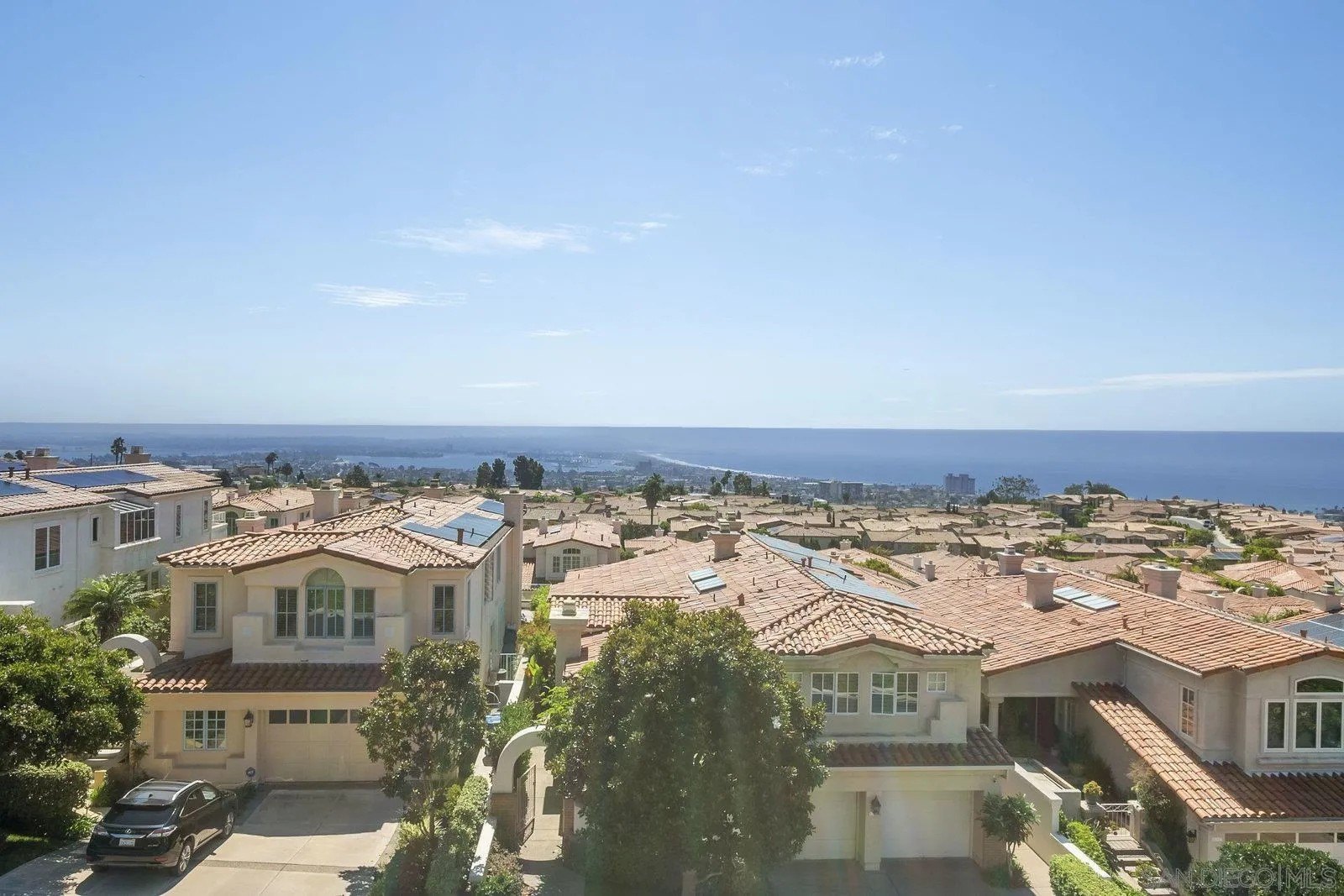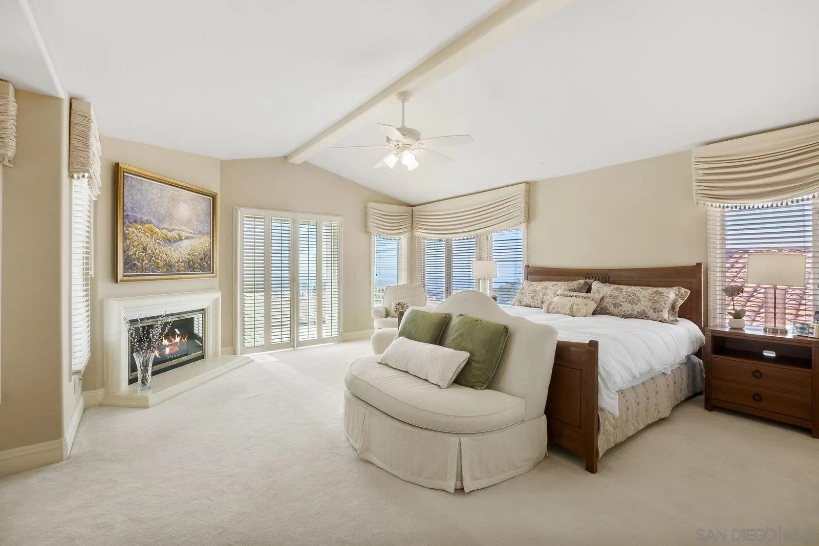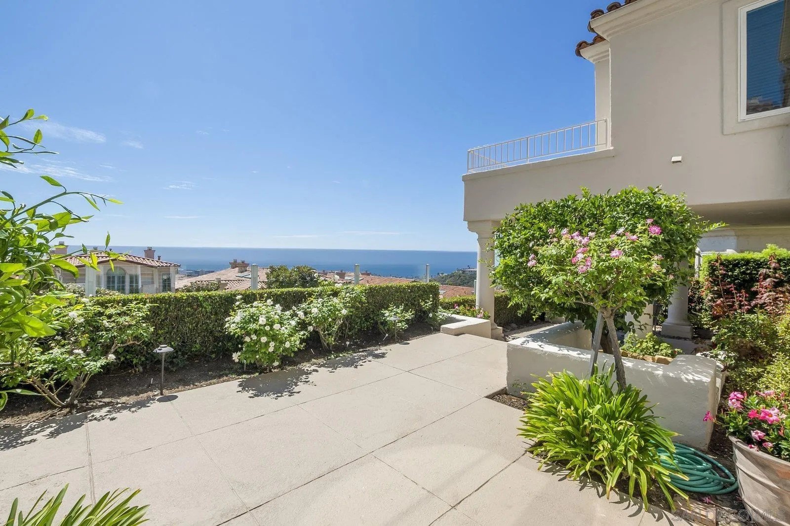 Nestled in the coveted gated enclave of Crystal Bay in La Jolla, this exquisite two-story residence blends timeless elegance with breathtaking coastal views. A grand double-door entry opens to soaring ceilings and abundant natural light, with tile at the entry transitioning to neutral-toned hardwood flooring. The formal living room offers a beautiful gas fireplace, hardwood flooring, and plantation shutters, while the dining room, accented by a chandelier, opens to a private patio with sweeping views from downtown San Diego to the Pacific Ocean along with refreshing coastal breezes. The kitchen showcases granite counters with a matching backsplash, light cabinetry, and a breakfast bar overlooking the family room below. An airy breakfast nook completes the space, and together these areas flow seamlessly into the family room, where tall ceilings, a second fireplace, and sliding doors create an inviting setting for indoor-outdoor living. A first-floor bedroom and full bath, spacious laundry room, and three-car garage add to the appeal. Upstairs, the primary suite offers vaulted ceilings, a cozy fireplace, walk-in closet with organizers, and a private balcony with ocean views. The primary bath features dual sinks, granite counters, a soaking tub and walk-in shower. Outdoor living includes a two-level patio framed by Mediterranean-style pillars and a lime tree, with both shaded and open areas to enjoy coastline views. Residents enjoy exclusive access to a clubhouse, fitness center, pool, and pickleball courts, all within one of La Jolla's most desirable gated communities.