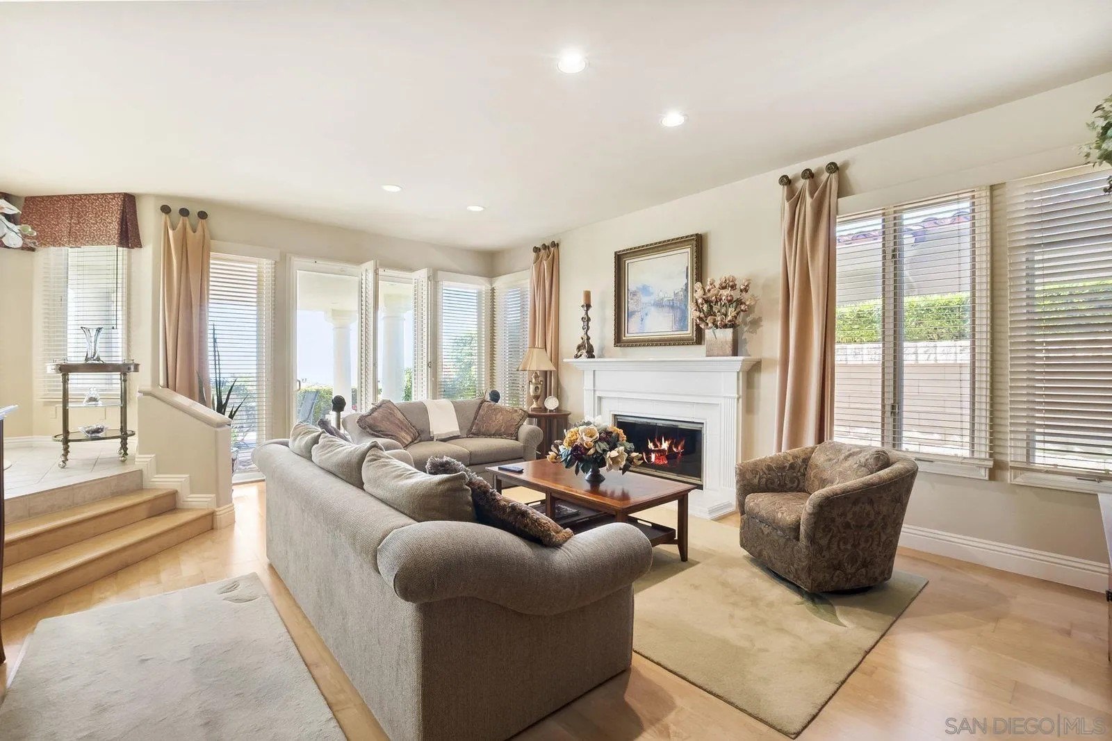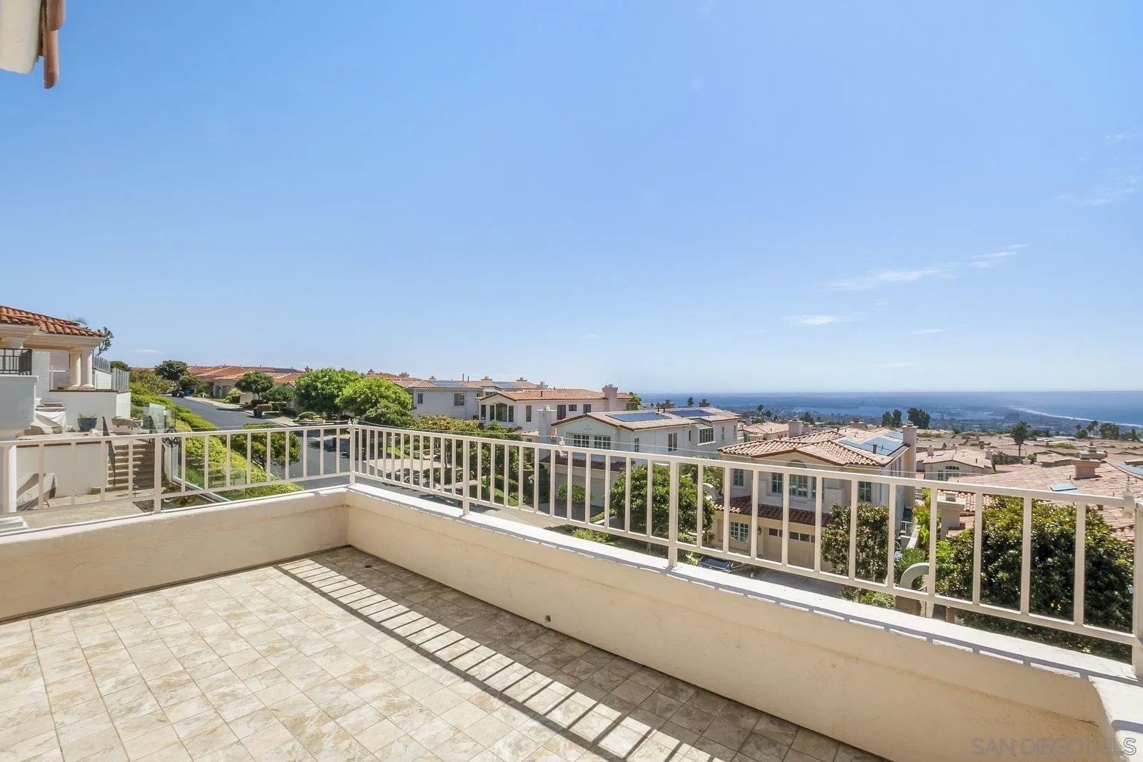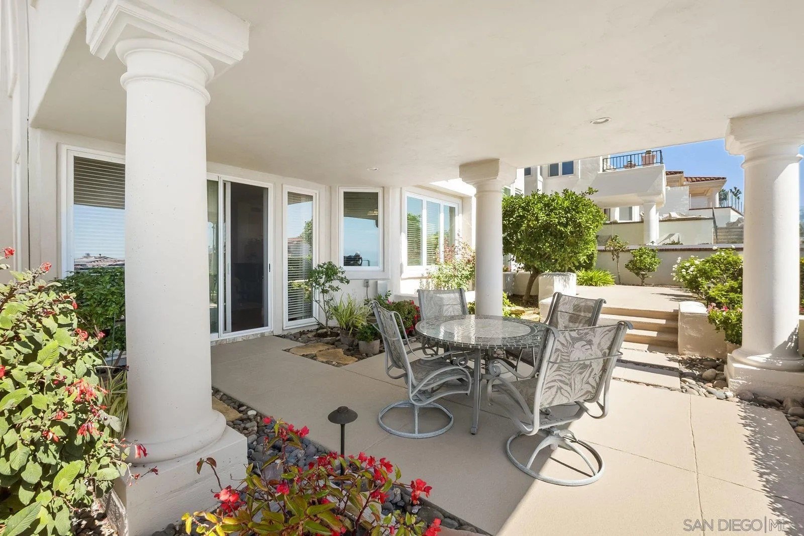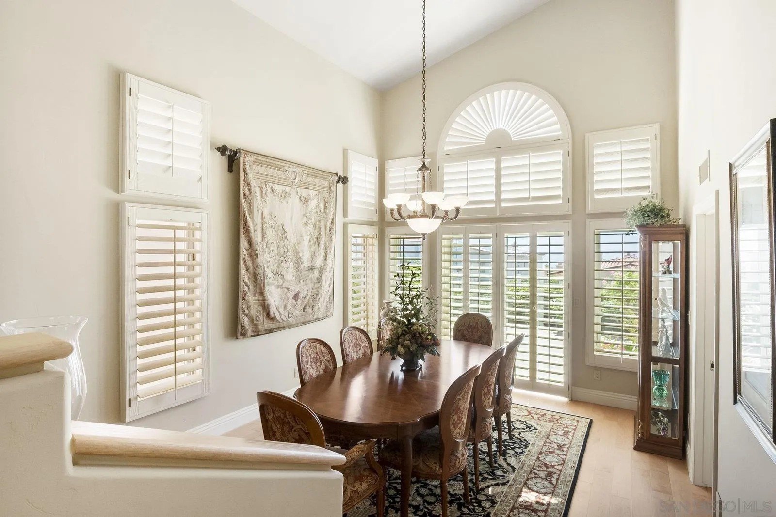 Nestled in the coveted gated enclave of Crystal Bay in La Jolla, this exquisite two-story residence blends timeless elegance with breathtaking coastal views. A grand double-door entry opens to soaring ceilings and abundant natural light, with tile at the entry transitioning to neutral-toned hardwood flooring. The formal living room offers a beautiful gas fireplace, hardwood flooring, and plantation shutters, while the dining room, accented by a chandelier, opens to a private patio with sweeping views from downtown San Diego to the Pacific Ocean along with refreshing coastal breezes. The kitchen showcases granite counters with a matching backsplash, light cabinetry, and a breakfast bar overlooking the family room below. An airy breakfast nook completes the space, and together these areas flow seamlessly into the family room, where tall ceilings, a second fireplace, and sliding doors create an inviting setting for indoor-outdoor living. A first-floor bedroom and full bath, spacious laundry room, and three-car garage add to the appeal. Upstairs, the primary suite offers vaulted ceilings, a cozy fireplace, walk-in closet with organizers, and a private balcony with ocean views. The primary bath features dual sinks, granite counters, a soaking tub and walk-in shower. Outdoor living includes a two-level patio framed by Mediterranean-style pillars and a lime tree, with both shaded and open areas to enjoy coastline views. Residents enjoy exclusive access to a clubhouse, fitness center, pool, and pickleball courts, all within one of La Jolla's most desirable gated communities.