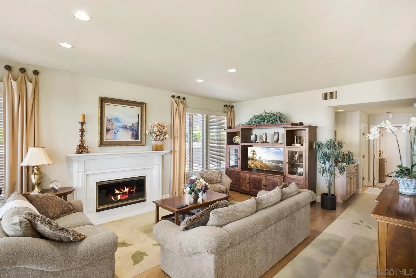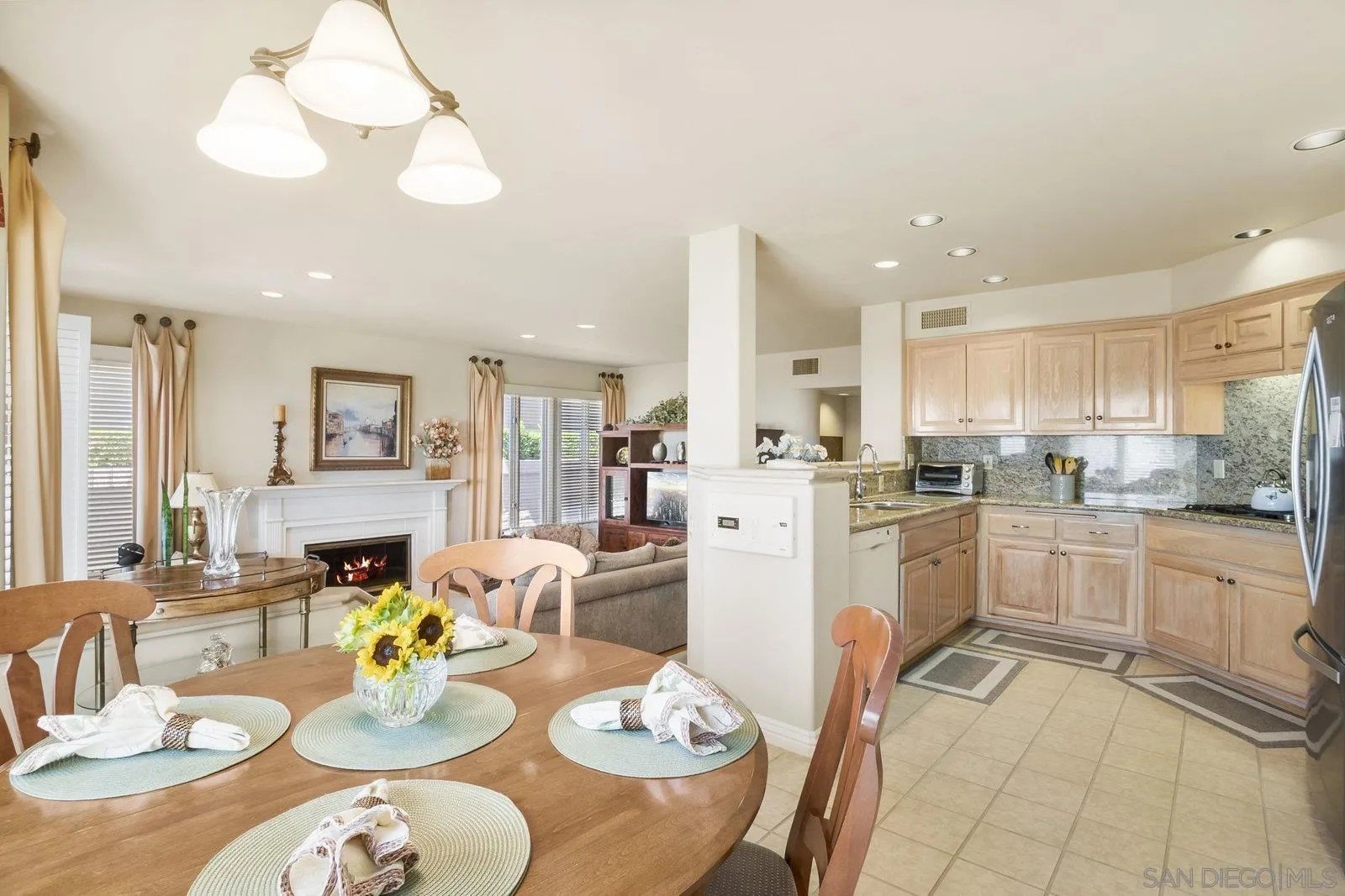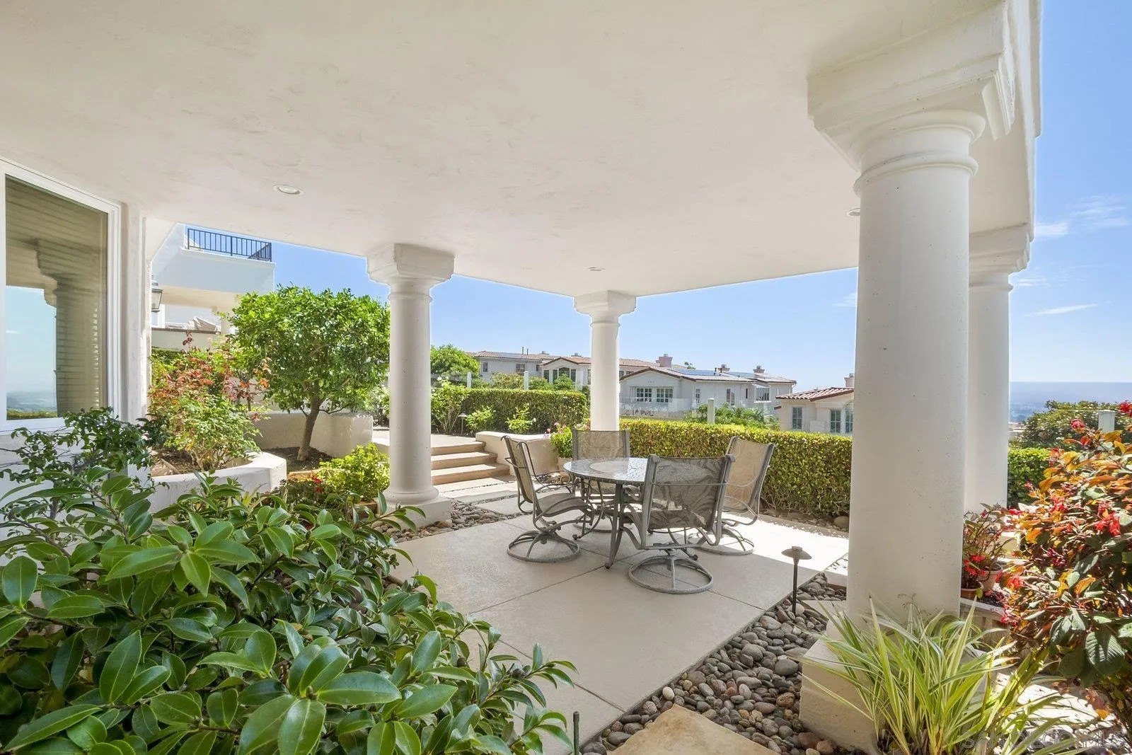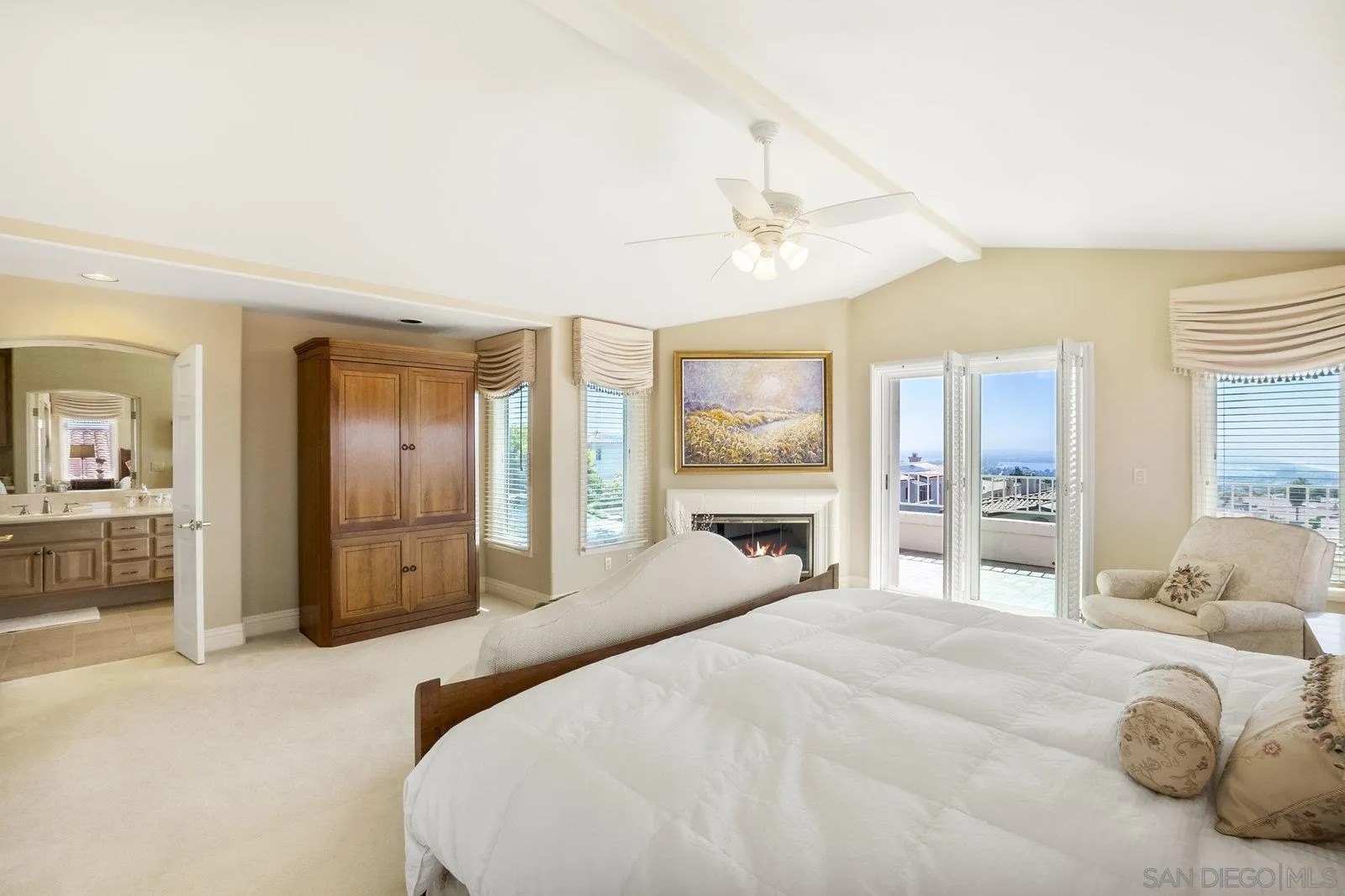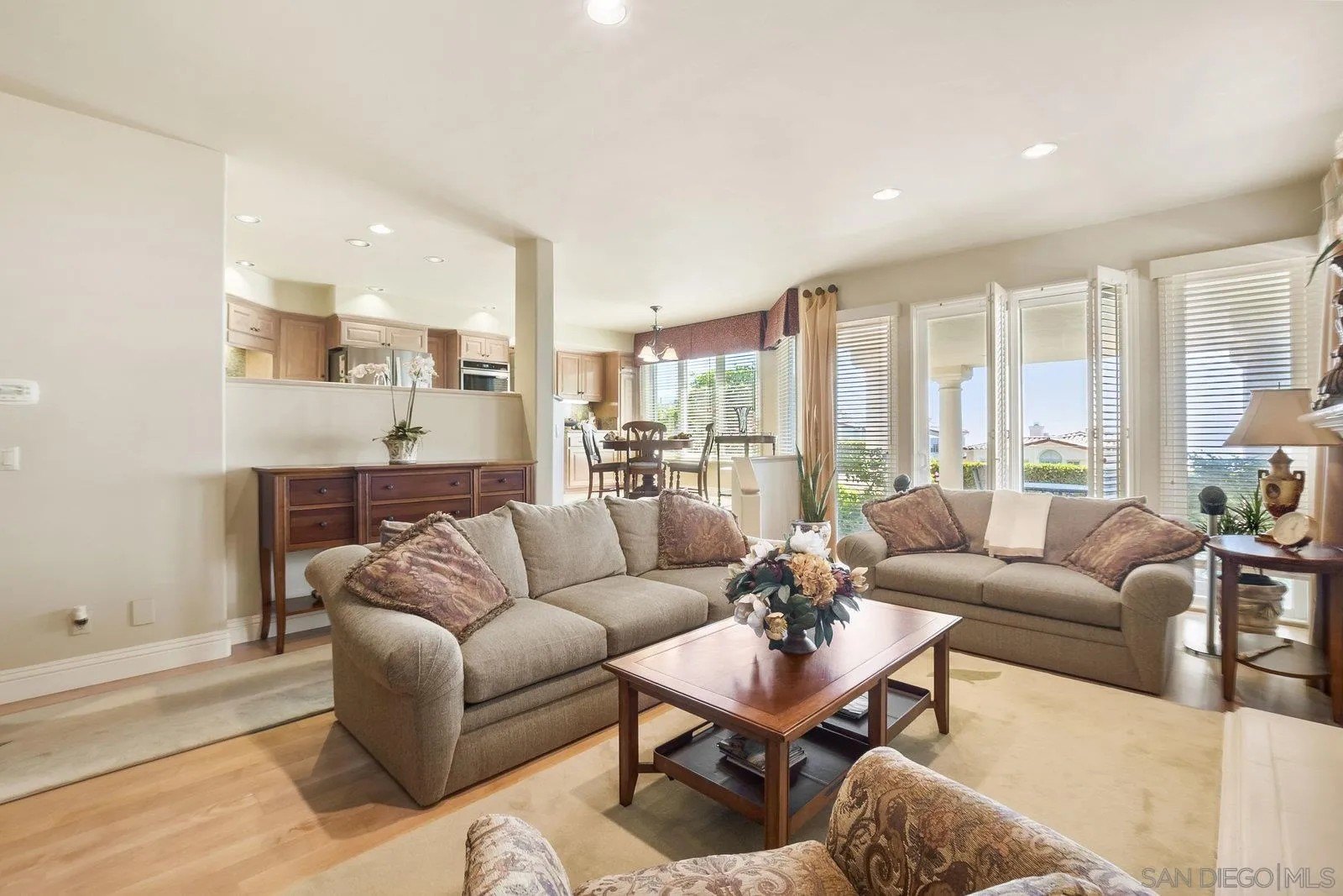 Nestled in the coveted gated enclave of Crystal Bay in La Jolla, this exquisite two-story residence blends timeless elegance with breathtaking coastal views. A grand double-door entry opens to soaring ceilings and abundant natural light, with tile at the entry transitioning to neutral-toned hardwood flooring. The formal living room offers a beautiful gas fireplace, hardwood flooring, and plantation shutters, while the dining room, accented by a chandelier, opens to a private patio with sweeping views from downtown San Diego to the Pacific Ocean along with refreshing coastal breezes. The kitchen showcases granite counters with a matching backsplash, light cabinetry, and a breakfast bar overlooking the family room below. An airy breakfast nook completes the space, and together these areas flow seamlessly into the family room, where tall ceilings, a second fireplace, and sliding doors create an inviting setting for indoor-outdoor living. A first-floor bedroom and full bath, spacious laundry room, and three-car garage add to the appeal. Upstairs, the primary suite offers vaulted ceilings, a cozy fireplace, walk-in closet with organizers, and a private balcony with ocean views. The primary bath features dual sinks, granite counters, a soaking tub and walk-in shower. Outdoor living includes a two-level patio framed by Mediterranean-style pillars and a lime tree, with both shaded and open areas to enjoy coastline views. Residents enjoy exclusive access to a clubhouse, fitness center, pool, and pickleball courts, all within one of La Jolla's most desirable gated communities.