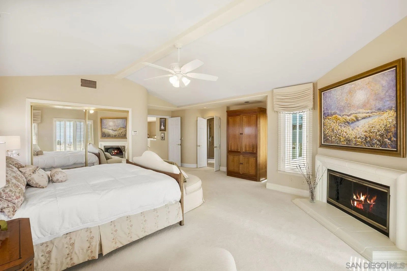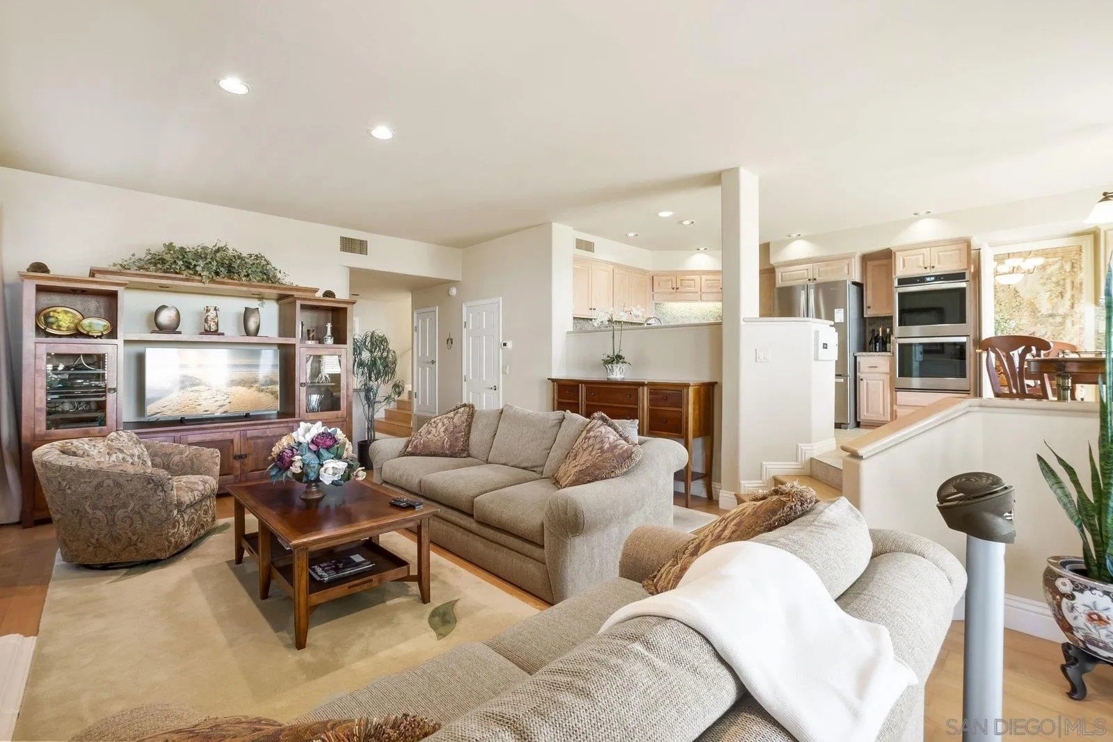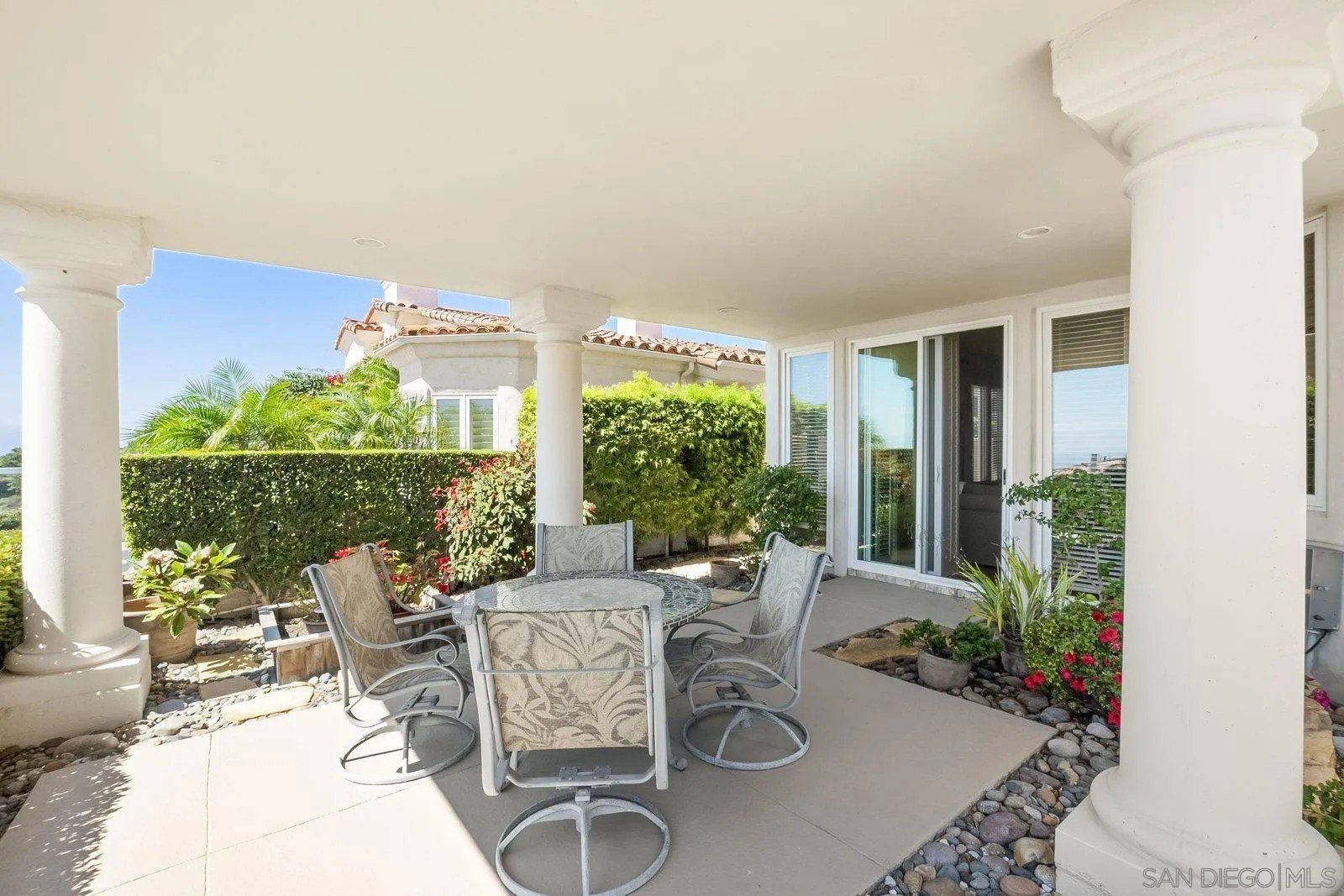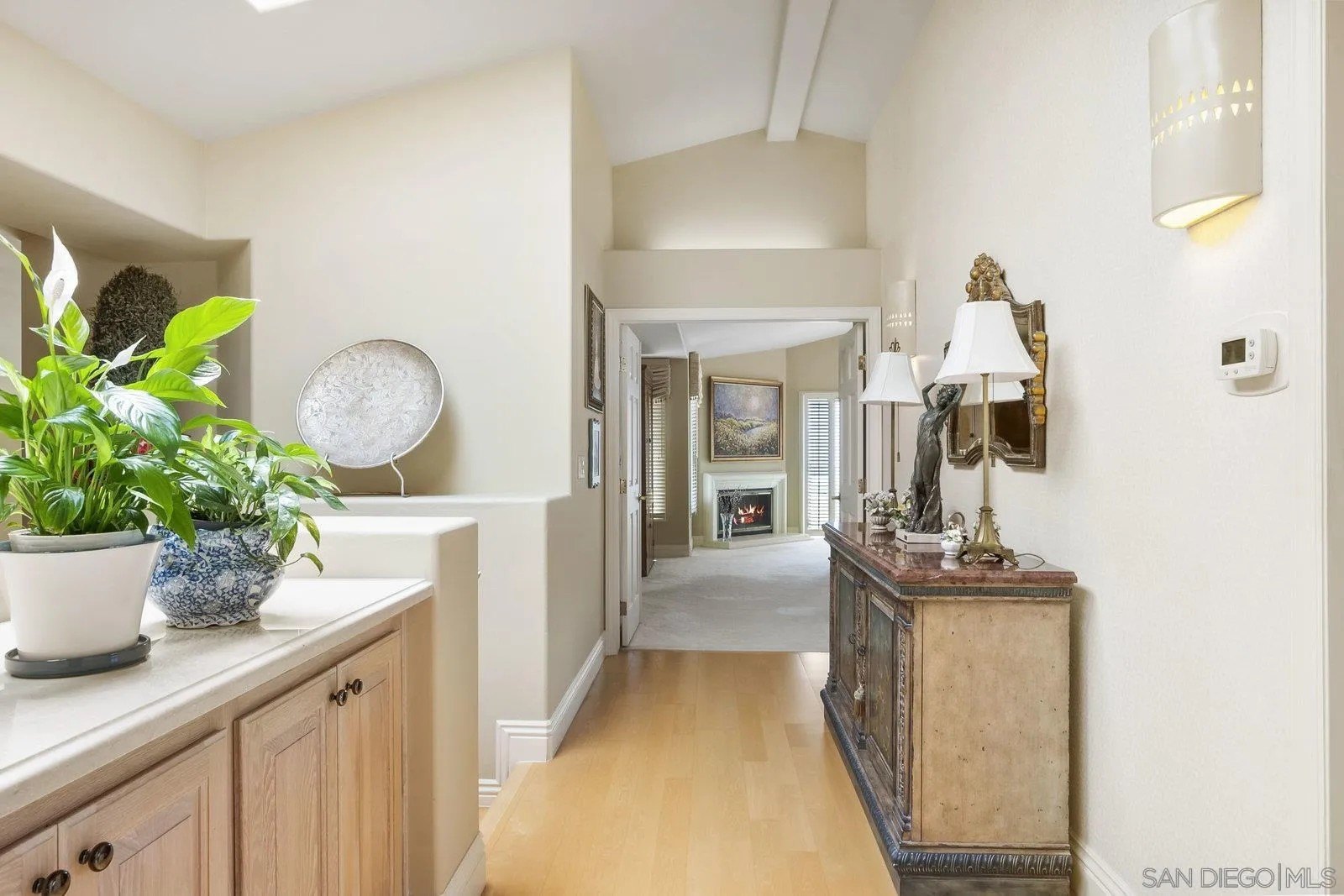 Nestled in the coveted gated enclave of Crystal Bay in La Jolla, this exquisite two-story residence blends timeless elegance with breathtaking coastal views. A grand double-door entry opens to soaring ceilings and abundant natural light, with tile at the entry transitioning to neutral-toned hardwood flooring. The formal living room offers a beautiful gas fireplace, hardwood flooring, and plantation shutters, while the dining room, accented by a chandelier, opens to a private patio with sweeping views from downtown San Diego to the Pacific Ocean along with refreshing coastal breezes. The kitchen showcases granite counters with a matching backsplash, light cabinetry, and a breakfast bar overlooking the family room below. An airy breakfast nook completes the space, and together these areas flow seamlessly into the family room, where tall ceilings, a second fireplace, and sliding doors create an inviting setting for indoor-outdoor living. A first-floor bedroom and full bath, spacious laundry room, and three-car garage add to the appeal. Upstairs, the primary suite offers vaulted ceilings, a cozy fireplace, walk-in closet with organizers, and a private balcony with ocean views. The primary bath features dual sinks, granite counters, a soaking tub and walk-in shower. Outdoor living includes a two-level patio framed by Mediterranean-style pillars and a lime tree, with both shaded and open areas to enjoy coastline views. Residents enjoy exclusive access to a clubhouse, fitness center, pool, and pickleball courts, all within one of La Jolla's most desirable gated communities.