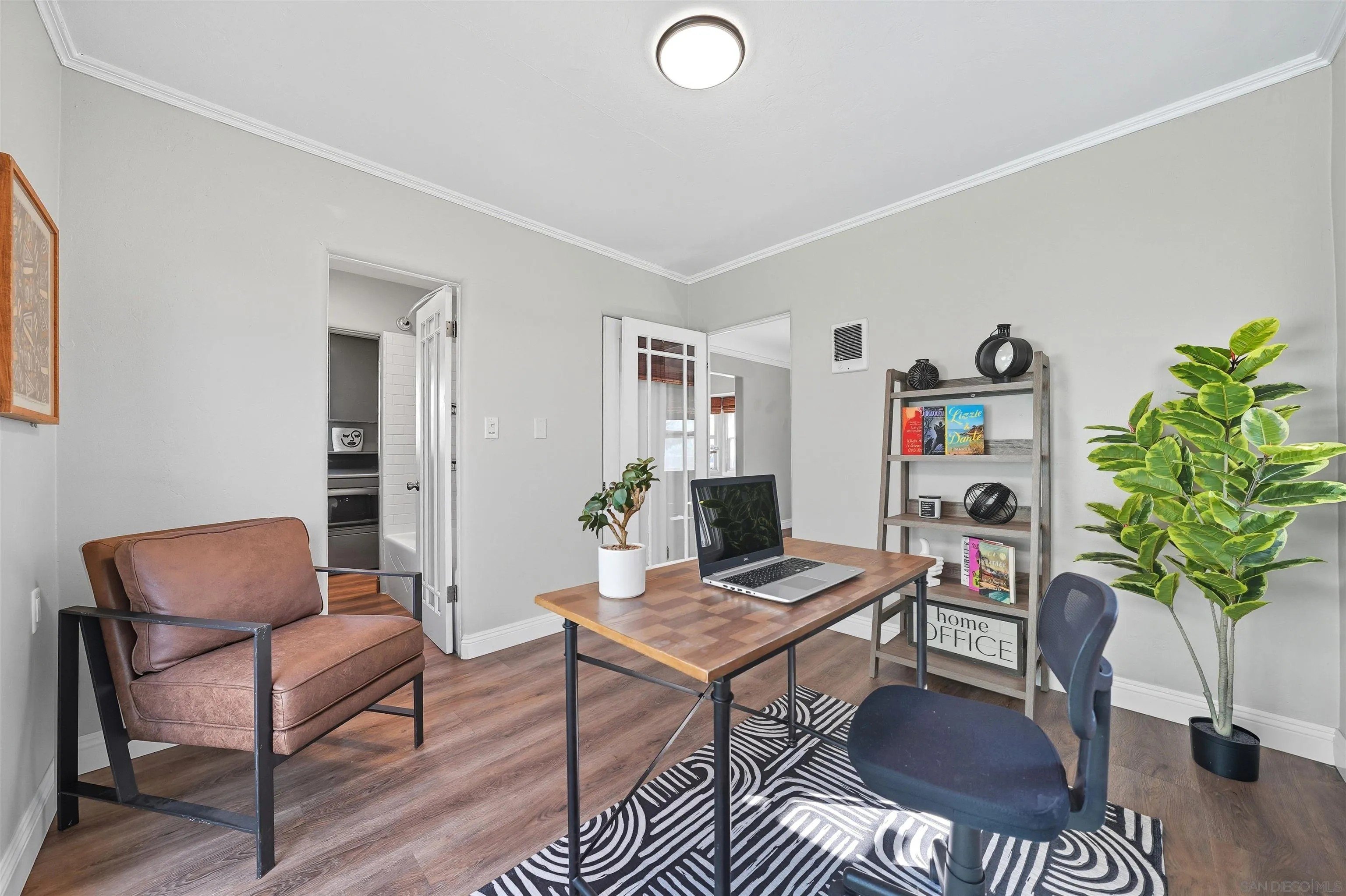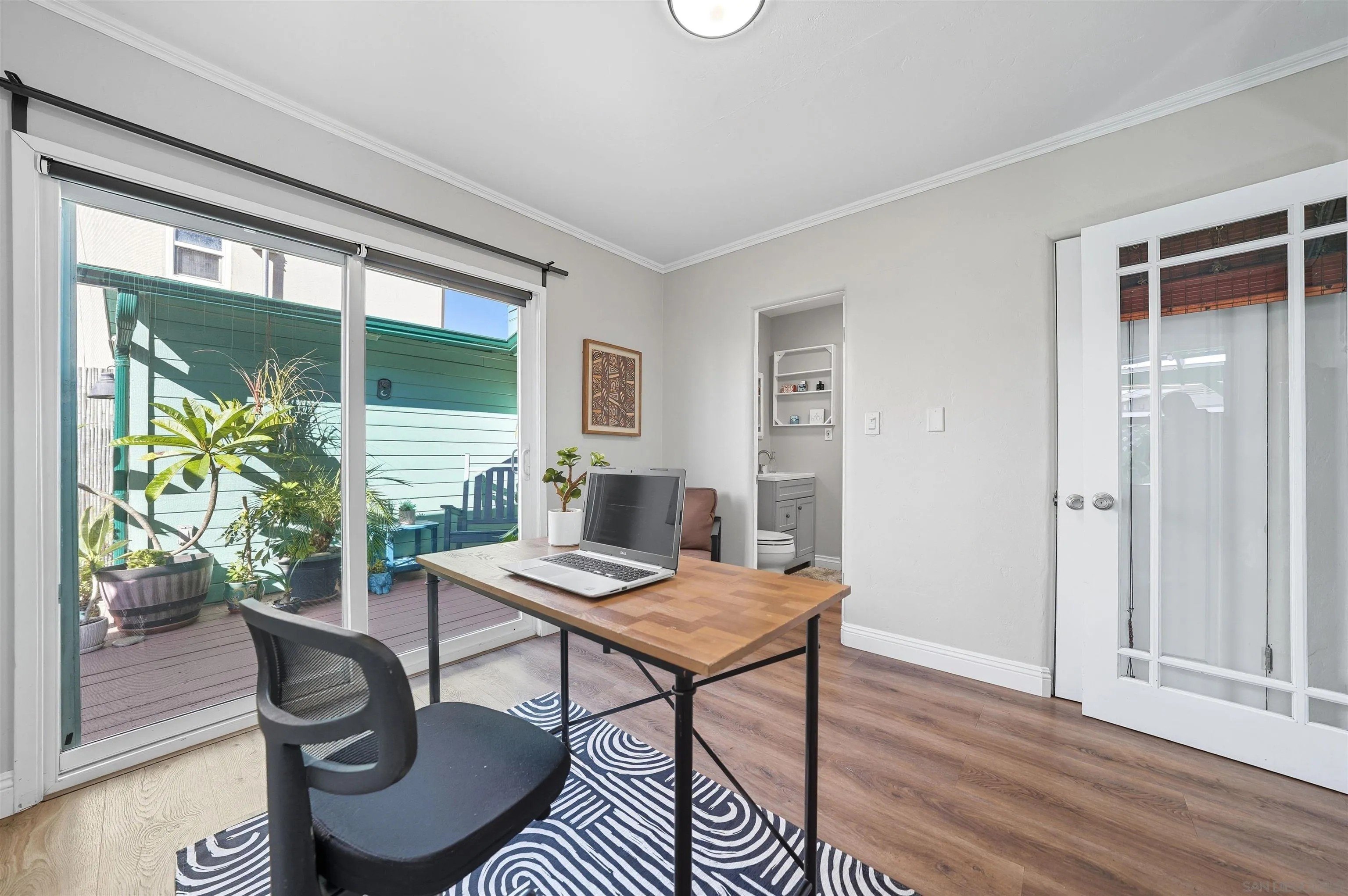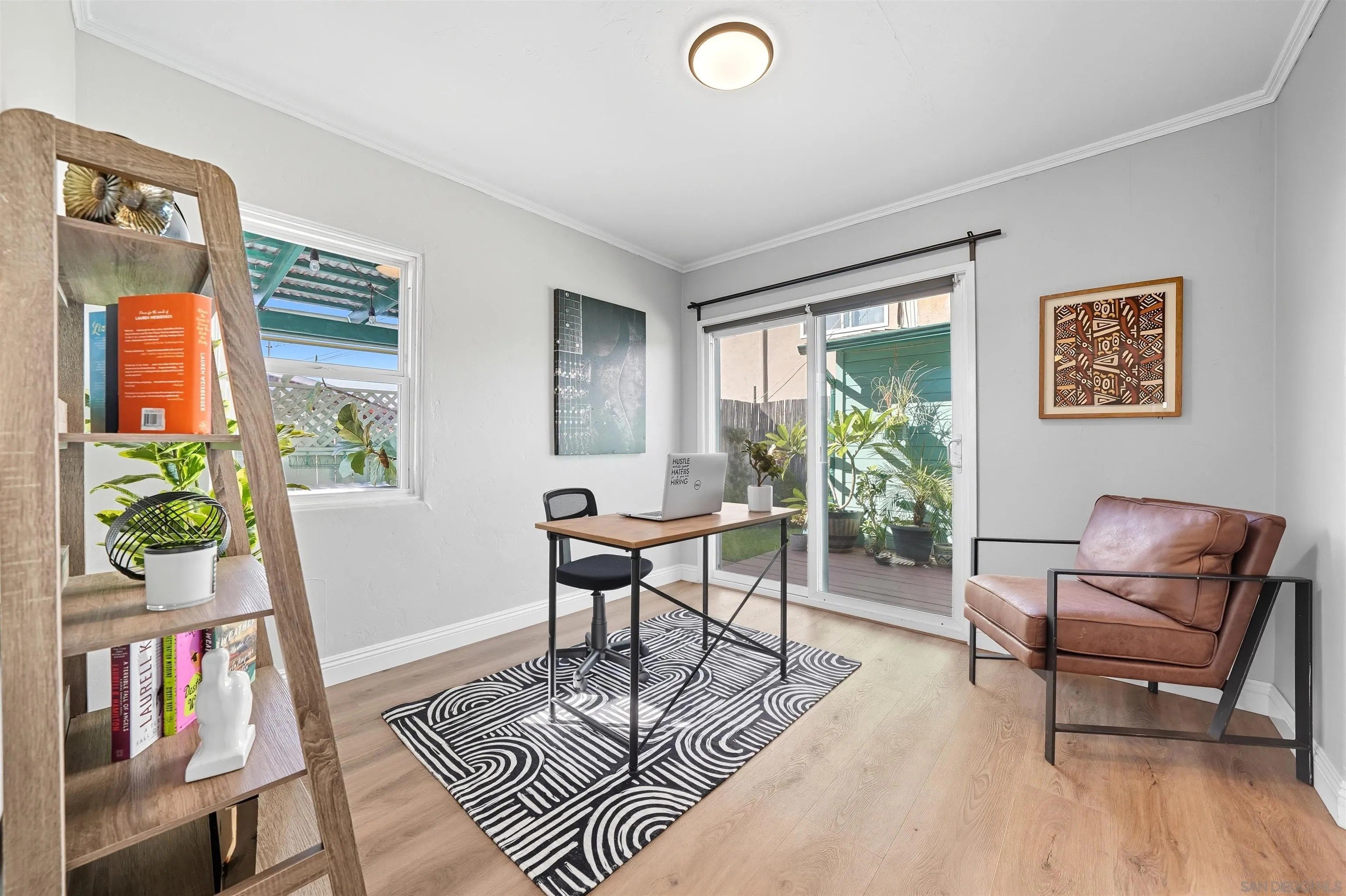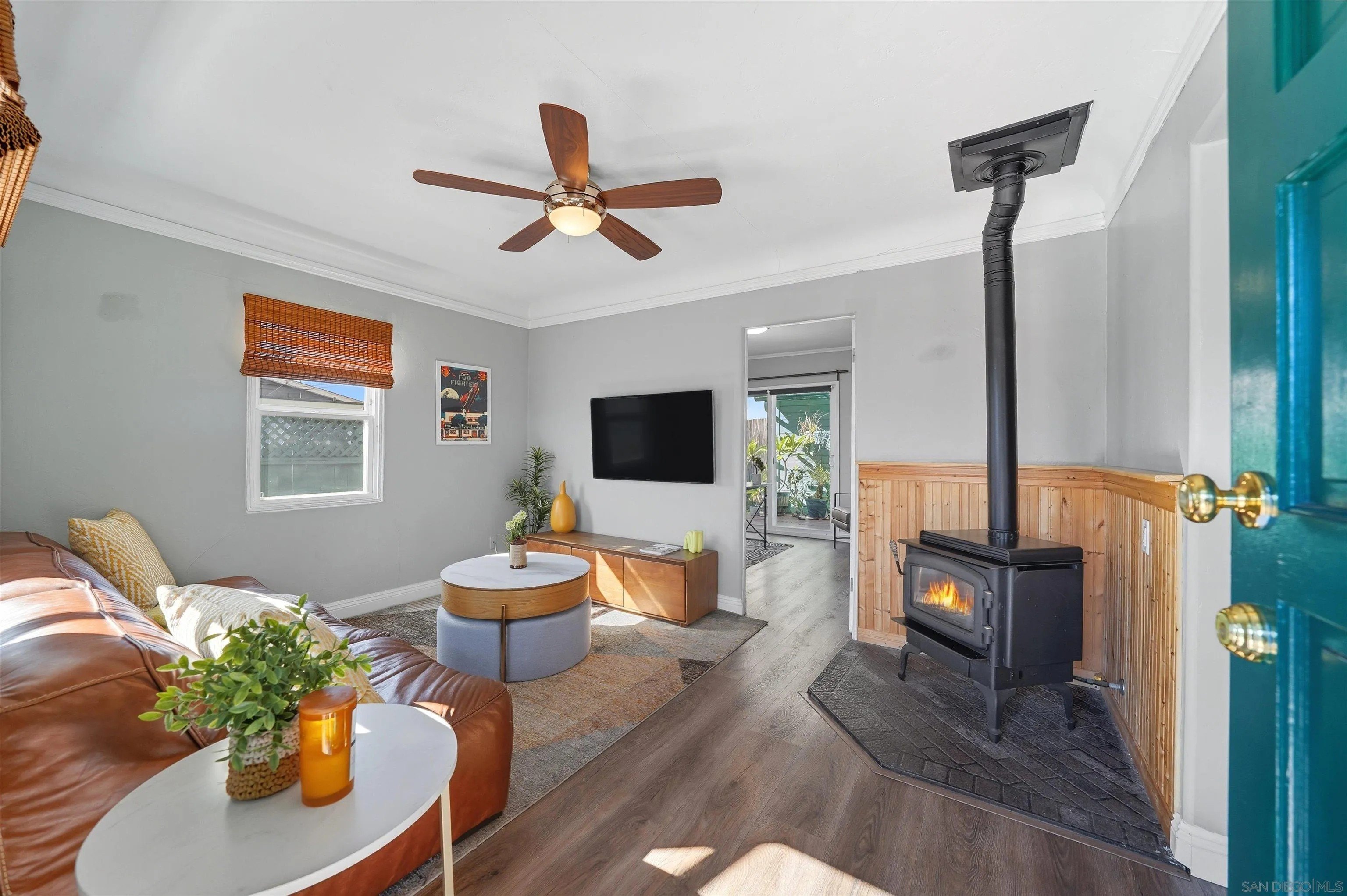 Charming cottage with modern touches one street from Adams! This fully-fenced gem bursting with charm and character has been beautifully maintained and offers cozy comfort, thoughtful updates, and incredible curb appeal. Step onto the inviting front porch, surrounded by vibrant flowers and a sunny horizontal, wood fence that adds a playful touch to the home's charming exterior. Inside, you're welcomed by a bright and airy living room featuring a warm vinyl plank flooring and neutral wall tones to create a relaxed and welcoming atmosphere throughout. The living space flows seamlessly into a bonus room-perfect as a home office, creative studio, or guest space. Large windows bathe the interior in natural light, while thoughtful updates like recessed lighting and wood blinds add functionality and style. Tucked away from the main living areas and other bedrooms, this oversized primary suite offers the ultimate in privacy and tranquility. Step into the backyard for a yard with storybook charm and relaxing spa. Located in a sought-after neighborhood, just minutes from the beach, shops, dining, and freeway access, this home offers the perfect blend of vintage charm and modern convenience.