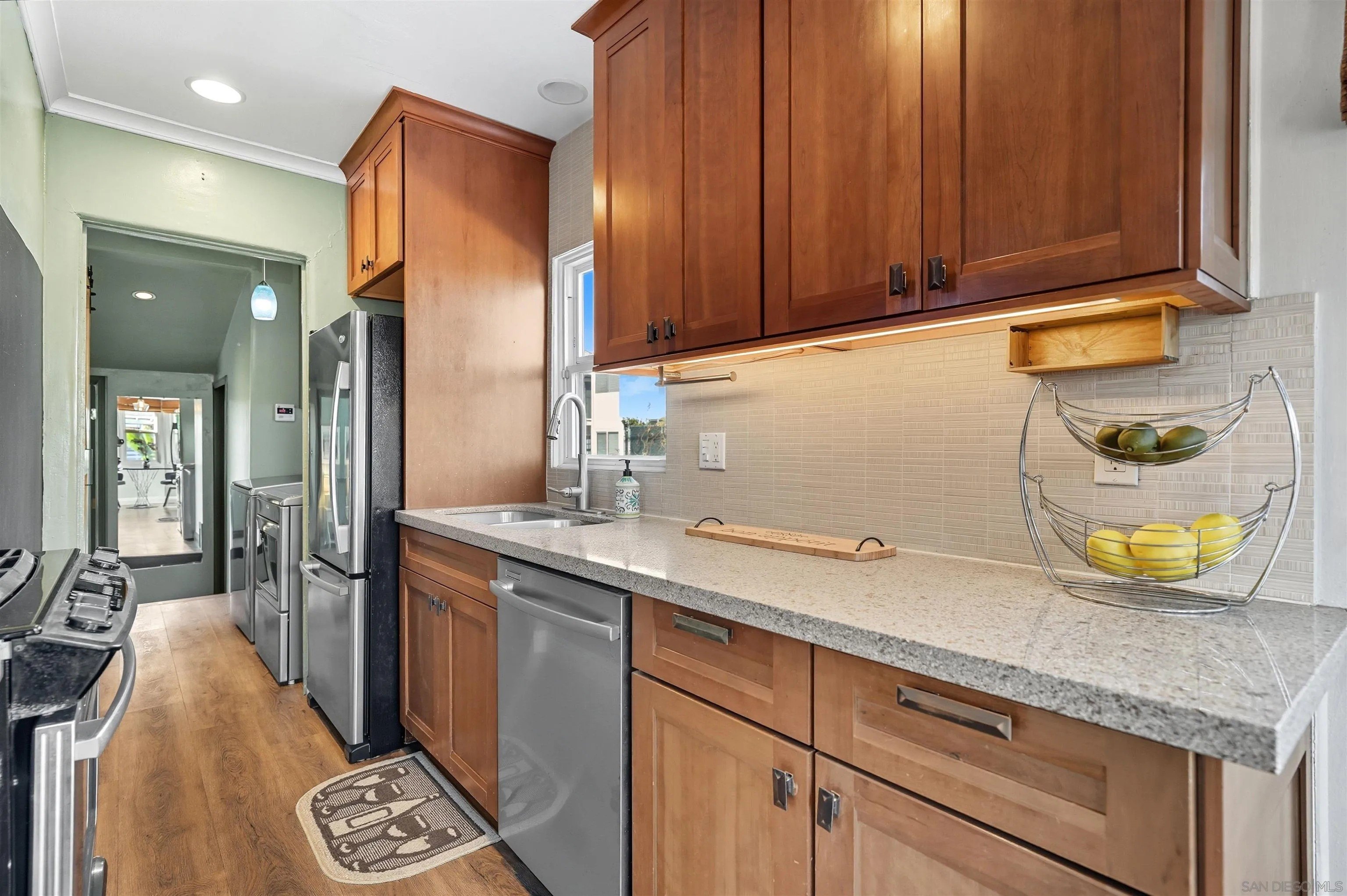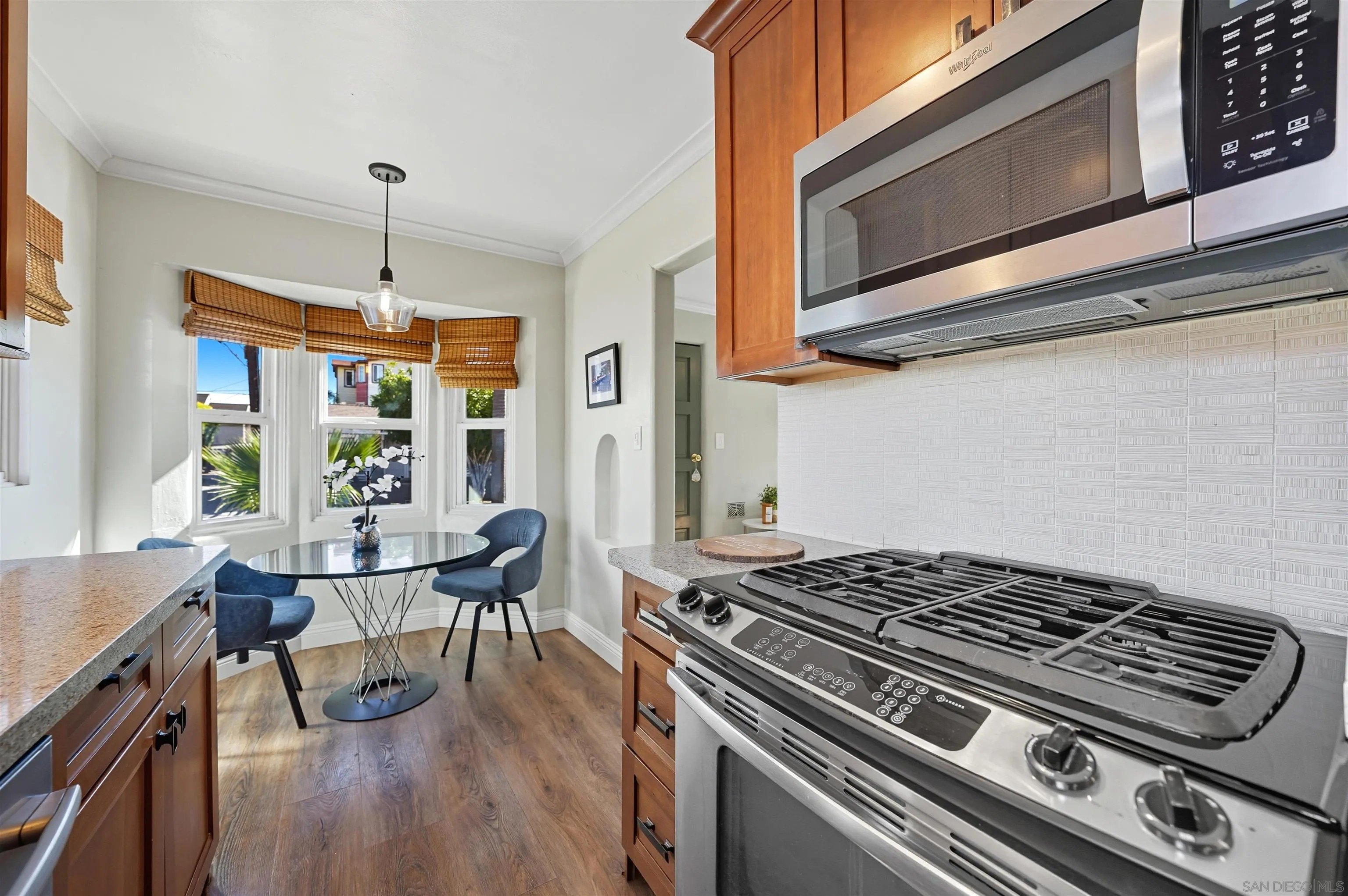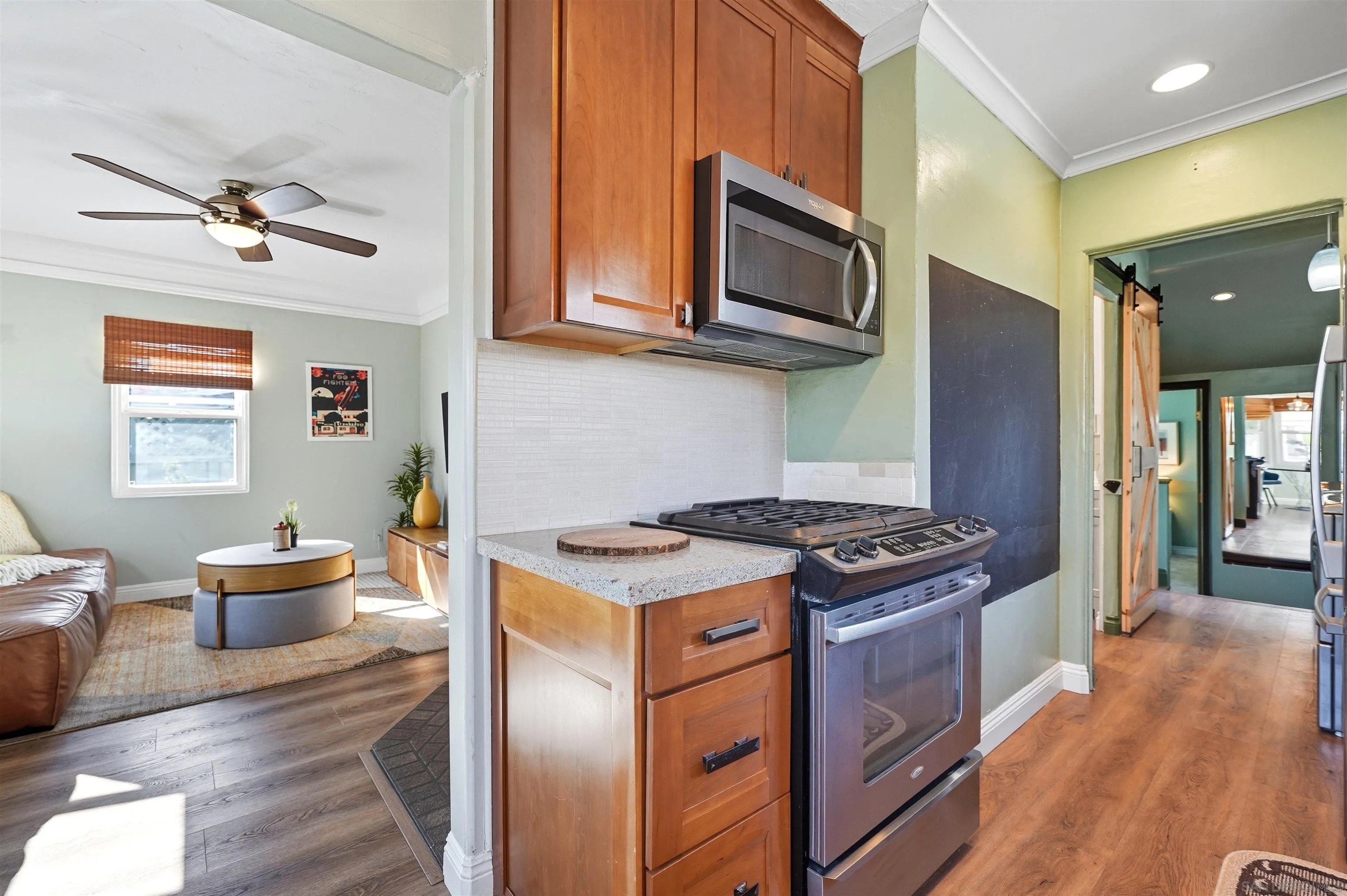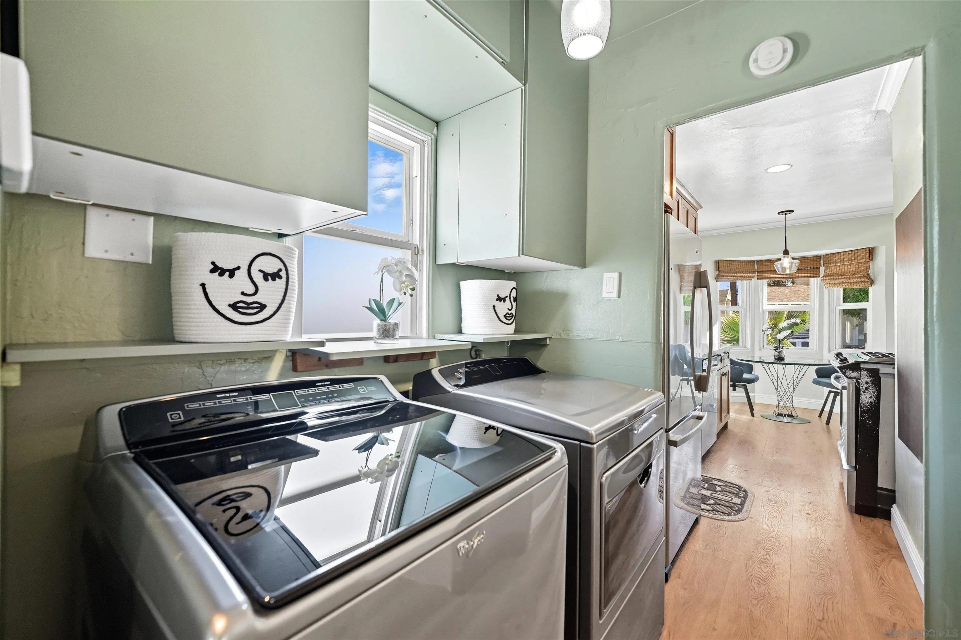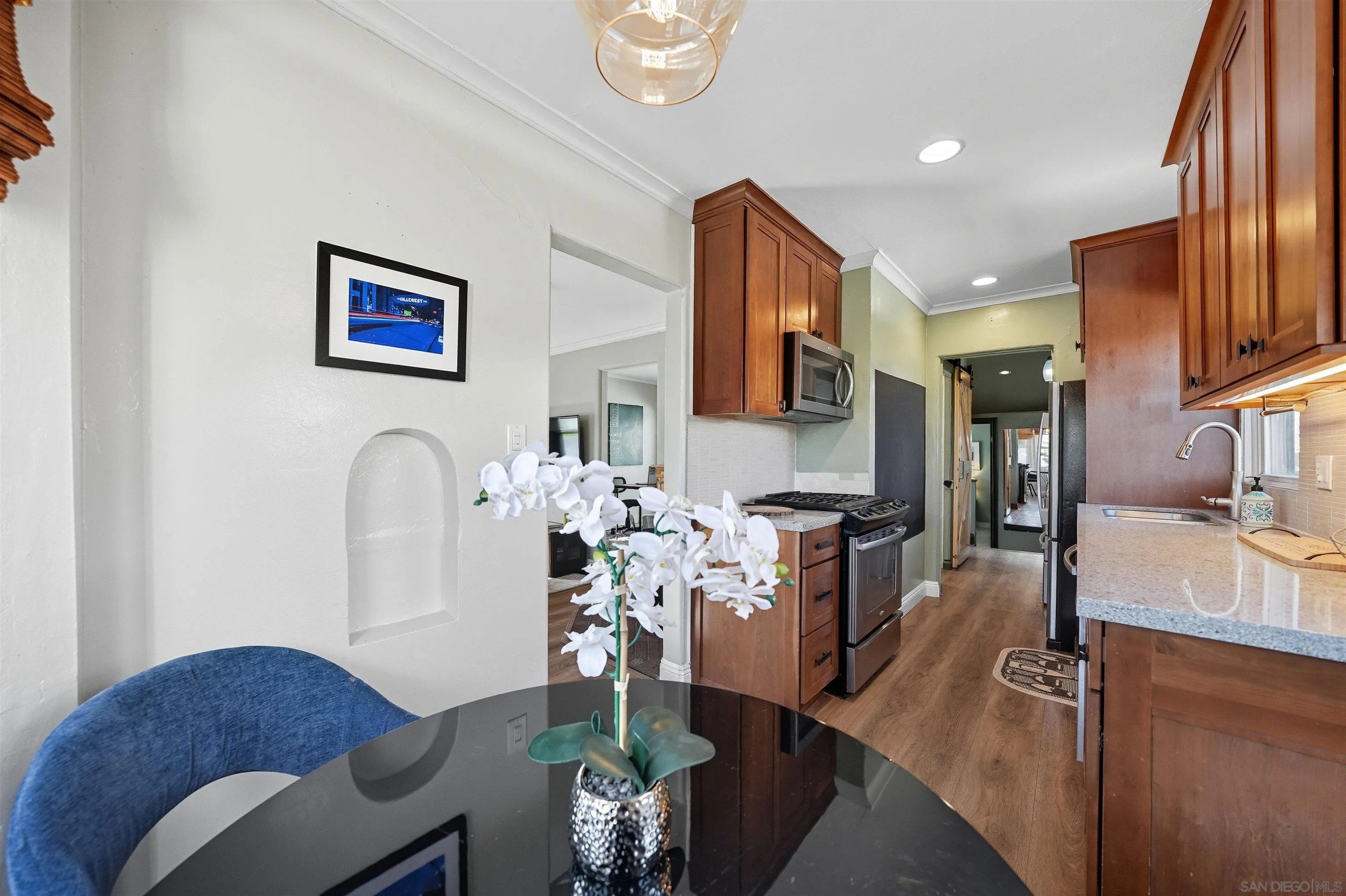 Charming cottage with modern touches one street from Adams! This fully-fenced gem bursting with charm and character has been beautifully maintained and offers cozy comfort, thoughtful updates, and incredible curb appeal. Step onto the inviting front porch, surrounded by vibrant flowers and a sunny horizontal, wood fence that adds a playful touch to the home's charming exterior. Inside, you're welcomed by a bright and airy living room featuring a warm vinyl plank flooring and neutral wall tones to create a relaxed and welcoming atmosphere throughout. The living space flows seamlessly into a bonus room-perfect as a home office, creative studio, or guest space. Large windows bathe the interior in natural light, while thoughtful updates like recessed lighting and wood blinds add functionality and style. Tucked away from the main living areas and other bedrooms, this oversized primary suite offers the ultimate in privacy and tranquility. Step into the backyard for a yard with storybook charm and relaxing spa. Located in a sought-after neighborhood, just minutes from the beach, shops, dining, and freeway access, this home offers the perfect blend of vintage charm and modern convenience.