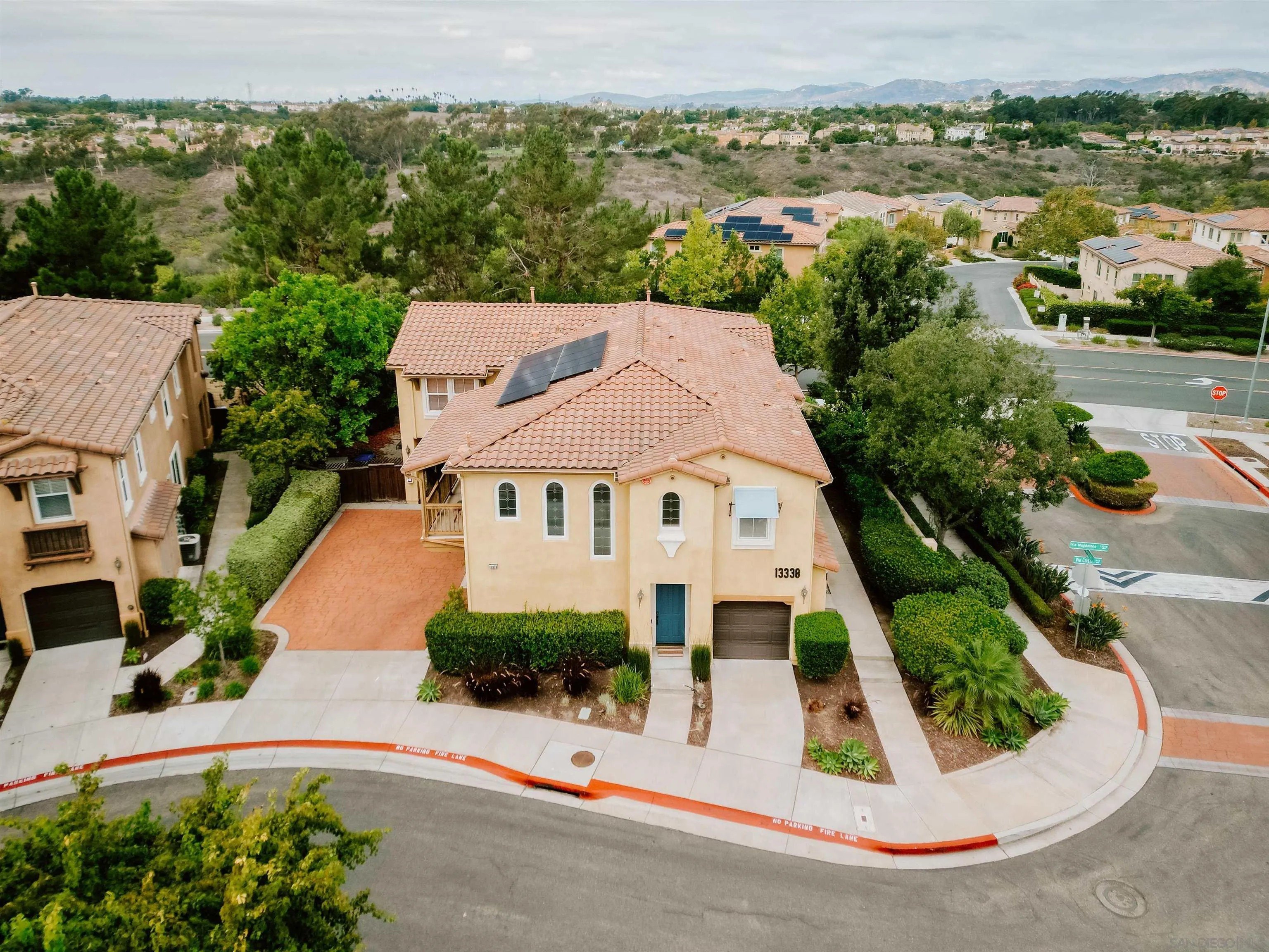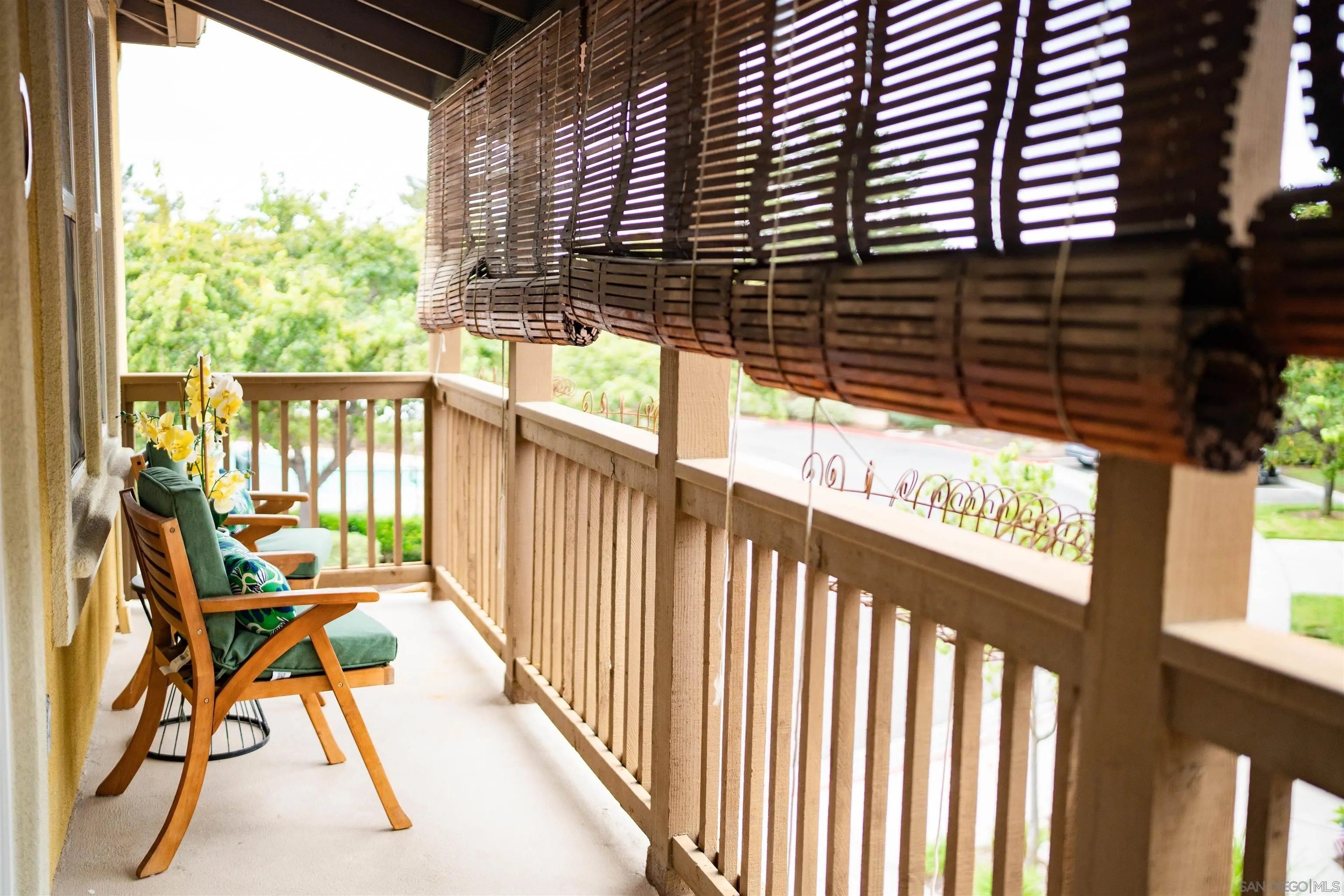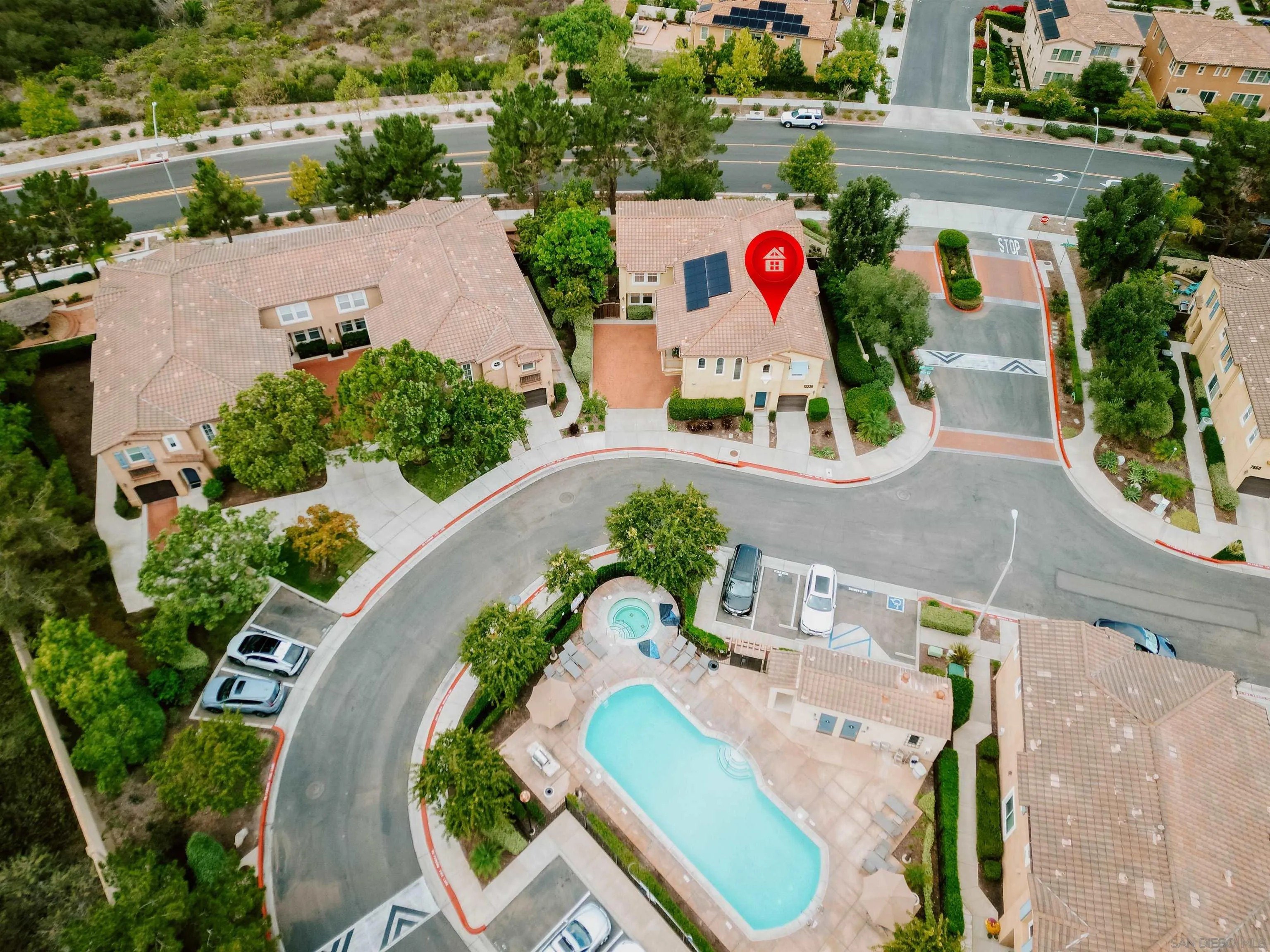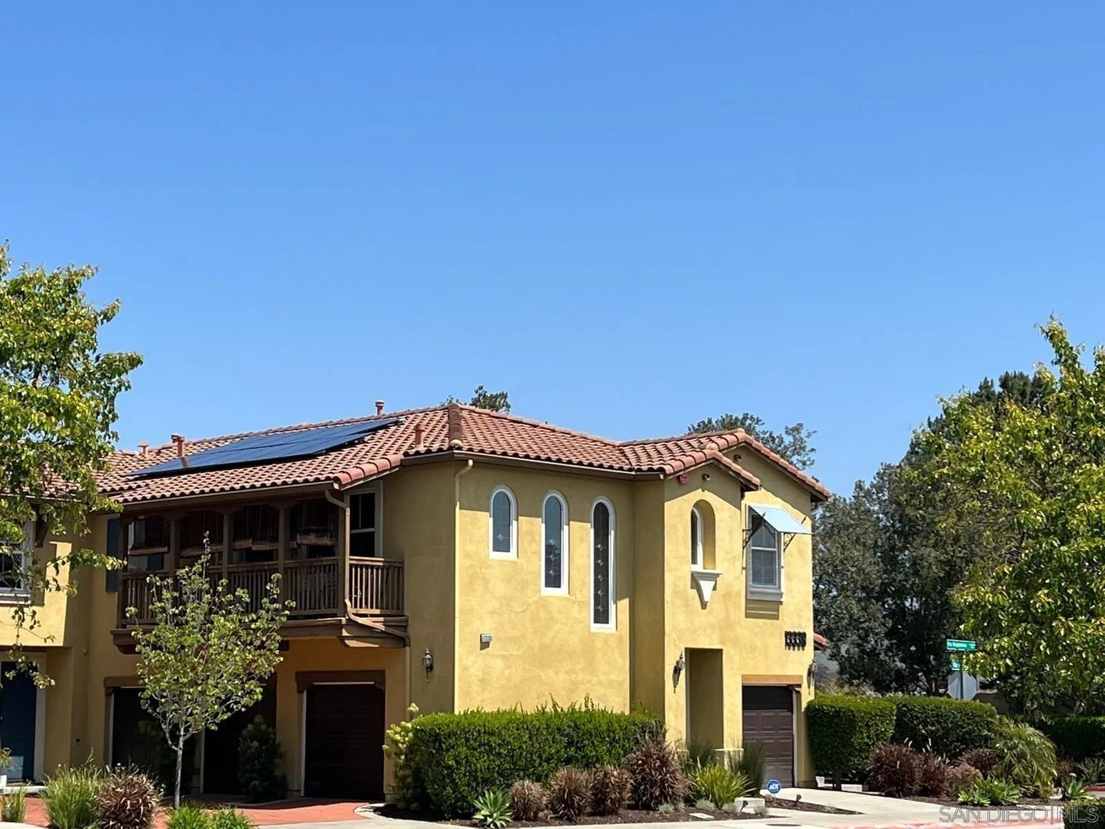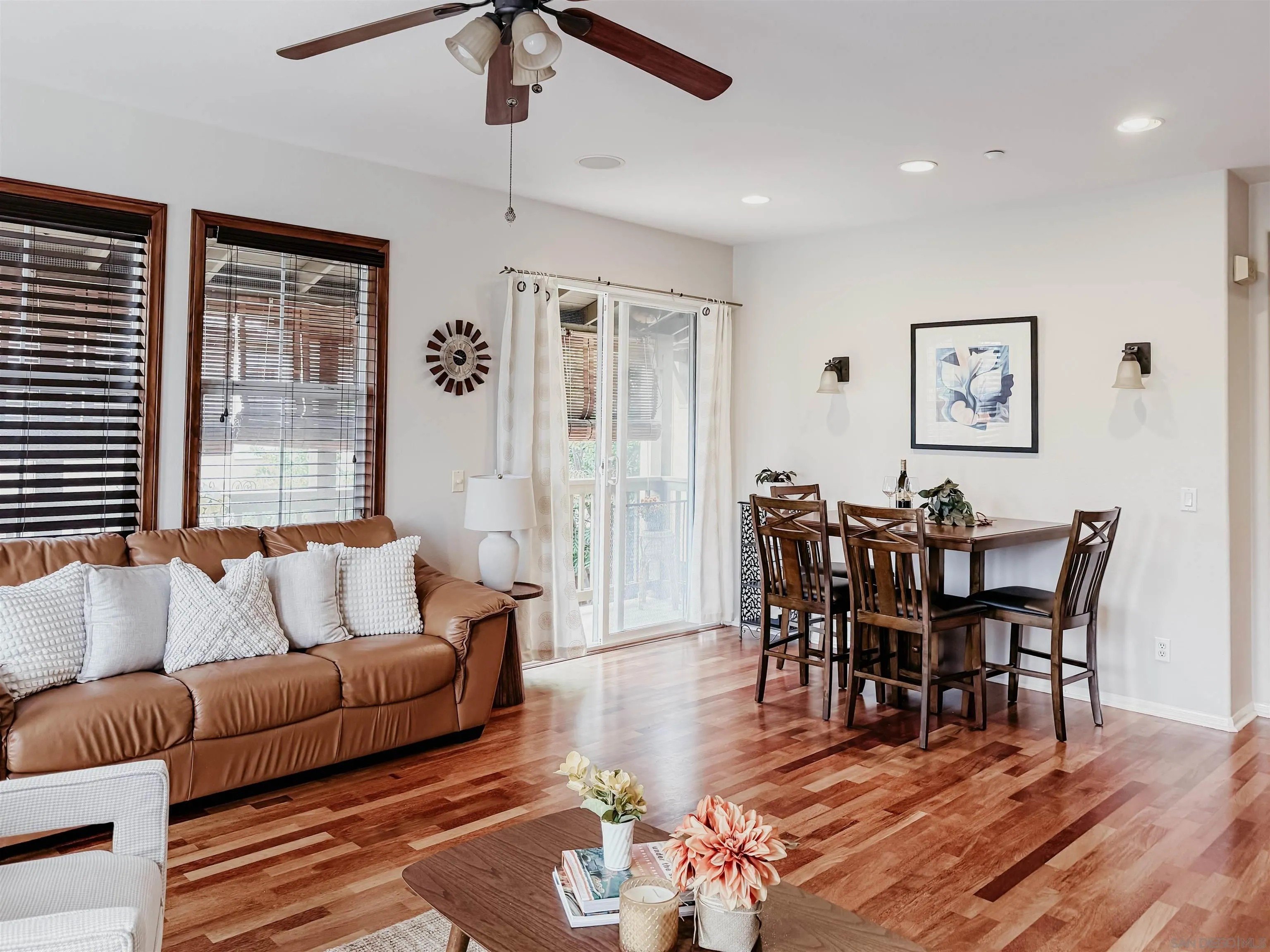 This beautifully maintained townhome features an open floor plan with high-end touches throughout, including upgraded kitchen counters, refinished hardwood floors, ceiling fans, designer paint, a private balcony, and a cozy fireplace in the living/dining area. All living spaces are located on the second floor with direct access from the attached 1-car garage.The master suite includes a spacious walk-in closet . The home comes with a dedicated laundry room for convenience. With fully paid solar to offset electricity costs and zoning for the top-rated Poway Unified School District, this home offers both comfort and value. Ideally situated in one of the best locations within the Monaco complex, residents enjoy community amenities such as a sparkling pool and spa, along with close proximity to shopping, dining, parks, schools, and easy freeway access. Torrey Meadows Park and the highly ranked West View High School are just few blocks away.