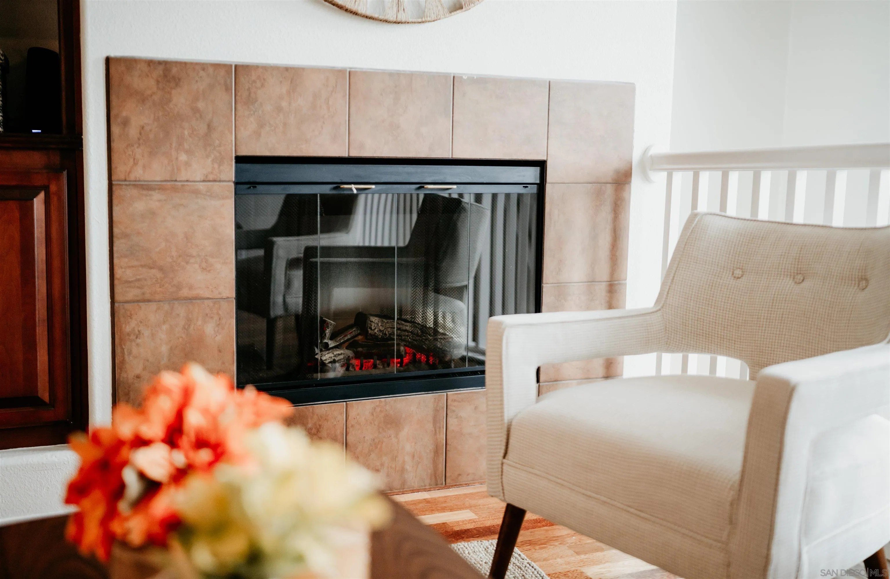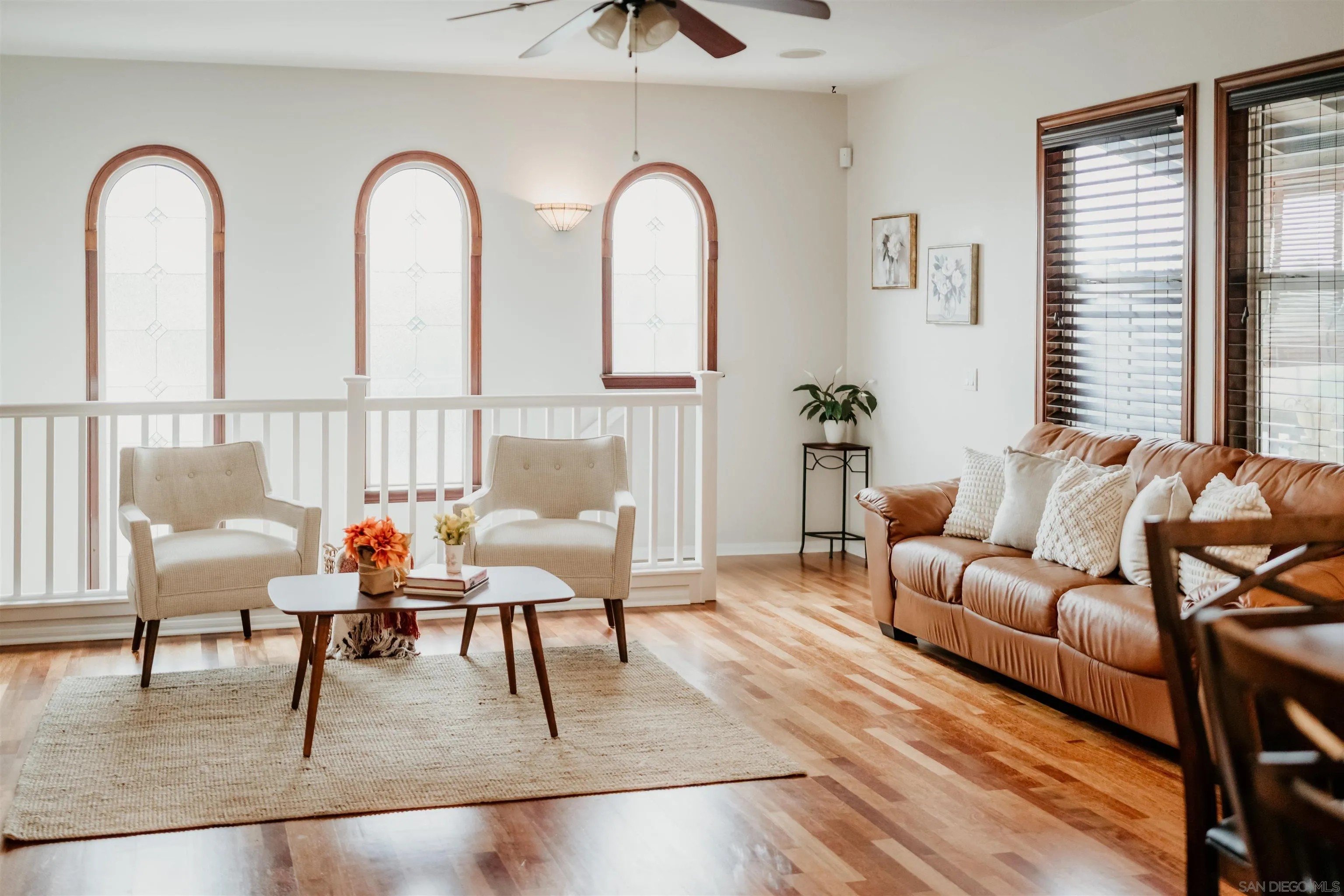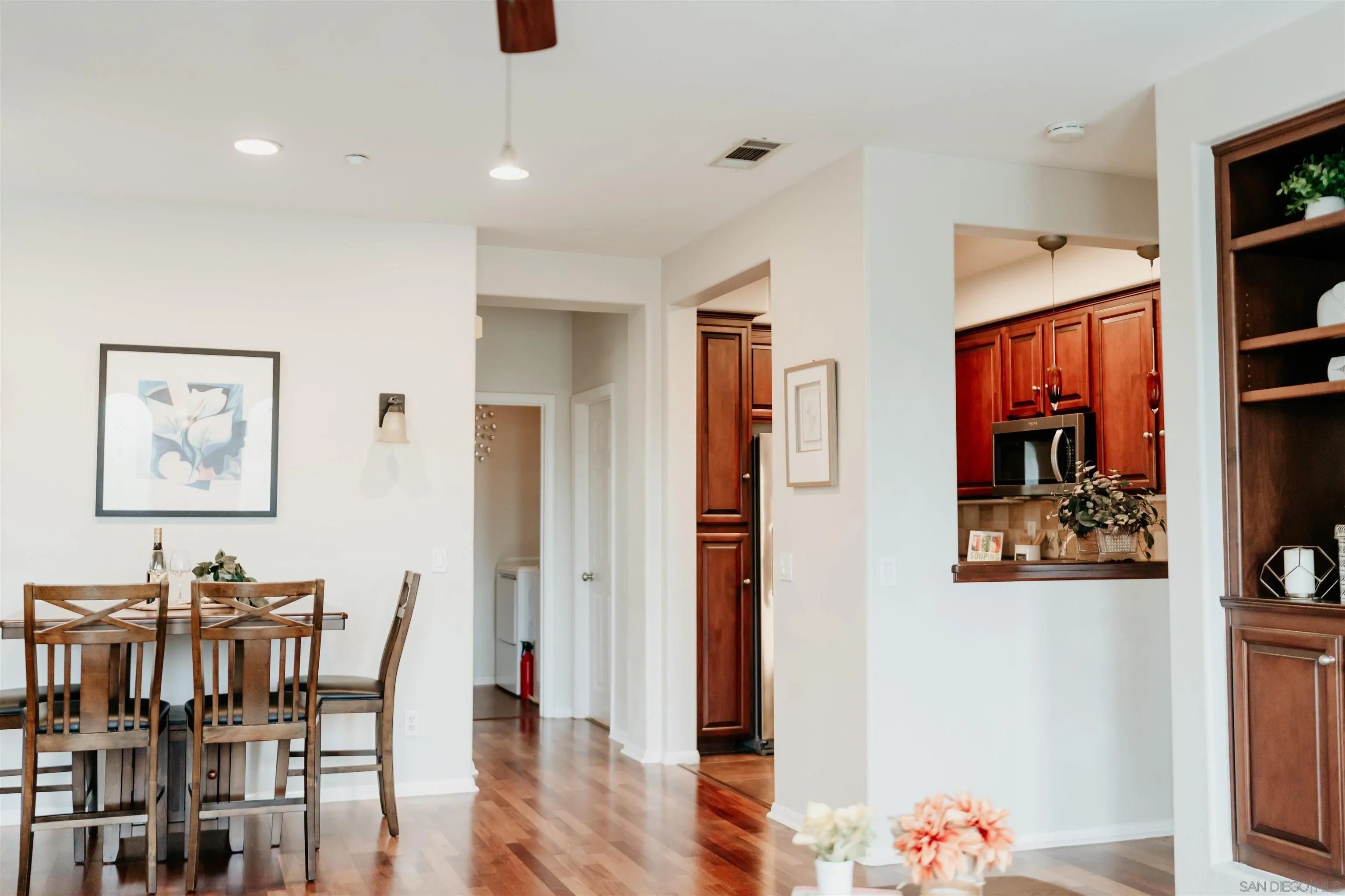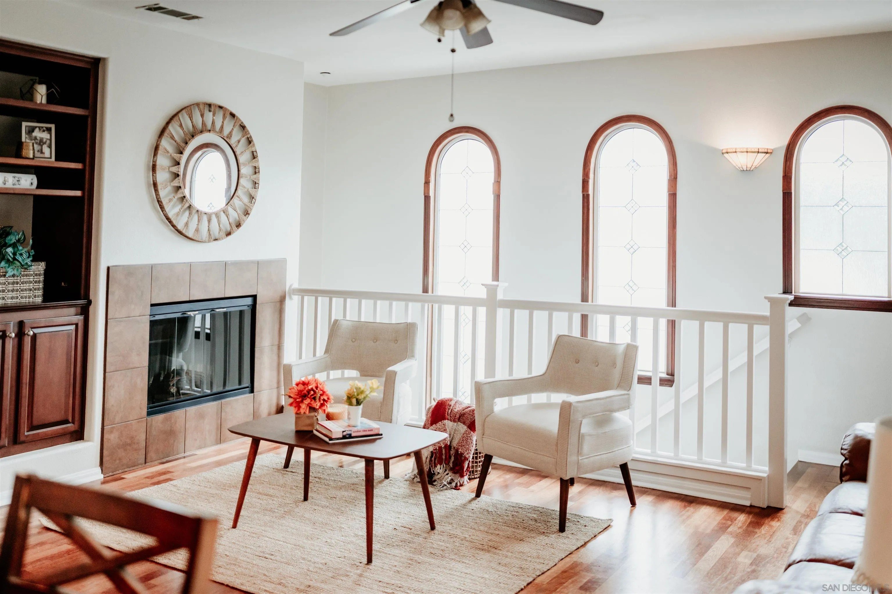 This beautifully maintained townhome features an open floor plan with high-end touches throughout, including upgraded kitchen counters, refinished hardwood floors, ceiling fans, designer paint, a private balcony, and a cozy fireplace in the living/dining area. All living spaces are located on the second floor with direct access from the attached 1-car garage.The master suite includes a spacious walk-in closet . The home comes with a dedicated laundry room for convenience. With fully paid solar to offset electricity costs and zoning for the top-rated Poway Unified School District, this home offers both comfort and value. Ideally situated in one of the best locations within the Monaco complex, residents enjoy community amenities such as a sparkling pool and spa, along with close proximity to shopping, dining, parks, schools, and easy freeway access. Torrey Meadows Park and the highly ranked West View High School are just few blocks away.