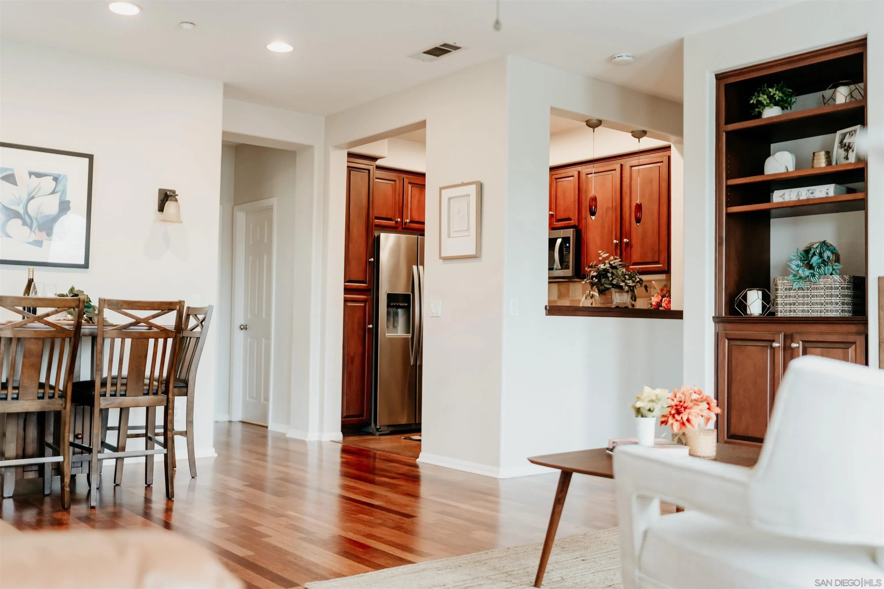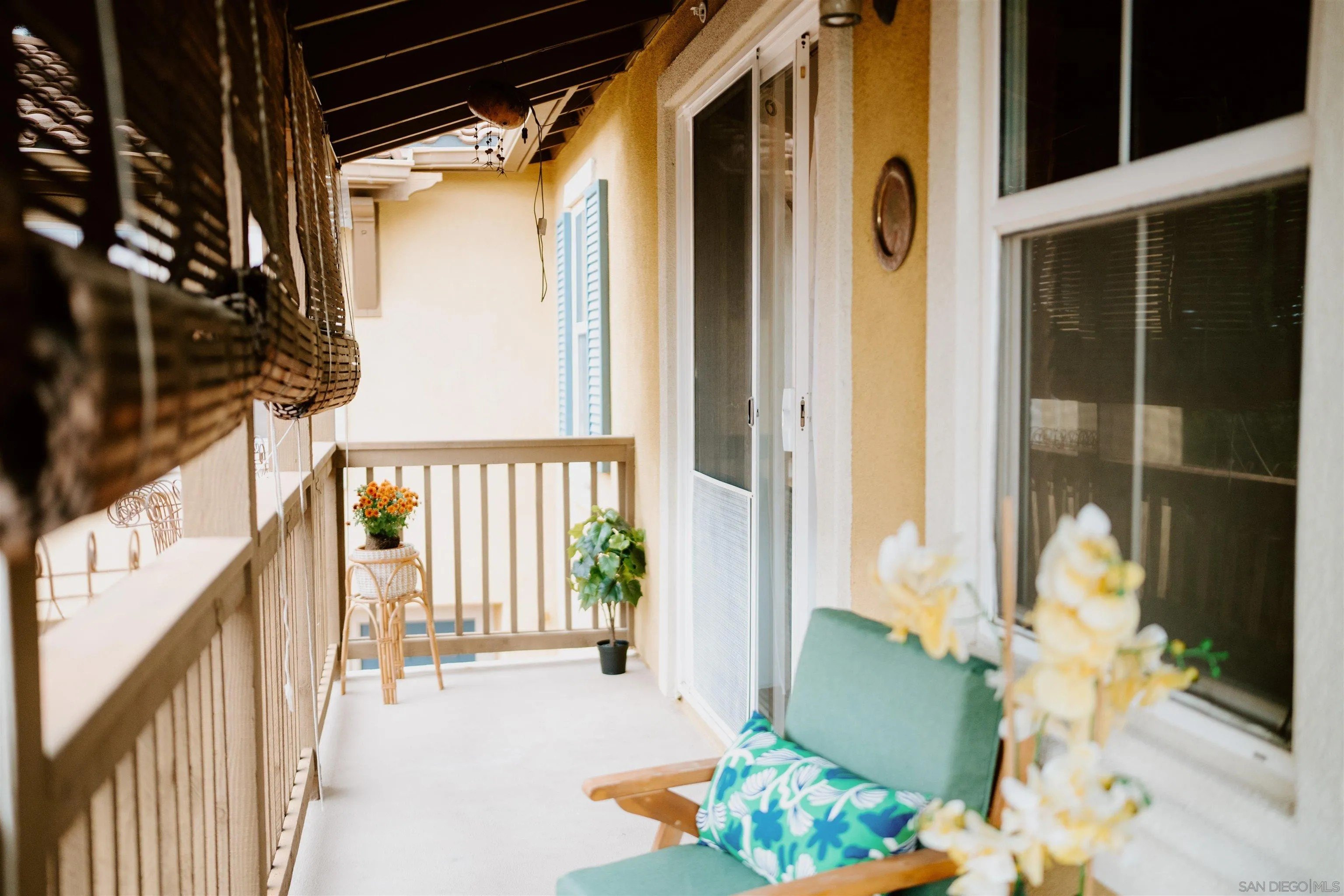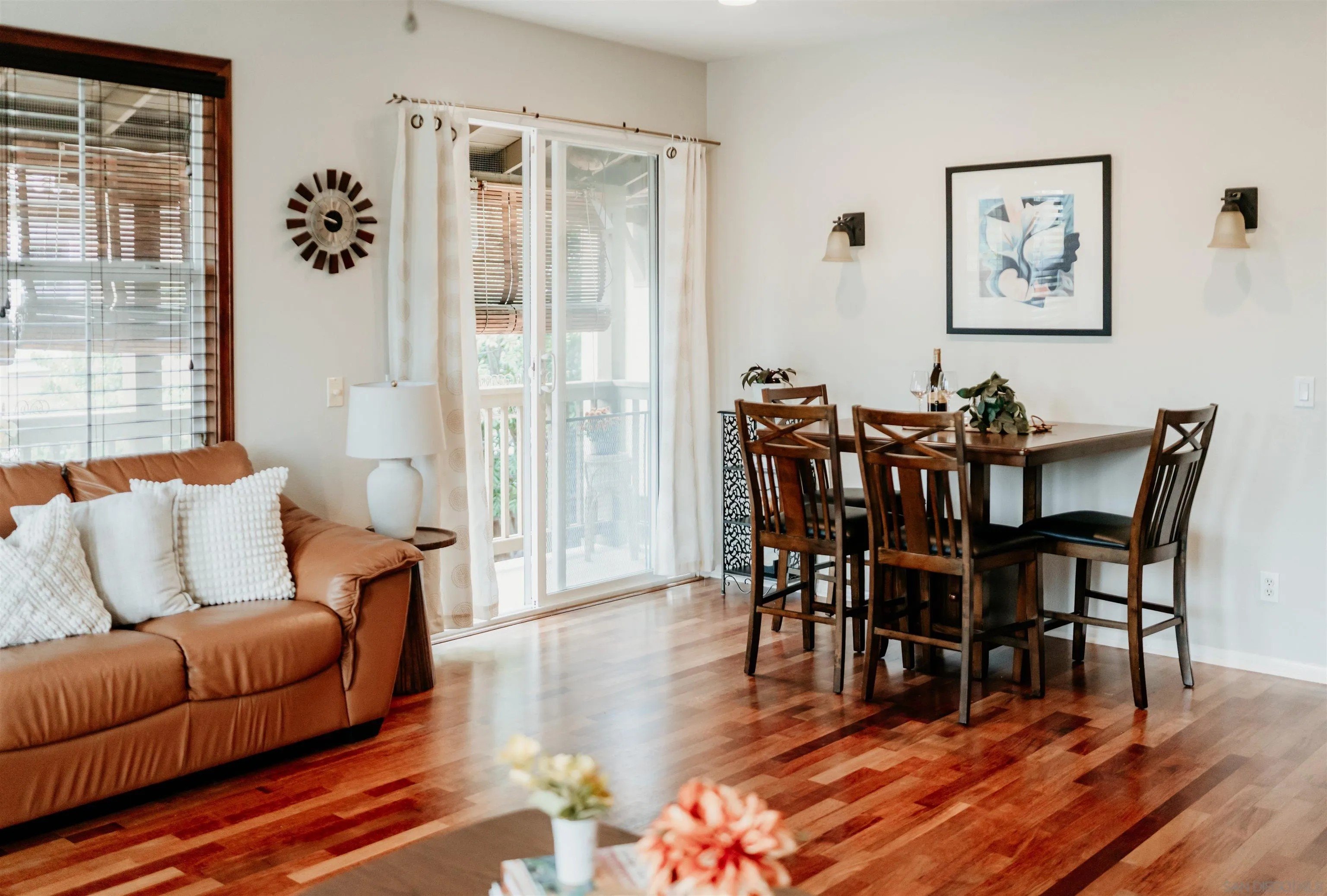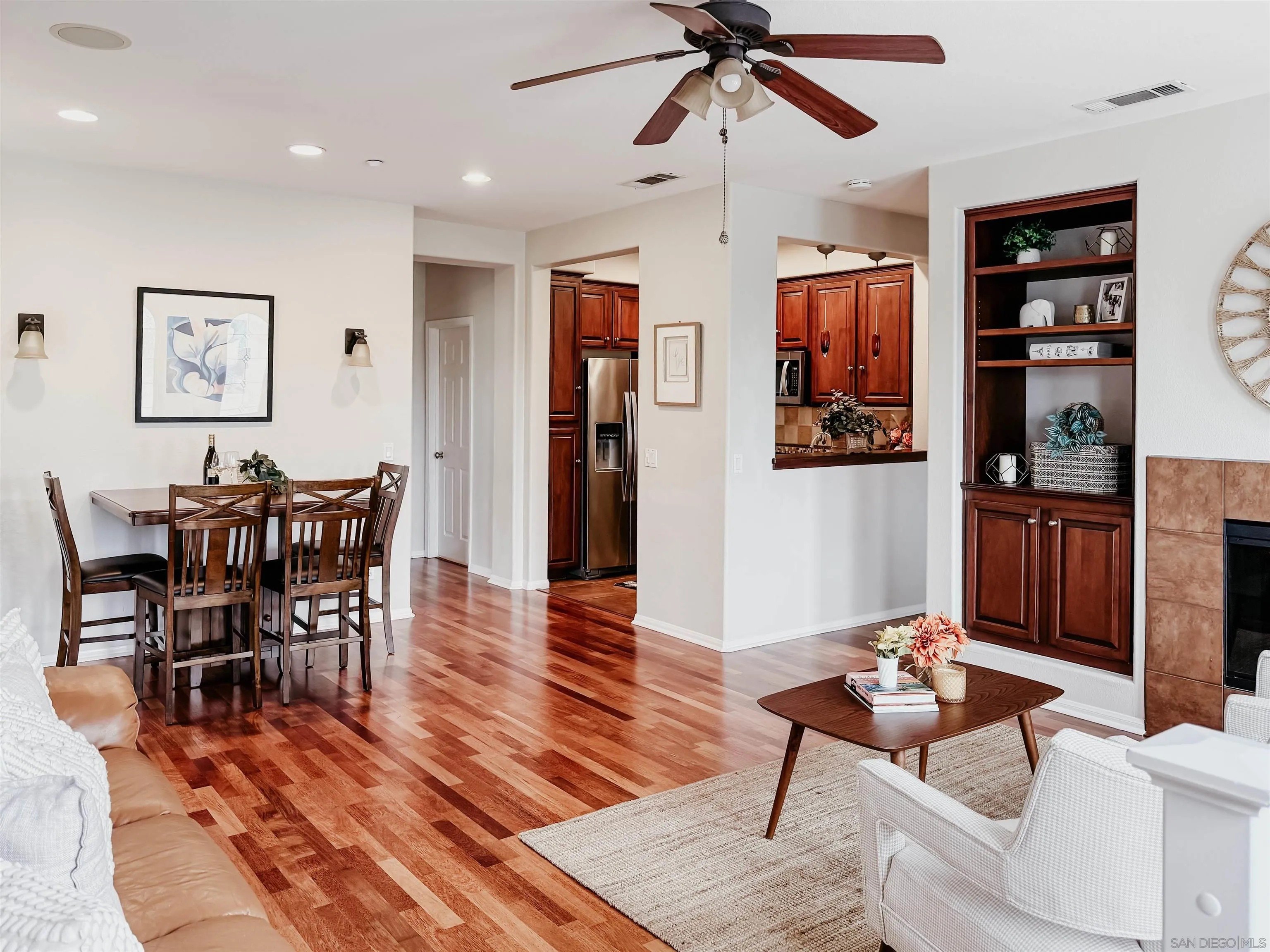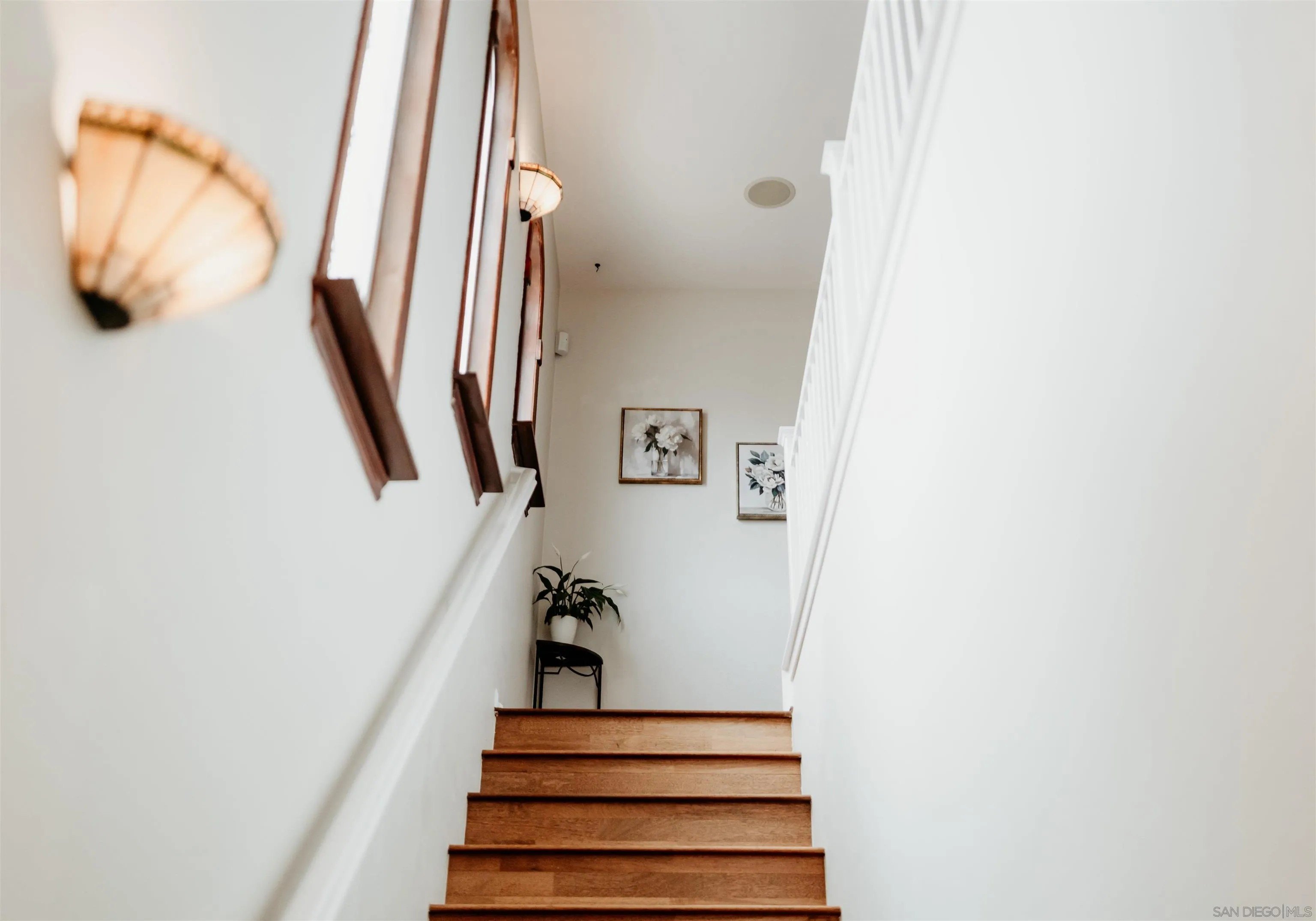This beautifully maintained townhome features an open floor plan with high-end touches throughout, including upgraded kitchen counters, refinished hardwood floors, ceiling fans, designer paint, a private balcony, and a cozy fireplace in the living/dining area. All living spaces are located on the second floor with direct access from the attached 1-car garage.The master suite includes a spacious walk-in closet . The home comes with a dedicated laundry room for convenience. With fully paid solar to offset electricity costs and zoning for the top-rated Poway Unified School District, this home offers both comfort and value. Ideally situated in one of the best locations within the Monaco complex, residents enjoy community amenities such as a sparkling pool and spa, along with close proximity to shopping, dining, parks, schools, and easy freeway access. Torrey Meadows Park and the highly ranked West View High School are just few blocks away.