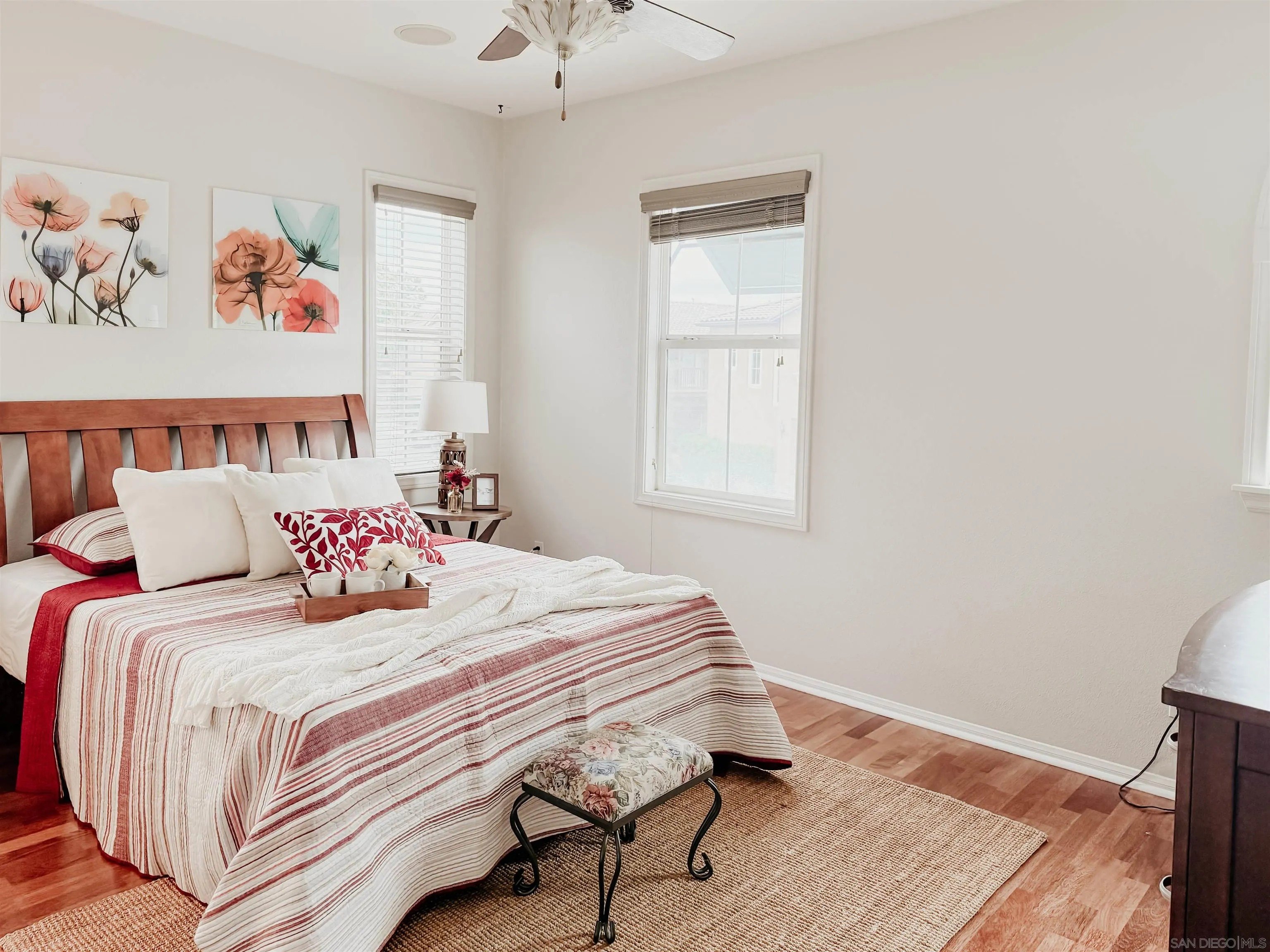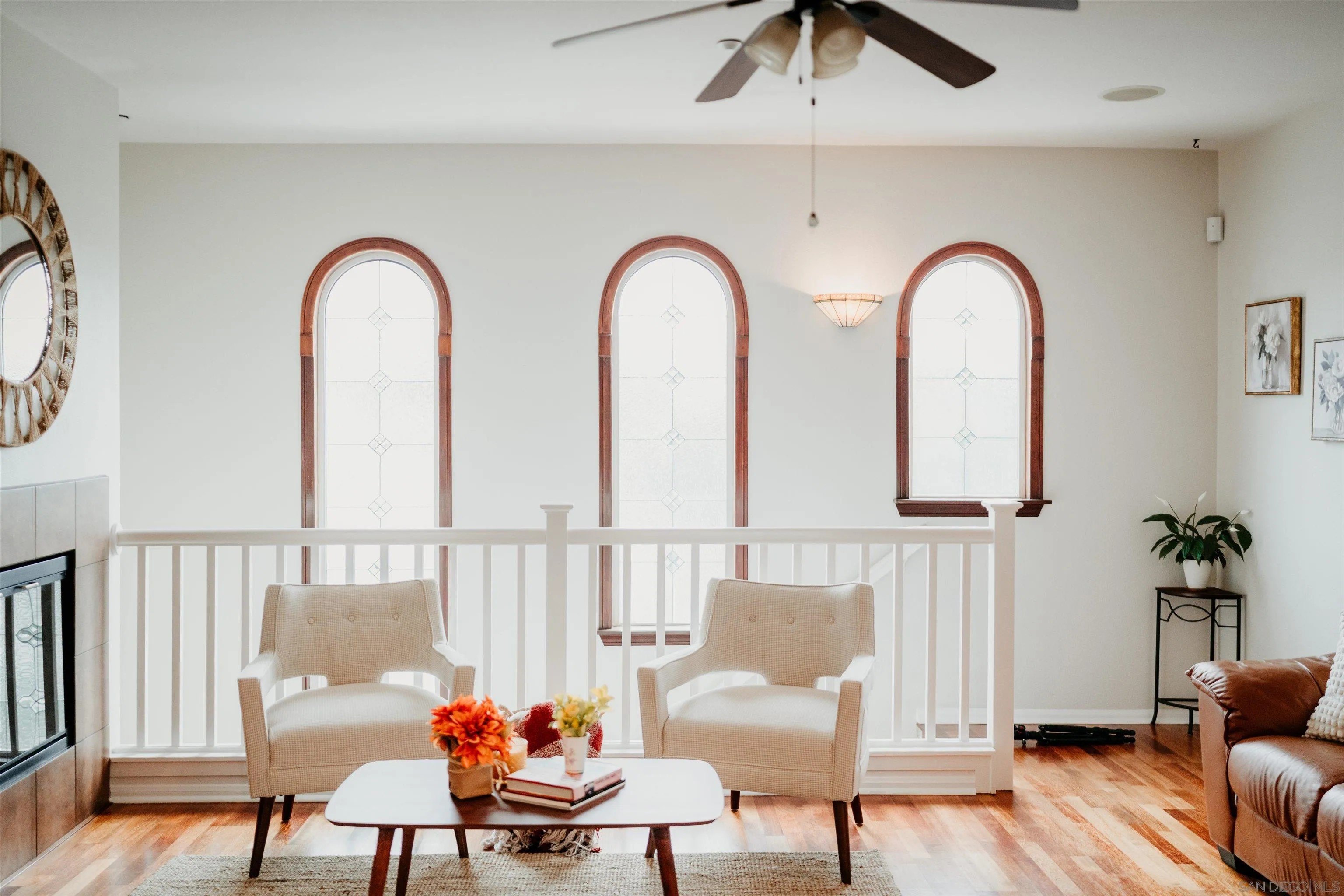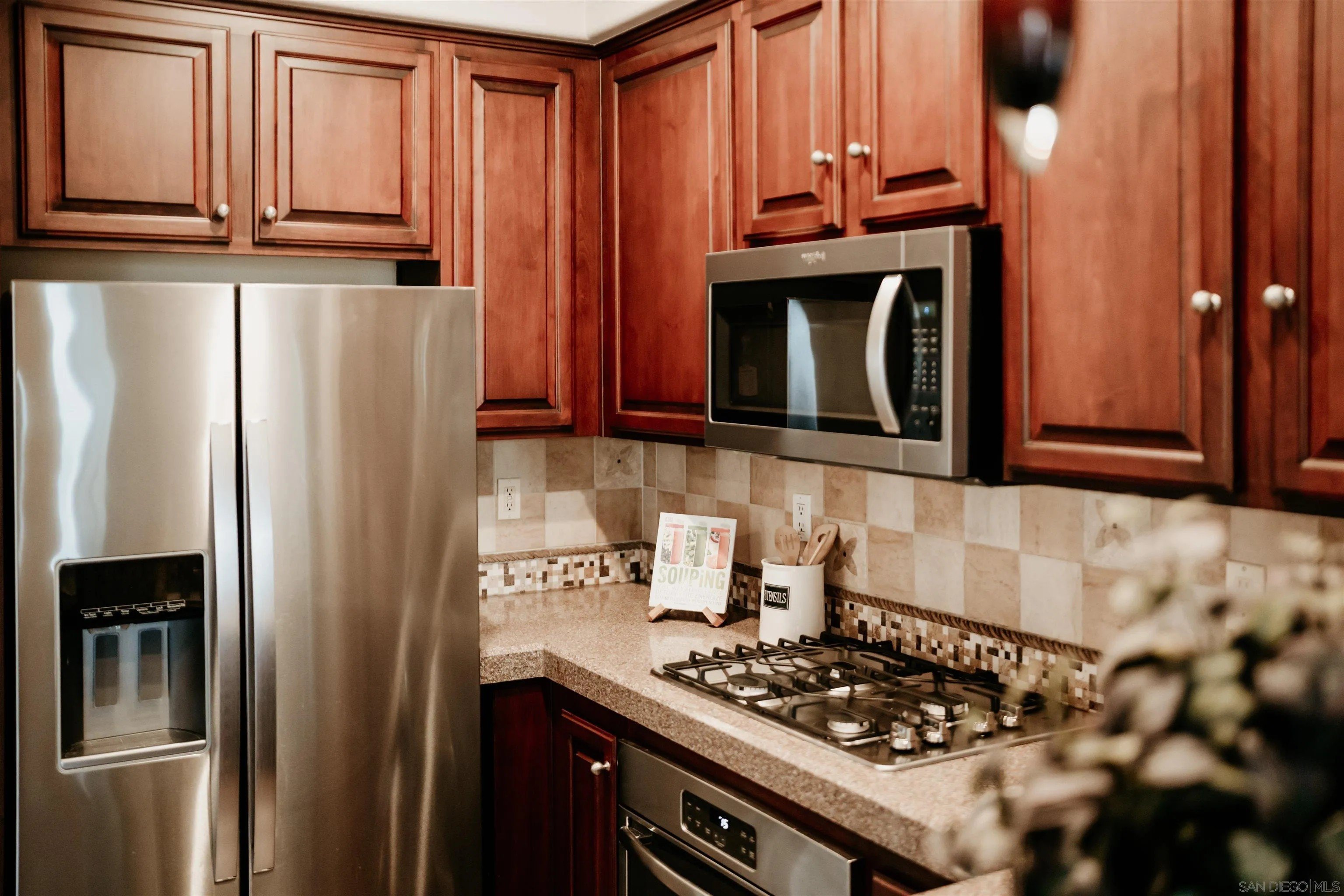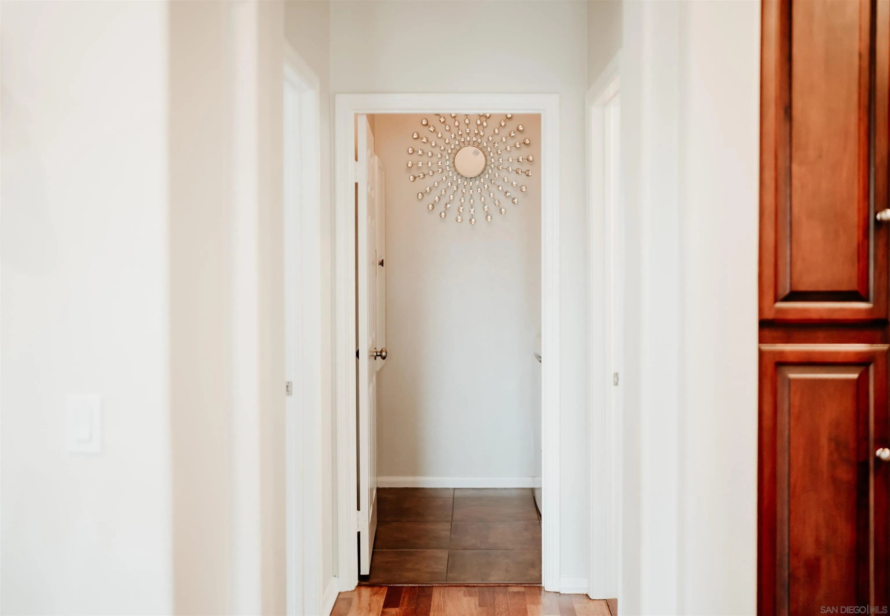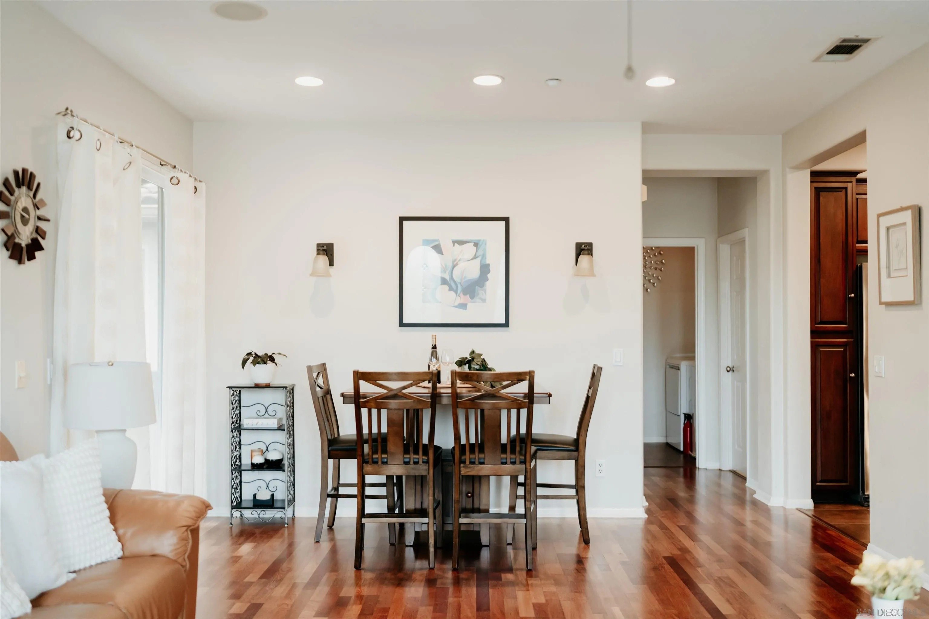 This beautifully maintained townhome features an open floor plan with high-end touches throughout, including upgraded kitchen counters, refinished hardwood floors, ceiling fans, designer paint, a private balcony, and a cozy fireplace in the living/dining area. All living spaces are located on the second floor with direct access from the attached 1-car garage.The master suite includes a spacious walk-in closet . The home comes with a dedicated laundry room for convenience. With fully paid solar to offset electricity costs and zoning for the top-rated Poway Unified School District, this home offers both comfort and value. Ideally situated in one of the best locations within the Monaco complex, residents enjoy community amenities such as a sparkling pool and spa, along with close proximity to shopping, dining, parks, schools, and easy freeway access. Torrey Meadows Park and the highly ranked West View High School are just few blocks away.