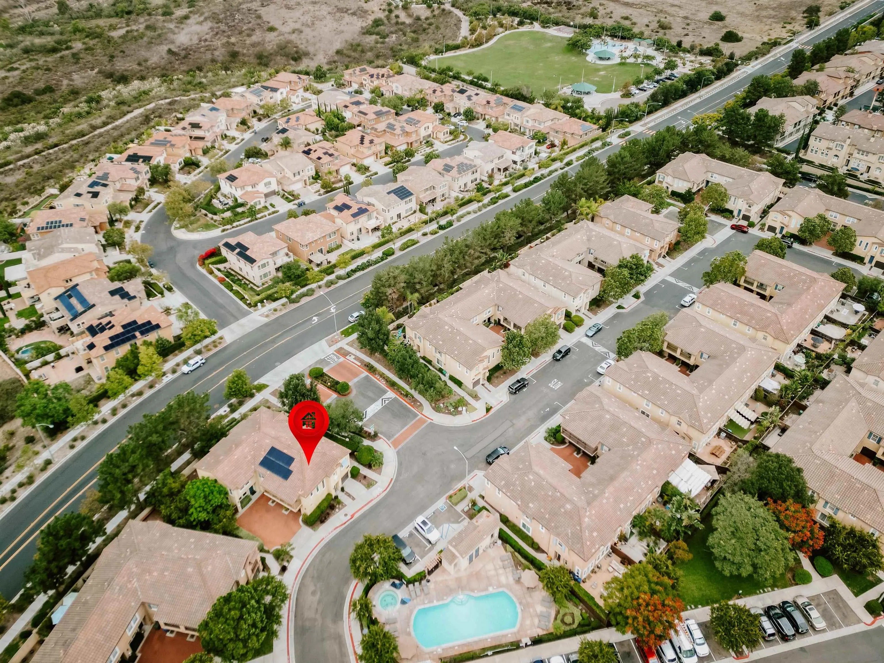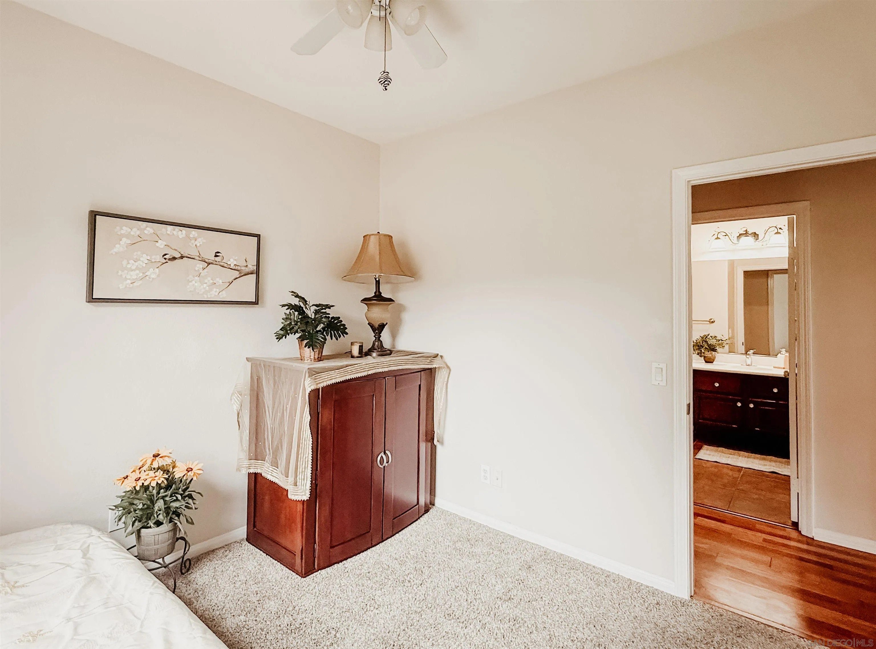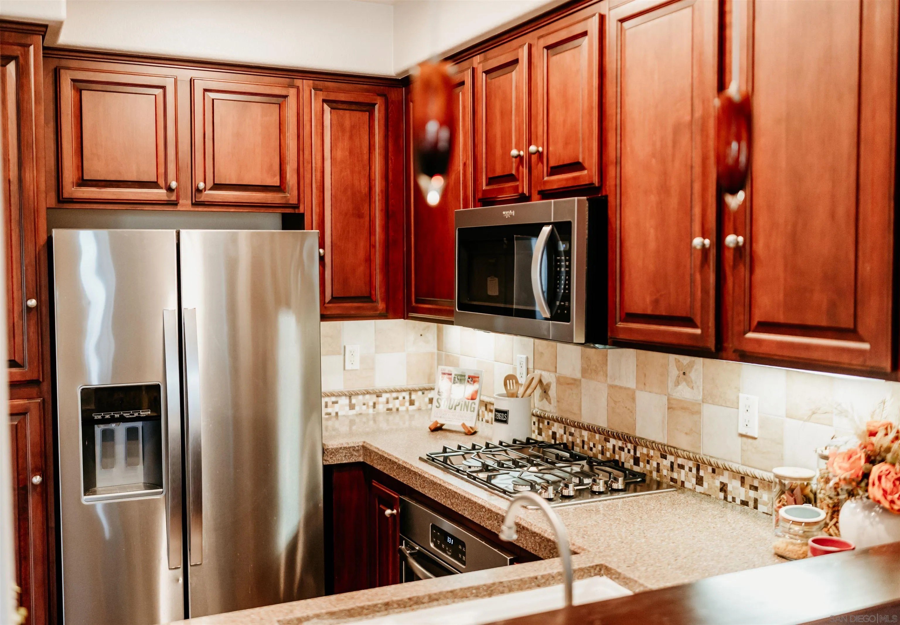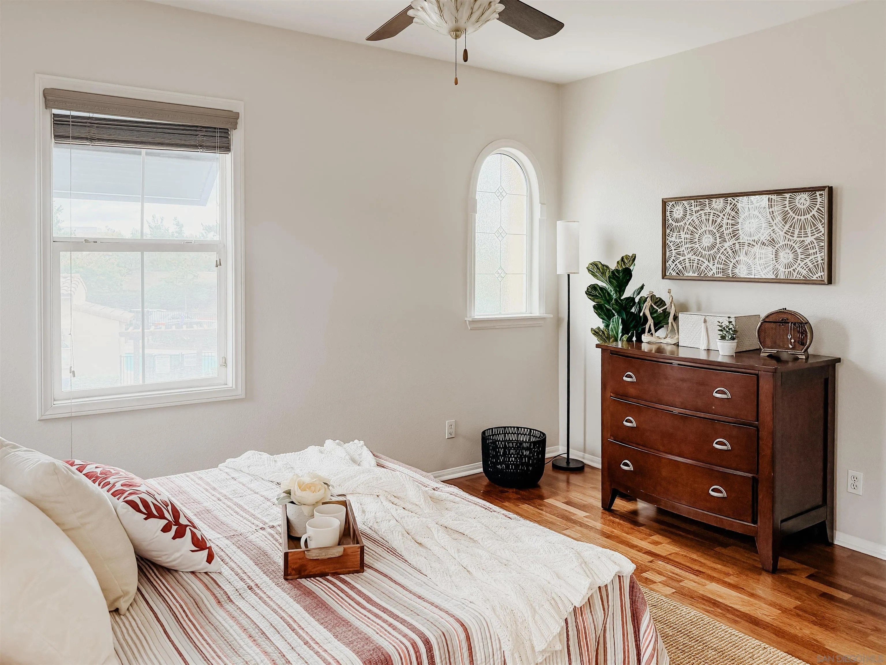 This beautifully maintained townhome features an open floor plan with high-end touches throughout, including upgraded kitchen counters, refinished hardwood floors, ceiling fans, designer paint, a private balcony, and a cozy fireplace in the living/dining area. All living spaces are located on the second floor with direct access from the attached 1-car garage.The master suite includes a spacious walk-in closet . The home comes with a dedicated laundry room for convenience. With fully paid solar to offset electricity costs and zoning for the top-rated Poway Unified School District, this home offers both comfort and value. Ideally situated in one of the best locations within the Monaco complex, residents enjoy community amenities such as a sparkling pool and spa, along with close proximity to shopping, dining, parks, schools, and easy freeway access. Torrey Meadows Park and the highly ranked West View High School are just few blocks away.