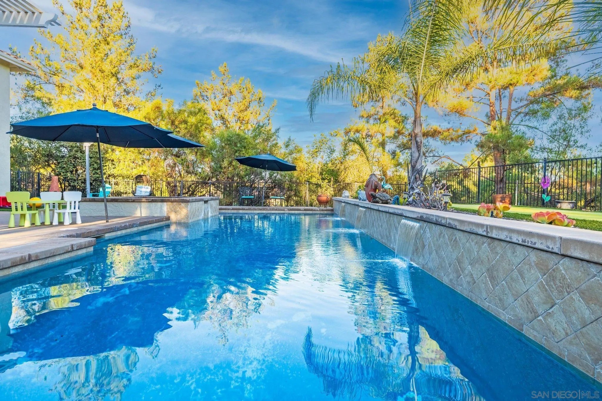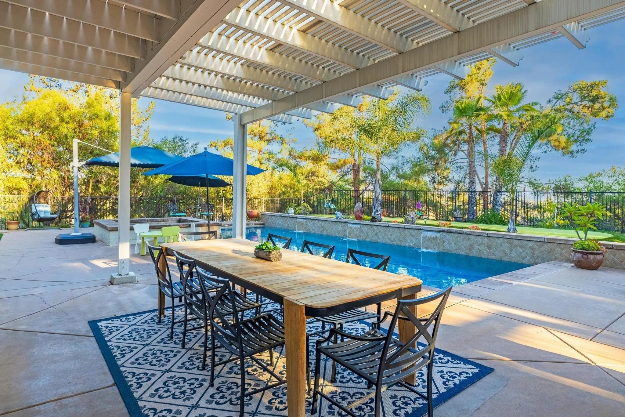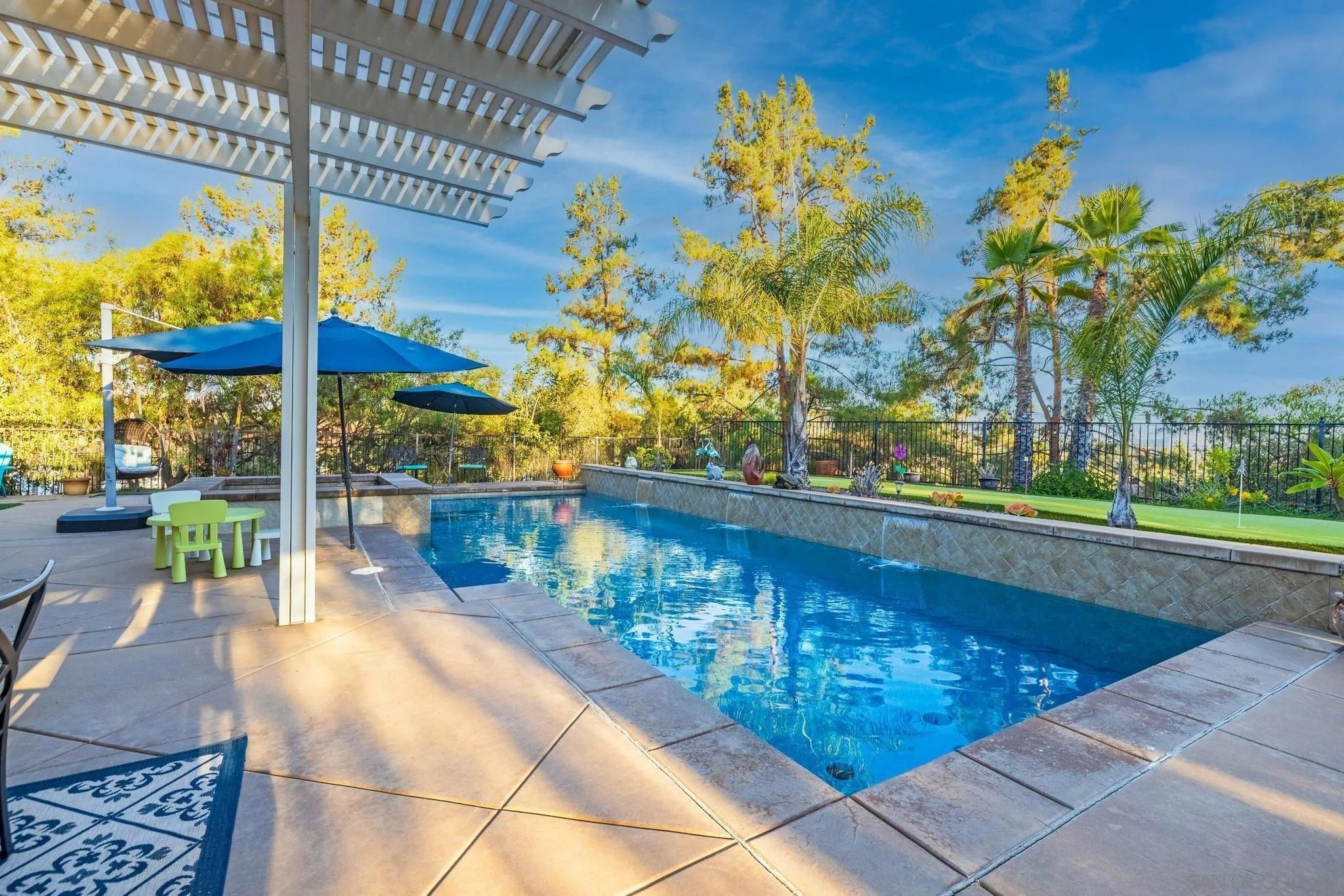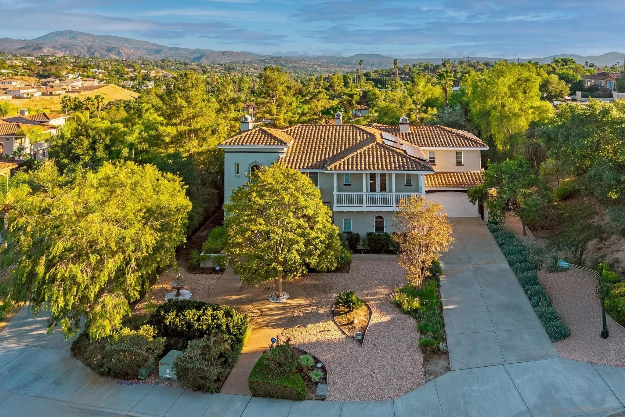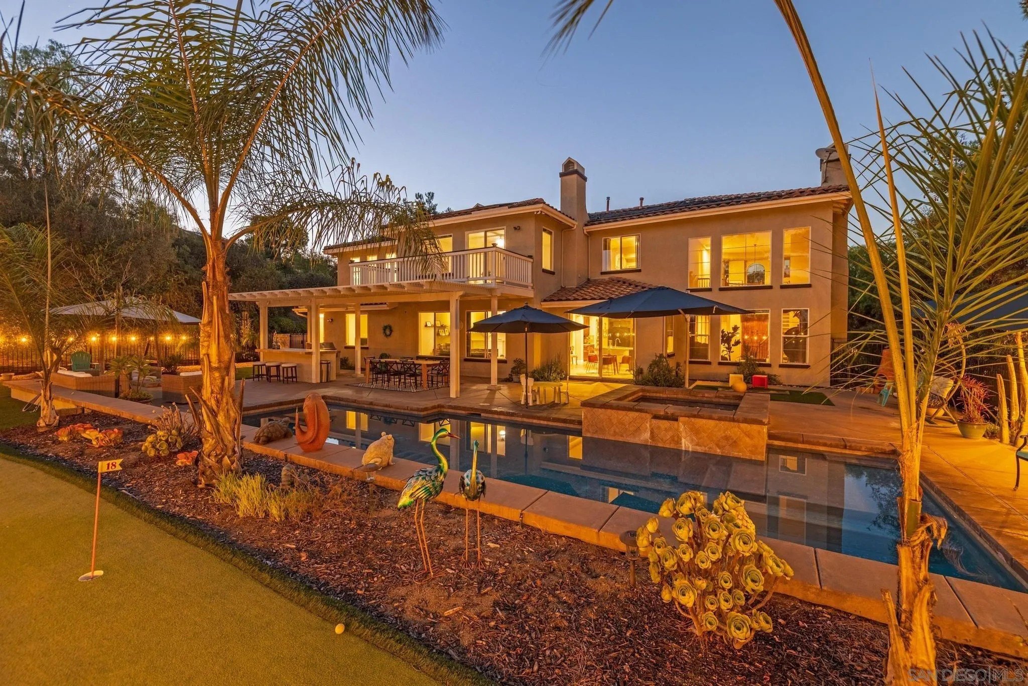 RESORT LIKE HOME in the prime South Escondido location that offers PANORAMIC VIEW and private solar heated swimming pool/Jacuzzi with waterfalls, built-in BBQ, Minigolf course, firepit, AND panoramic southern view! New furnace system. New exterior paint. Only a year old water heater, and fairly new hardwood flooring on the 1st floor! As you open the beautiful carved wood entry door, beautiful family room with backyard view greets you. A ground floor primary suite offers its own private entry and a full bathroom. Open concept kitchen with granite island with full wall cabinets. Up the classic winding staircase you will see a huge loft. Three secondary bedrooms upstairs, Jack and Jill, and 3rd full bathroom. The master suite features dual vanities, his/her walk-in closets, huge bathtub with jets. A Large deck offers picture like mountain views. California or Elfa closet systems in every closet and pull out drawers in cabinets. 4 car garage with epoxy flooring, and whole house sounds system. NO MELLO ROOS AND NO HOA FEES.