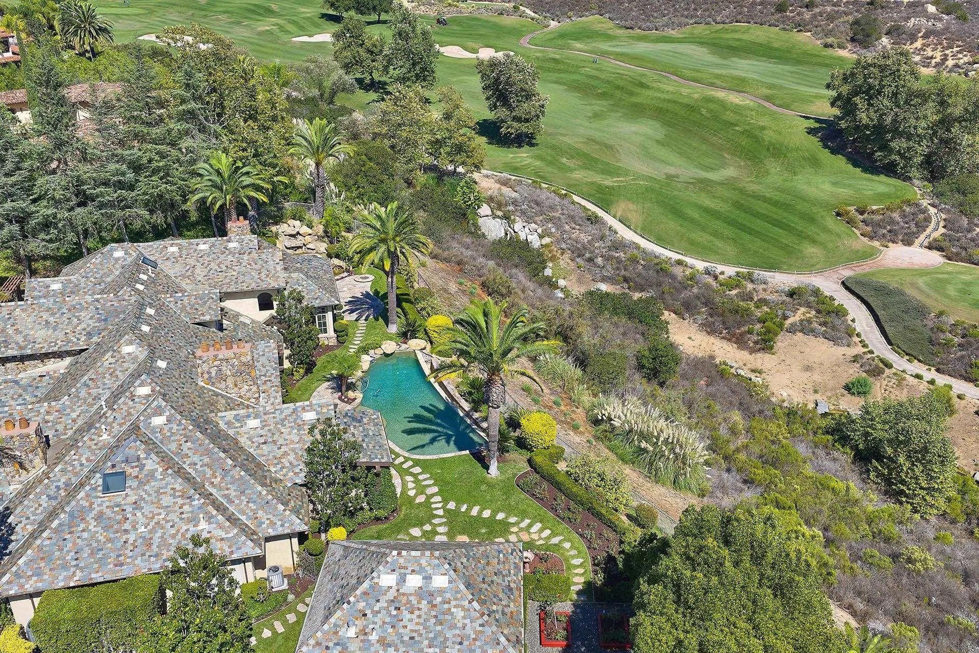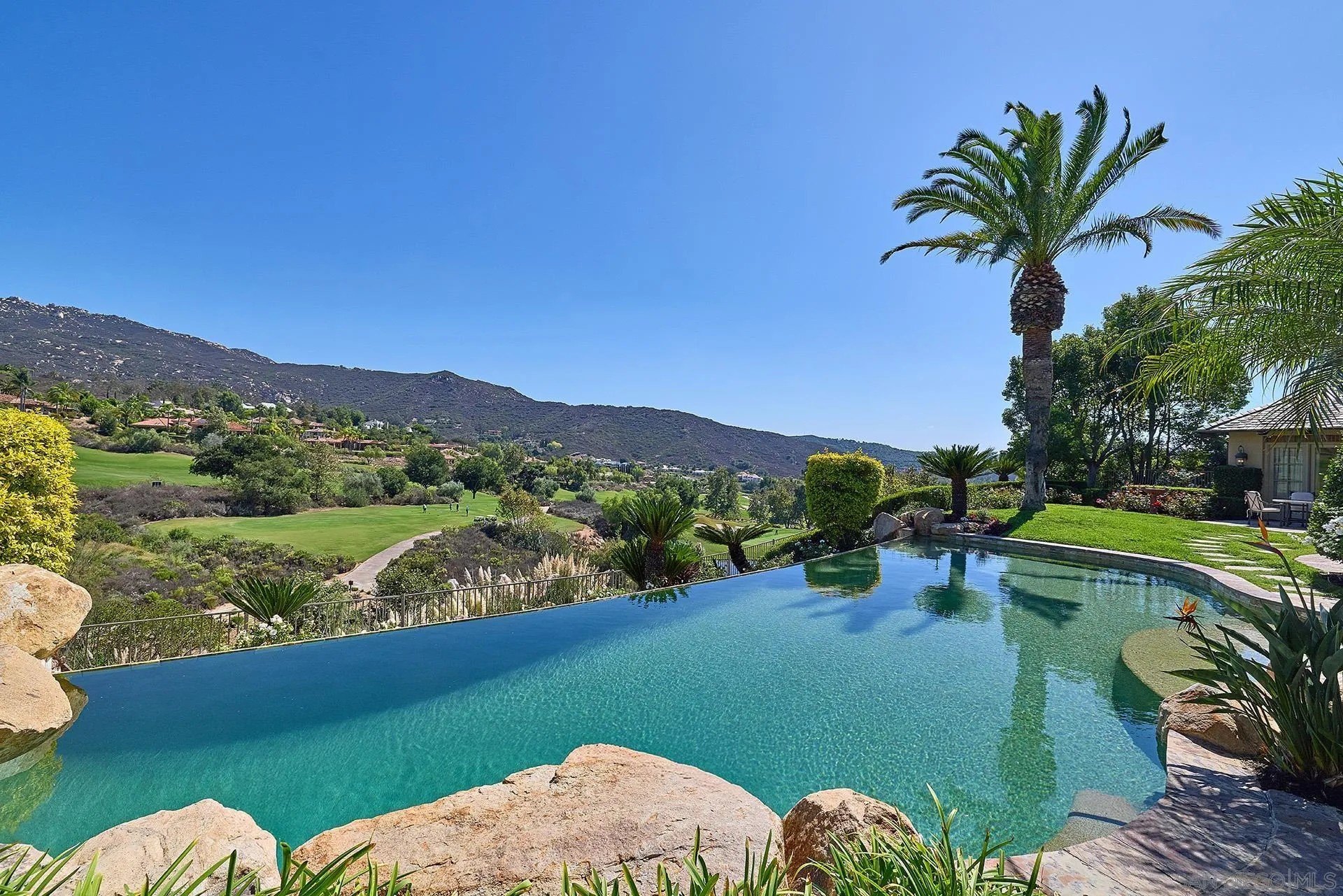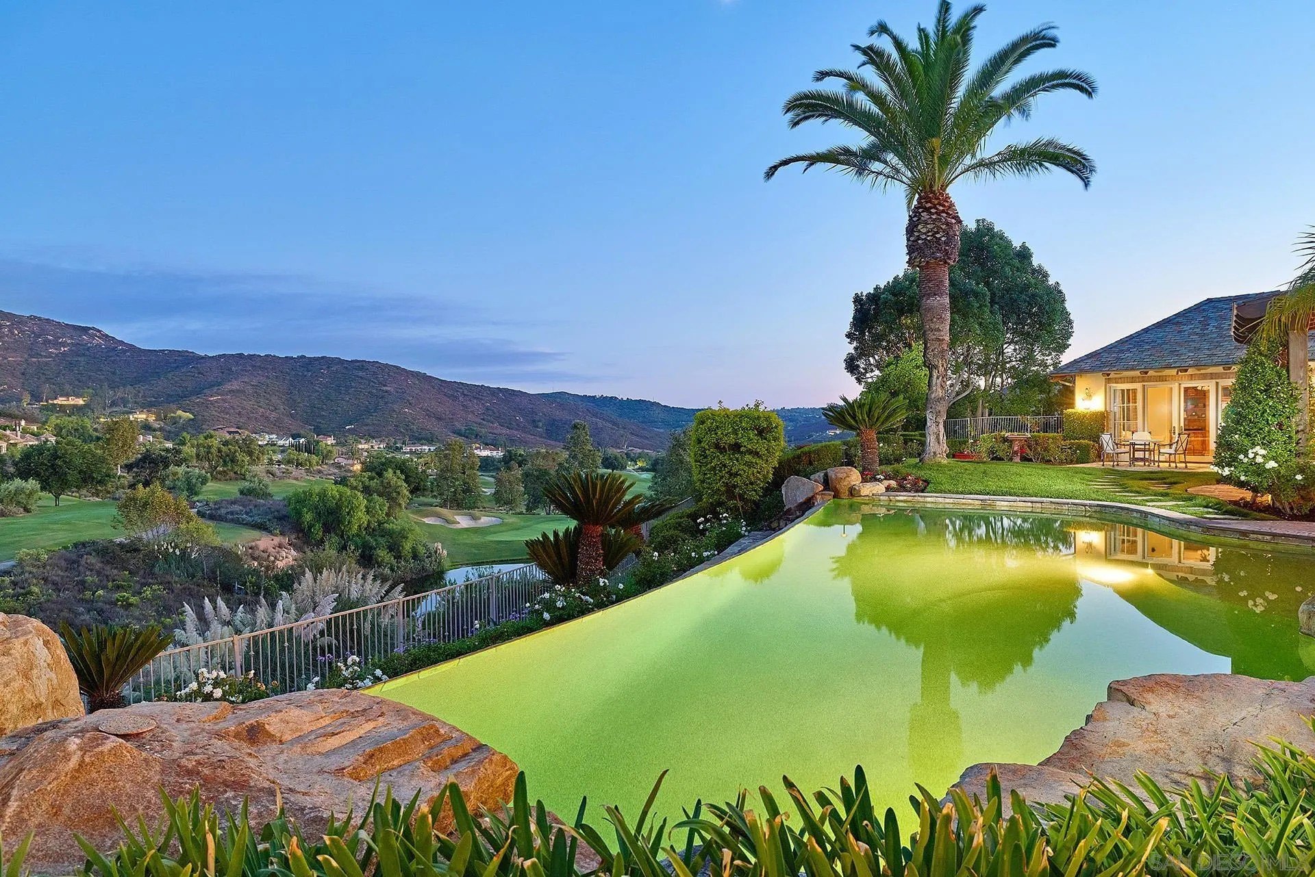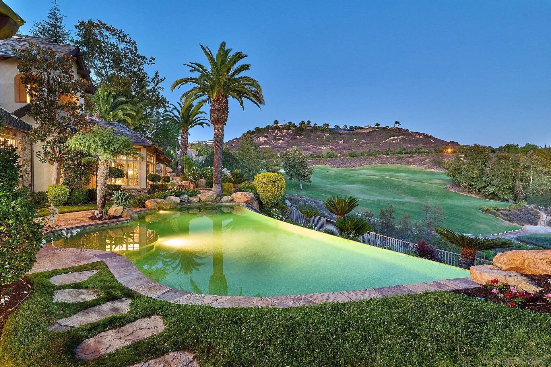 An Iconic French Country Estate in The Heritage Set within the gate-guarded, exclusive community of The Heritage, this Greg Agee French Country masterpiece claims a premier position on over an acre along the second hole of the world-class Maderas Golf Club. Spanning more than 7,800 square feet, this estate blends timeless architectural integrity with resort-inspired living, all framed by immersive panoramic views. A dramatic entry crowned with a dazzling chandelier welcomes you into interiors of refined sophistication-soaring ceilings, freshly refinished hardwood floors, custom millwork, and wainscoting throughout. The great room commands attention with its grand masonry fireplace, vaulted wood-beamed ceilings, and seamless flow into the heart of the home. The gourmet kitchen is a chef's statement, boasting dual Sub-Zeros, a Viking 6-burner range with flat grill, dual Bosch dishwashers, custom alder cabinetry, and a sunlit dining area with golf course views. Formal and casual spaces-from the elegant dining room to the inviting bar-set the stage for effortless entertaining. Designed to live primarily as a single level, the residence offers a serene ground-floor primary suite with dual walk-in closets, dual water closets, and spa-inspired vanities. A handsome office, an additional ensuite bedroom on the main level, with three upper ensuite retreats ensure comfort for all. A detached one-bedroom casita adds privacy and resort style living for extended guests. Outdoors, the home transforms into a private resort: a vanishing-edge pool spilling toward the fairways.