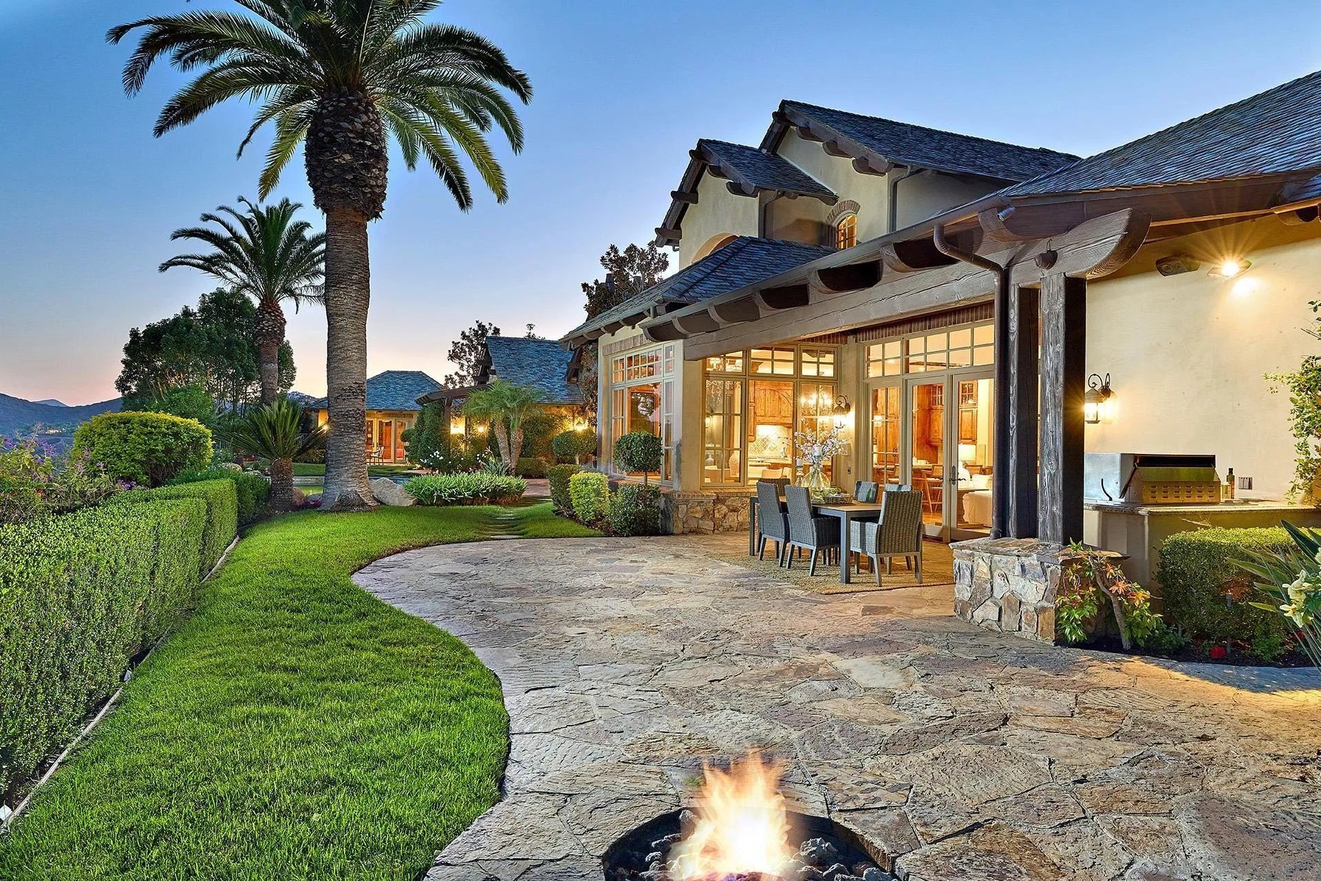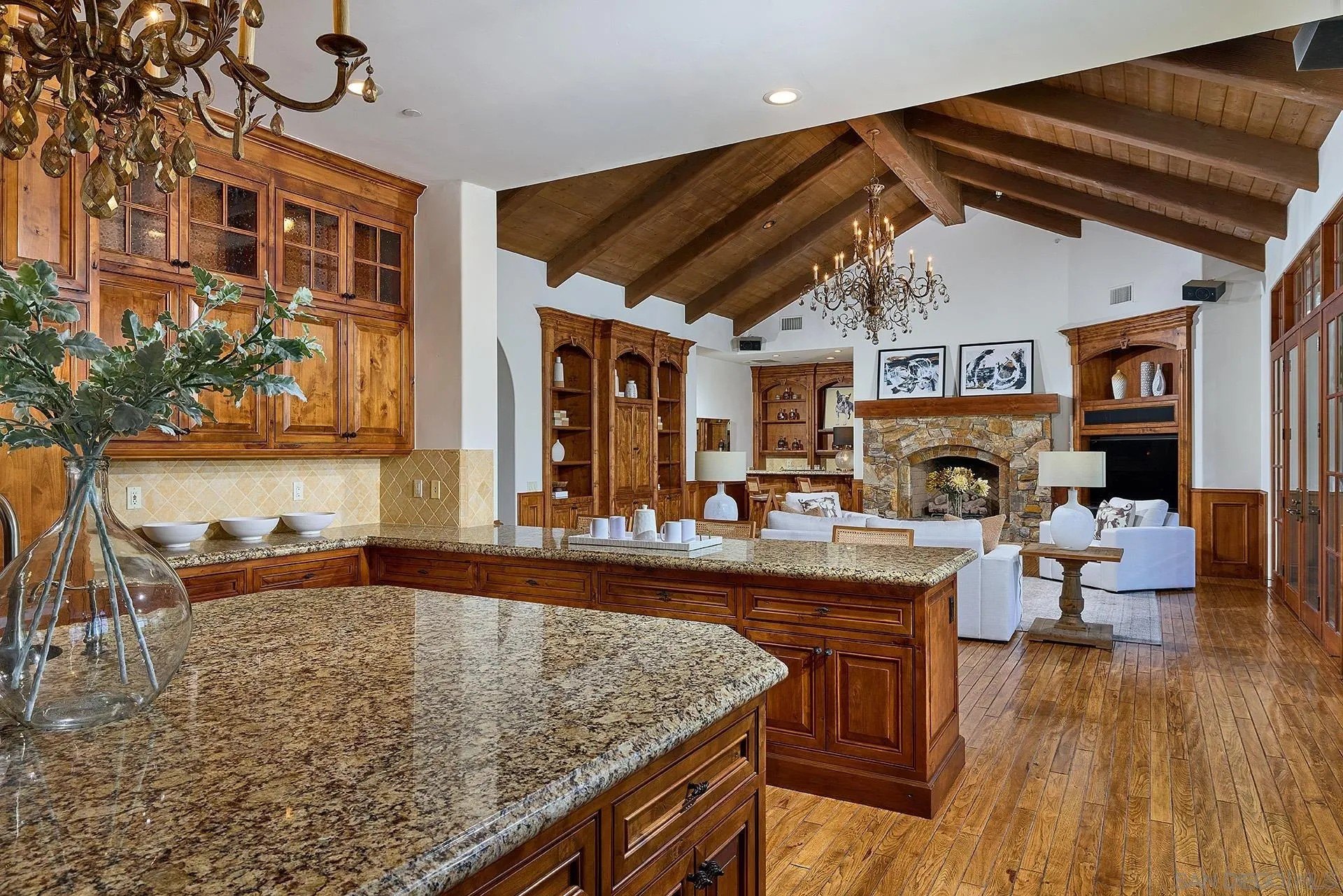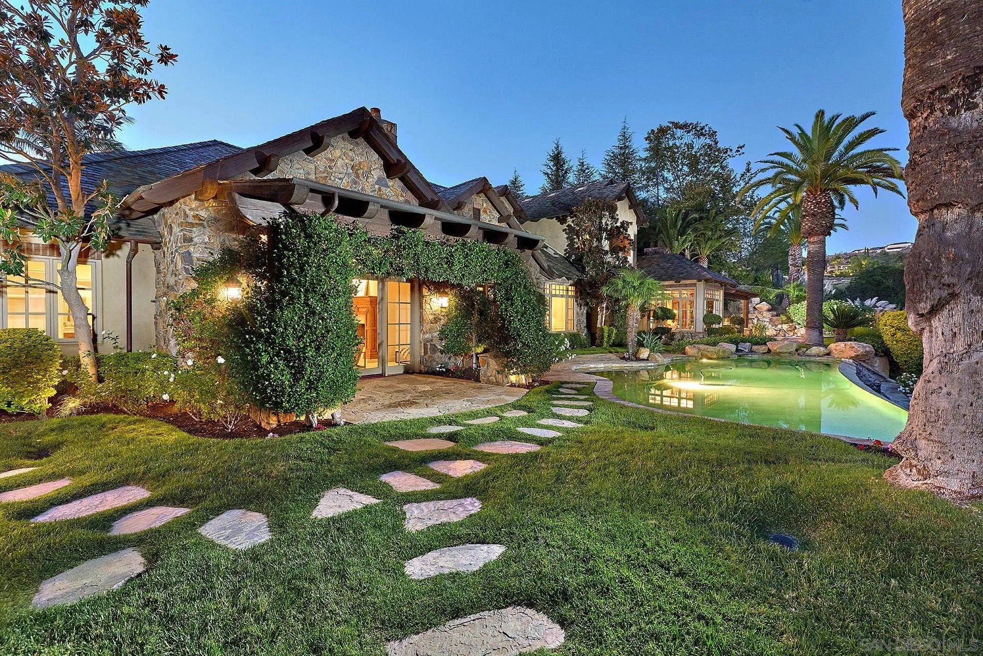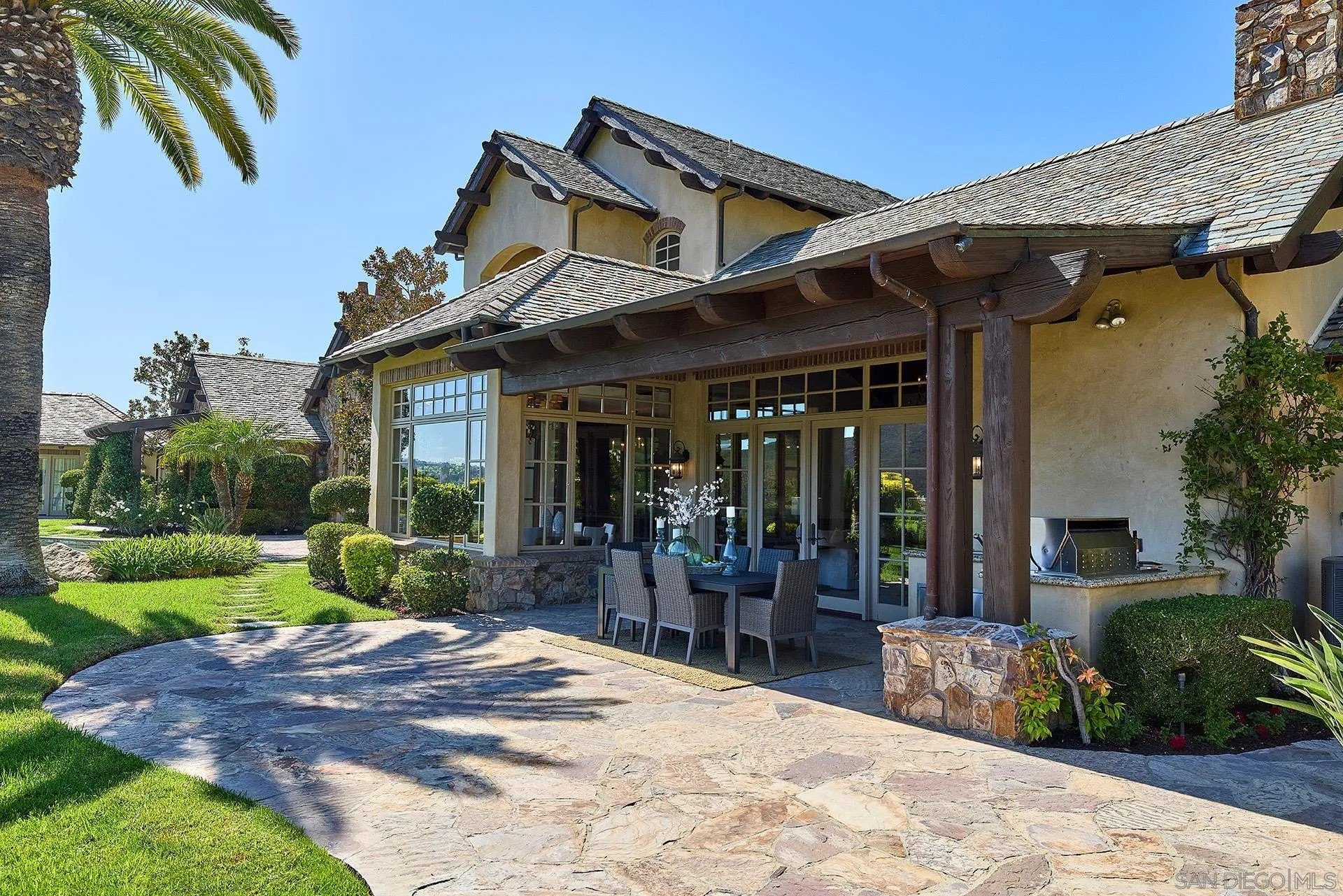 An Iconic French Country Estate in The Heritage Set within the gate-guarded, exclusive community of The Heritage, this Greg Agee French Country masterpiece claims a premier position on over an acre along the second hole of the world-class Maderas Golf Club. Spanning more than 7,800 square feet, this estate blends timeless architectural integrity with resort-inspired living, all framed by immersive panoramic views. A dramatic entry crowned with a dazzling chandelier welcomes you into interiors of refined sophistication-soaring ceilings, freshly refinished hardwood floors, custom millwork, and wainscoting throughout. The great room commands attention with its grand masonry fireplace, vaulted wood-beamed ceilings, and seamless flow into the heart of the home. The gourmet kitchen is a chef's statement, boasting dual Sub-Zeros, a Viking 6-burner range with flat grill, dual Bosch dishwashers, custom alder cabinetry, and a sunlit dining area with golf course views. Formal and casual spaces-from the elegant dining room to the inviting bar-set the stage for effortless entertaining. Designed to live primarily as a single level, the residence offers a serene ground-floor primary suite with dual walk-in closets, dual water closets, and spa-inspired vanities. A handsome office, an additional ensuite bedroom on the main level, with three upper ensuite retreats ensure comfort for all. A detached one-bedroom casita adds privacy and resort style living for extended guests. Outdoors, the home transforms into a private resort: a vanishing-edge pool spilling toward the fairways.