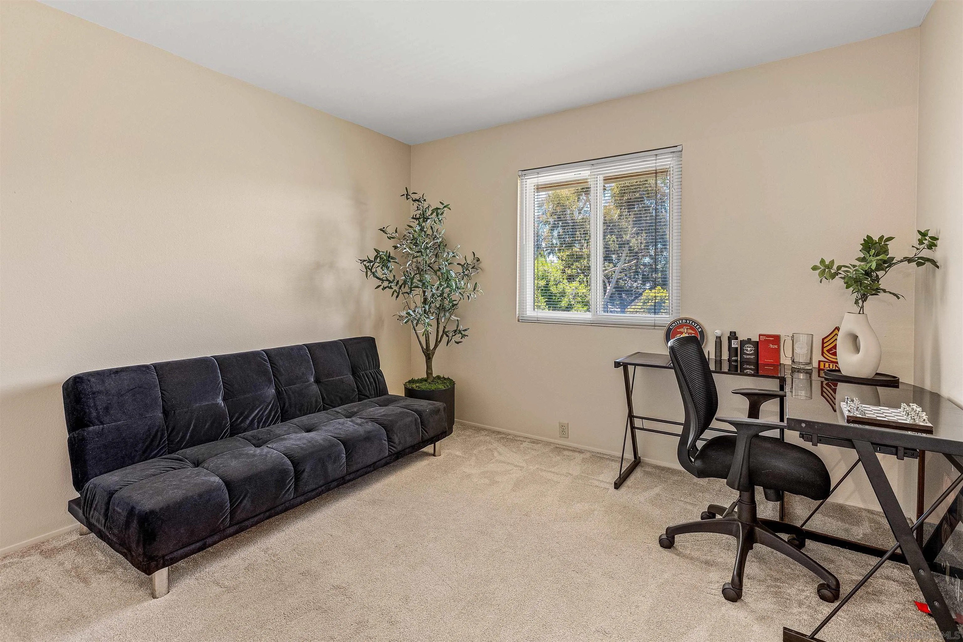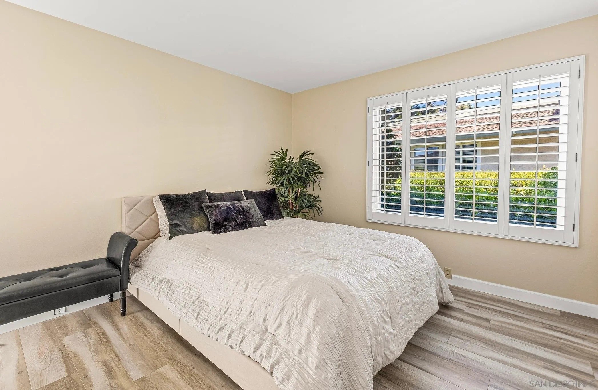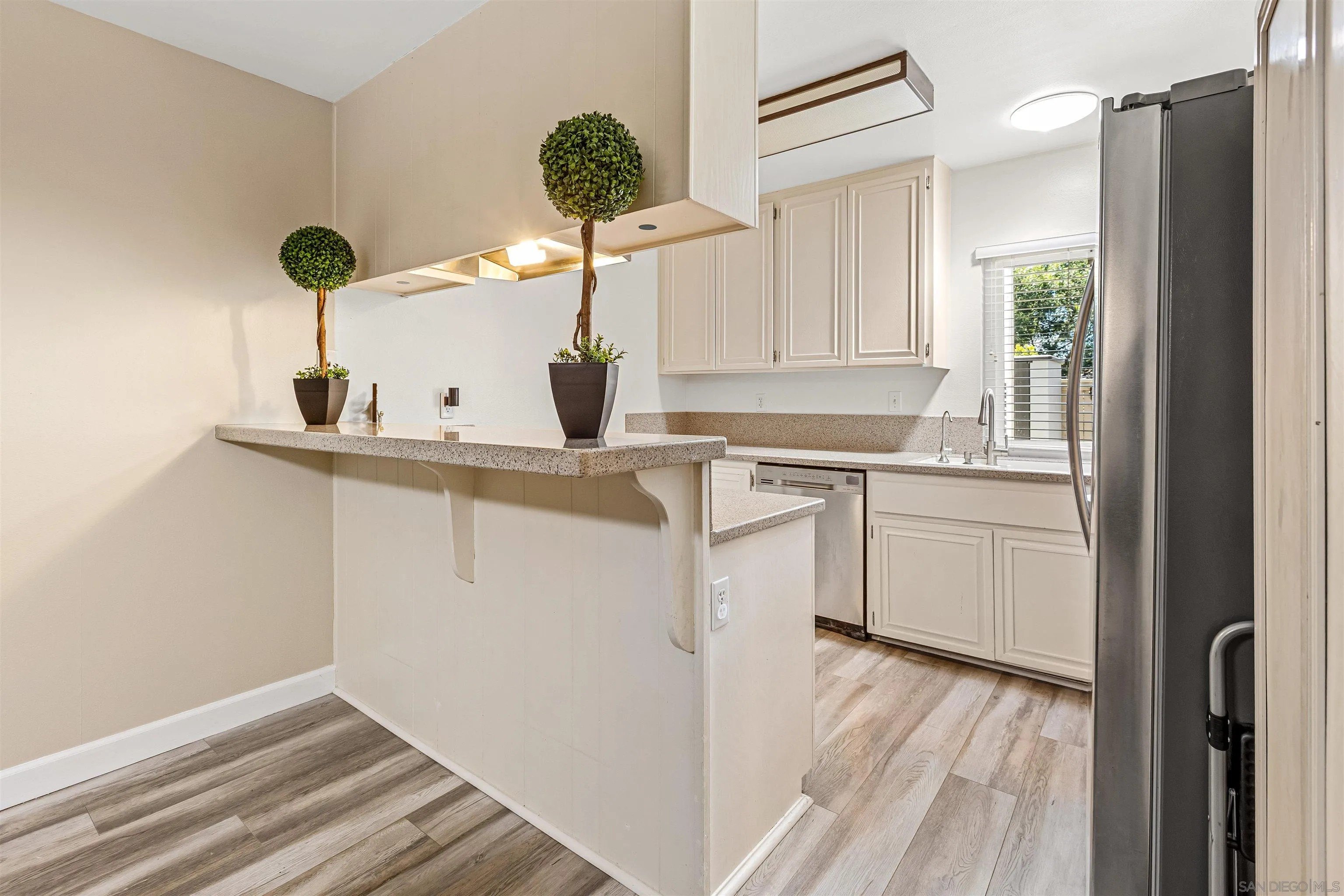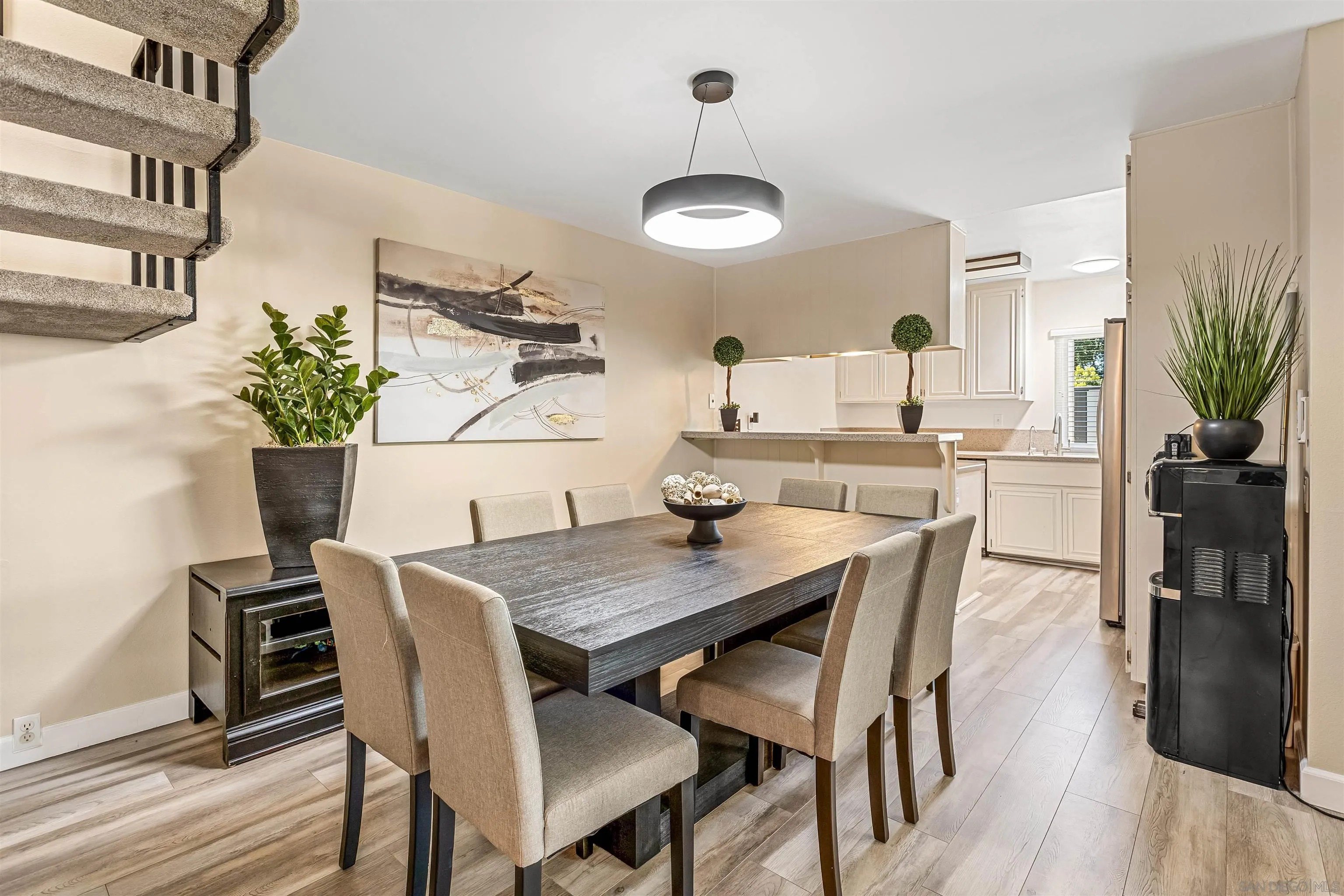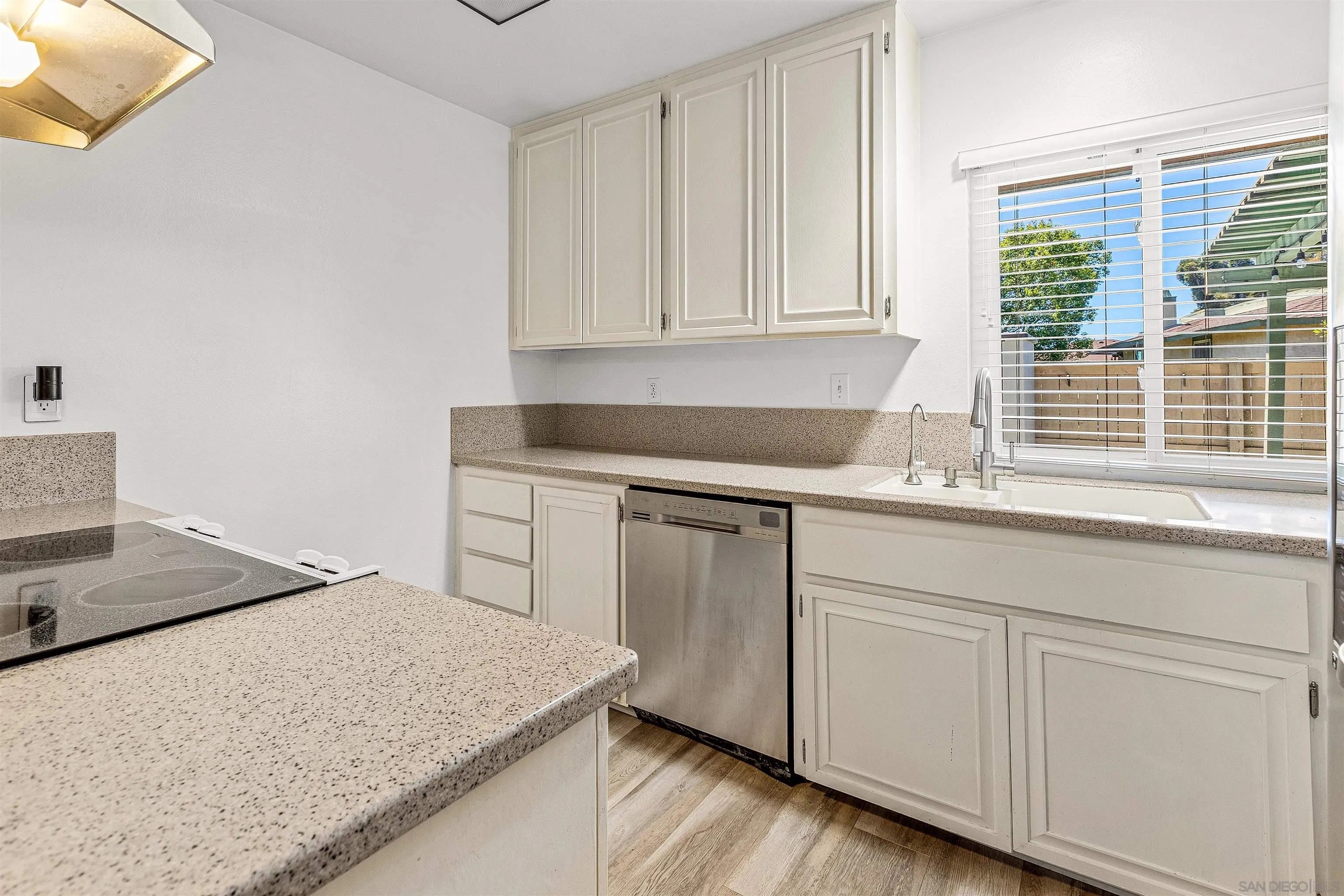 Welcome to this stunning townhome in the highly sought-after Quest Complex of Mira Mesa! Enjoy a premium, quiet location tucked away in the back corner of the community, surrounded by lush greenbelt views. Inside, the open-concept floor plan is enhanced with an A/C system, fresh interior paint, new carpeting, plantation shutters, designer lighting, and luxury vinyl plank flooring. The kitchen features crisp white cabinetry, Corian countertops, and convenient bar seating, while the spacious living room with a cozy fireplace flows seamlessly into the dining area. A downstairs bedroom and full bathroom offer added flexibility for guests or a home office. Meander outside to an expansive private patio-perfect for entertaining, relaxing, or dining al fresco-complete with a laundry closet for added convenience. Two assigned parking spots are located nearby. The community offers resort-style amenities with two swimming pools, two spas, and beautifully maintained park-like grounds. HOA dues include water, trash, and exterior landscaping. Ideally located close to freeways, Lake Miramar, schools including Miramar College, shopping, and dining-this home truly has it all!