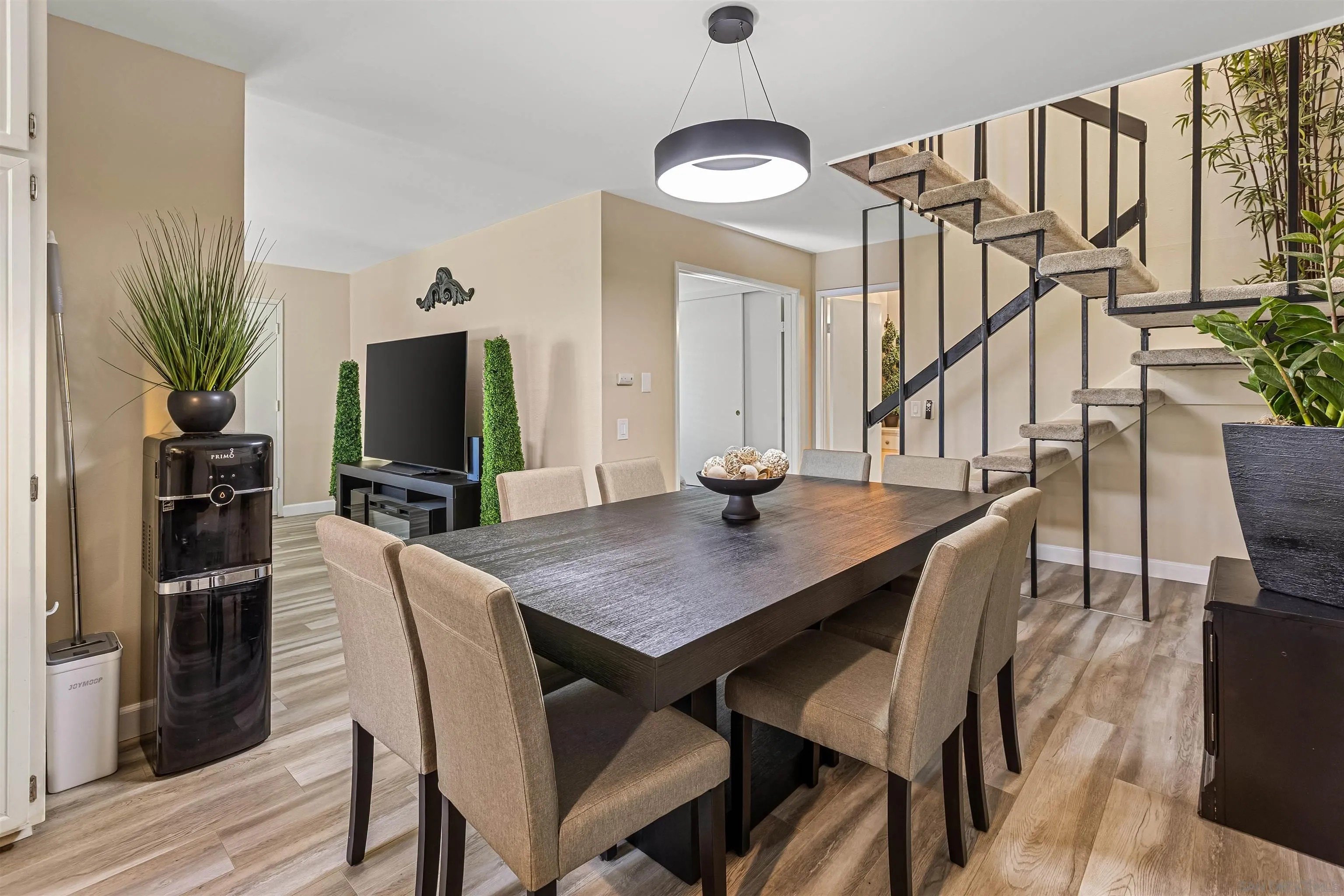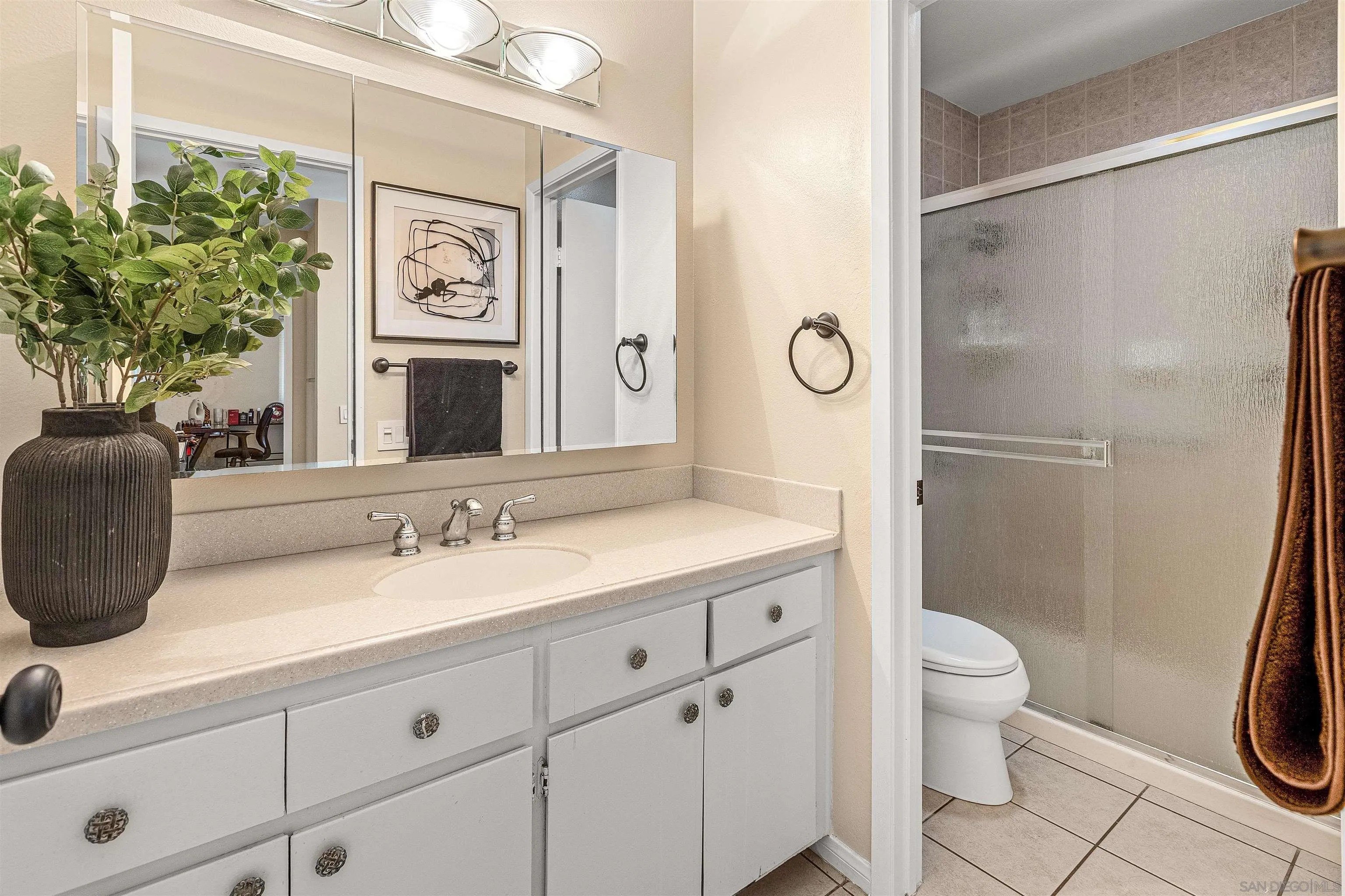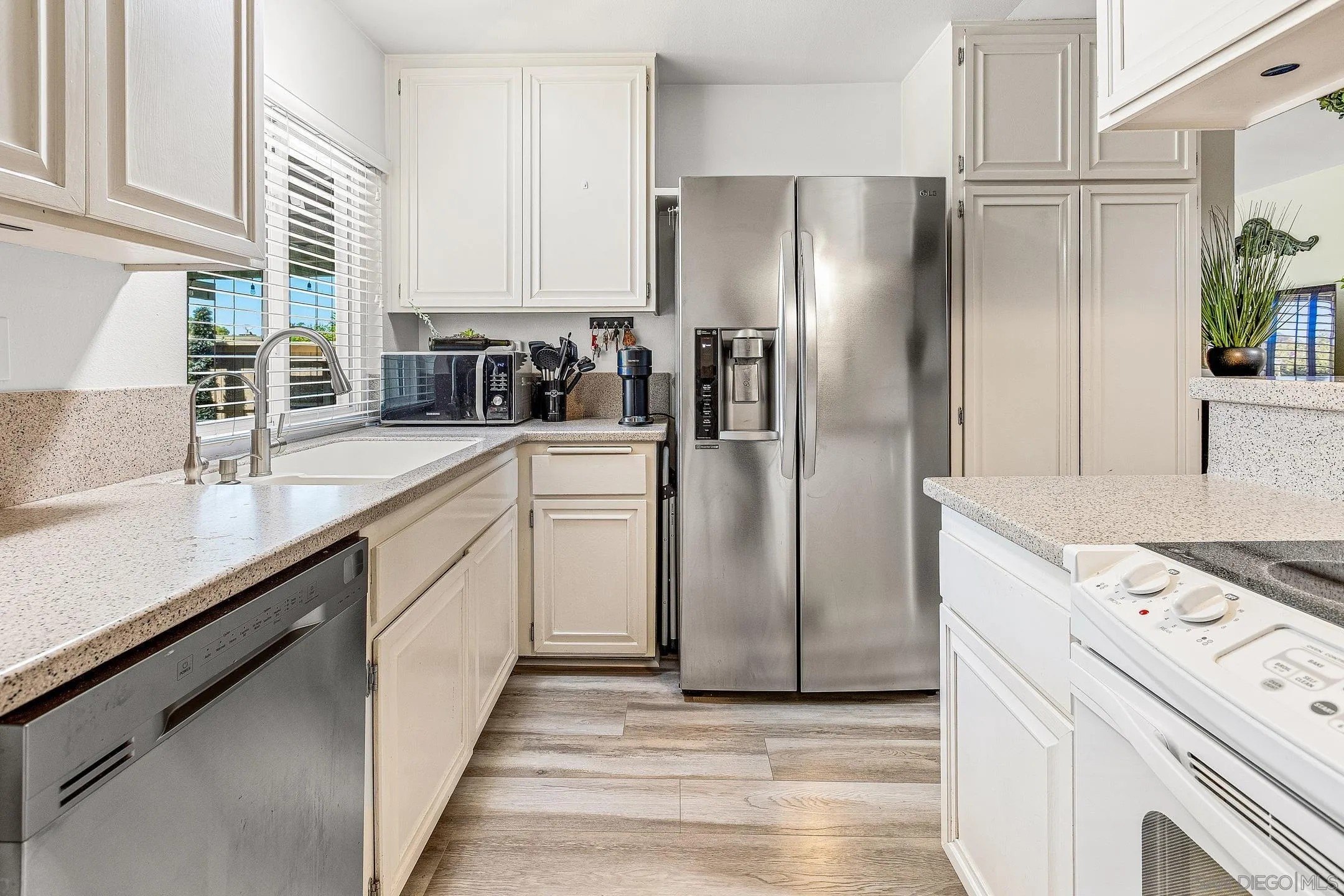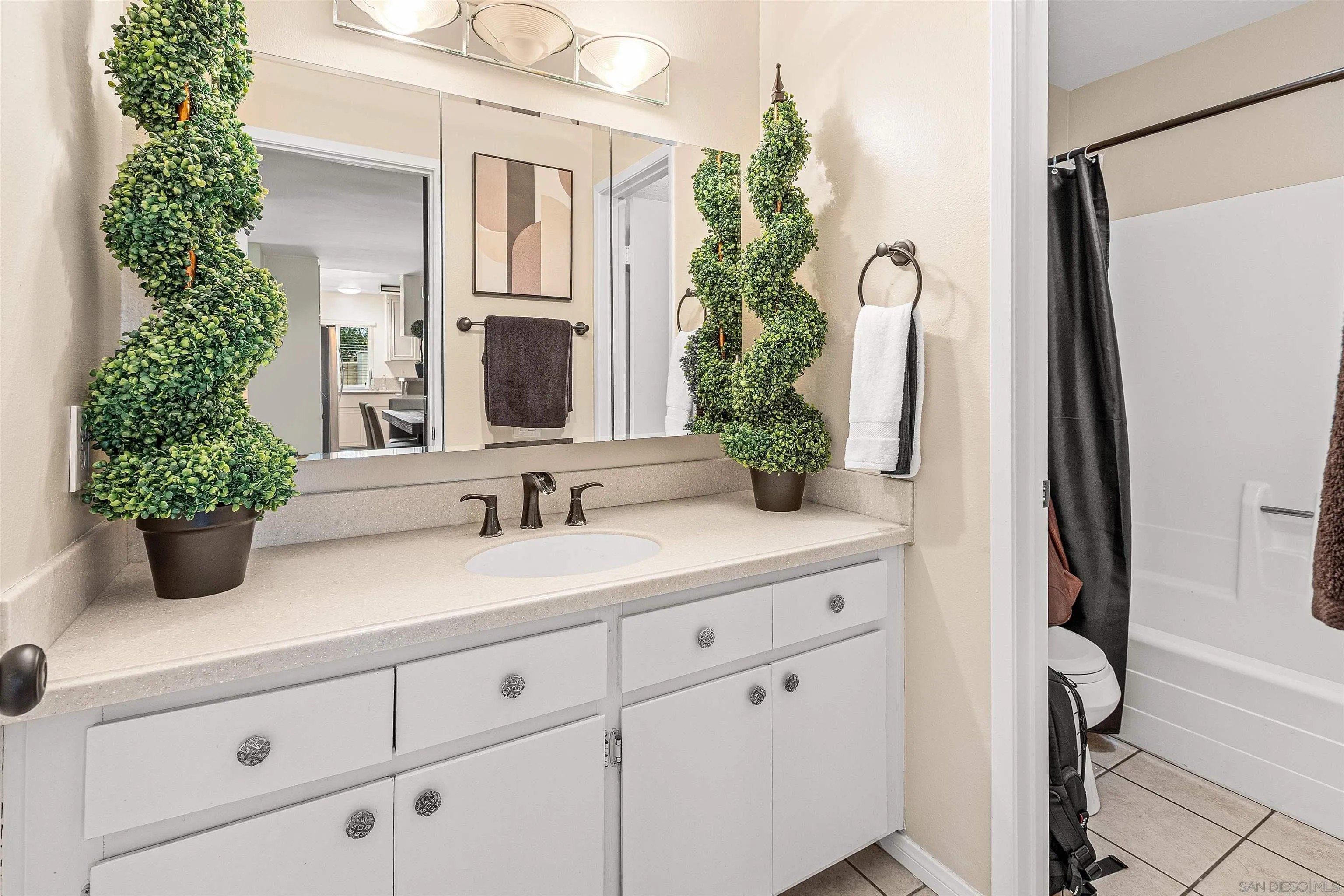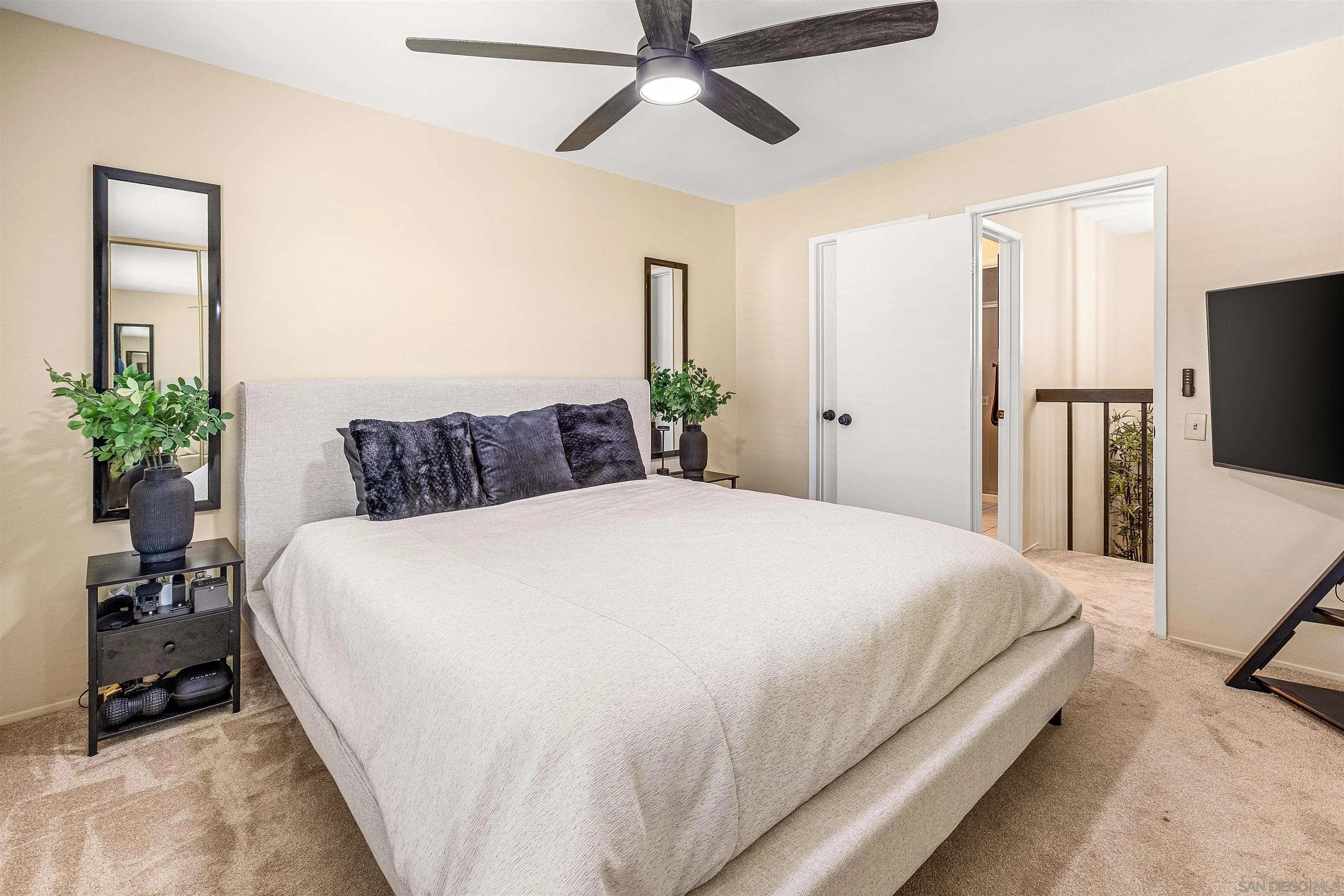 Welcome to this stunning townhome in the highly sought-after Quest Complex of Mira Mesa! Enjoy a premium, quiet location tucked away in the back corner of the community, surrounded by lush greenbelt views. Inside, the open-concept floor plan is enhanced with an A/C system, fresh interior paint, new carpeting, plantation shutters, designer lighting, and luxury vinyl plank flooring. The kitchen features crisp white cabinetry, Corian countertops, and convenient bar seating, while the spacious living room with a cozy fireplace flows seamlessly into the dining area. A downstairs bedroom and full bathroom offer added flexibility for guests or a home office. Meander outside to an expansive private patio-perfect for entertaining, relaxing, or dining al fresco-complete with a laundry closet for added convenience. Two assigned parking spots are located nearby. The community offers resort-style amenities with two swimming pools, two spas, and beautifully maintained park-like grounds. HOA dues include water, trash, and exterior landscaping. Ideally located close to freeways, Lake Miramar, schools including Miramar College, shopping, and dining-this home truly has it all!