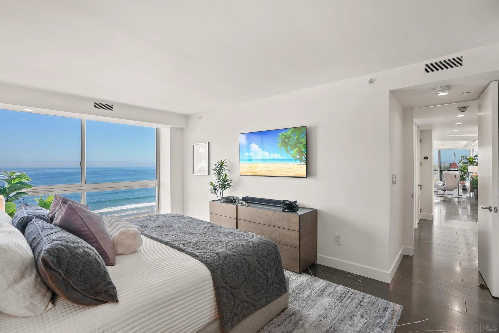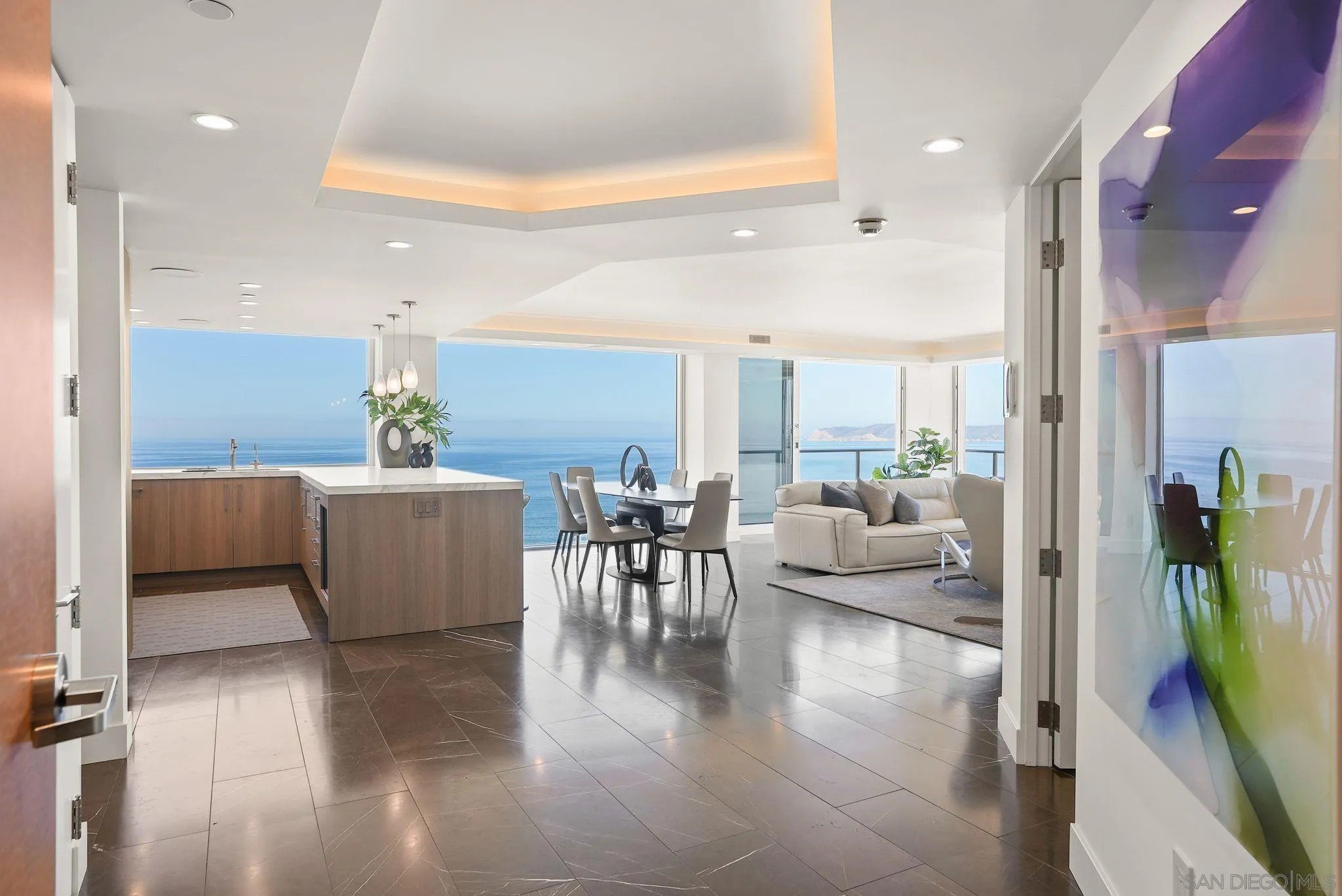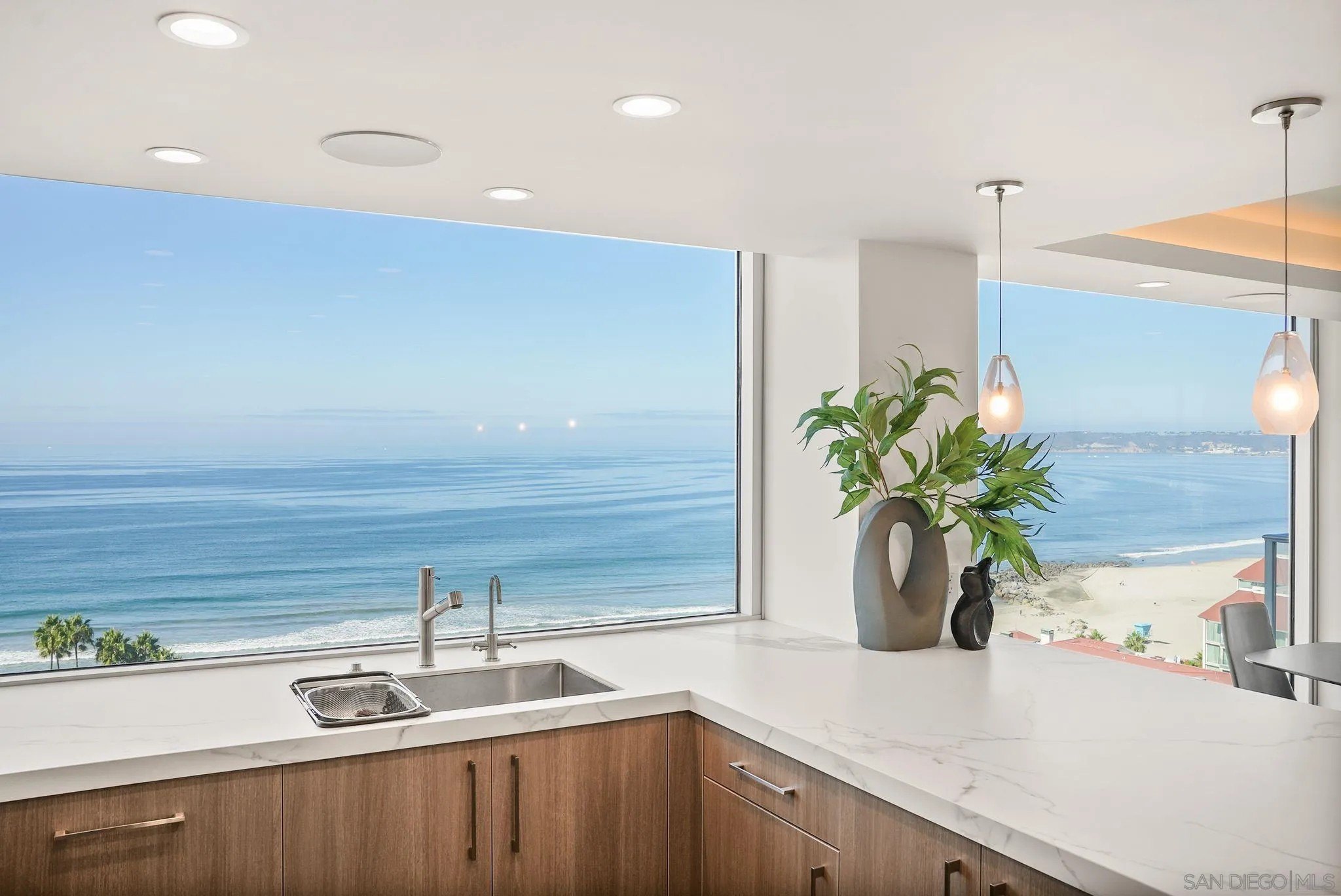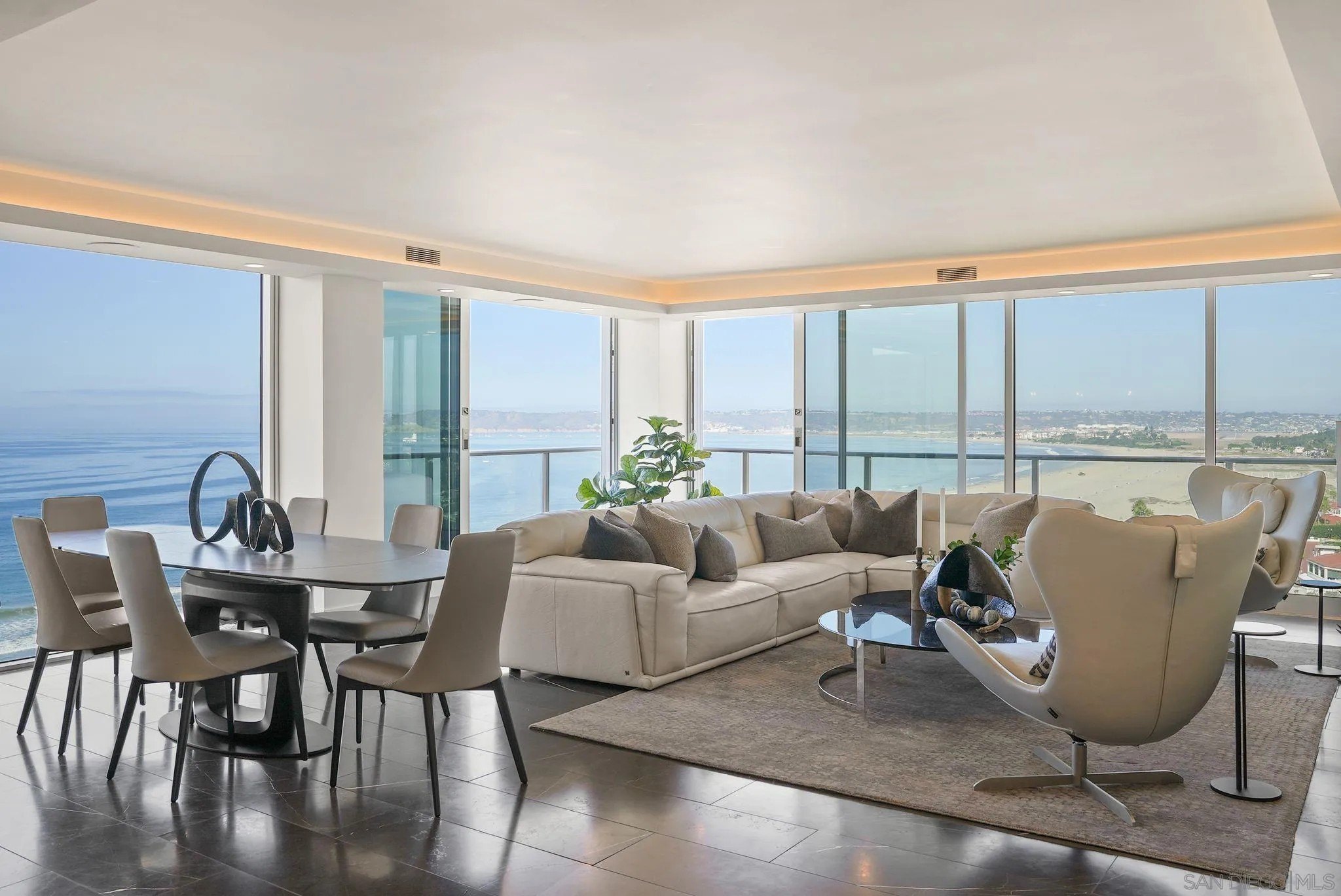 Rising high above the coastline on the 14th floor, this rare 3-bedroom, 3-bath Coronado Shores oceanfront residence embodies the pinnacle of sophisticated coastal living. A custom large-format picture window serves as the home's centerpiece, framing sweeping unobstructed views of the Pacific Ocean, Point Loma, and the iconic Hotel Del Coronado. Inside the residence is a showcase of refined design, featuring dramatic Black Marquita marble tile floors, sleek Neolith porcelain countertops, and European laminate cabinetry with precision-engineered Legrabox drawers by Blum. The chef's kitchen is equipped with premium Miele appliances, while a custom integrated sound system provides the perfect backdrop for both elegant entertaining and serene daily living. Beyond the residence, the Coronado Shores offers an exclusive lifestyle with oceanfront pools, tennis courts, pickleball courts, a private clubhouse, and 24-hour security, all just steps from Coronado's world renowned beaches, fine dining, boutique shopping, and legendary Hotel Del Coronado. Blending timeless elegance, modern luxury, and a premier oceanfront address, this extraordinary property is designed for those seeking a one-of-a-kind coastal retreat. Schedule your private viewing today and experience the height of ocean-front Coronado living.