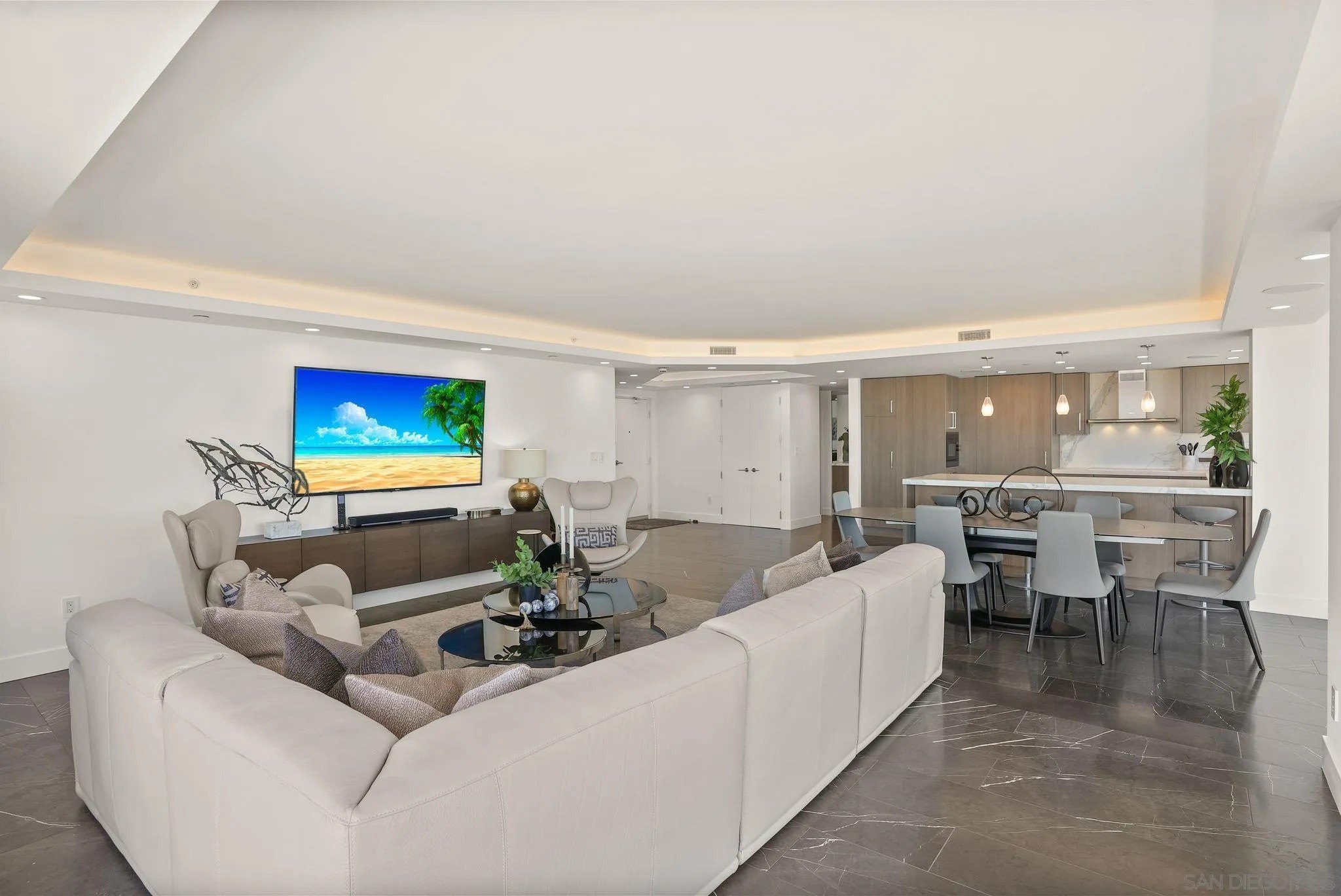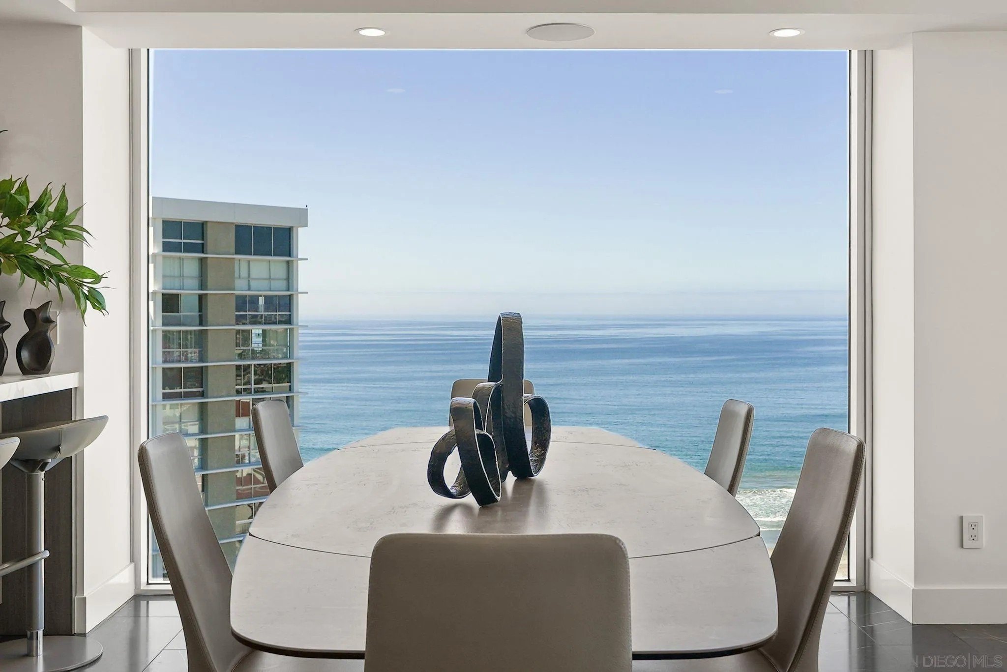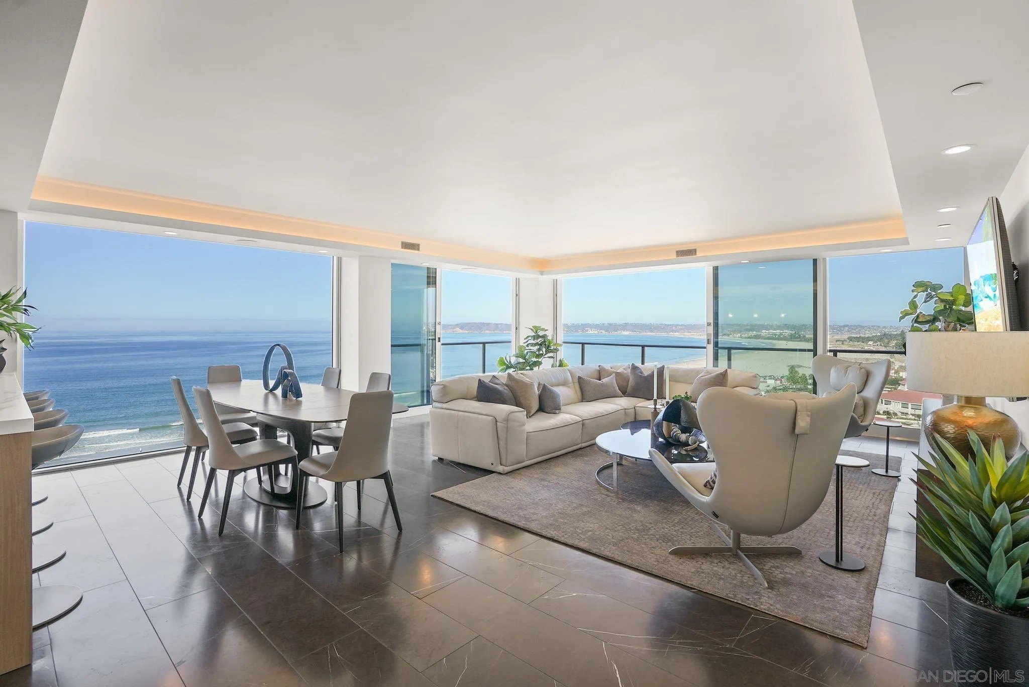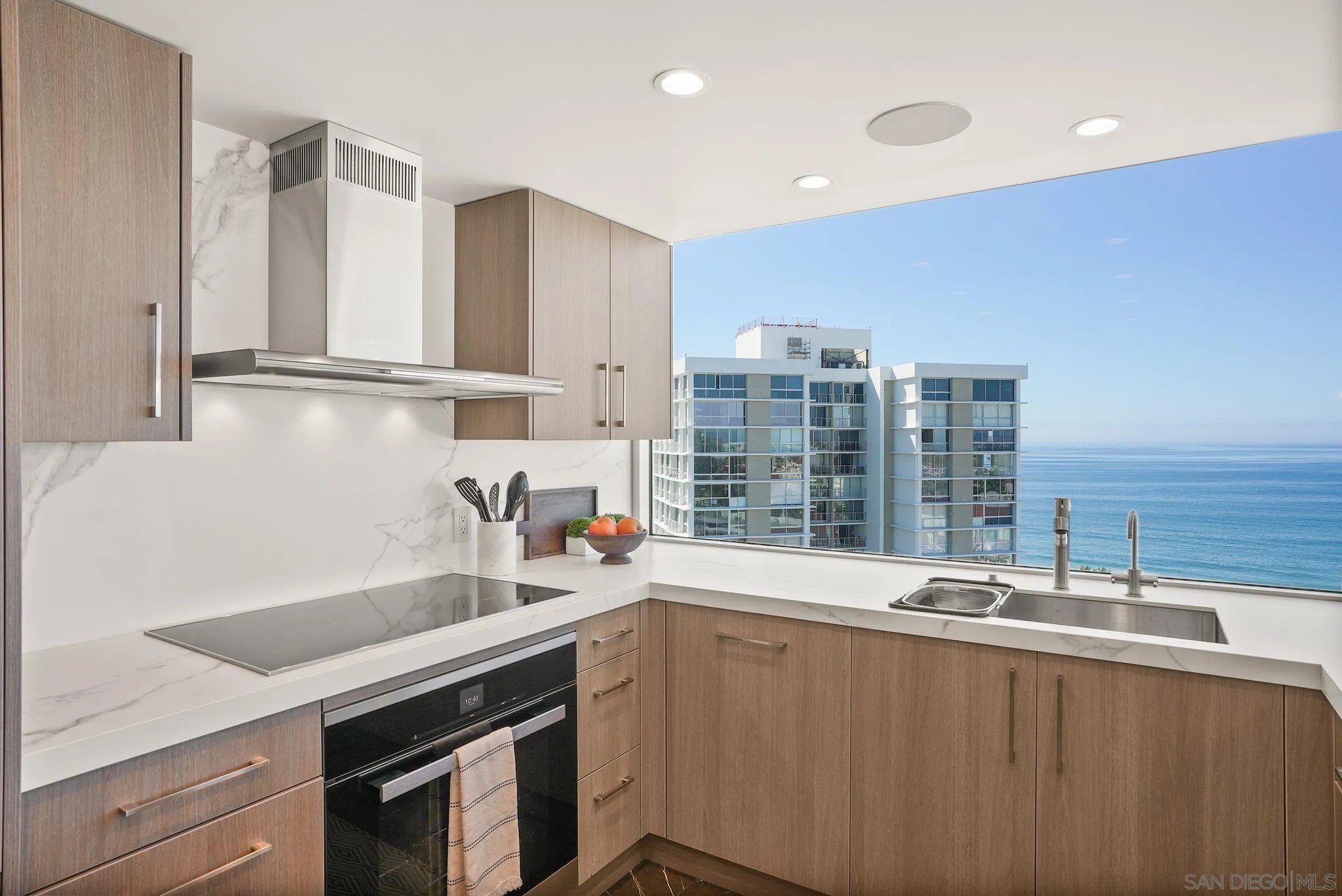 Rising high above the coastline on the 14th floor, this rare 3-bedroom, 3-bath Coronado Shores oceanfront residence embodies the pinnacle of sophisticated coastal living. A custom large-format picture window serves as the home's centerpiece, framing sweeping unobstructed views of the Pacific Ocean, Point Loma, and the iconic Hotel Del Coronado. Inside the residence is a showcase of refined design, featuring dramatic Black Marquita marble tile floors, sleek Neolith porcelain countertops, and European laminate cabinetry with precision-engineered Legrabox drawers by Blum. The chef's kitchen is equipped with premium Miele appliances, while a custom integrated sound system provides the perfect backdrop for both elegant entertaining and serene daily living. Beyond the residence, the Coronado Shores offers an exclusive lifestyle with oceanfront pools, tennis courts, pickleball courts, a private clubhouse, and 24-hour security, all just steps from Coronado's world renowned beaches, fine dining, boutique shopping, and legendary Hotel Del Coronado. Blending timeless elegance, modern luxury, and a premier oceanfront address, this extraordinary property is designed for those seeking a one-of-a-kind coastal retreat. Schedule your private viewing today and experience the height of ocean-front Coronado living.