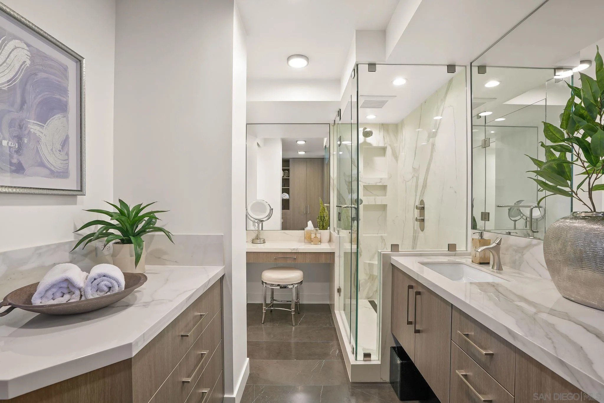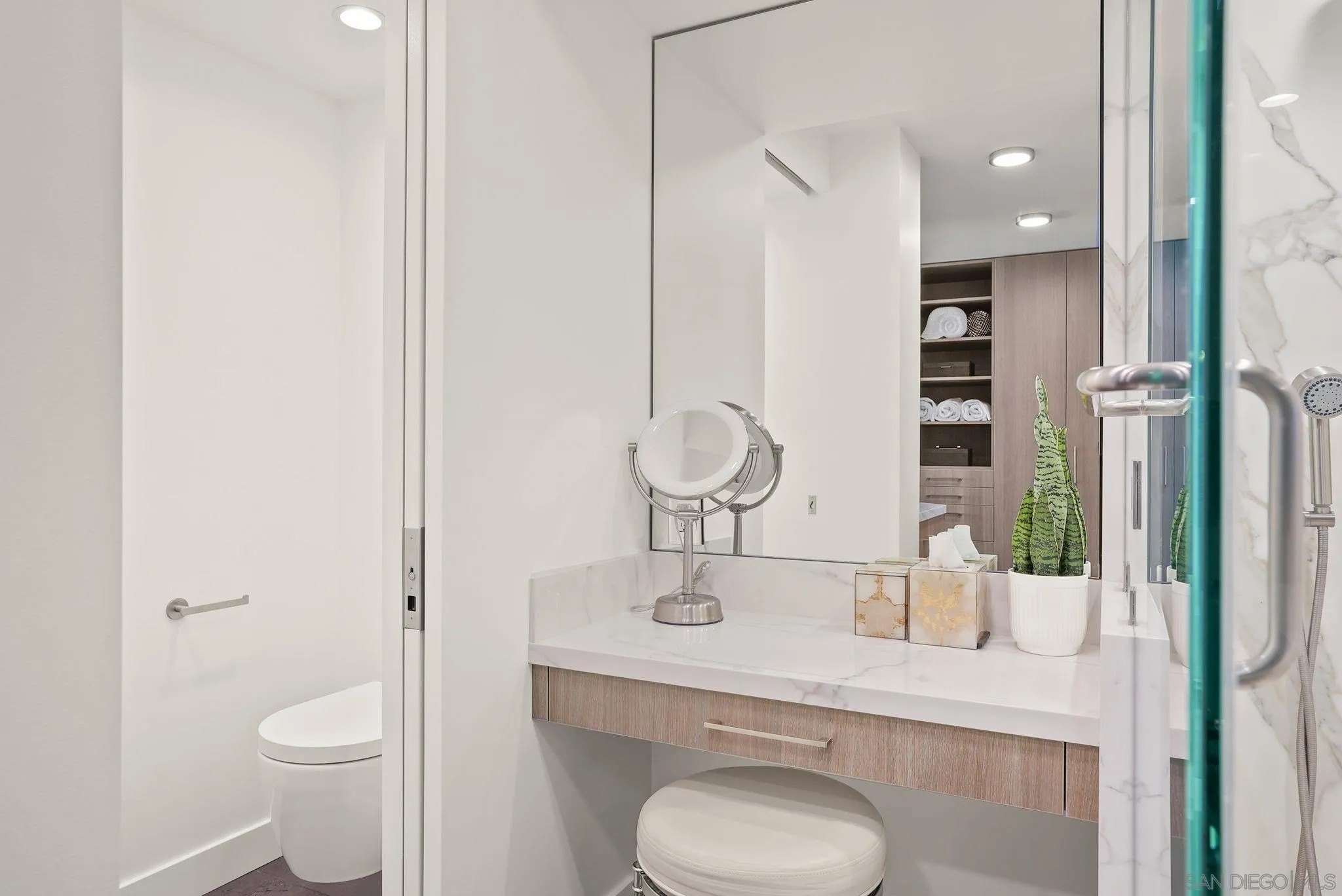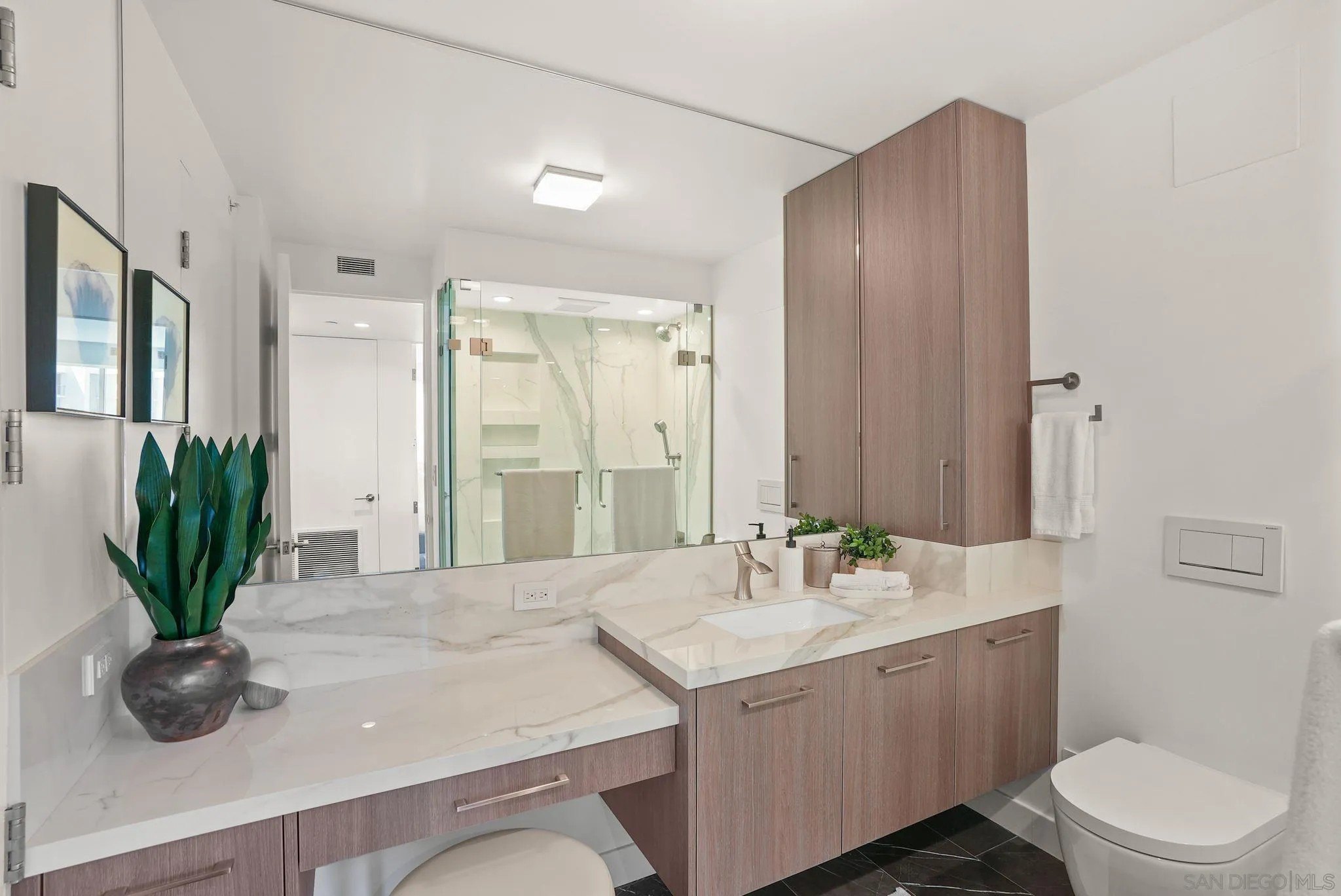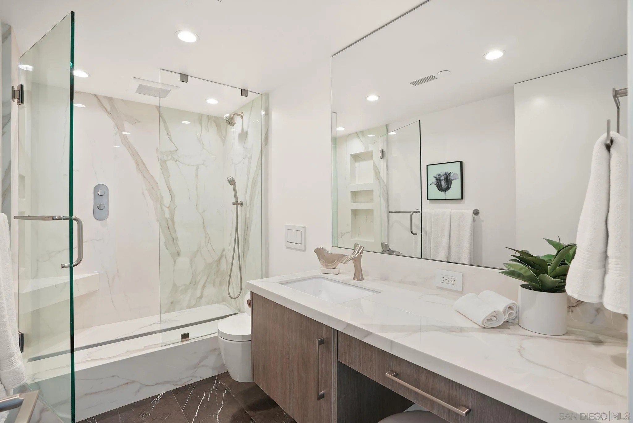 Rising high above the coastline on the 14th floor, this rare 3-bedroom, 3-bath Coronado Shores oceanfront residence embodies the pinnacle of sophisticated coastal living. A custom large-format picture window serves as the home's centerpiece, framing sweeping unobstructed views of the Pacific Ocean, Point Loma, and the iconic Hotel Del Coronado. Inside the residence is a showcase of refined design, featuring dramatic Black Marquita marble tile floors, sleek Neolith porcelain countertops, and European laminate cabinetry with precision-engineered Legrabox drawers by Blum. The chef's kitchen is equipped with premium Miele appliances, while a custom integrated sound system provides the perfect backdrop for both elegant entertaining and serene daily living. Beyond the residence, the Coronado Shores offers an exclusive lifestyle with oceanfront pools, tennis courts, pickleball courts, a private clubhouse, and 24-hour security, all just steps from Coronado's world renowned beaches, fine dining, boutique shopping, and legendary Hotel Del Coronado. Blending timeless elegance, modern luxury, and a premier oceanfront address, this extraordinary property is designed for those seeking a one-of-a-kind coastal retreat. Schedule your private viewing today and experience the height of ocean-front Coronado living.