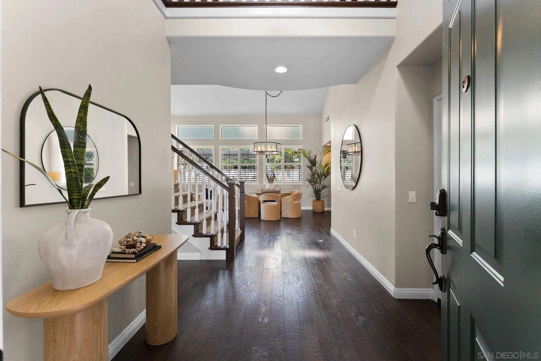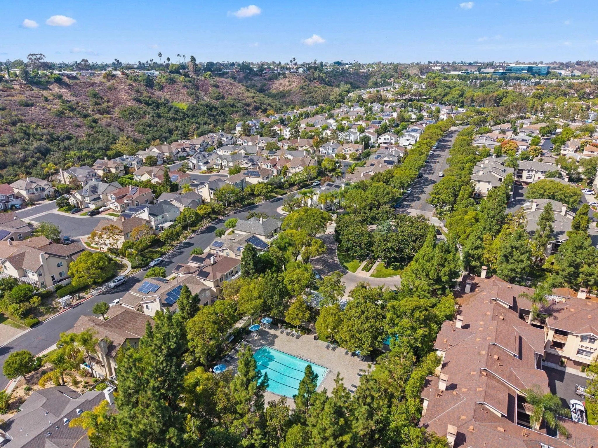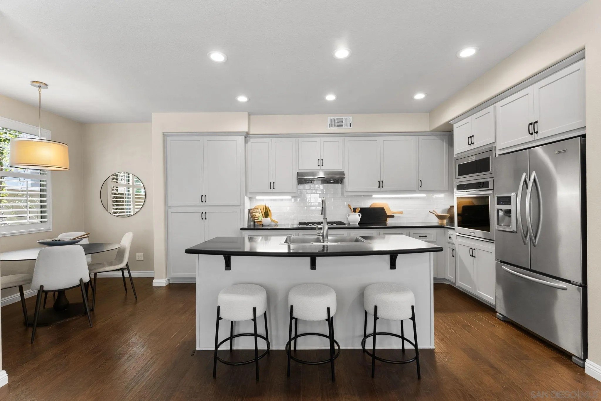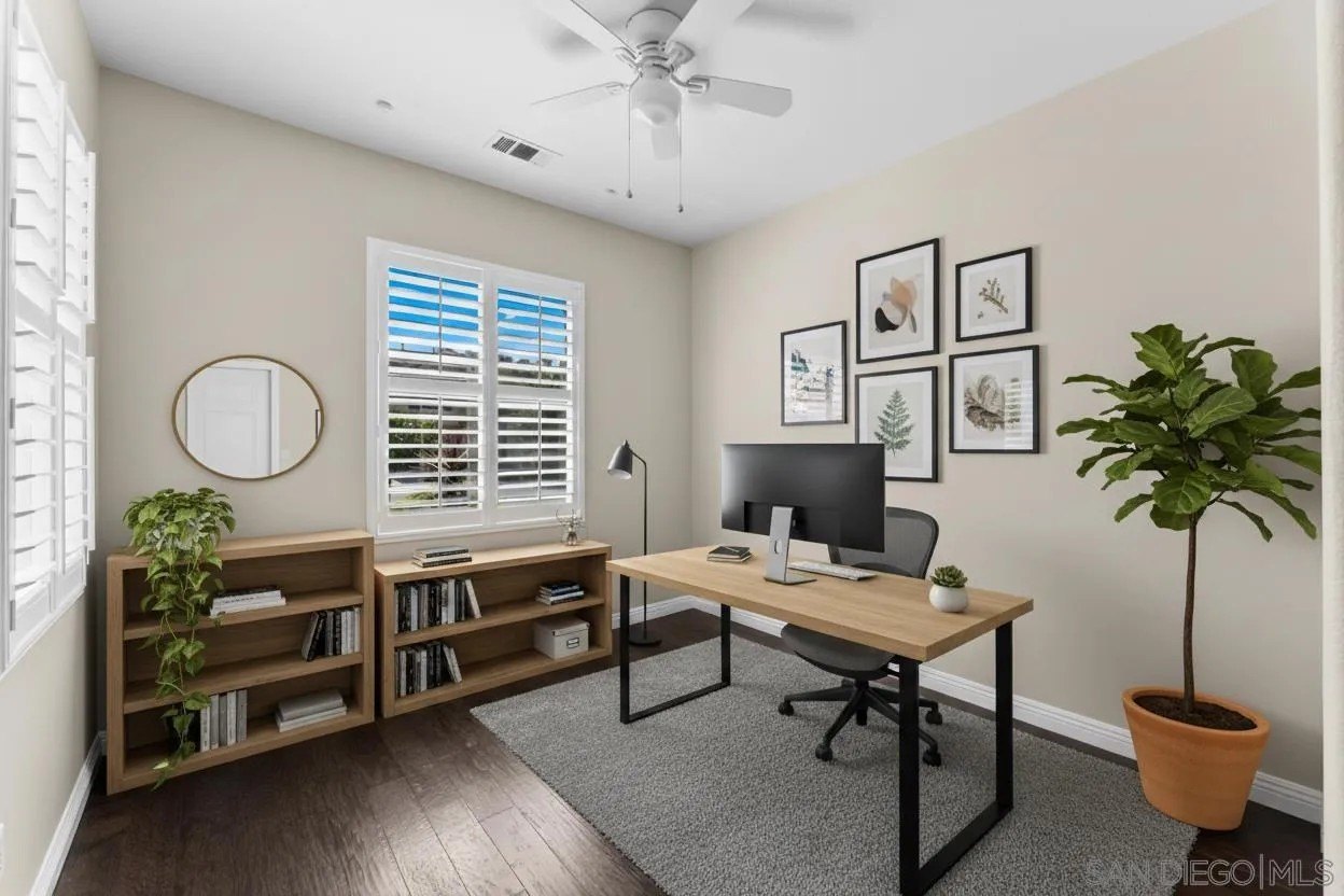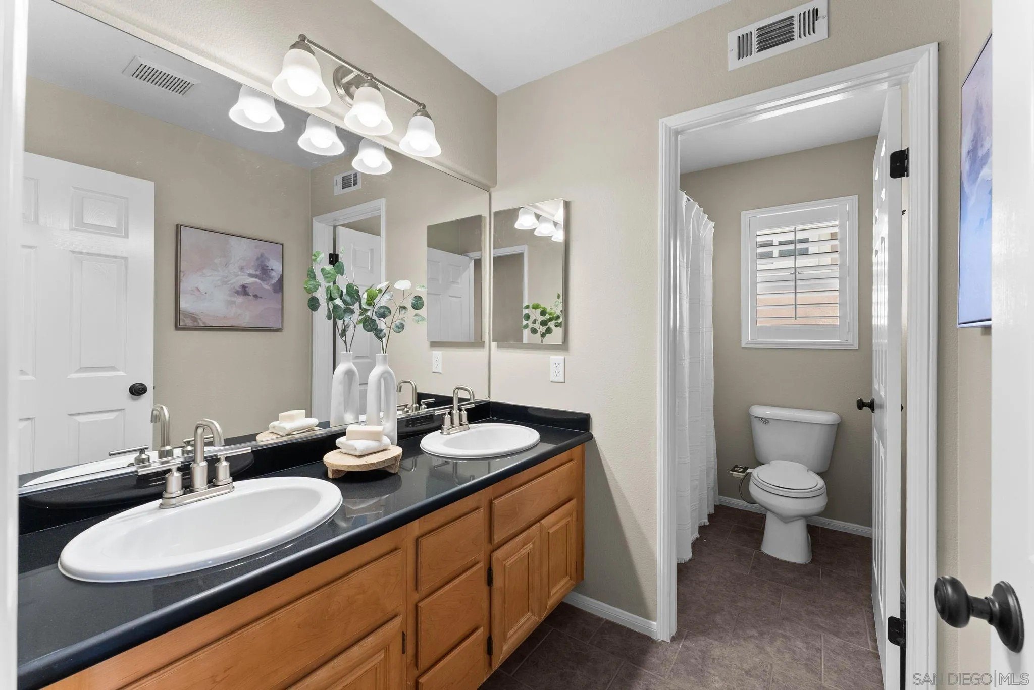 Welcome to 2756 W Canyon Avenue, a freshly painted and beautifully updated 4-bedroom plus loft (optional 5th bedroom), 3-bath home tucked within the sought-after Westport enclave of Stonecrest Village in Serra Mesa. Built in 2000 and set on a quiet cul-de-sac, this 2,418 sq ft residence blends modern upgrades with thoughtful design and a hidden surprise you'll love discovering. The light-filled main level features a contemporary kitchen with newer stainless steel appliances that flows effortlessly into the dining and living areas, complemented by hardwood flooring, plantation shutters, LED lighting, and a whole-house fan. A desirable downstairs bedroom and full bath provide flexibility for guests or multigenerational living. Upstairs offers an expansive primary suite, two additional bedrooms, a spacious loft or optional 5th bedroom, and a convenient laundry room. Every closet, including the primary walk-in, has been customized with premium Container Store Elfa Systems for smart organization. Outside, enjoy a water-efficient backyard with drip irrigation, ambient lighting, a stylish Toja Grid pergola, mounted outdoor TV, and generous patio for entertaining. Residents of Stonecrest Village enjoy resort-style amenities-clubhouse, pools, tennis courts, fitness center, and scenic trails-just minutes from Mission Valley, downtown San Diego, and major freeways.