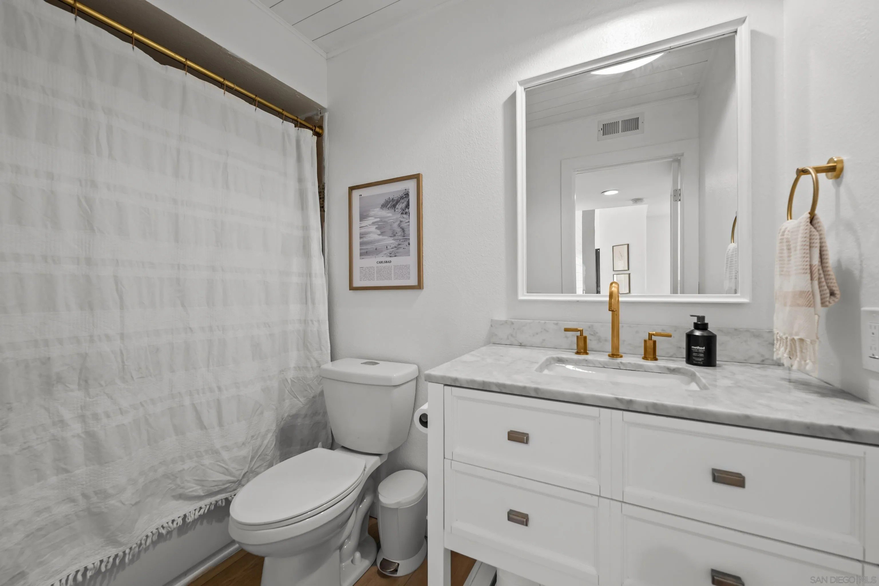 Beautifully updated 4 bedroom home under 2 miles from the beach and Carlsbad Village! This move-in ready property features a large open floor plan and has been thoughtfully upgraded throughout featuring all new luxury plank flooring, fresh interior paint, new baseboards, modern light fixtures, and gorgeous landscaping with turf for easy maintenance. The fully remodeled kitchen is a standout, equipped with stylish finishes and high-end Cafe appliances perfect for cooking and entertaining. The layout includes a downstairs bedroom with its own separate entrance, full bath, and kitchenette, offering excellent potential for an ADU setup, guest space, or rental opportunity. Located less than 5 minutes to I-5 and just under 2 miles to the sand, surf, and all the restaurants and shops of Carlsbad Village, this location is unmatched! The community offers fantastic amenities including a pool, spa, and tennis courts, making this the perfect place to enjoy the Southern California lifestyle.