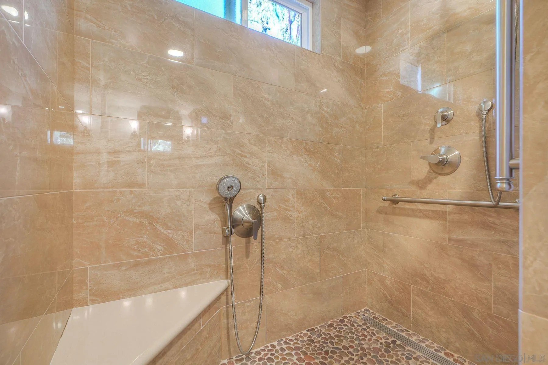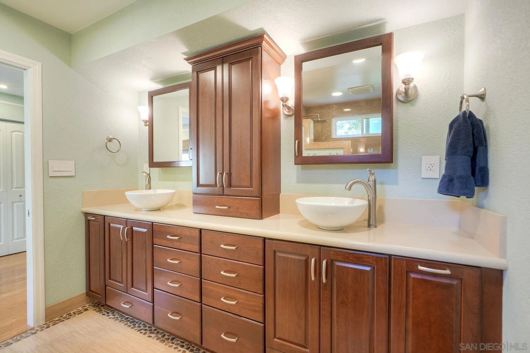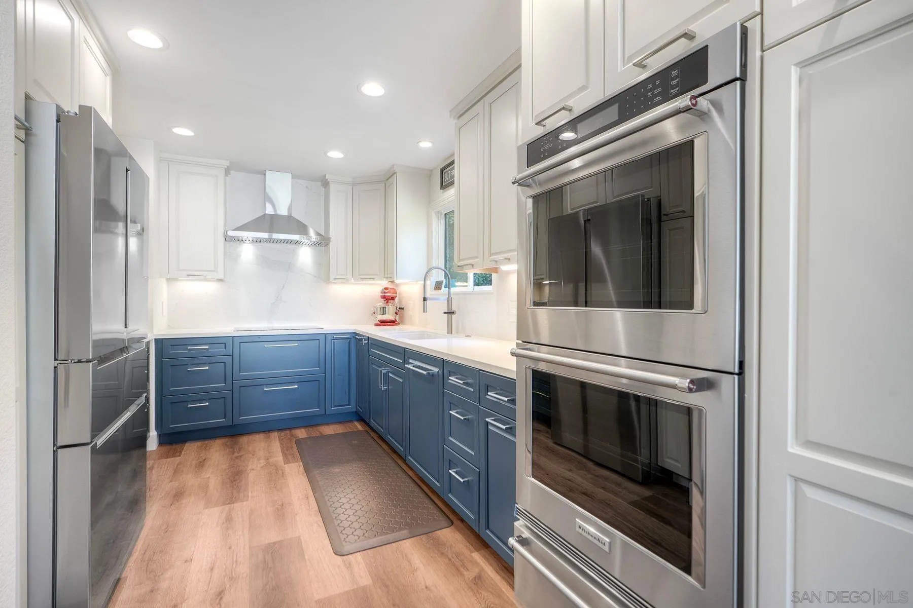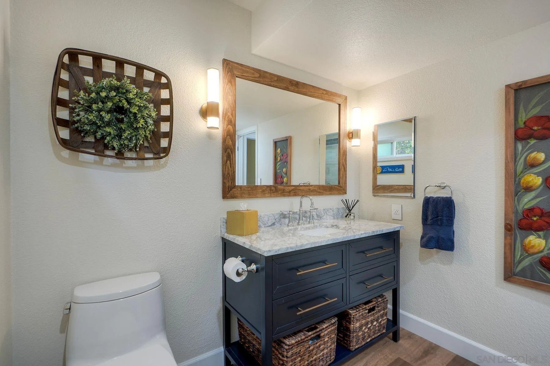 Fully Renovated Townhome in the Highly Desirable Kensington Park Villas Welcome to Kensington Park Villas, a serene, resort-style community tucked away in the heart of San Diego. This beautifully renovated 3-bedroom, 3-bathroom home spans approximately 1,875 sq. ft. and is one of the largest floor plans in the community. Thoughtfully upgraded from top to bottom, the home features a brand-new A/C system (installed in 2023), updated electrical throughout, a new water heater (2024), modernized bathrooms, and custom Elfa-built closets with interchangeable organizers. Perfectly positioned with no neighbors directly behind and scenic views of lush trees and a tranquil pond, this home combines privacy, style, and comfort in one stunning package. Step inside to a bright, open living space featuring tall, vaulted ceilings, modern finishes, and a newer fireplace that creates an inviting atmosphere. The gourmet kitchen is designed for both everyday living and entertaining, showcasing white and navy cabinetry, quartz countertops, sleek stainless-steel appliances, an induction cooktop, dual ovens, a warming drawer, and ample cabinet space with soft-closing features-including storage under the island. This home offers dual primary suites, one conveniently located on the lower level and one on the upper level. The downstairs primary suite features real bamboo wood floors, direct access to the private patio, and a luxurious ensuite bathroom with dual vanity sinks and a large walk-in shower. See Supplement =>