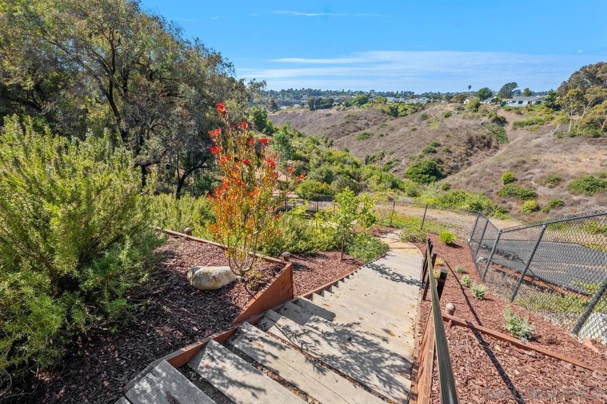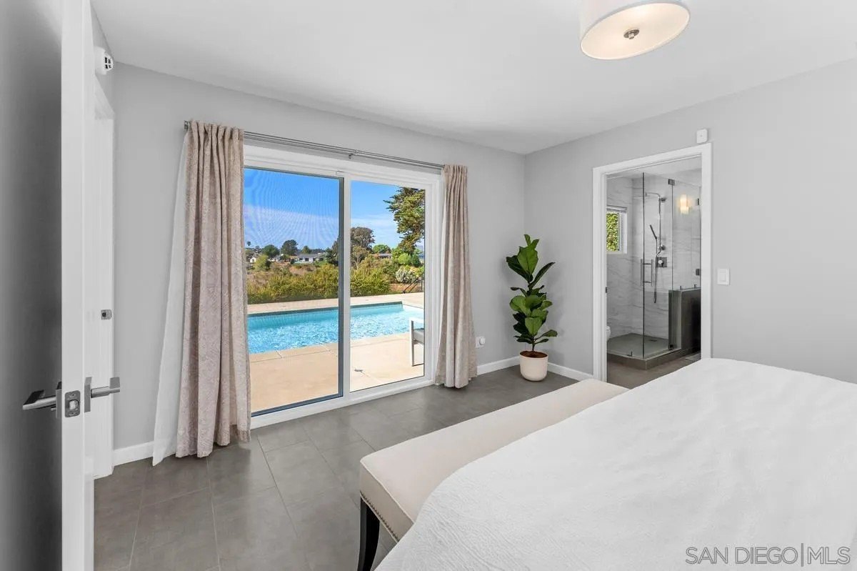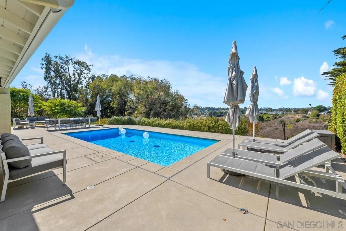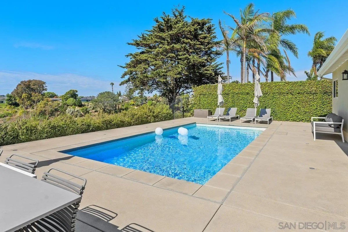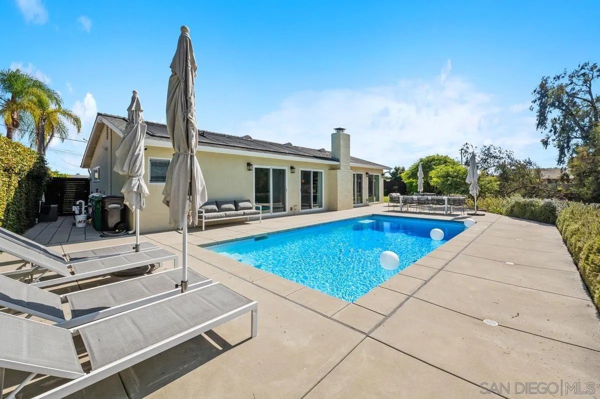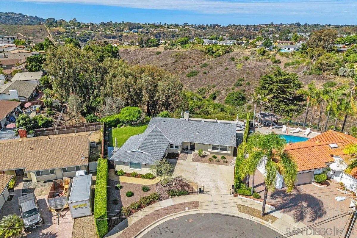 Rare find! 11,100 sqft canyon view lot sited in a cul-de-sac on the west end of University City. Ample outdoor space with a yard, solar heated pool and garden. Beautifully updated open concept filled with natural light. Chef's kitchen features wood cabinetry, quartz counters, induction cooktop, stainless steel appliances, and a 9' island. The living space includes integrated 5pt surround sound, projector, screen, and bluetooth equipped sound system. Offering two thoughtfully designed primary suites and a flexible 3rd bedroom. Fully fenced with an automatic driveway gate for added privacy and security. Centrally located, close to beaches, shopping and restaurants.
