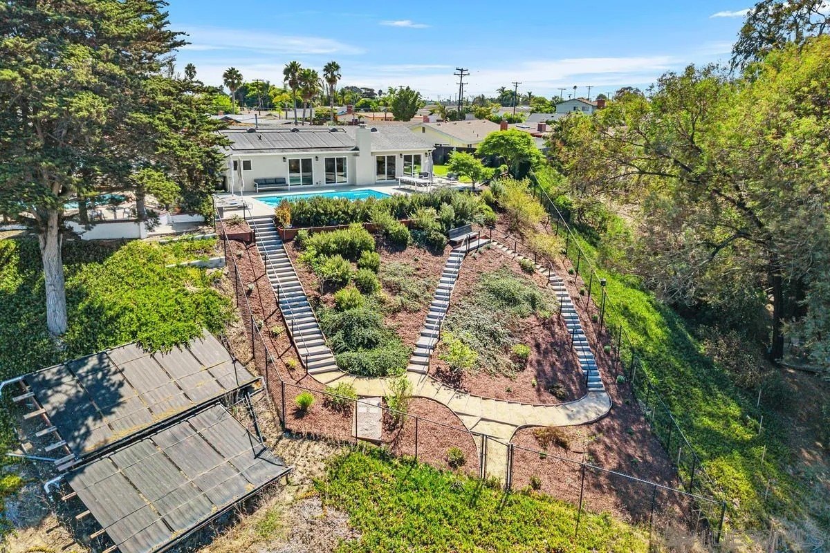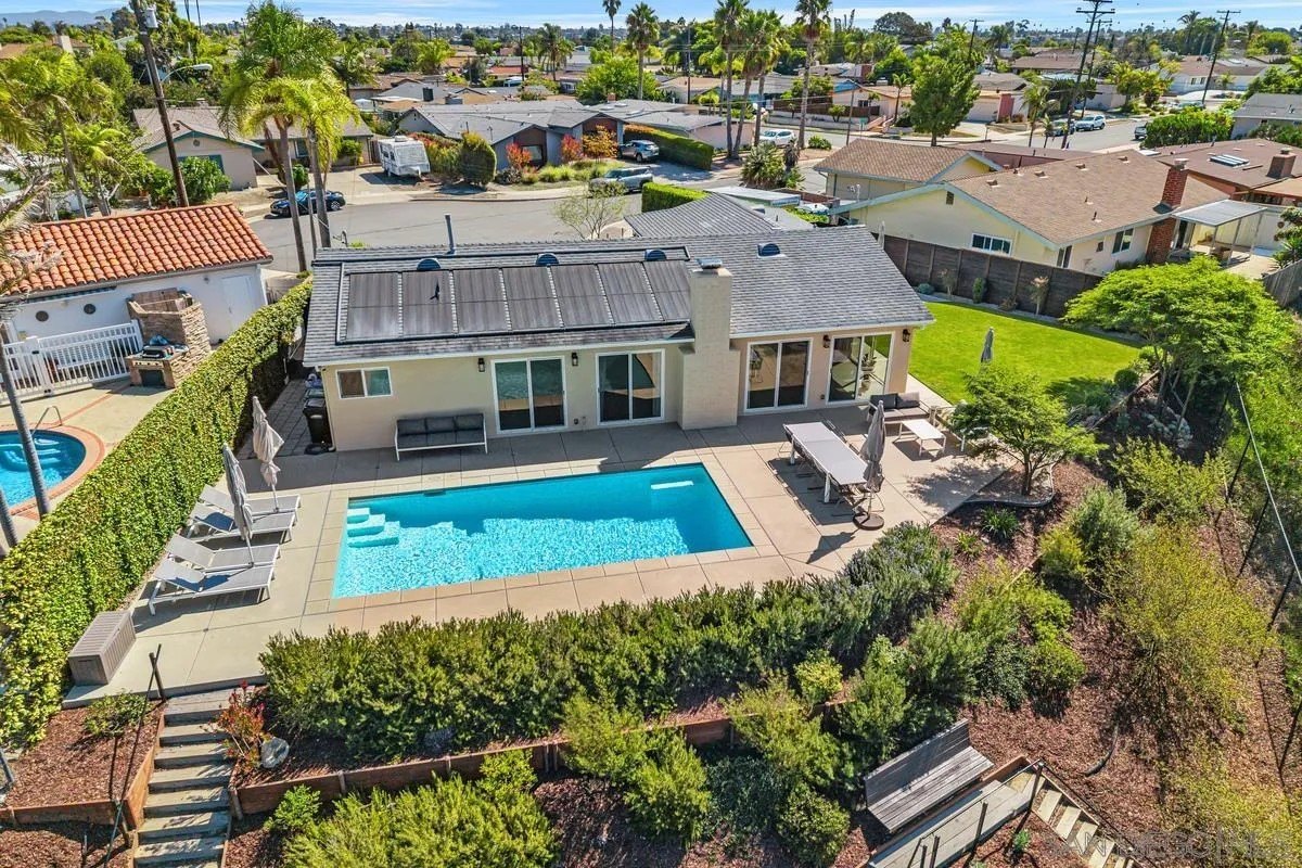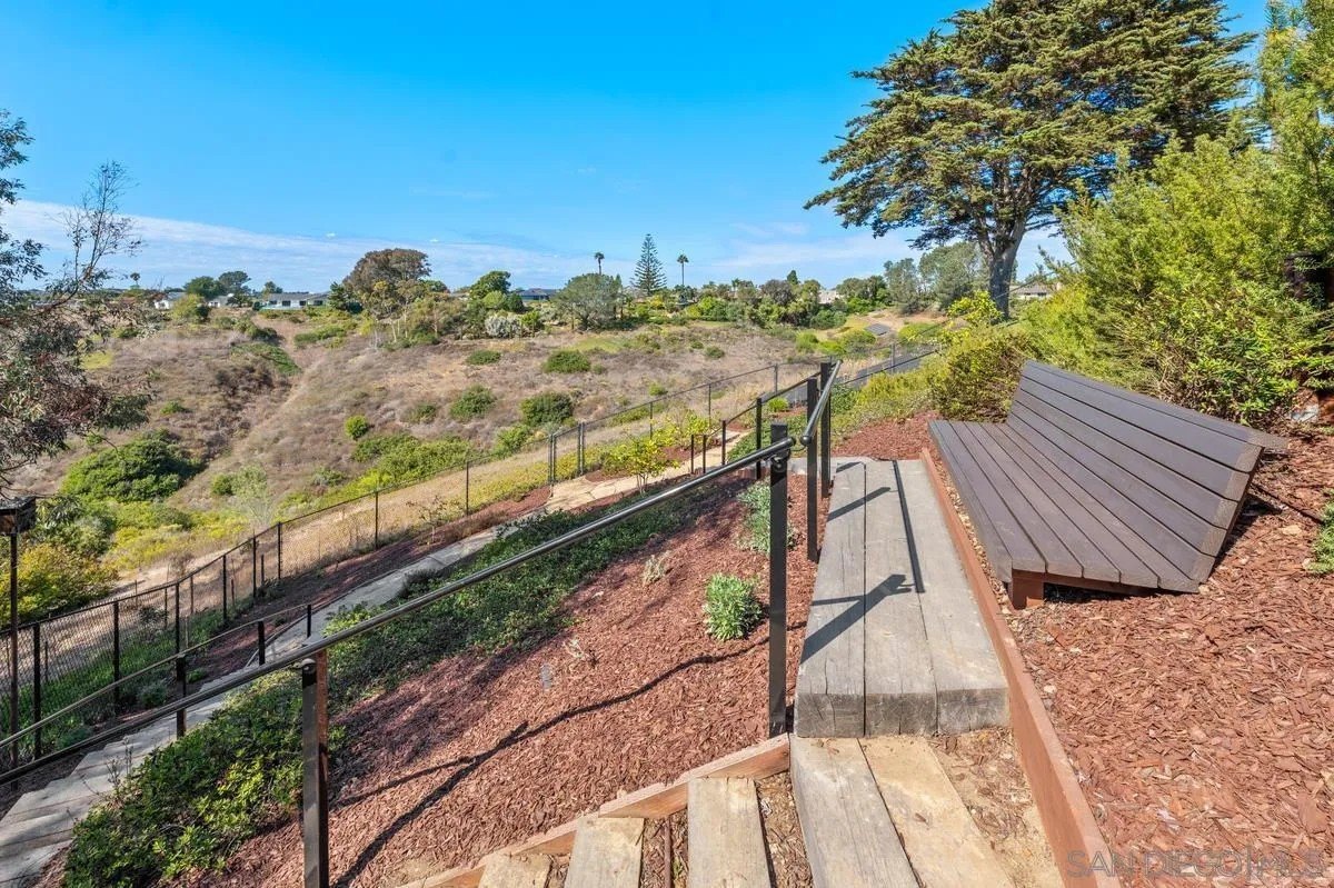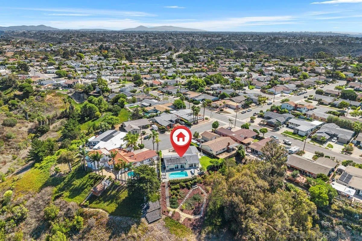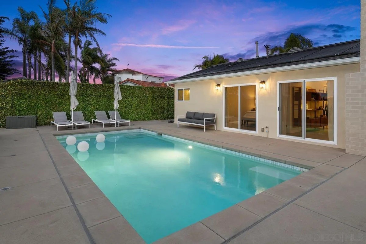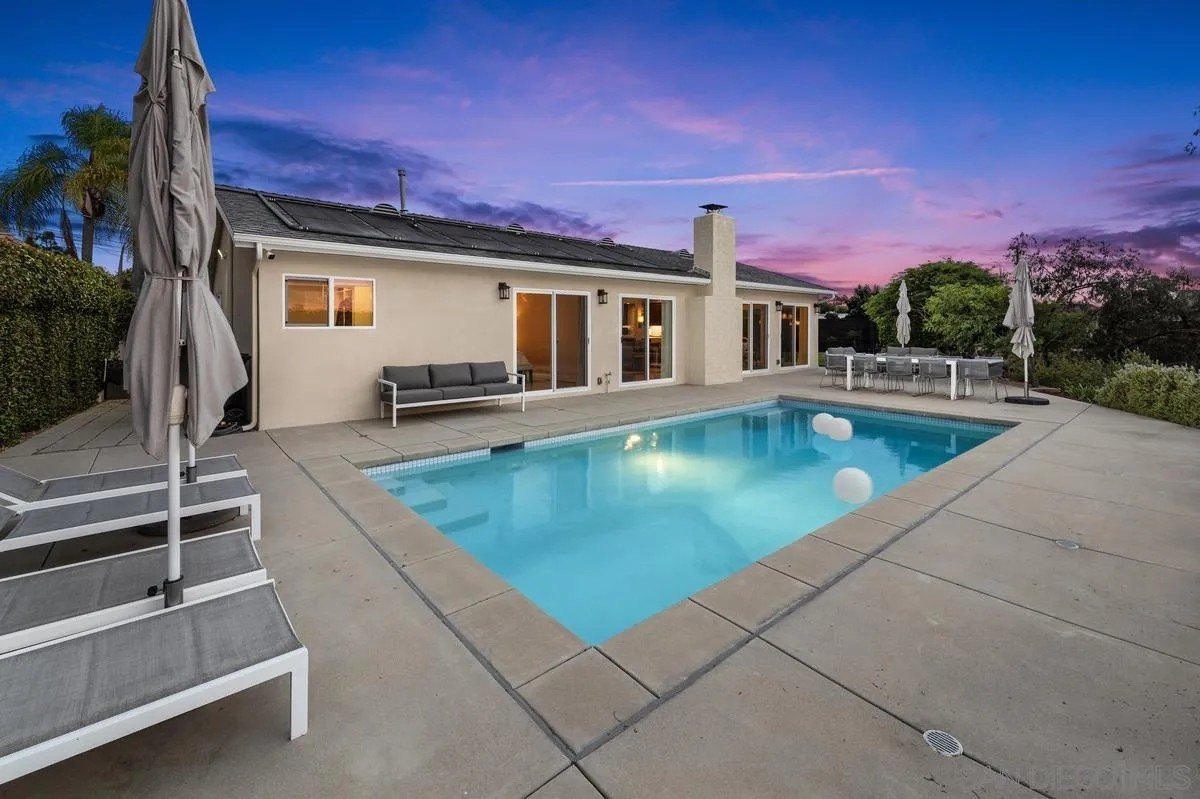 Rare find! 11,100 sqft canyon view lot sited in a cul-de-sac on the west end of University City. Ample outdoor space with a yard, solar heated pool and garden. Beautifully updated open concept filled with natural light. Chef's kitchen features wood cabinetry, quartz counters, induction cooktop, stainless steel appliances, and a 9' island. The living space includes integrated 5pt surround sound, projector, screen, and bluetooth equipped sound system. Offering two thoughtfully designed primary suites and a flexible 3rd bedroom. Fully fenced with an automatic driveway gate for added privacy and security. Centrally located, close to beaches, shopping and restaurants.