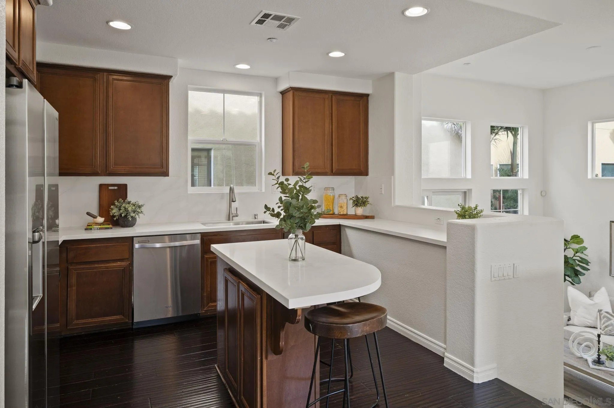 Situated in the gated Escala community, this Italian-inspired detached Villas home offers style, comfort, and modern efficiency. The interior features new quartz kitchen counters, new carpet, and wood floors in the main living areas, all complemented by large windows that fill the home with natural light. Recent upgrades include solar (leased) and a newer HVAC system, ensuring year-round comfort and energy savings. A private yard area provides the ideal outdoor retreat. Enjoy resort-style amenities including a pool, spa, fitness center, playground, and tennis courts, all in a centrally located in Mission Valley close to shopping, dining, beaches and major freeways.