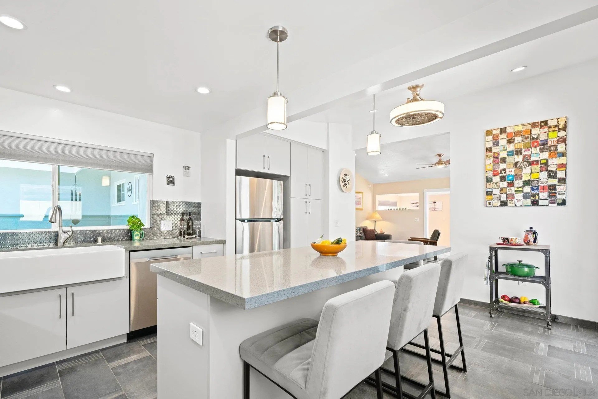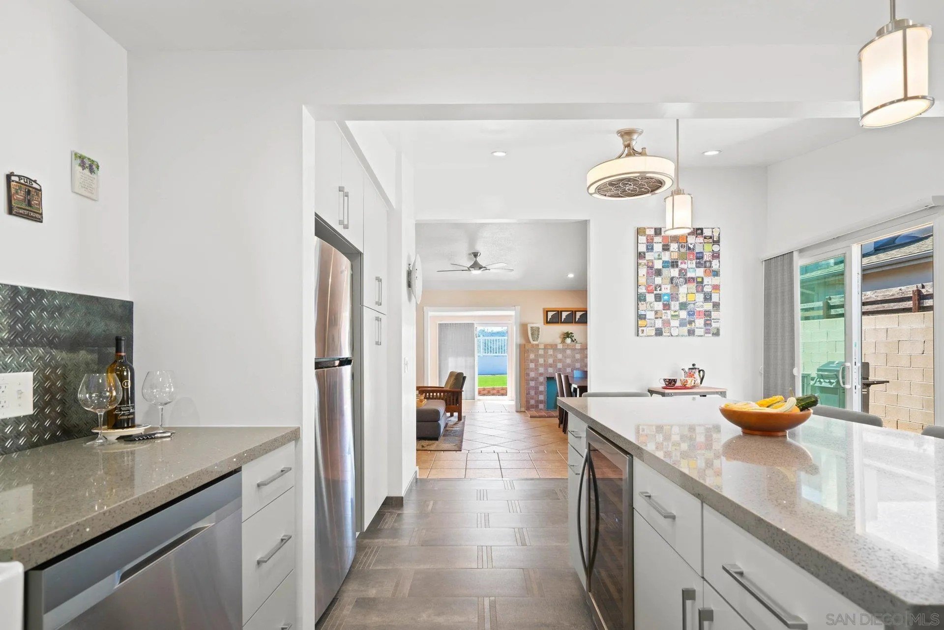 Beautifully updated traditional gem with west-facing canyon views and superb access to beaches, shopping, and dining. This 3 bed, 2 bath home features new paint throughout and a roof overlay with solar panels installed in 2023. Inside, recent upgrades include new electrical panels, modern ceiling fans with light kits, and a full HVAC overhaul with efficient mini-split units in the living room and 2 of 3 bedrooms. The heart of the home is the expanded kitchen remodel with new cabinetry, plumbing, lighting, flooring, fresh paint, and a wine fridge and new range make it a chef's delight. Additionally, both the hall and primary bathrooms have been tastefully remodeled. Step outside to the very low maintenance, oversized yard where unobstructed west views of the San Clemente canyon unfold before you. And the garage is finished with epoxy floors and drywall. Don't miss this rare opportunity to own a fully modernized classic home in a wonderful Bay Ho neighborhood!