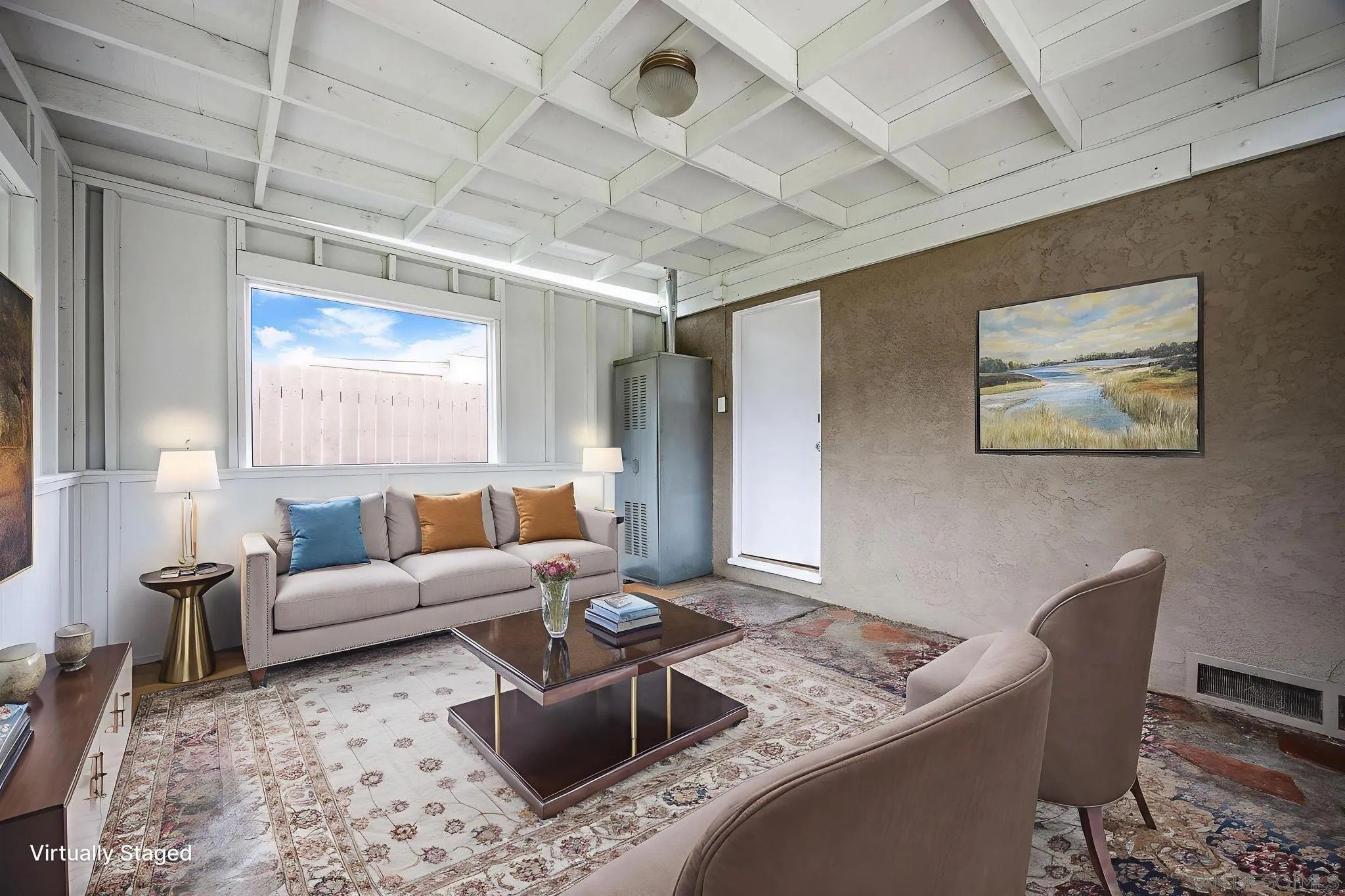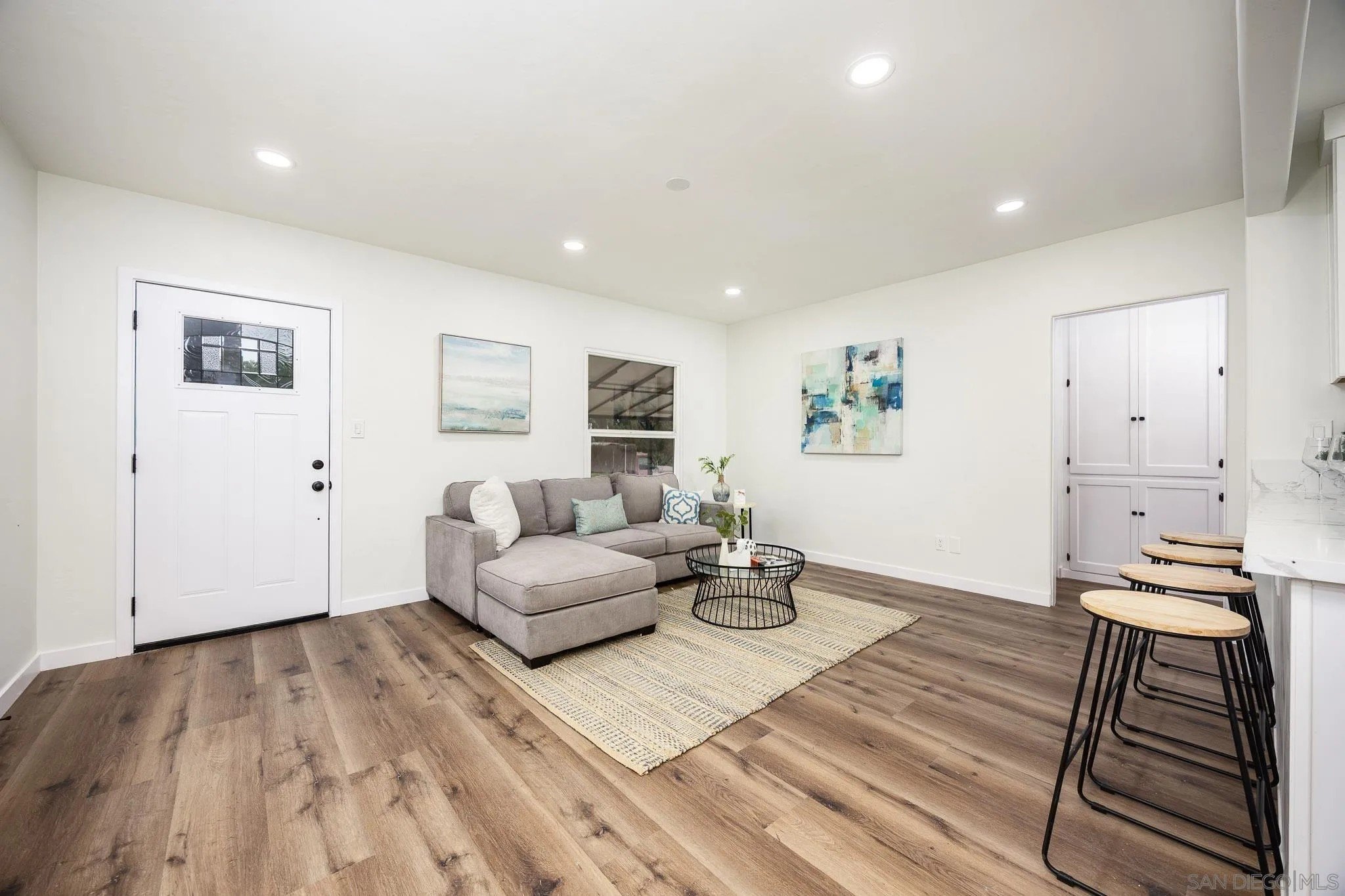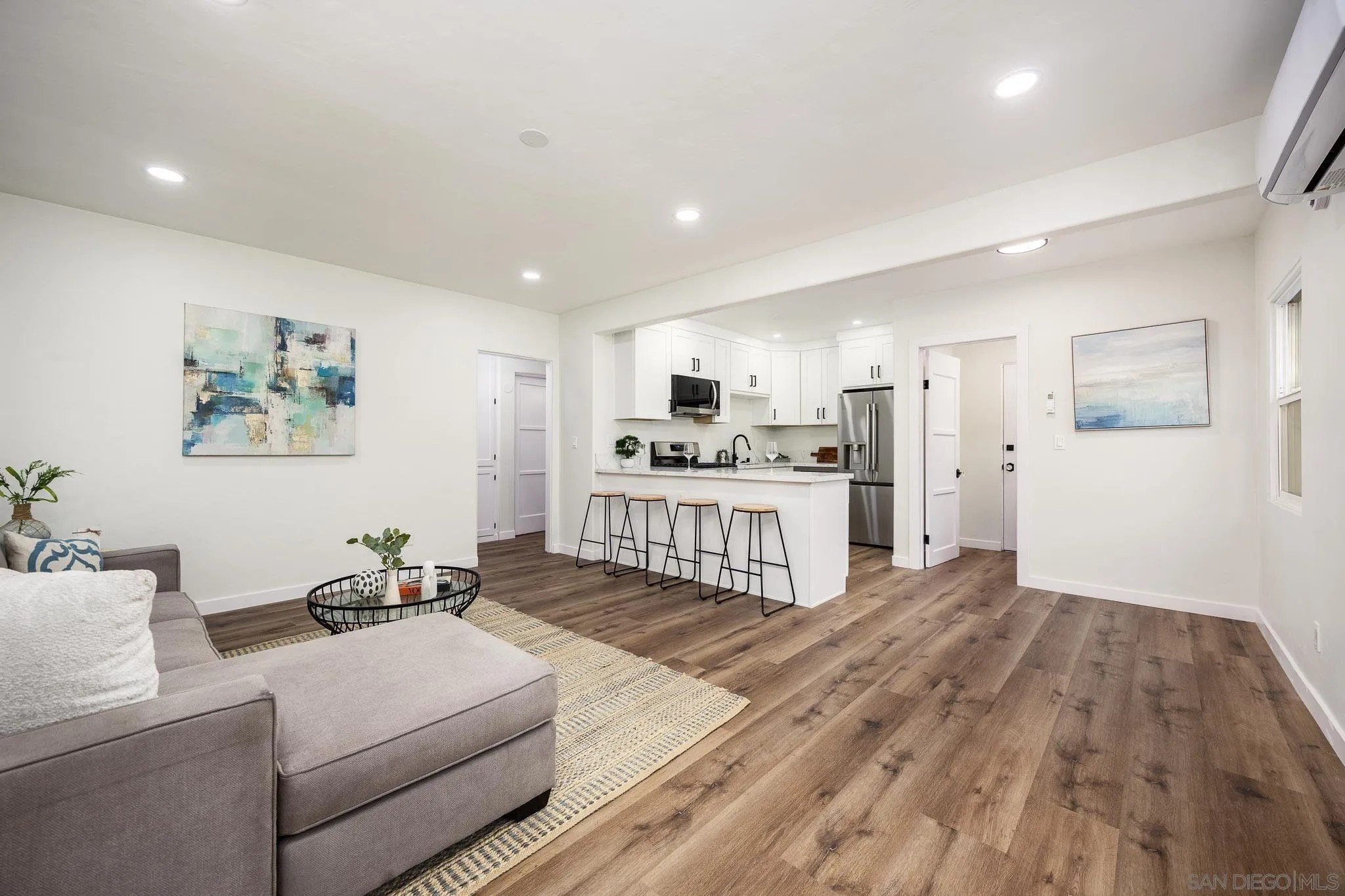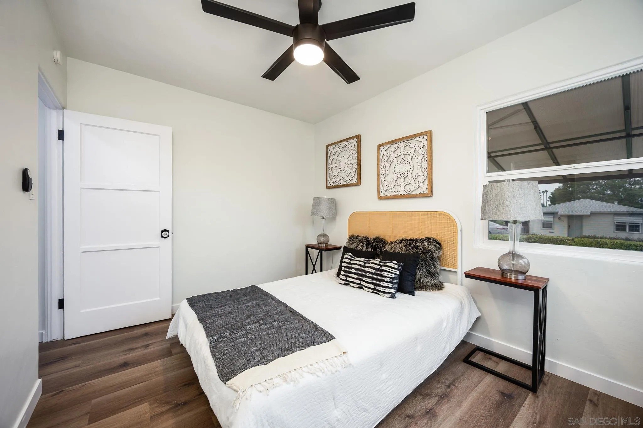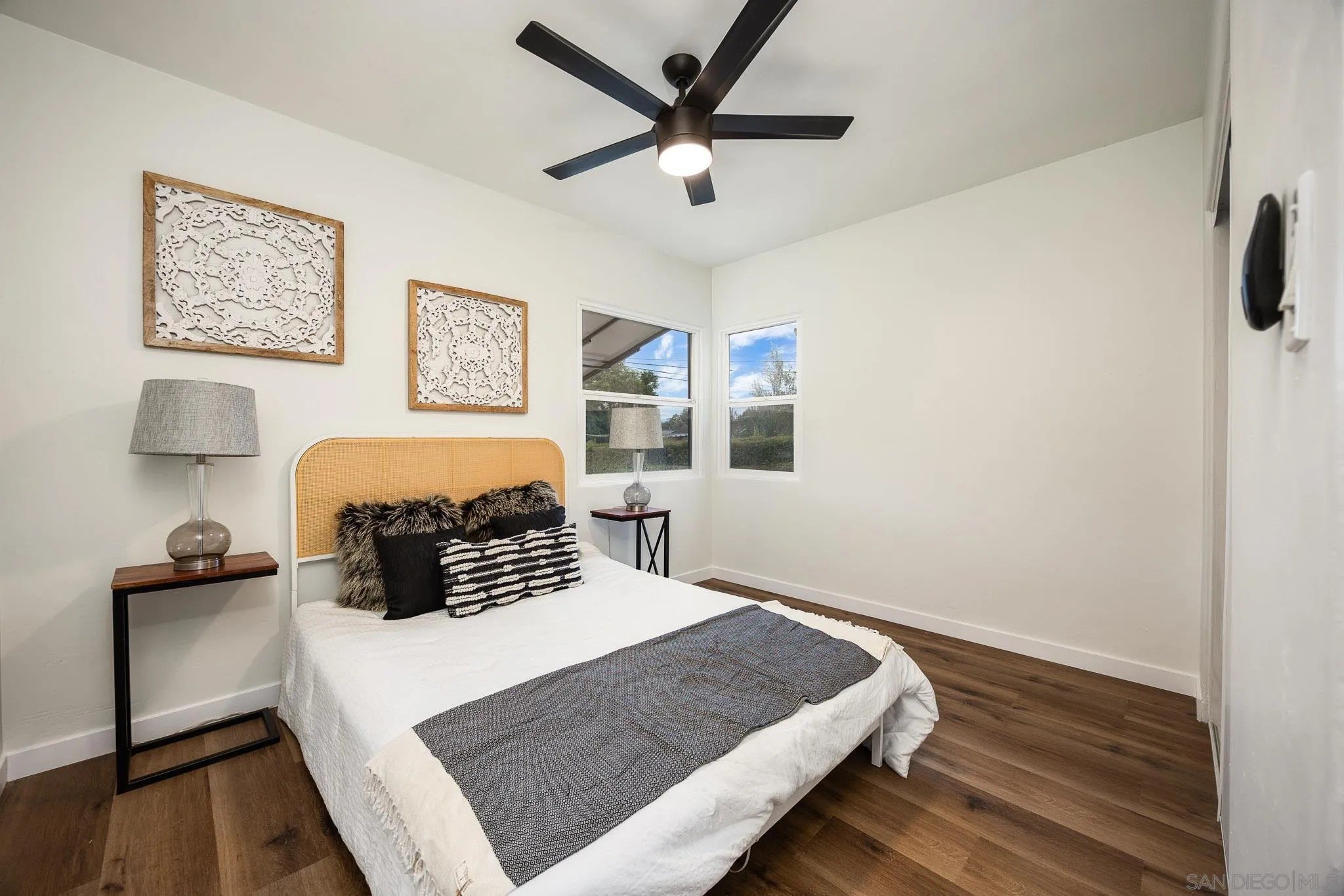 Welcome to your beautifully remodeled La Mesa retreat! This 2-bedroom, 1-bath single-family home offers 750 sq ft of stylish living space that lives much larger than its size. Every detail has been updated with fresh paint inside and out, brand-new windows, modern ceiling fans, and energy efficient mini-split HVAC system. The open-concept layout features luxury vinyl plank flooring throughout, a brand-new kitchen with crisp shaker cabinets, gorgeous quartz countertops, stainless-steel appliances, and a deep basin sink. You'll also love the convenience of an indoor laundry room and a one-car garage with plenty of parking and storage. Step outside to your massive backyard oasis. Featuring lush green grass, a large covered patio, and endless potential for entertaining, future expansion, an ADU, or even your dream pool. This move in ready home blends modern comfort with incredible outdoor space, offering the perfect La Mesa lifestyle.