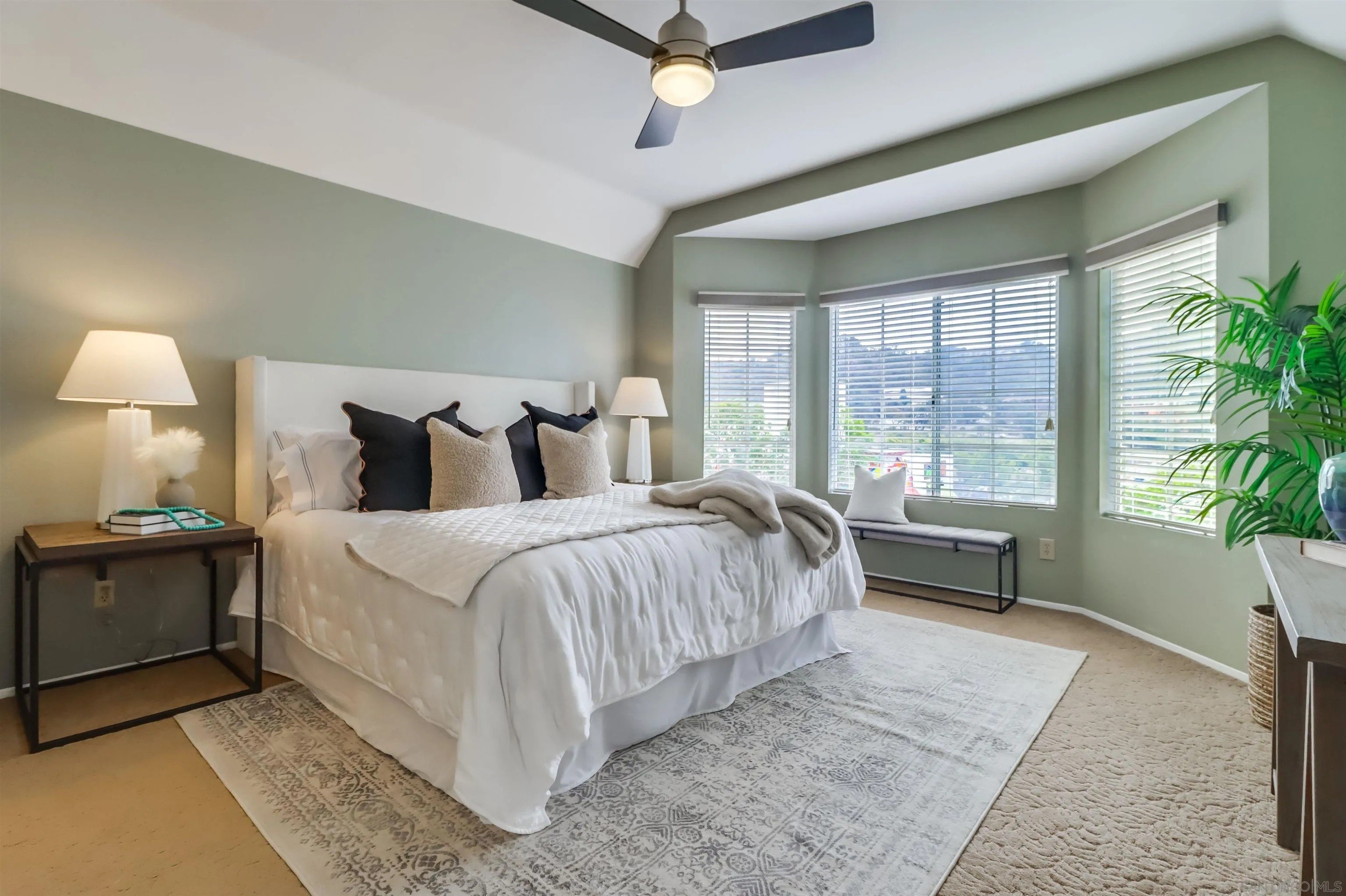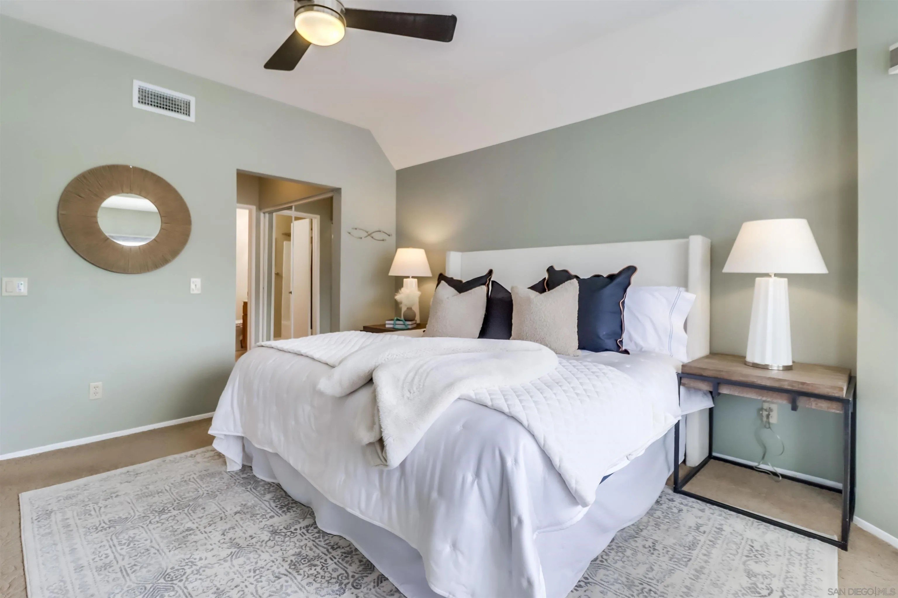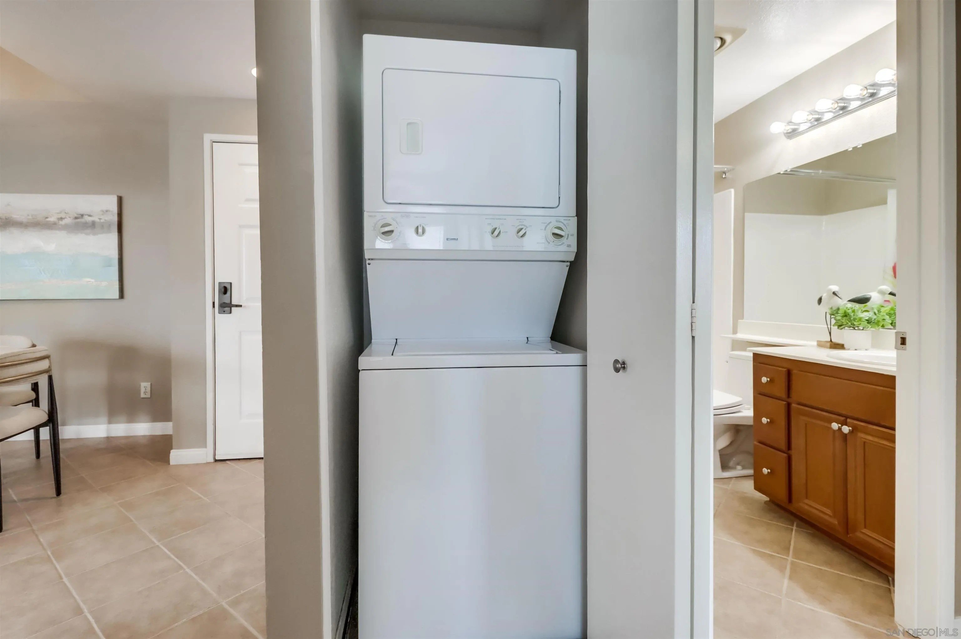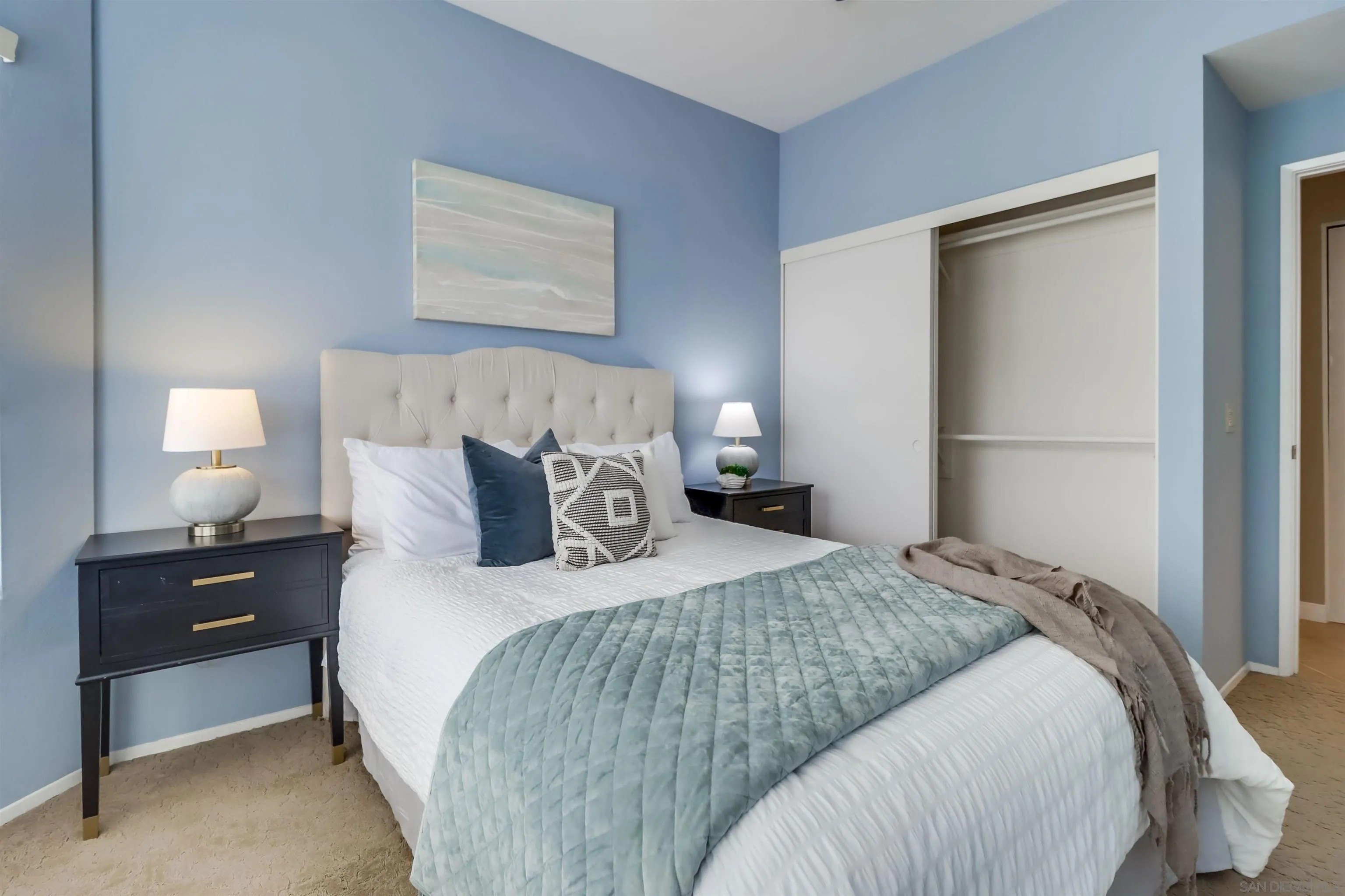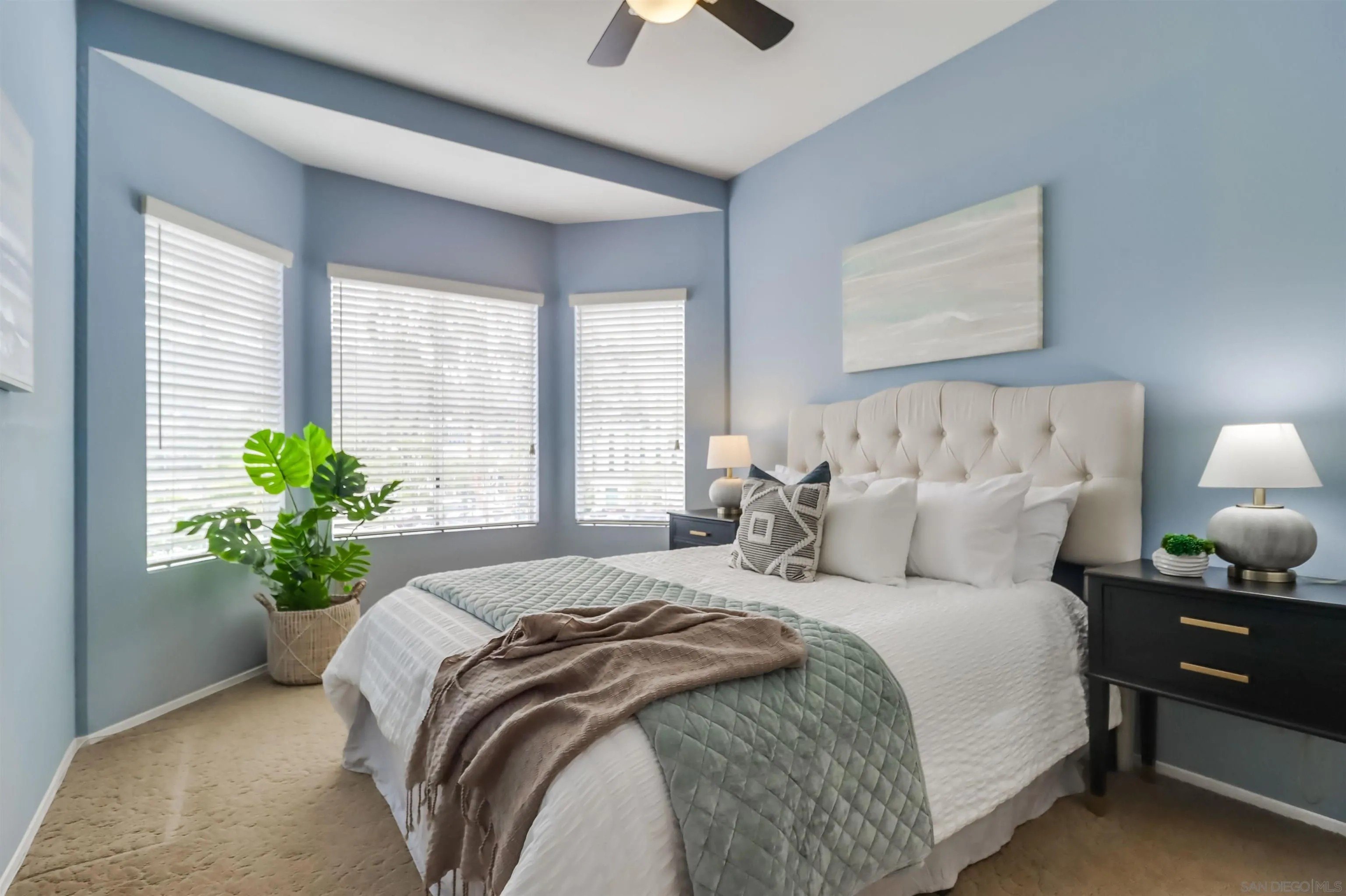 Your PENTHOUSE awaits! Welcome to this rarely available TOP FLOOR, SOUTHWEST facing, CORNER UNIT, offering green canyon VIEWS, and situated in one of Mission Valley's most desirable communities - River Colony! Step inside to an inviting open layout featuring luxurious porcelain tile flooring, an upgraded kitchen with stainless steel appliances, and a cozy fireplace for those chilly evenings! Be amazed by an abundance of natural light from multiple windows that brighten every space, complemented by custom blinds, including room-darkening shades in the primary bedroom. Both bathrooms have been tastefully updated, and each room includes ceiling fans for added comfort. Enjoy the convenience of your own PRIVATE WASHER and DRYER, a recently maintained HVAC system, wired internal alarm system, and TWO assigned side-by-side parking spaces in the gated underground garage. A Ring doorbell, Google Nest thermostat, and BBQ grill adds extra value and modern convenience. River Colony residents enjoy resort-style living with access to a sparkling pool and spa, a fully equipped fitness center, a clubroom, and a Wi-Fi lounge, all maintained by a well-managed HOA. Ideally located near San Diego's best shopping, dining, and trolley access, this home offers the perfect combination of comfort, style, and convenience. Don't miss your opportunity to make this beautiful top-floor retreat yours, just in time for the holiday season!