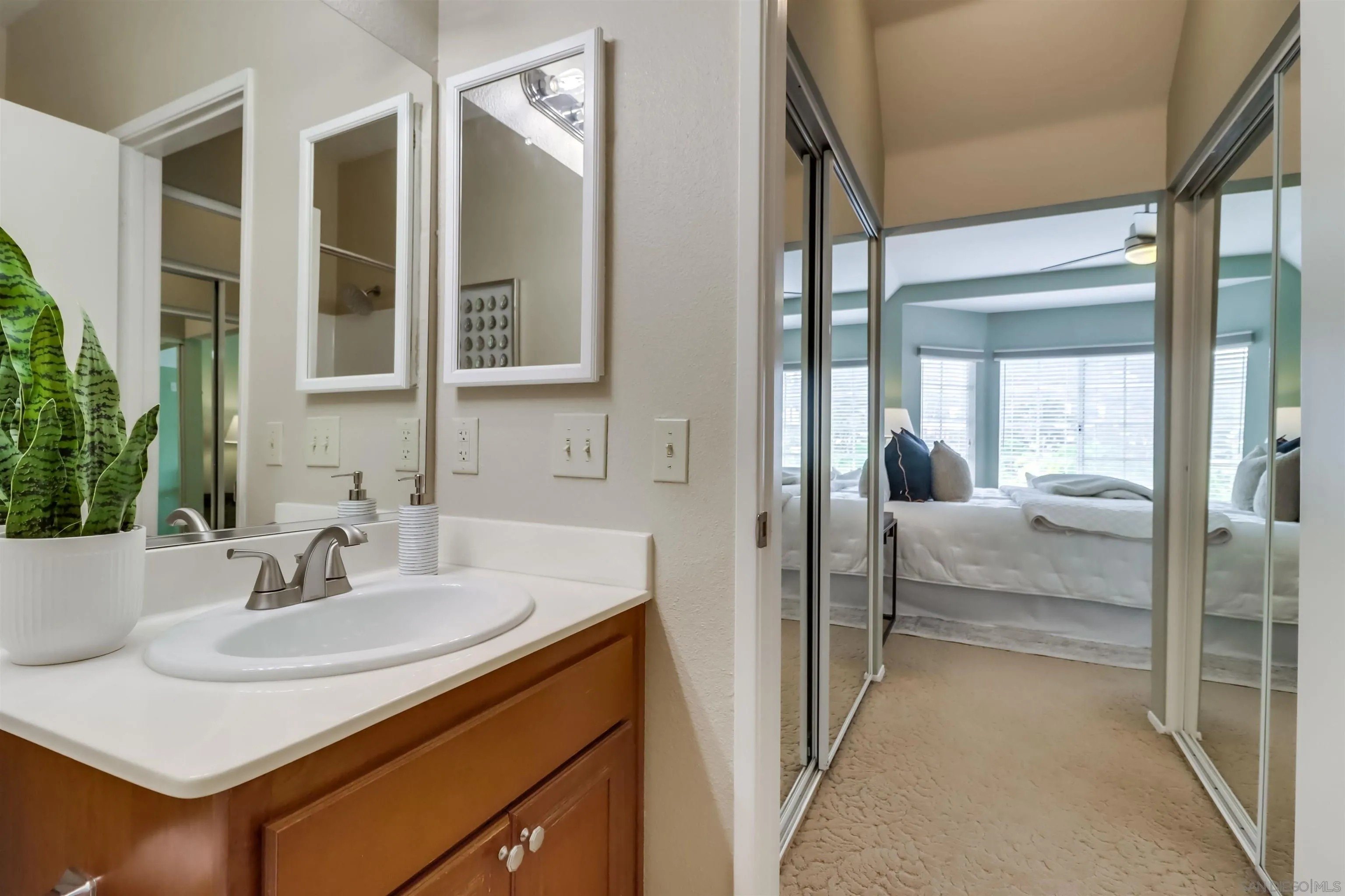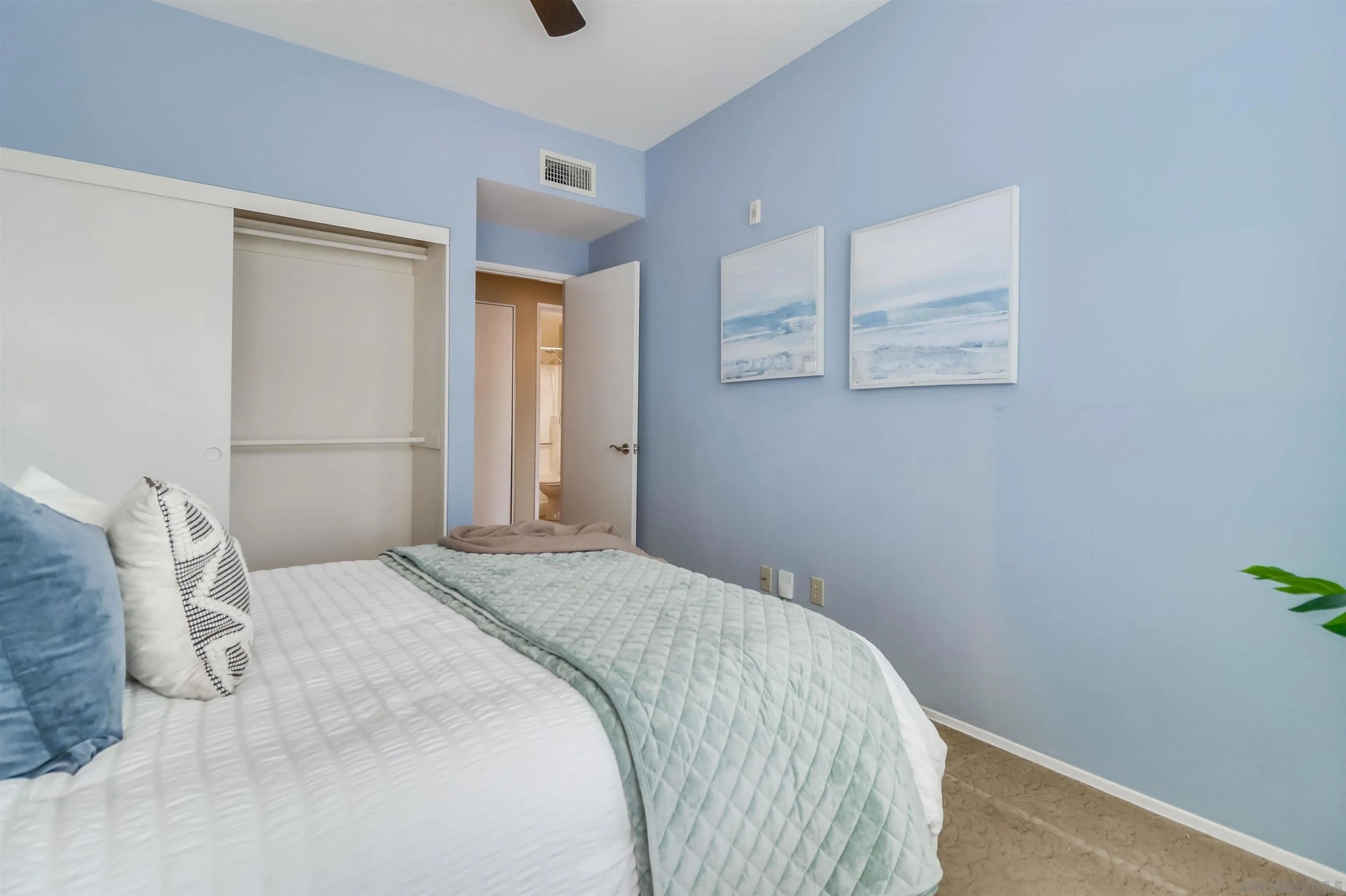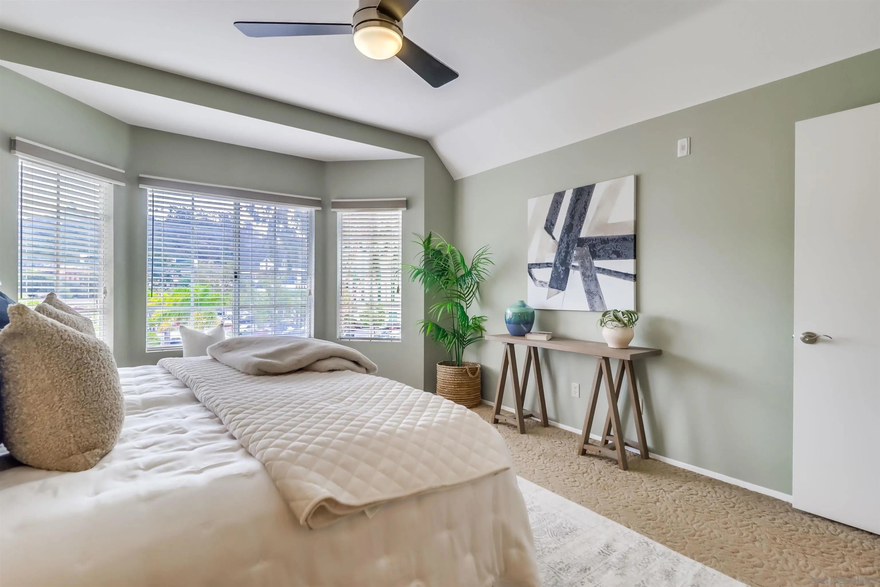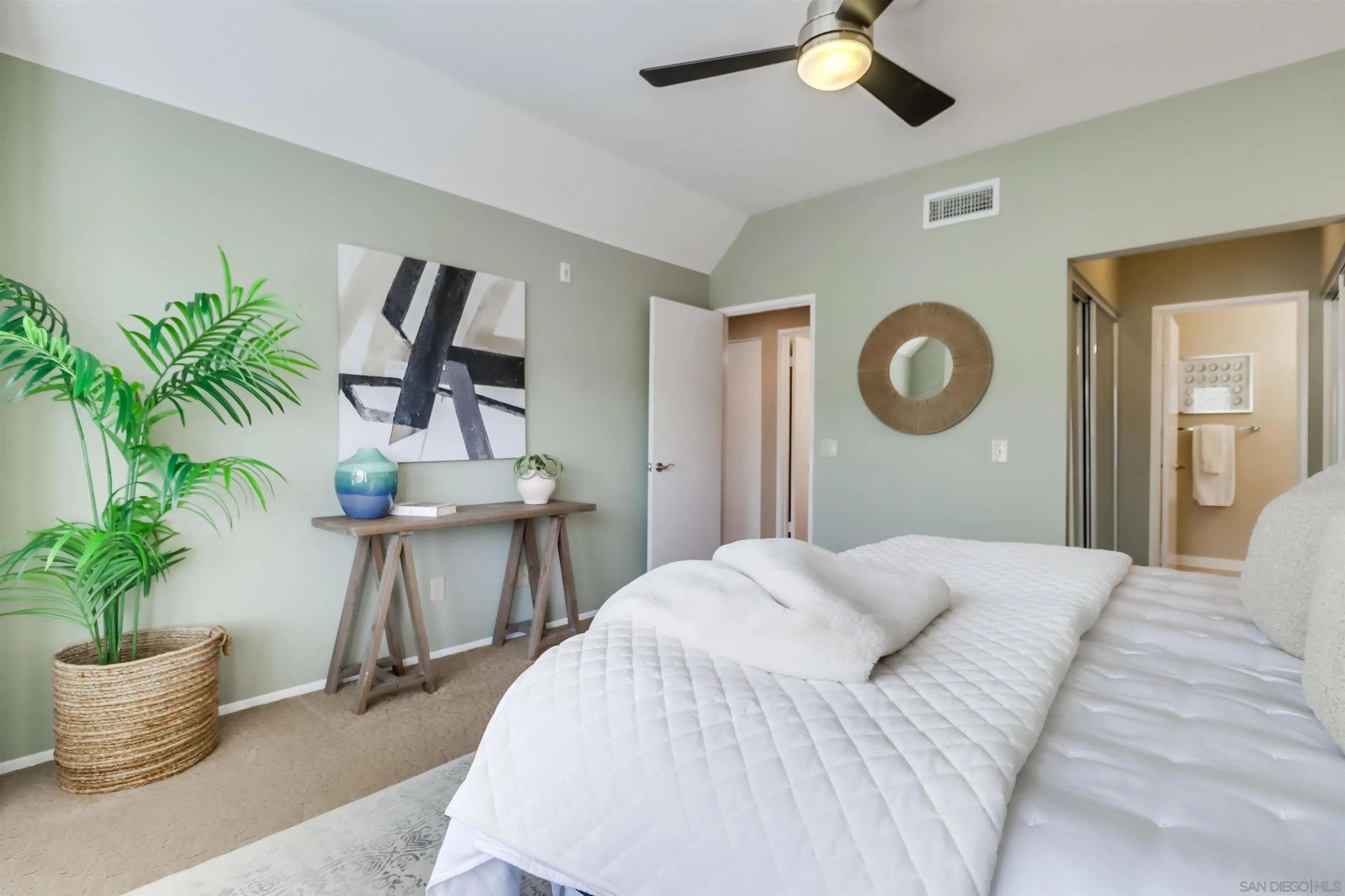 Your PENTHOUSE awaits! Welcome to this rarely available TOP FLOOR, SOUTHWEST facing, CORNER UNIT, offering green canyon VIEWS, and situated in one of Mission Valley's most desirable communities - River Colony! Step inside to an inviting open layout featuring luxurious porcelain tile flooring, an upgraded kitchen with stainless steel appliances, and a cozy fireplace for those chilly evenings! Be amazed by an abundance of natural light from multiple windows that brighten every space, complemented by custom blinds, including room-darkening shades in the primary bedroom. Both bathrooms have been tastefully updated, and each room includes ceiling fans for added comfort. Enjoy the convenience of your own PRIVATE WASHER and DRYER, a recently maintained HVAC system, wired internal alarm system, and TWO assigned side-by-side parking spaces in the gated underground garage. A Ring doorbell, Google Nest thermostat, and BBQ grill adds extra value and modern convenience. River Colony residents enjoy resort-style living with access to a sparkling pool and spa, a fully equipped fitness center, a clubroom, and a Wi-Fi lounge, all maintained by a well-managed HOA. Ideally located near San Diego's best shopping, dining, and trolley access, this home offers the perfect combination of comfort, style, and convenience. Don't miss your opportunity to make this beautiful top-floor retreat yours, just in time for the holiday season!