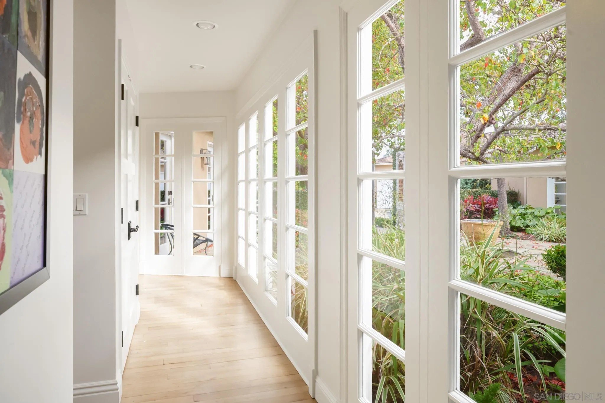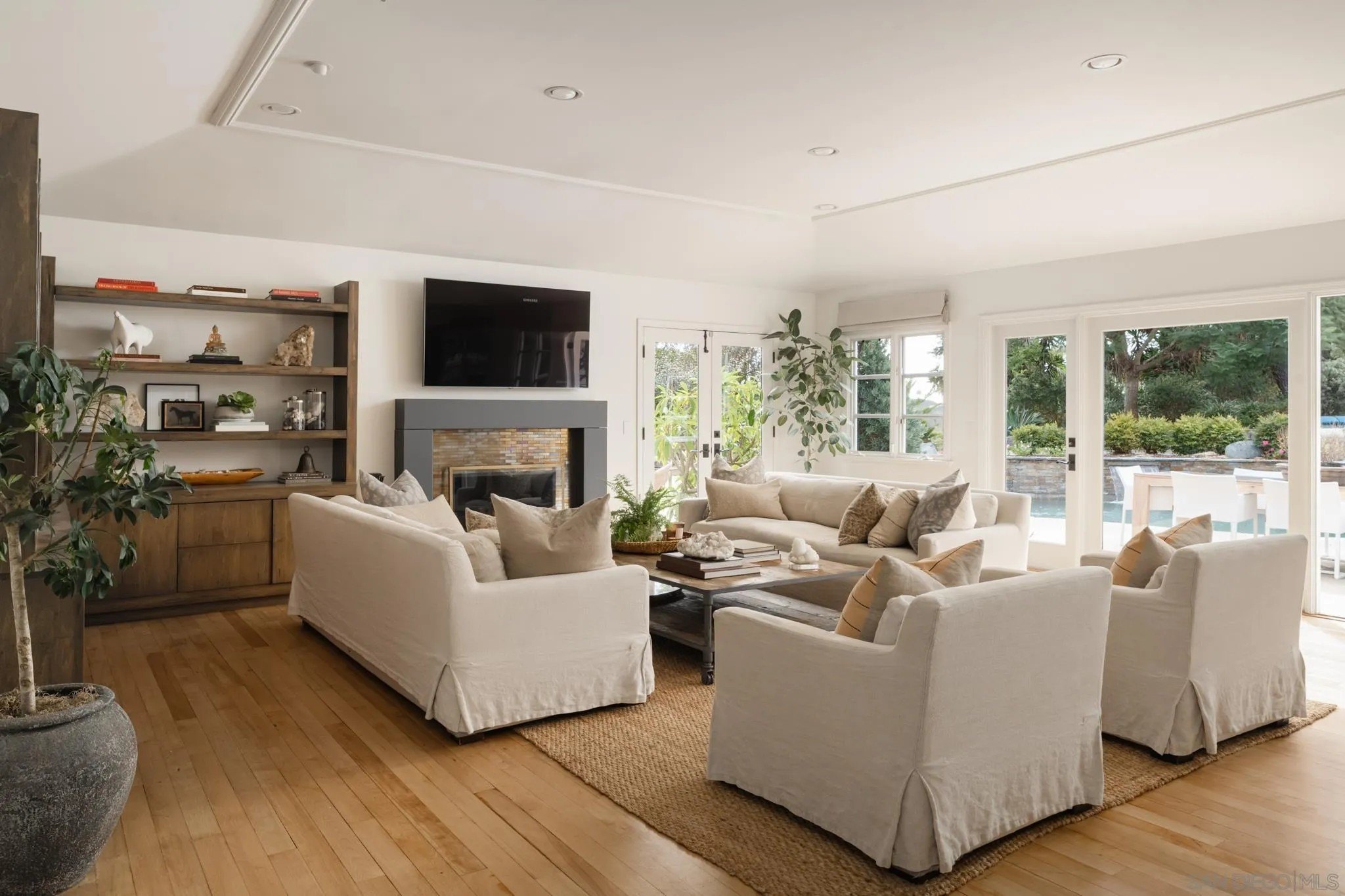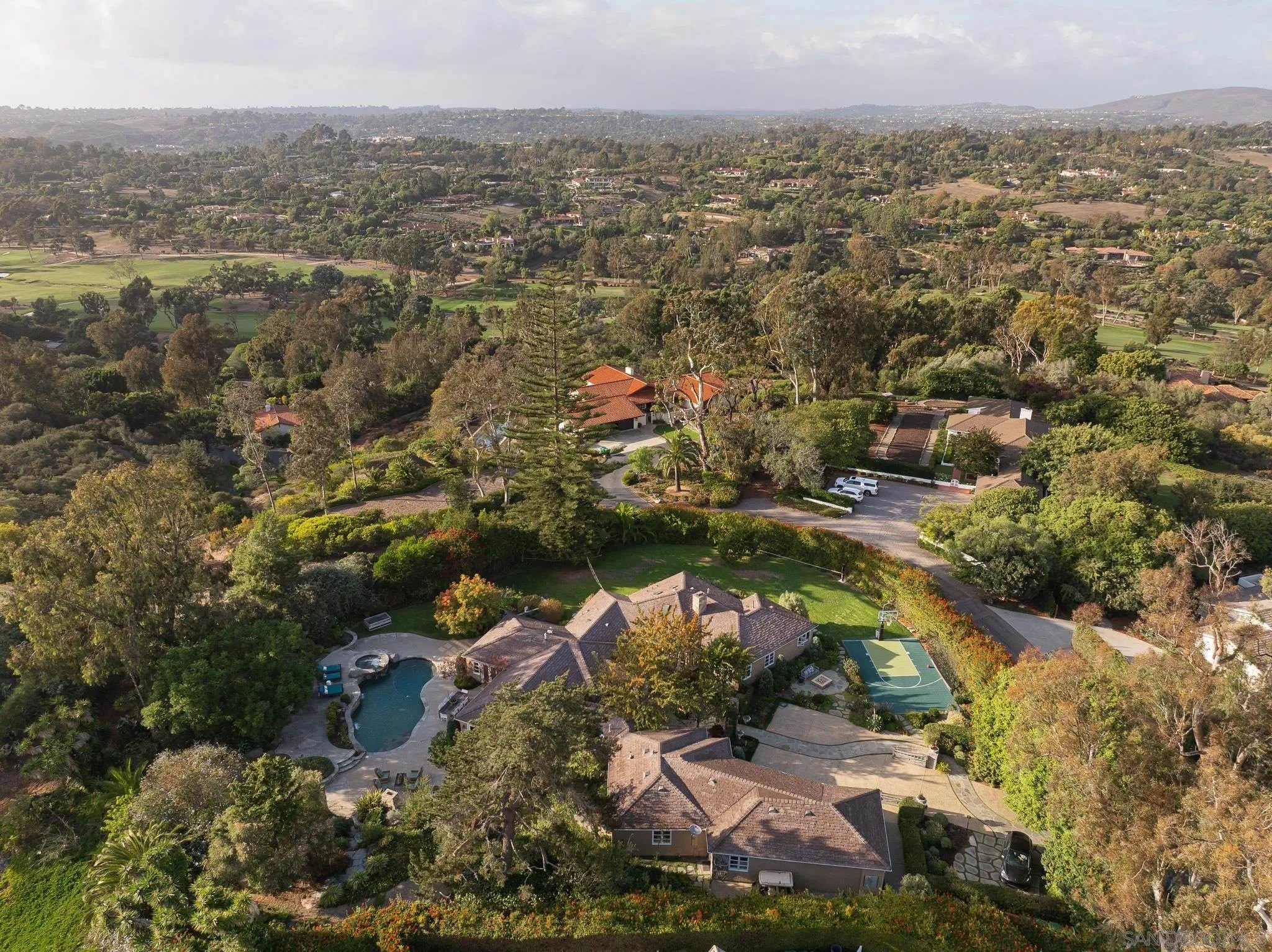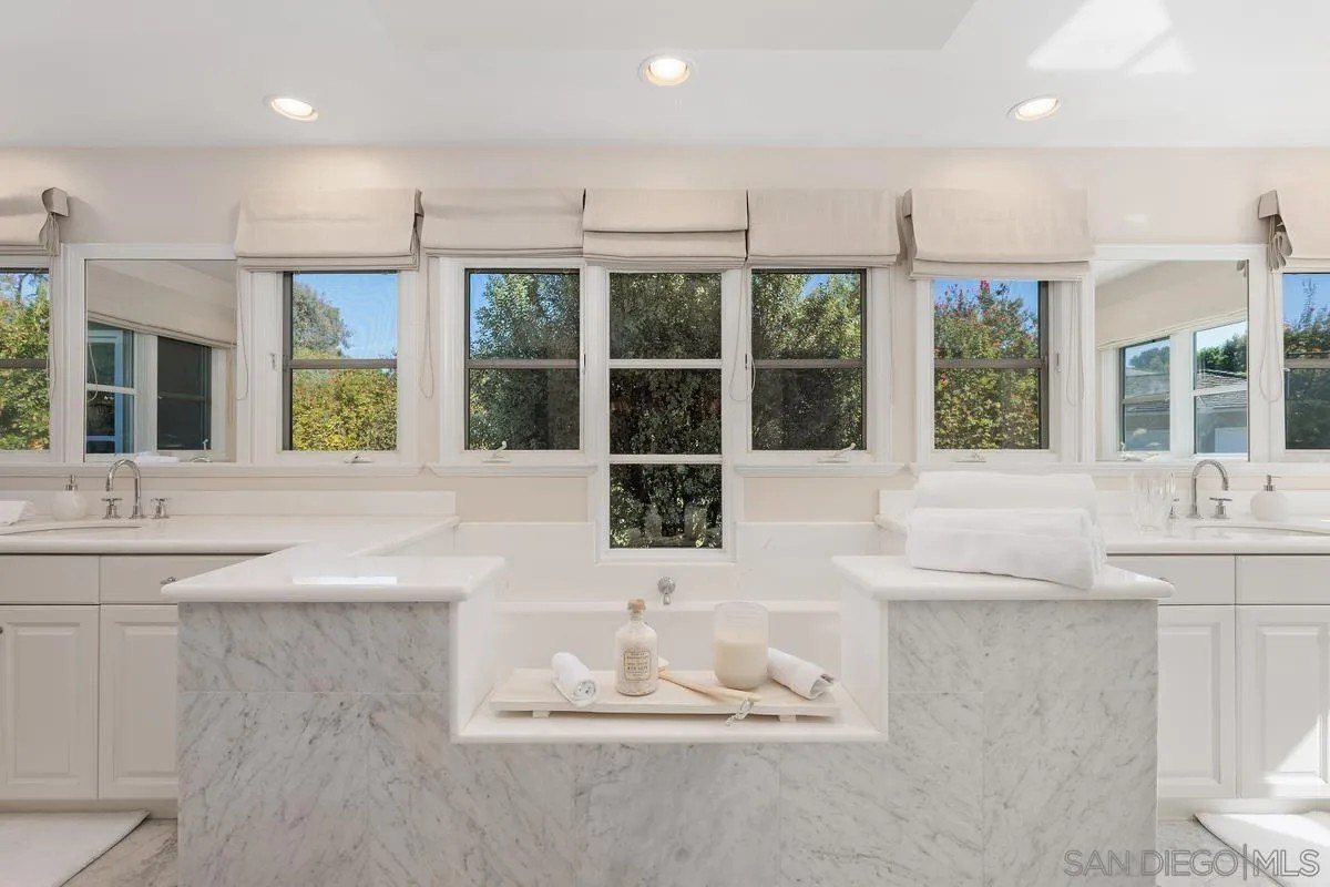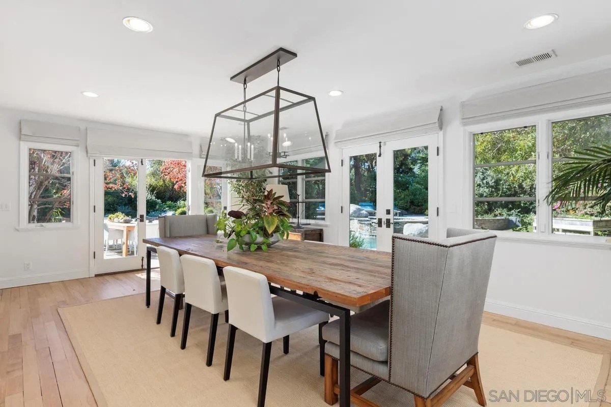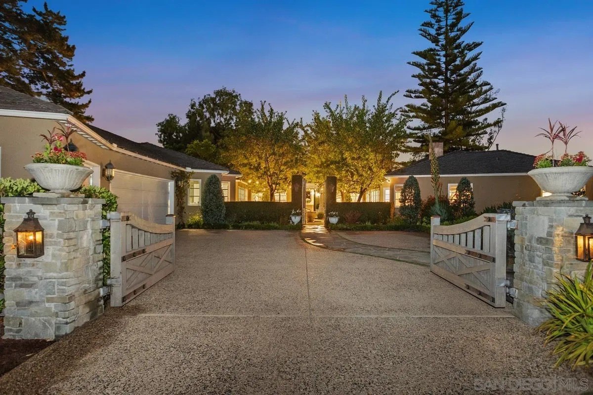 Ideally located on one of the most sought-after streets in the renowned Rancho Santa Fe Covenant, this enchanting single-level home seamlessly combines charm, sophistication, and functionality. Your private oasis awaits with an expansive backyard that borders acres of open space, impeccably groomed trails, and just a short walk to the Rancho Santa Fe Village, the acclaimed Roger Rowe Elementary and Middle schools and the Rancho Santa Fe Golf and Tennis clubs. You will immediately fall in love with the beauty of the lush landscape and the inviting private courtyard entry. The home boasts a freshly remodeled kitchen, and exquisite reclaimed maple floors throughout. It has a sun-drenched great room, and a gourmet eat-in kitchen, that seamlessly open onto the pool and entertaining areas with westerly views and gentle ocean breezes. The interior design includes 5 bedrooms, 4.5 baths and floor-to-ceiling windows and French doors that seamlessly caters to the indoor/outdoor living you can enjoy year-round in San Diego.