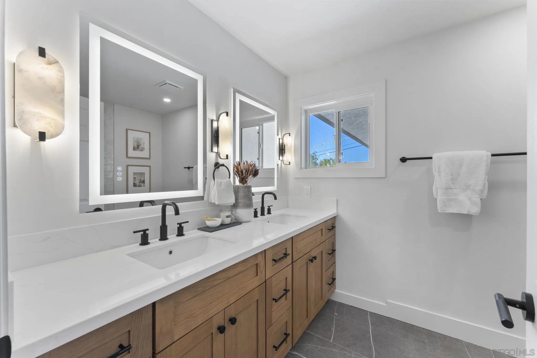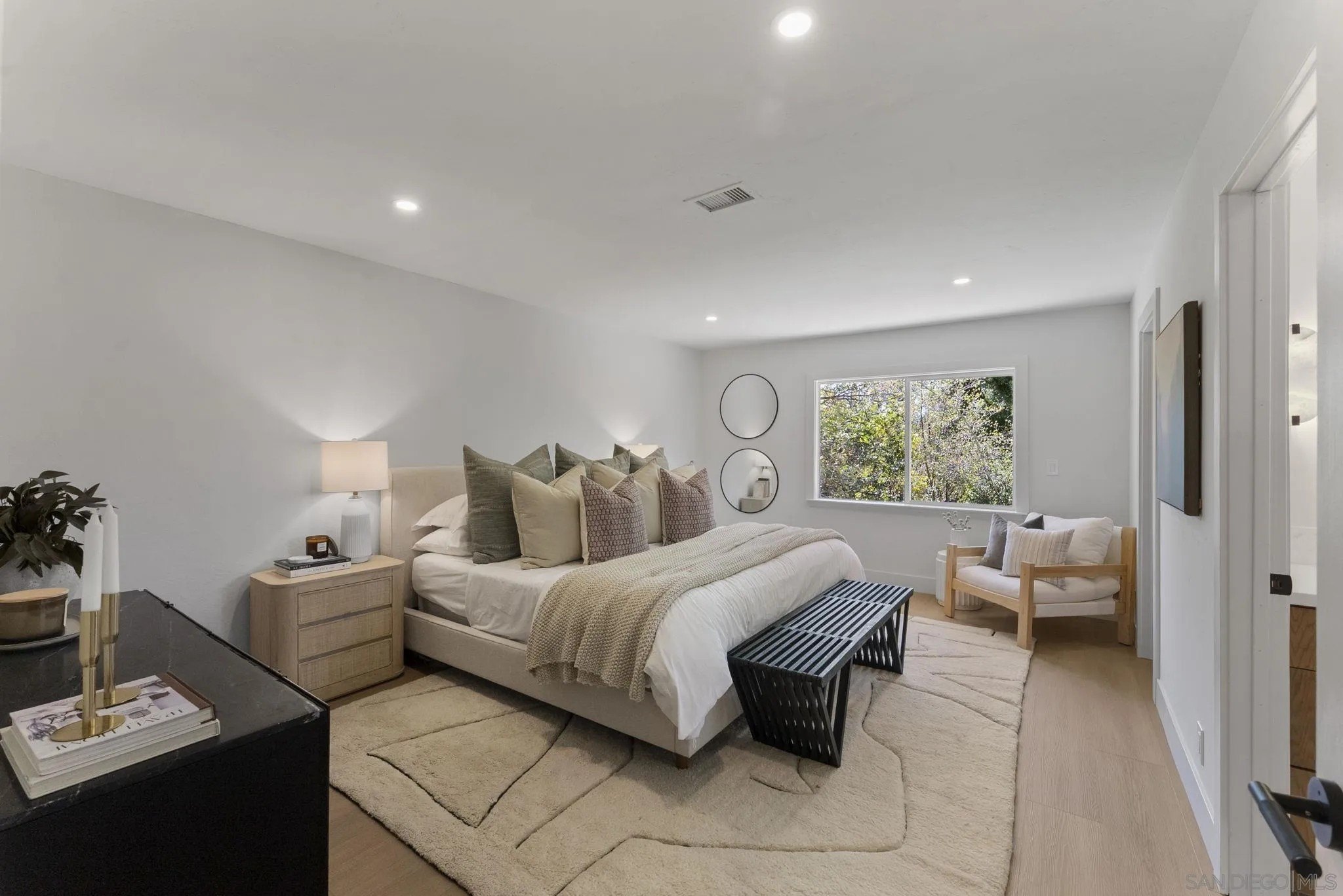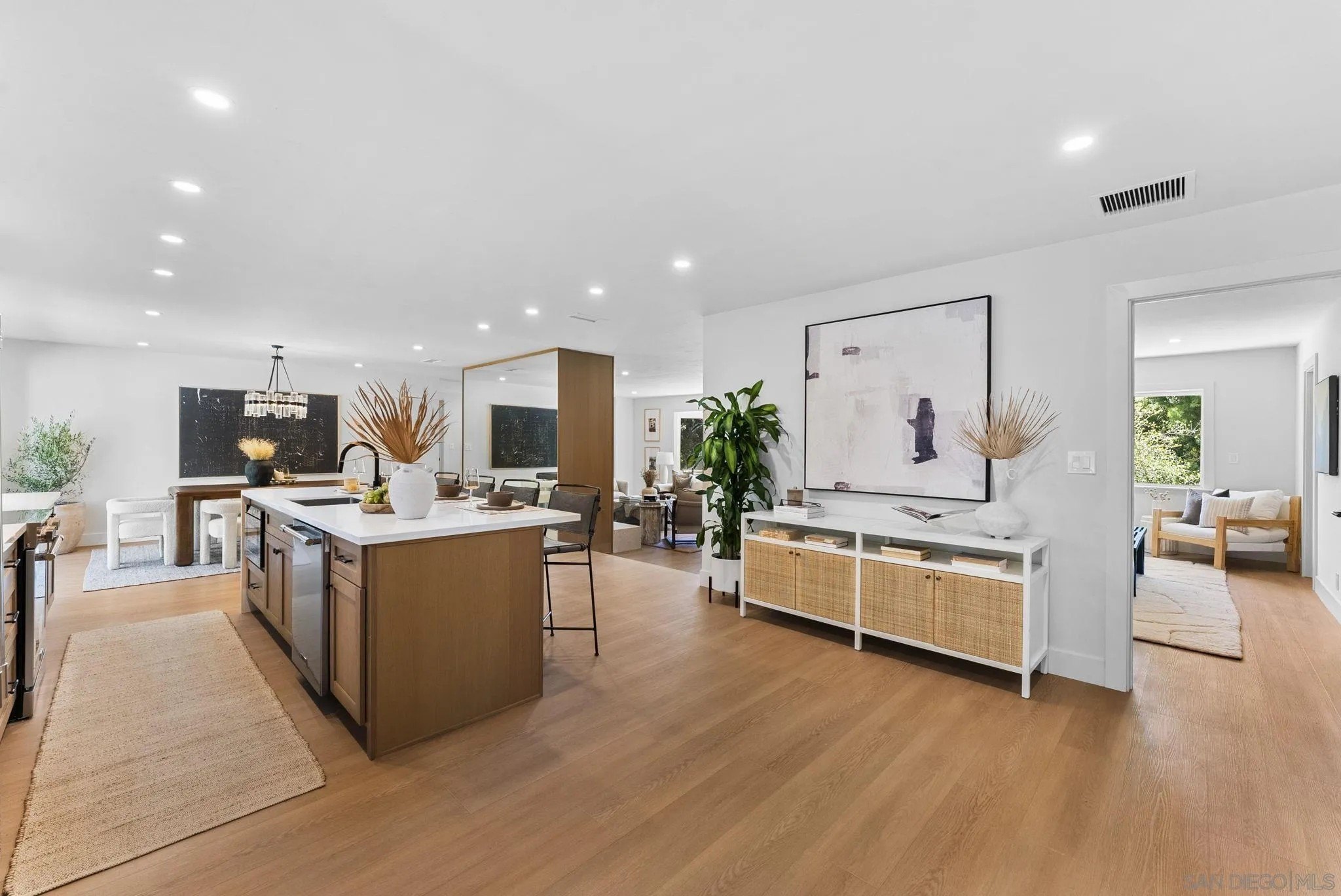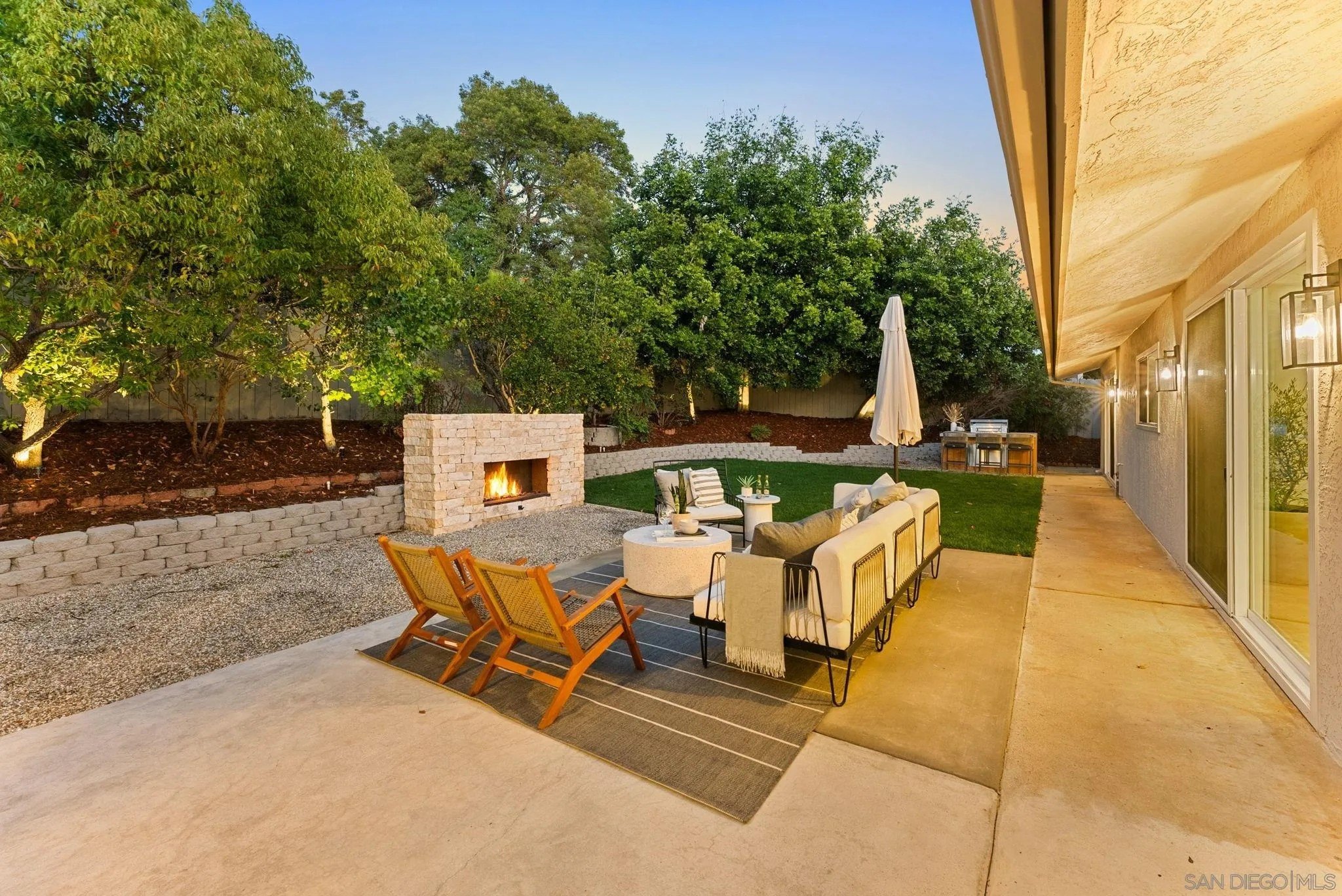 Welcome to this beautifully appointed single-level home in the coveted Valle Verde Estates of Poway. Situated on over a half acre, the property sits gracefully above the street, offering exceptional privacy and tranquility. Step inside to a bright, open interior where clean lines, designer finishes, and natural light define the space. The foyer opens to a formal living room featuring a stunning modern fireplace, wide-plank flooring, and expansive windows that frame views of the surrounding landscape. Every detail has been thoughtfully curated to balance contemporary sophistication with everyday livability, creating a home that feels both elegant and effortlessly comfortable. At the heart of the home is a chef's kitchen that perfectly blends style and functionality, featuring gorgeous island, custom cabinetry, and a seamless connection to the dining and family areas-ideal for both everyday living and entertaining. The adjoining family room includes a custom bar and sliding doors that open to a spacious patio, creating effortless indoor-outdoor flow. The thoughtful floor plan includes two primary suites, ideal for multigenerational living or hosting guests. The main suite is a true sanctuary with a large walk-in closet and a luxurious en-suite featuring dual vanities, and a stunning shower. Additional highlights include a large laundry room, oversized garage, and ample guest parking. Located within the award-winning Poway Unified School District and just minutes from trails, shopping, and dining, this home embodies the perfect blend of modern comfort and timeless style!