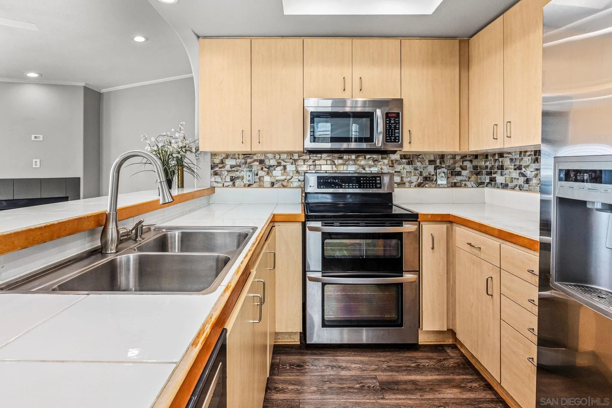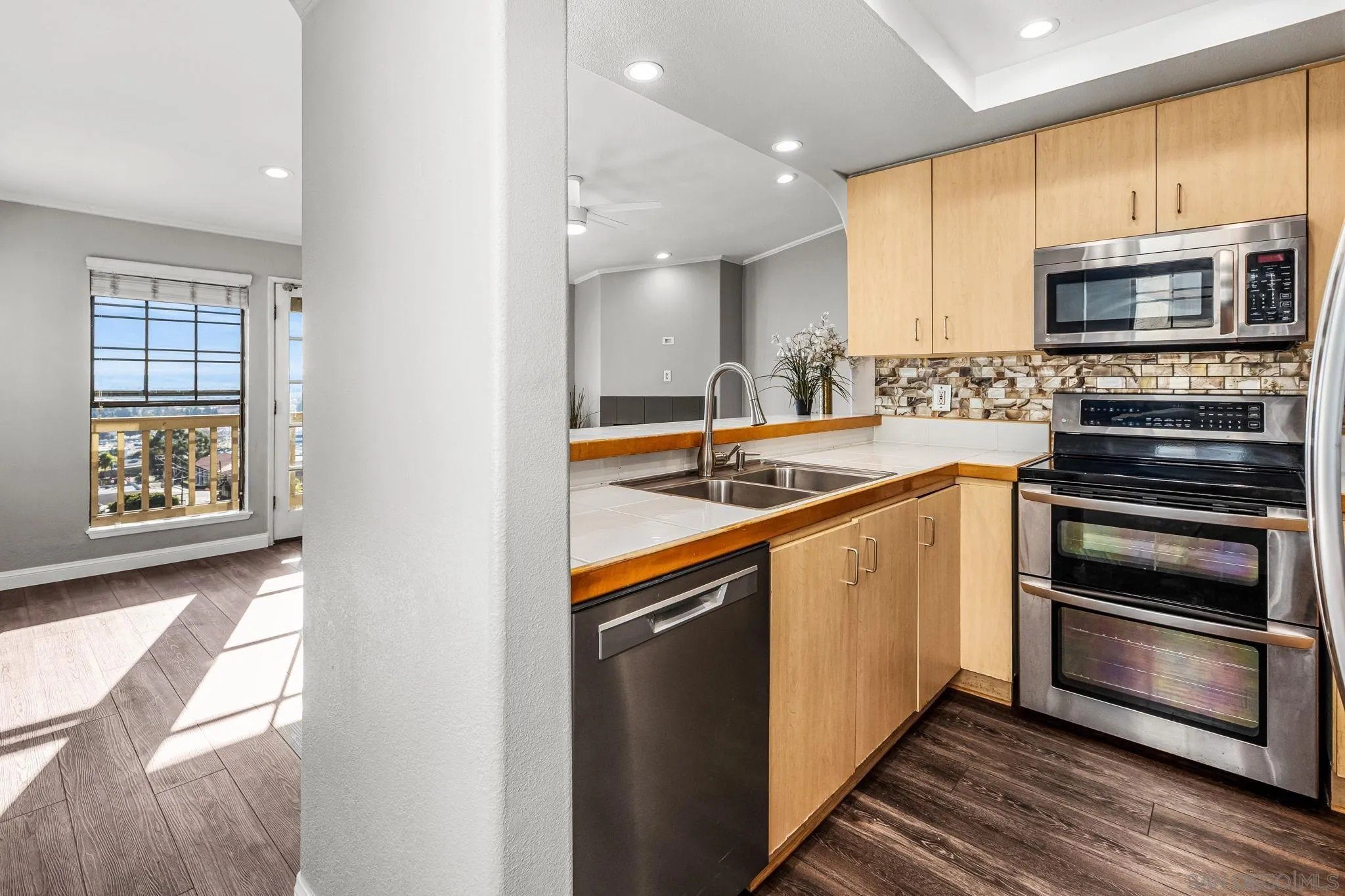Elevated coastal living at 2235 Linwood St, Unit A7, a top-floor end unit flawlessly positioned above the historic charm of Old Town and the coastal beauty of Point Loma. Dual master-suite layout, offering two generously sized bedrooms each with its own full bath and in-unit laundry. Inside, luxury vinyl plank flooring, expansive windows that flood the space with natural light, and a private balcony where you can unwind to panoramic views of the San Diego Bay, Point Loma, and the glowing city skyline at sunset. 4 electric burner stove with 2 oven handlebars. Dishwasher and Microwave. Electric views from the kitchen. Enjoy the convenience of a gated community featuring a sparkling pool, spa, and fitness center, all just moments from the vibrant restaurants, boutiques, and cultural experiences of Old Town, Mission Hills, and Downtown San Diego. ?Two assigned parking spaces, including a private garage, ensure security. HOA covering exterior maintenance, water, and trash, this home welcomes you to focus on what matters most enjoying a lifestyle with million-dollar views and timeless San Diego energy. Luxury, convenience, and location.