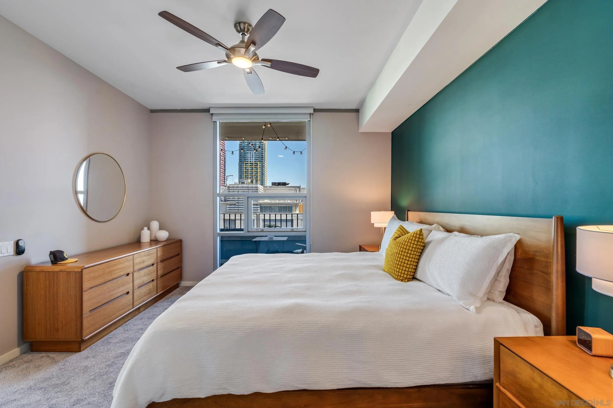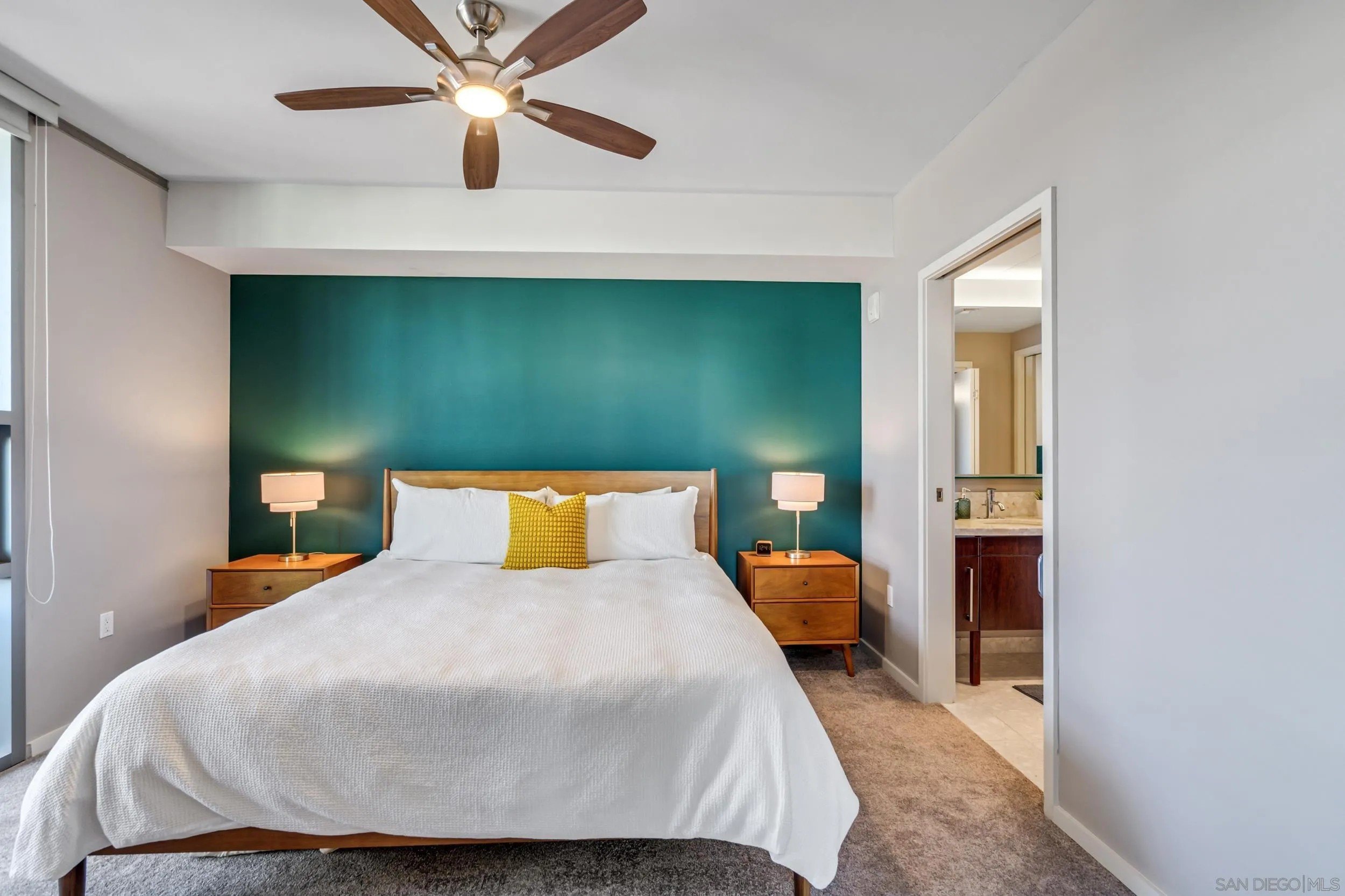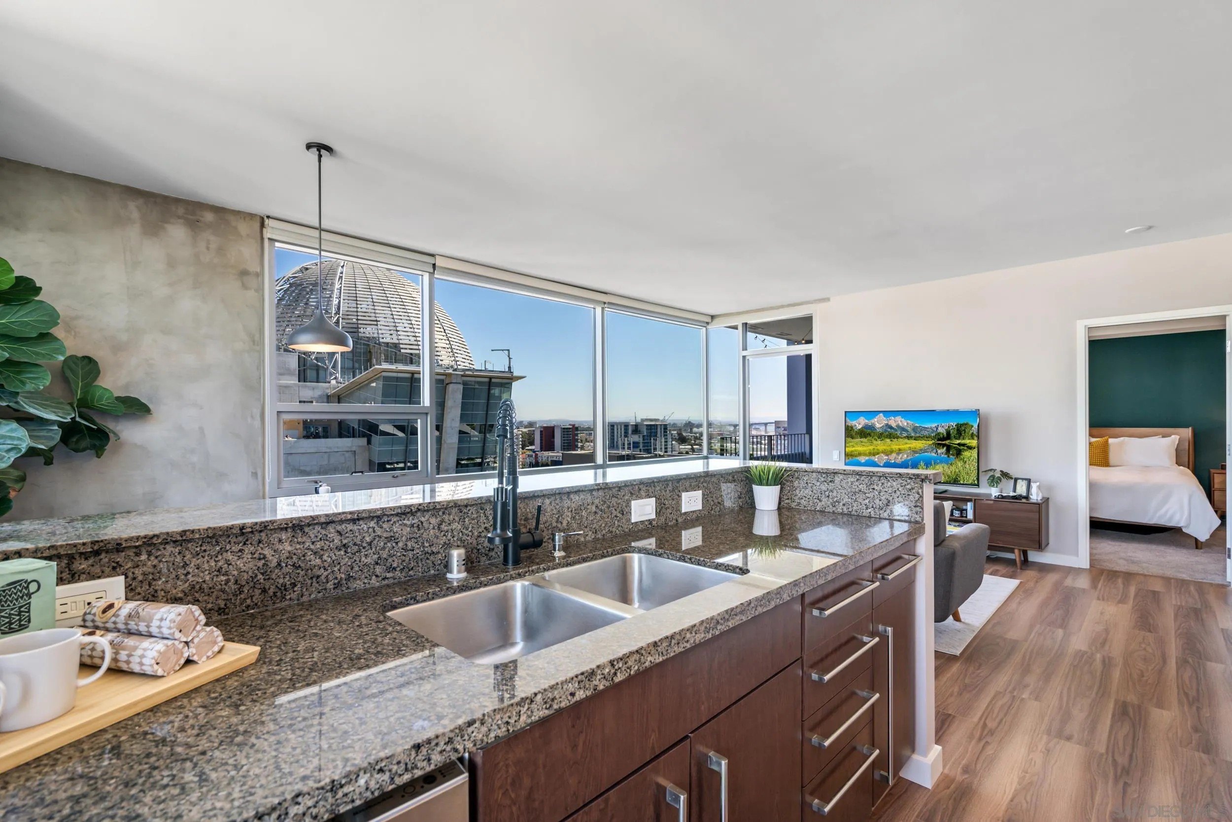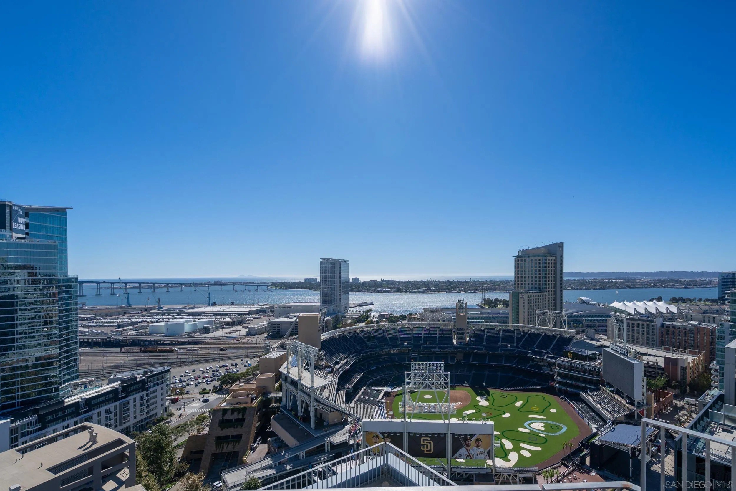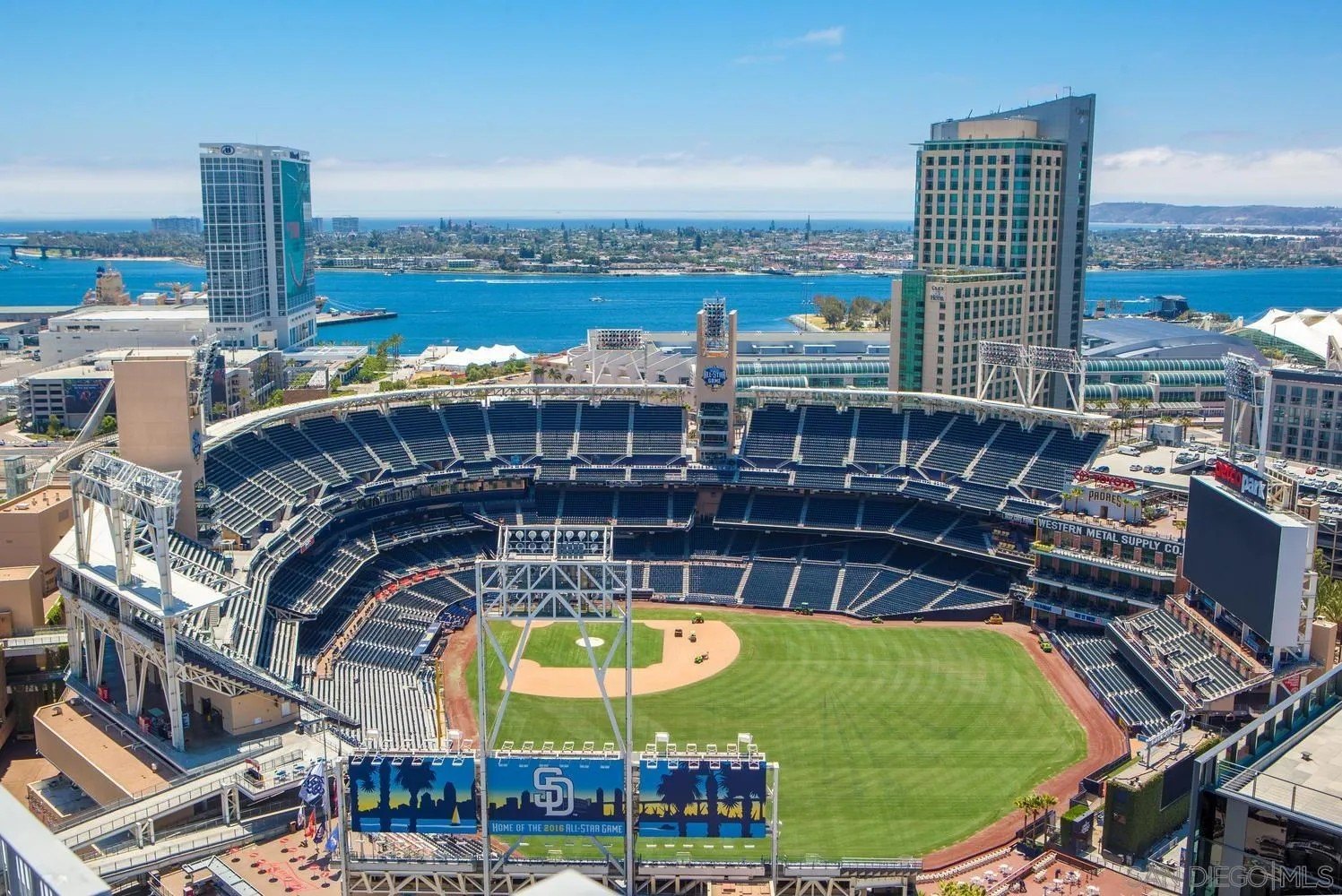 Experience elevated downtown living at ICON, where modern design meets timeless sophistication. This meticulously maintained and upgraded northeast corner residence showcases breathtaking panoramic views of the San Diego Bay, Coronado Bridge, and the sparkling city skyline. Step through the entryway into a light-filled, open-concept floor plan featuring new carpet, wood-look flooring, and fresh designer paint throughout. The gourmet kitchen impresses with stainless steel appliances, sleek granite countertops, and ample cabinetry-perfect for both casual dining and entertaining. The serene primary suite includes a fully built-out closet and a beautifully finished bath with dual vanities. Modern urban comforts include in-unit laundry, two parking spaces, and a private storage unit, providing both convenience and functionality to your downtown lifestyle. ICON is a VA-approved community offering resort-style amenities such as a 24-hour front desk attendant, state-of-the-art fitness center, and the iconic rooftop Skybox terrace with lounge seating, TVs, surround sound, BBQs, heaters, and panoramic city views. Additional amenities include the 5th Inning community recreation room with a full kitchen and business center, a private movie theater, community fireplace, bike and package storage with Amazon lockers, and an interior courtyard featuring sculptural art, a waterfall element, and modern landscaping. Residents also enjoy Google Fiber high-speed internet, on-site property management, and a sleek, contemporary lobby entrance.