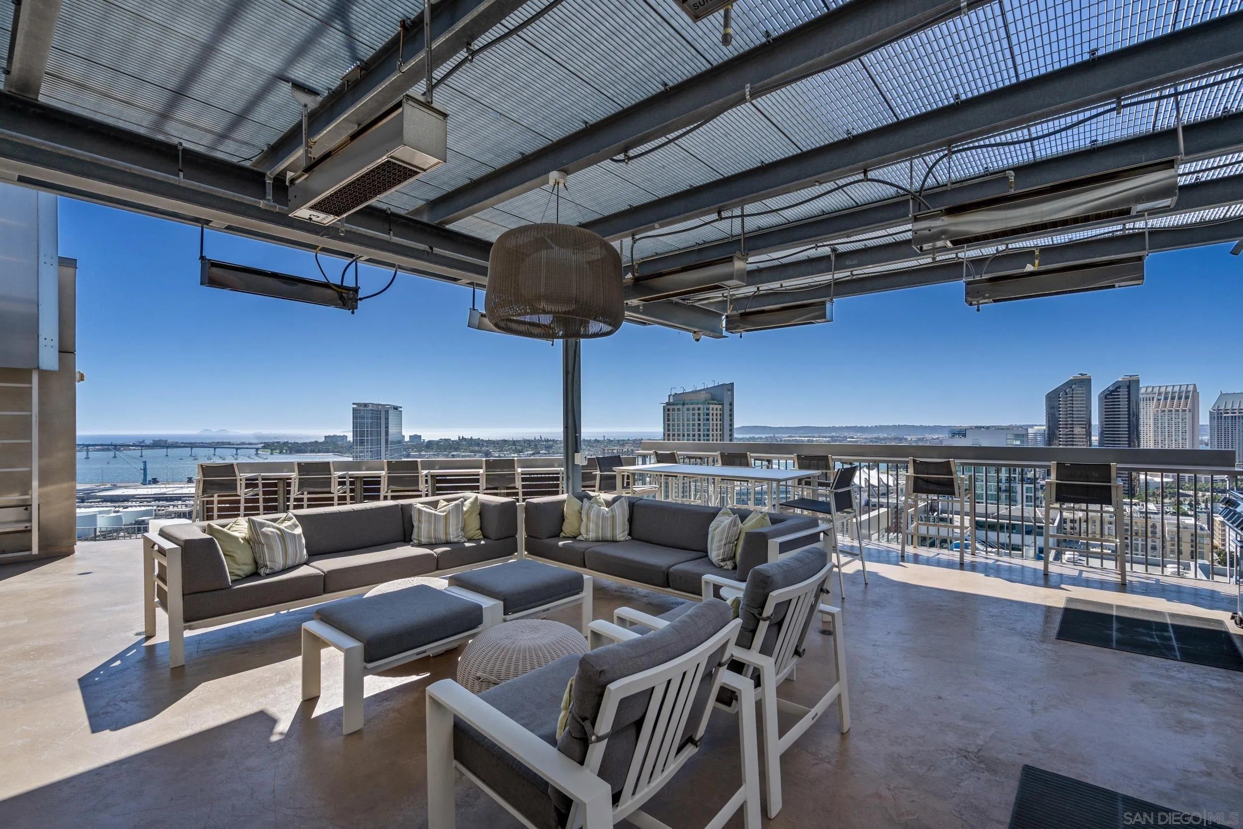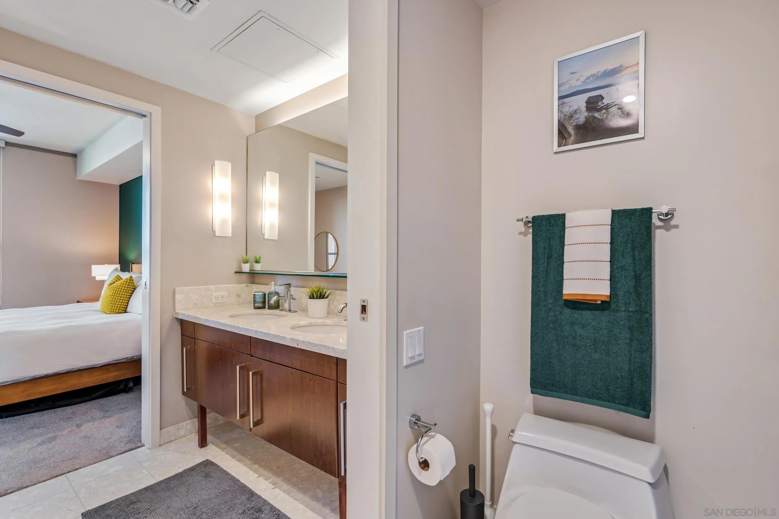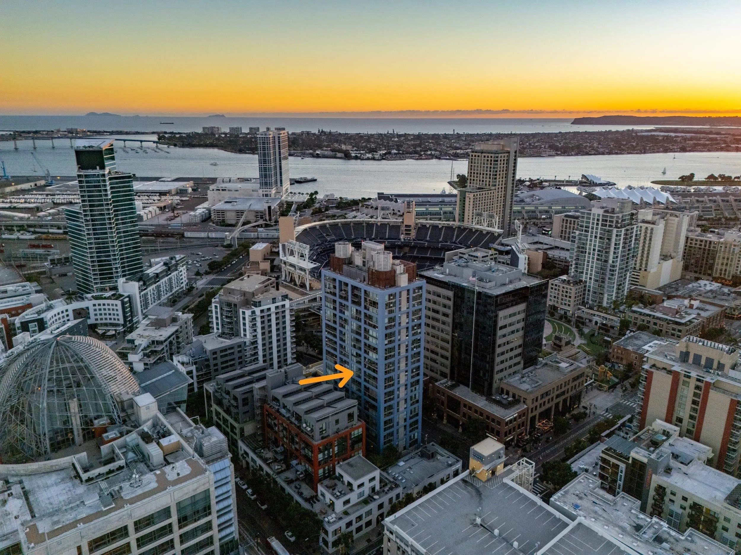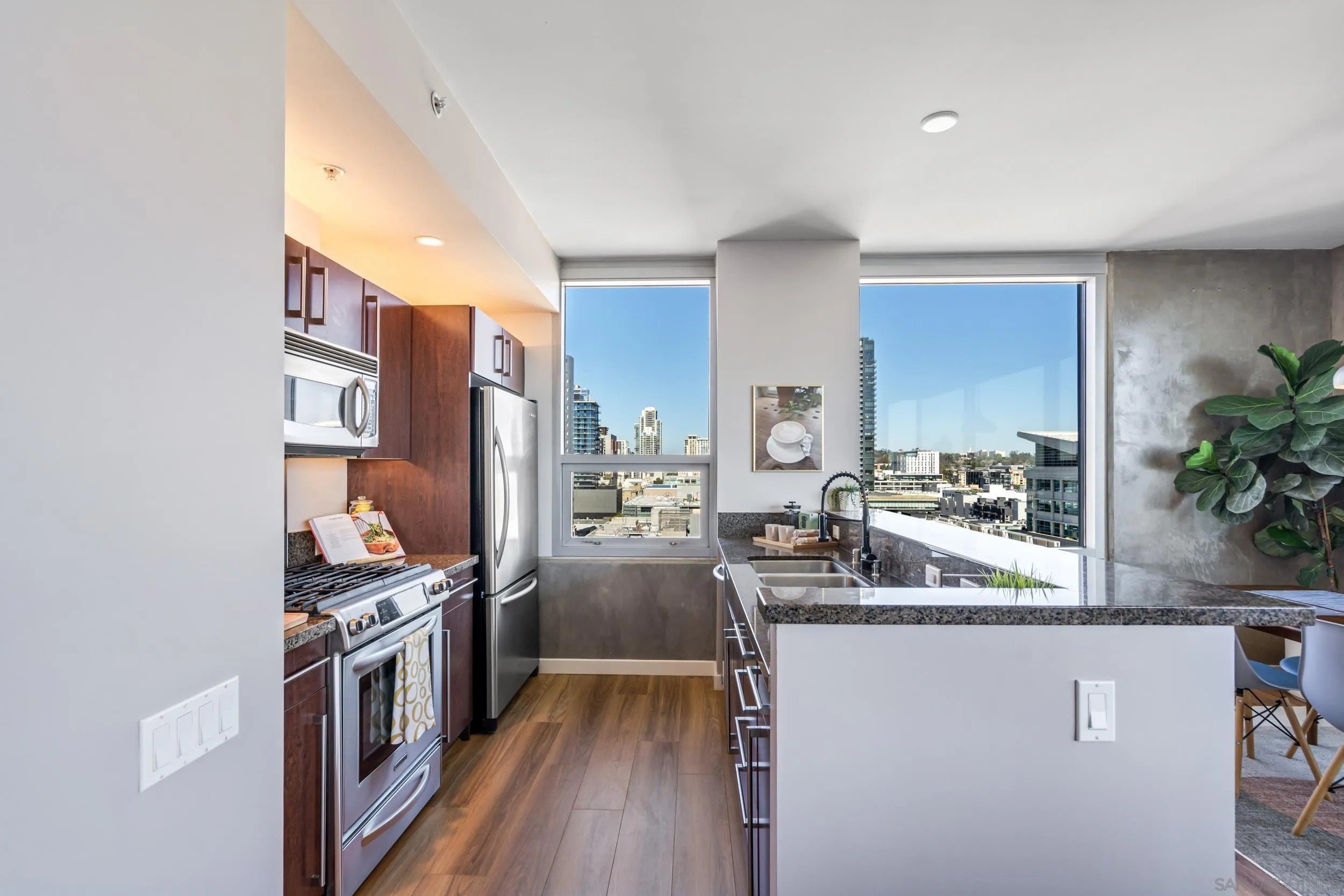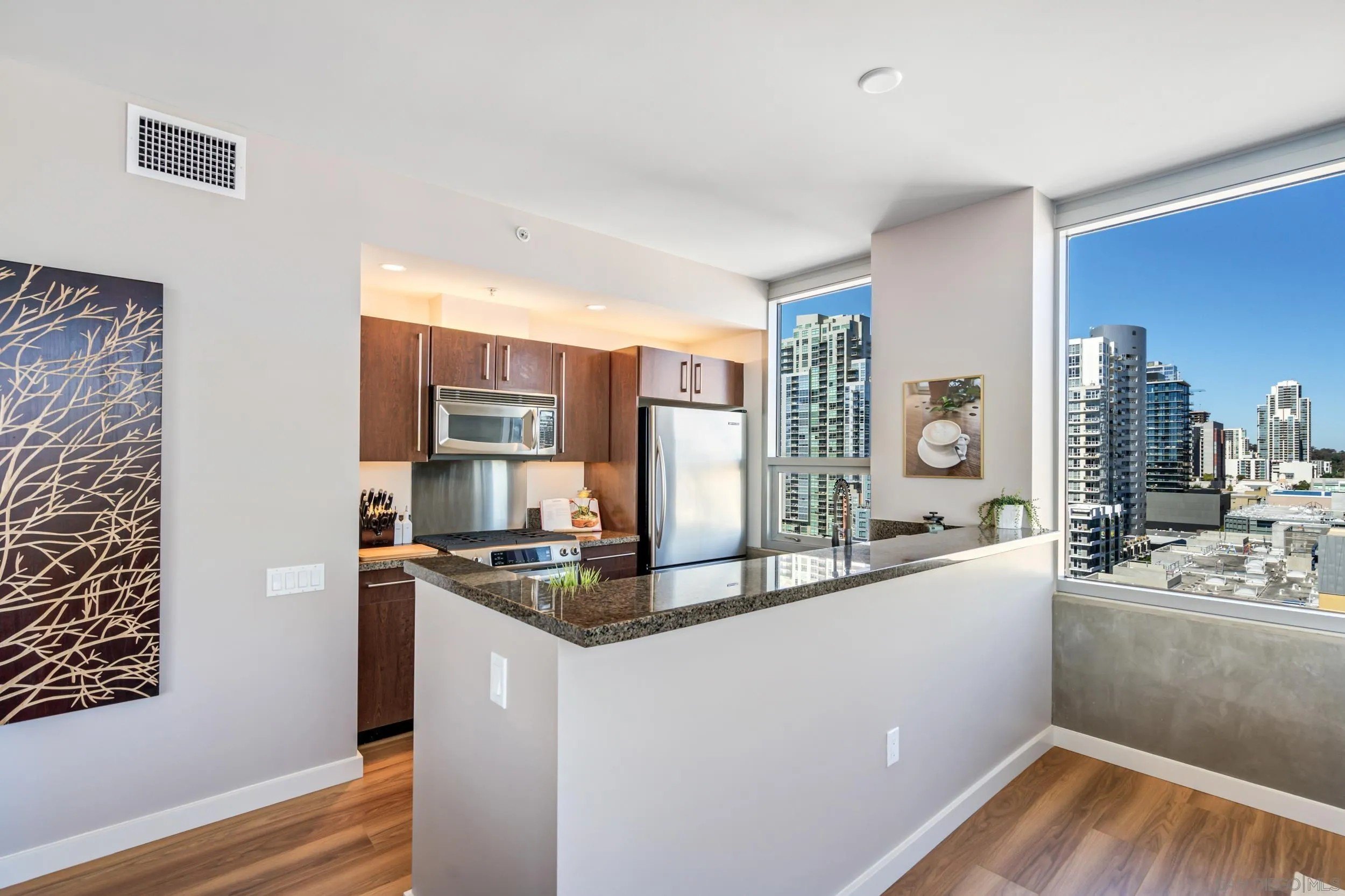 Experience elevated downtown living at ICON, where modern design meets timeless sophistication. This meticulously maintained and upgraded northeast corner residence showcases breathtaking panoramic views of the San Diego Bay, Coronado Bridge, and the sparkling city skyline. Step through the entryway into a light-filled, open-concept floor plan featuring new carpet, wood-look flooring, and fresh designer paint throughout. The gourmet kitchen impresses with stainless steel appliances, sleek granite countertops, and ample cabinetry-perfect for both casual dining and entertaining. The serene primary suite includes a fully built-out closet and a beautifully finished bath with dual vanities. Modern urban comforts include in-unit laundry, two parking spaces, and a private storage unit, providing both convenience and functionality to your downtown lifestyle. ICON is a VA-approved community offering resort-style amenities such as a 24-hour front desk attendant, state-of-the-art fitness center, and the iconic rooftop Skybox terrace with lounge seating, TVs, surround sound, BBQs, heaters, and panoramic city views. Additional amenities include the 5th Inning community recreation room with a full kitchen and business center, a private movie theater, community fireplace, bike and package storage with Amazon lockers, and an interior courtyard featuring sculptural art, a waterfall element, and modern landscaping. Residents also enjoy Google Fiber high-speed internet, on-site property management, and a sleek, contemporary lobby entrance.
