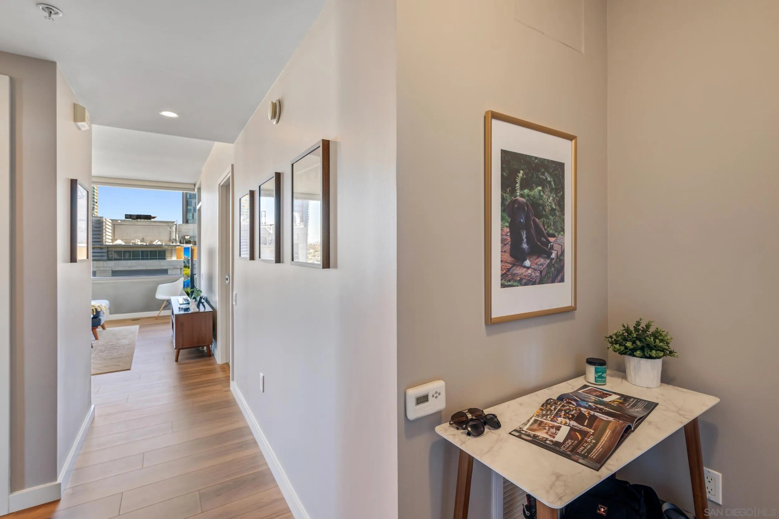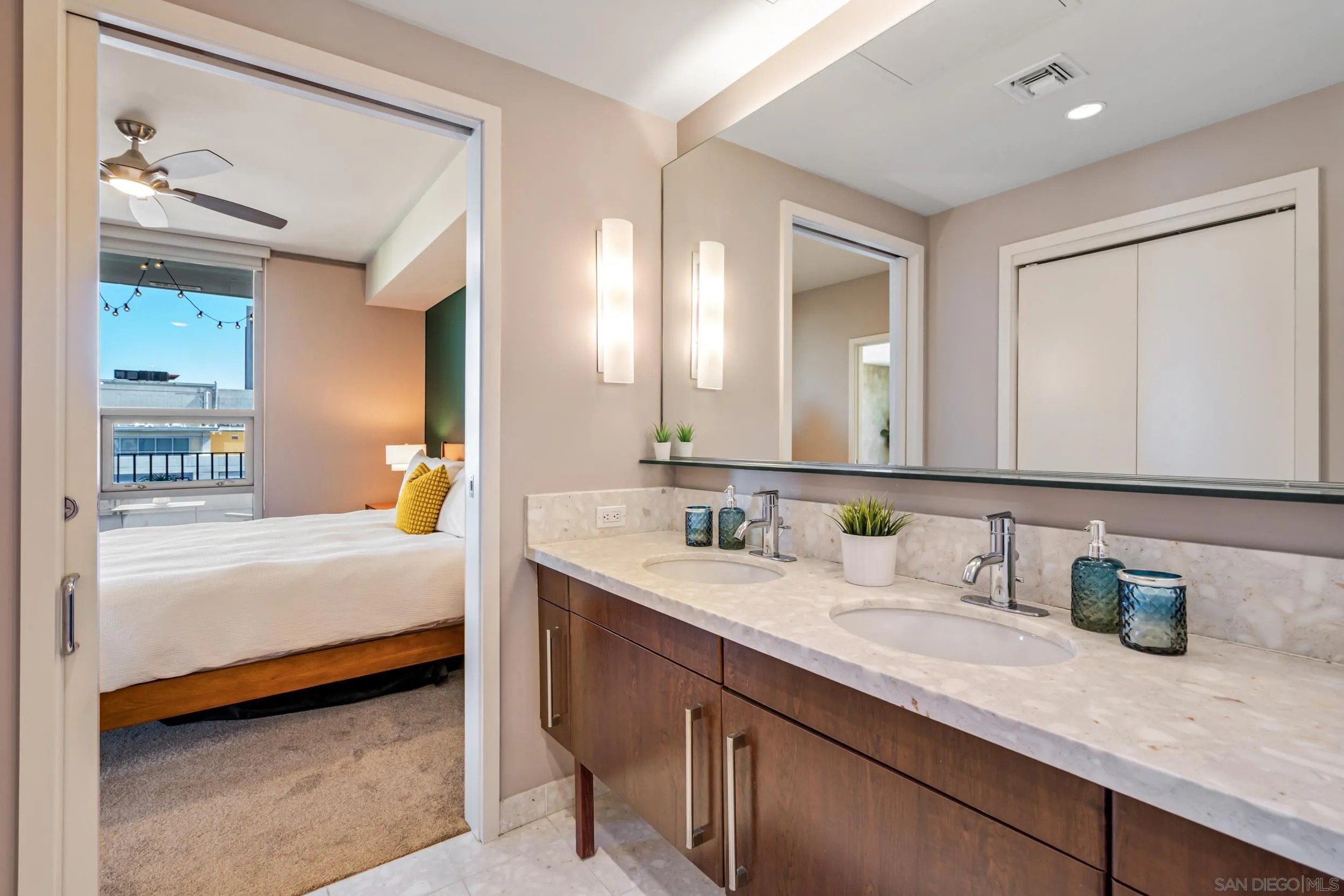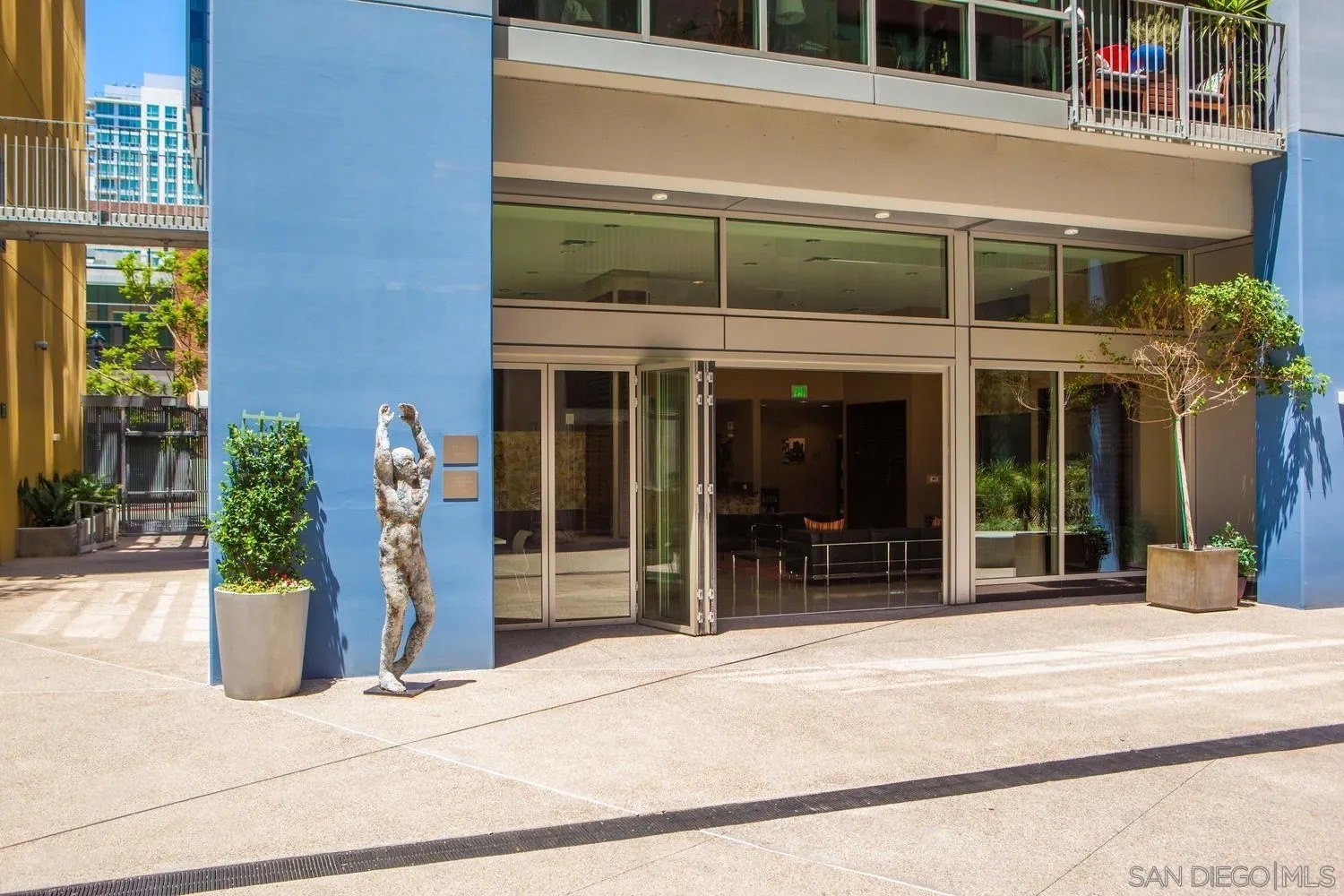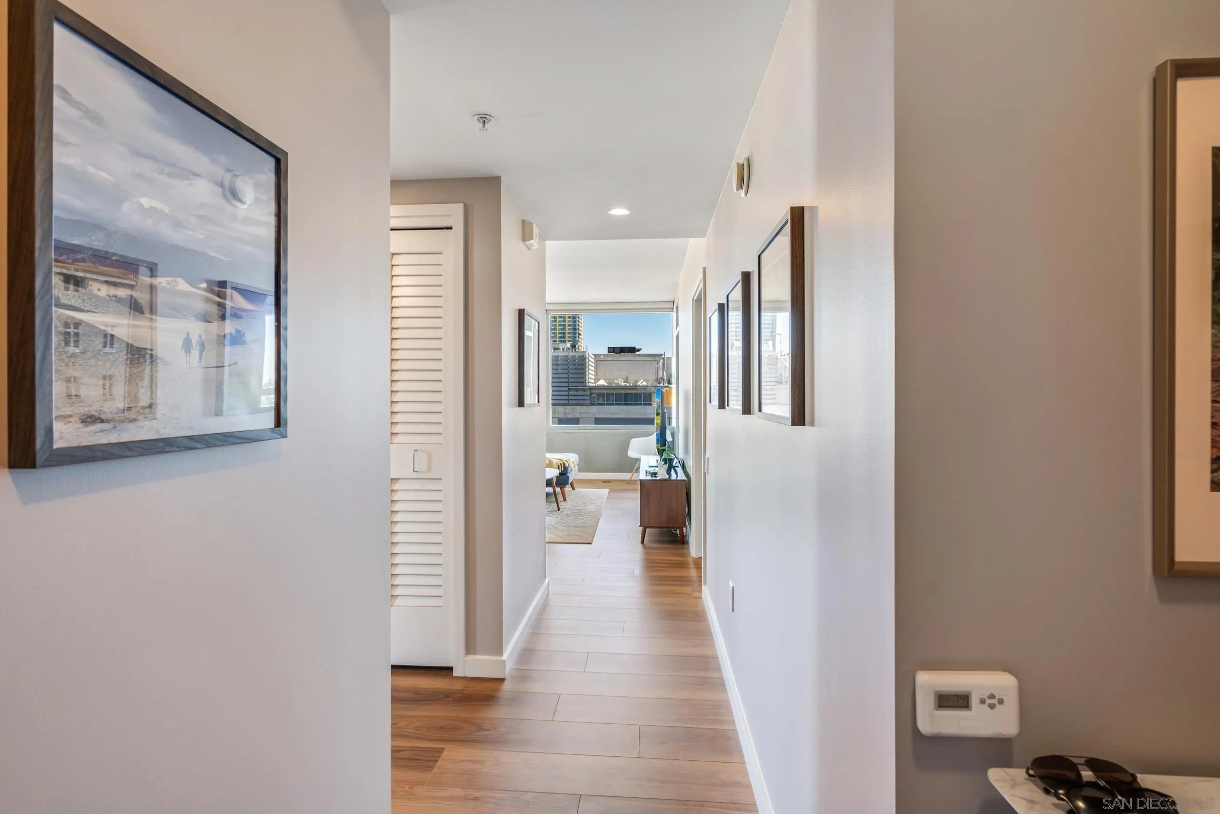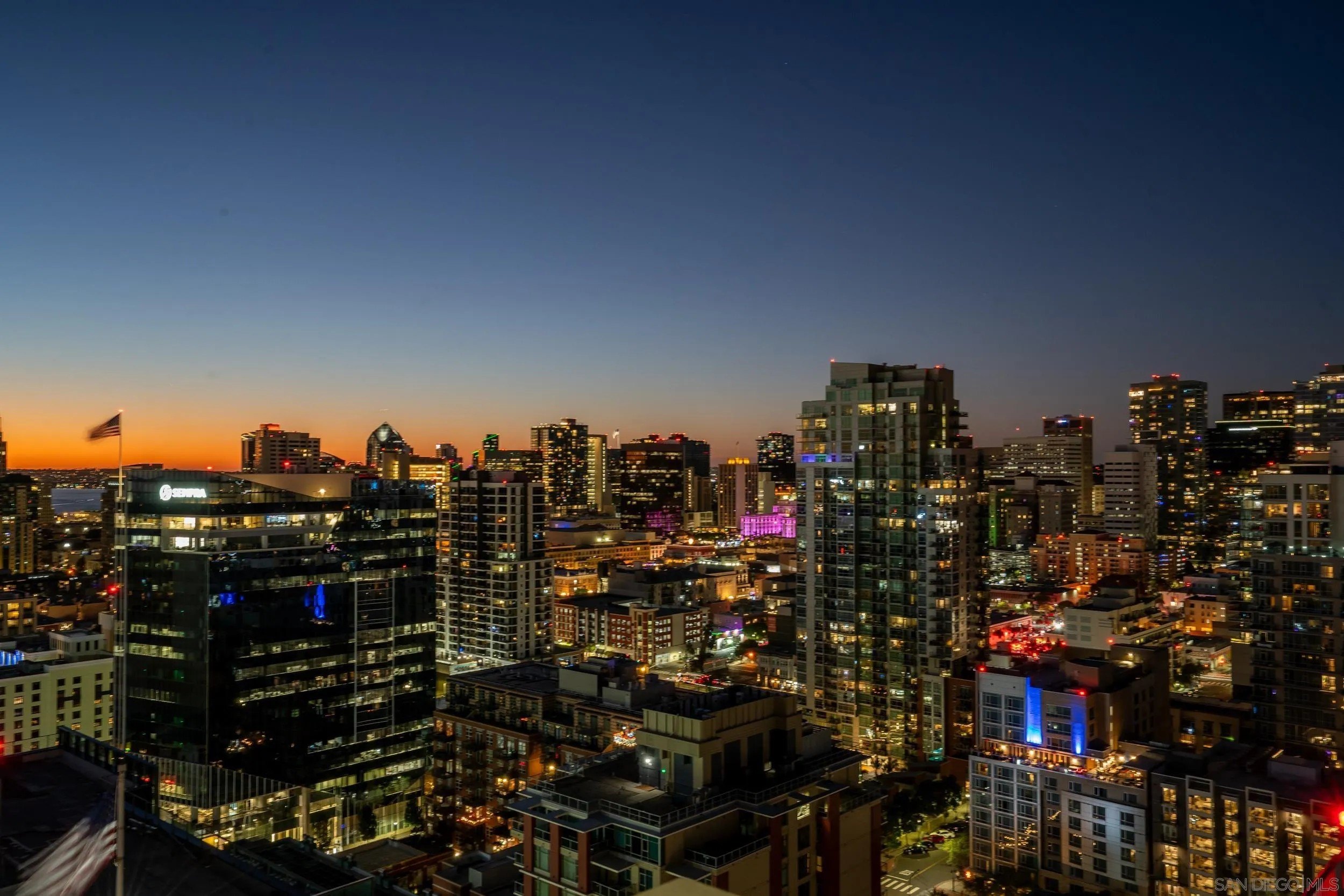 Experience elevated downtown living at ICON, where modern design meets timeless sophistication. This meticulously maintained and upgraded northeast corner residence showcases breathtaking panoramic views of the San Diego Bay, Coronado Bridge, and the sparkling city skyline. Step through the entryway into a light-filled, open-concept floor plan featuring new carpet, wood-look flooring, and fresh designer paint throughout. The gourmet kitchen impresses with stainless steel appliances, sleek granite countertops, and ample cabinetry-perfect for both casual dining and entertaining. The serene primary suite includes a fully built-out closet and a beautifully finished bath with dual vanities. Modern urban comforts include in-unit laundry, two parking spaces, and a private storage unit, providing both convenience and functionality to your downtown lifestyle. ICON is a VA-approved community offering resort-style amenities such as a 24-hour front desk attendant, state-of-the-art fitness center, and the iconic rooftop Skybox terrace with lounge seating, TVs, surround sound, BBQs, heaters, and panoramic city views. Additional amenities include the 5th Inning community recreation room with a full kitchen and business center, a private movie theater, community fireplace, bike and package storage with Amazon lockers, and an interior courtyard featuring sculptural art, a waterfall element, and modern landscaping. Residents also enjoy Google Fiber high-speed internet, on-site property management, and a sleek, contemporary lobby entrance.