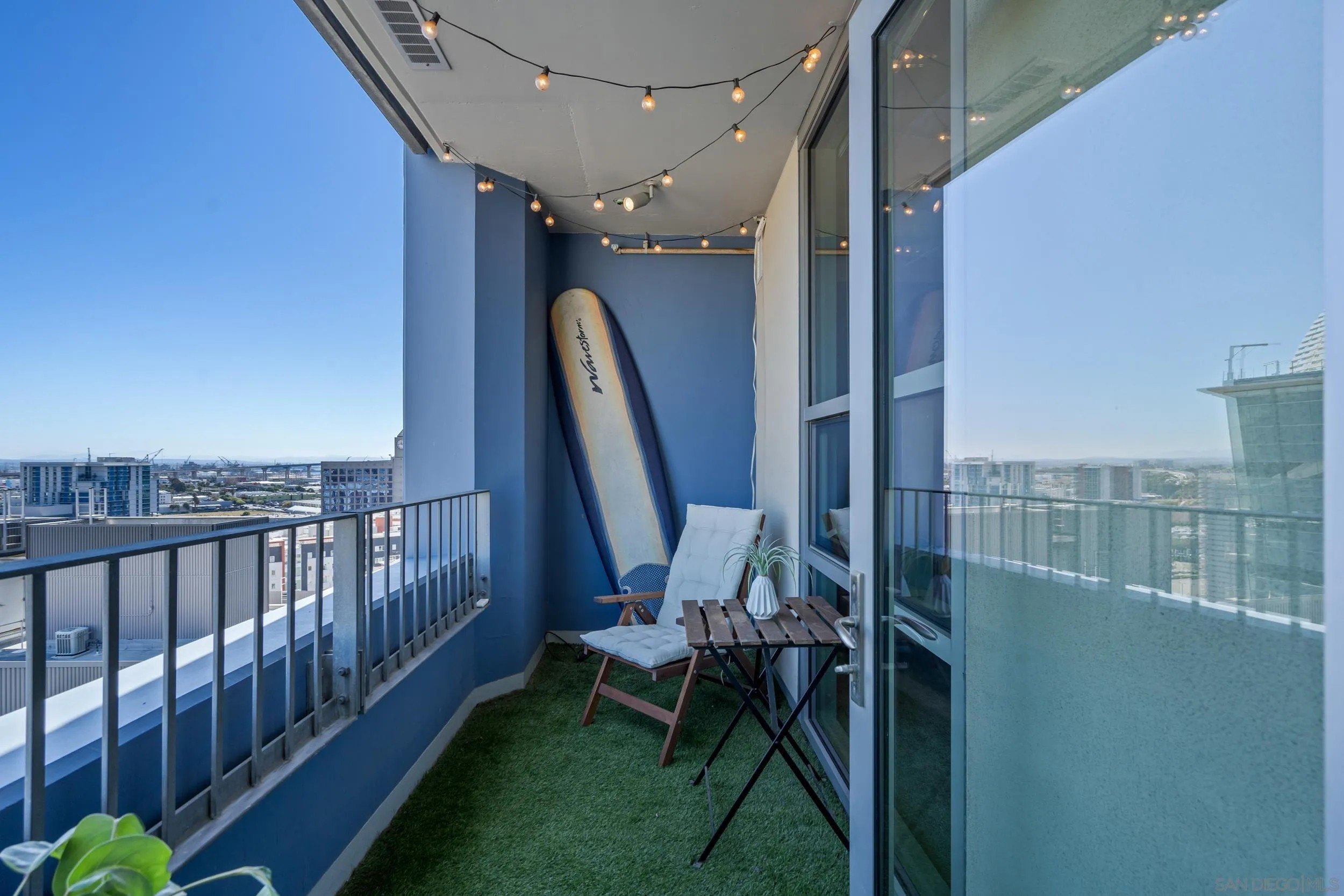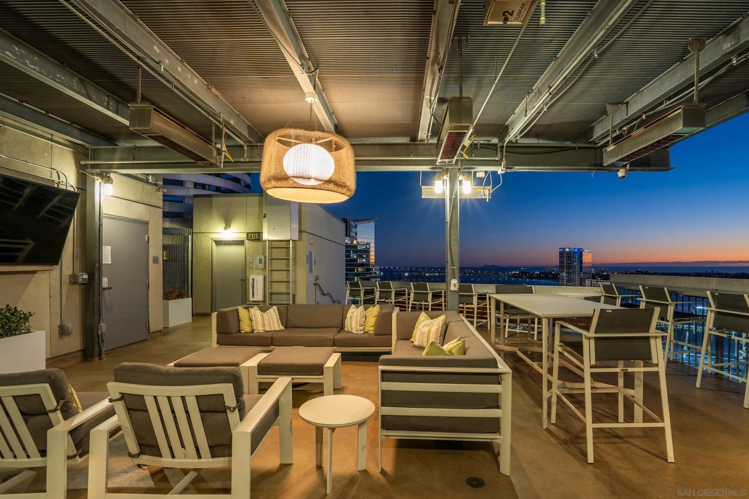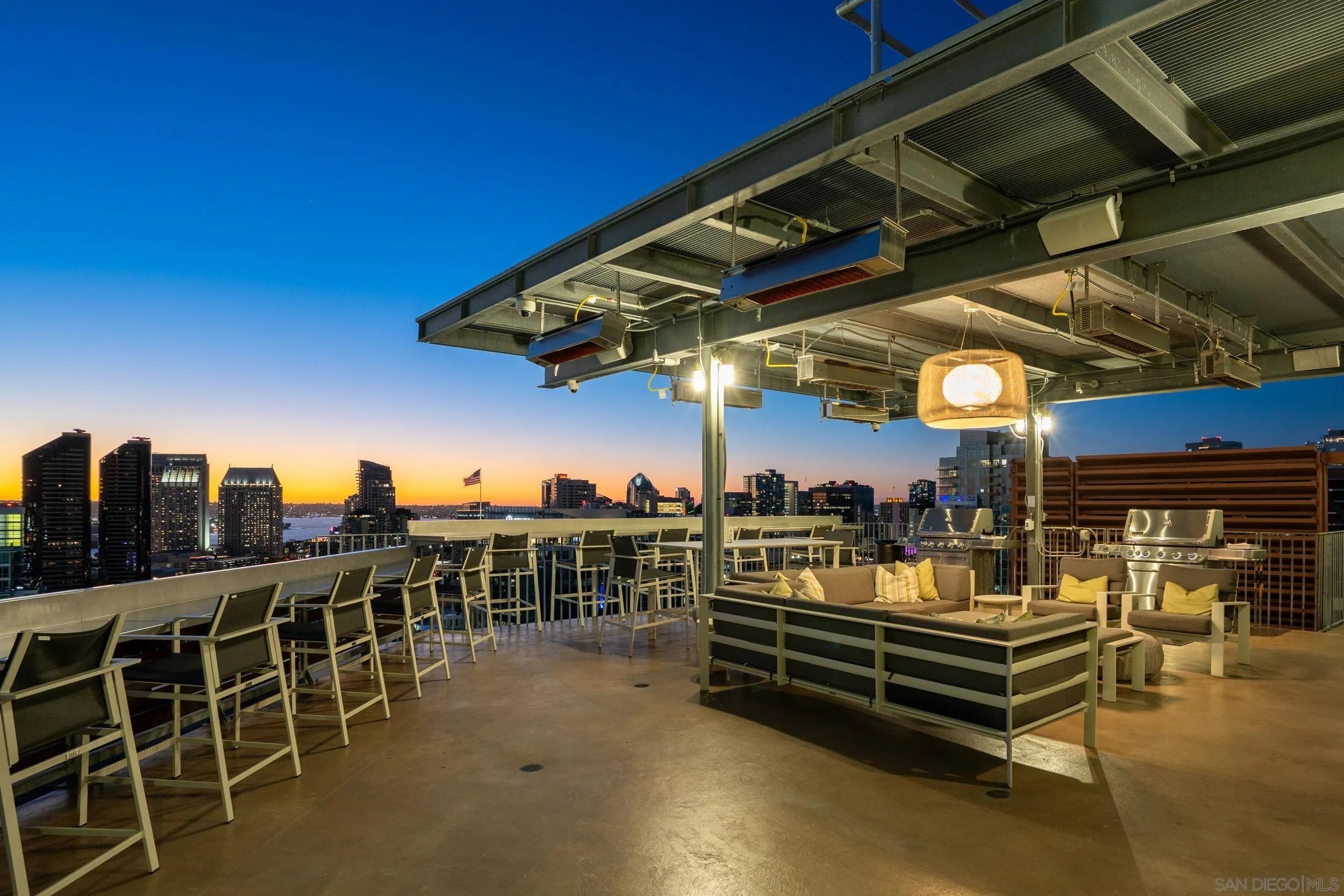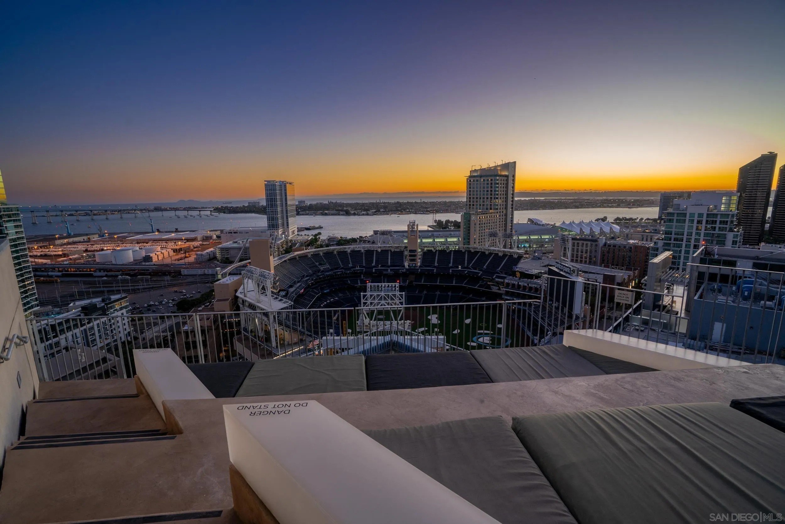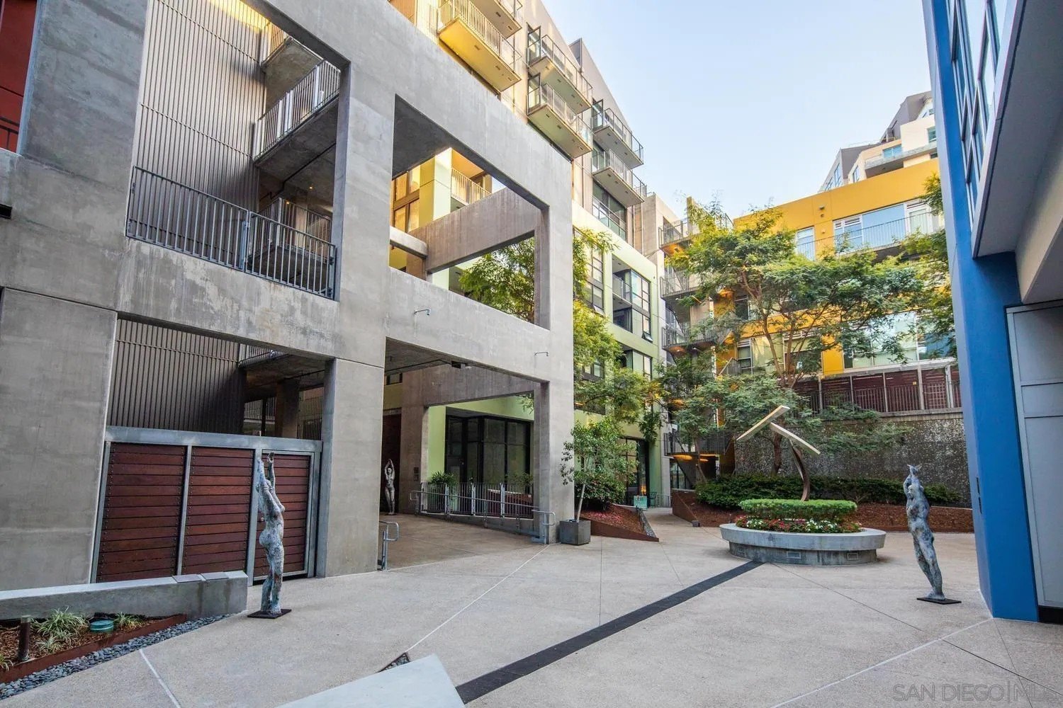 Experience elevated downtown living at ICON, where modern design meets timeless sophistication. This meticulously maintained and upgraded northeast corner residence showcases breathtaking panoramic views of the San Diego Bay, Coronado Bridge, and the sparkling city skyline. Step through the entryway into a light-filled, open-concept floor plan featuring new carpet, wood-look flooring, and fresh designer paint throughout. The gourmet kitchen impresses with stainless steel appliances, sleek granite countertops, and ample cabinetry-perfect for both casual dining and entertaining. The serene primary suite includes a fully built-out closet and a beautifully finished bath with dual vanities. Modern urban comforts include in-unit laundry, two parking spaces, and a private storage unit, providing both convenience and functionality to your downtown lifestyle. ICON is a VA-approved community offering resort-style amenities such as a 24-hour front desk attendant, state-of-the-art fitness center, and the iconic rooftop Skybox terrace with lounge seating, TVs, surround sound, BBQs, heaters, and panoramic city views. Additional amenities include the 5th Inning community recreation room with a full kitchen and business center, a private movie theater, community fireplace, bike and package storage with Amazon lockers, and an interior courtyard featuring sculptural art, a waterfall element, and modern landscaping. Residents also enjoy Google Fiber high-speed internet, on-site property management, and a sleek, contemporary lobby entrance.
