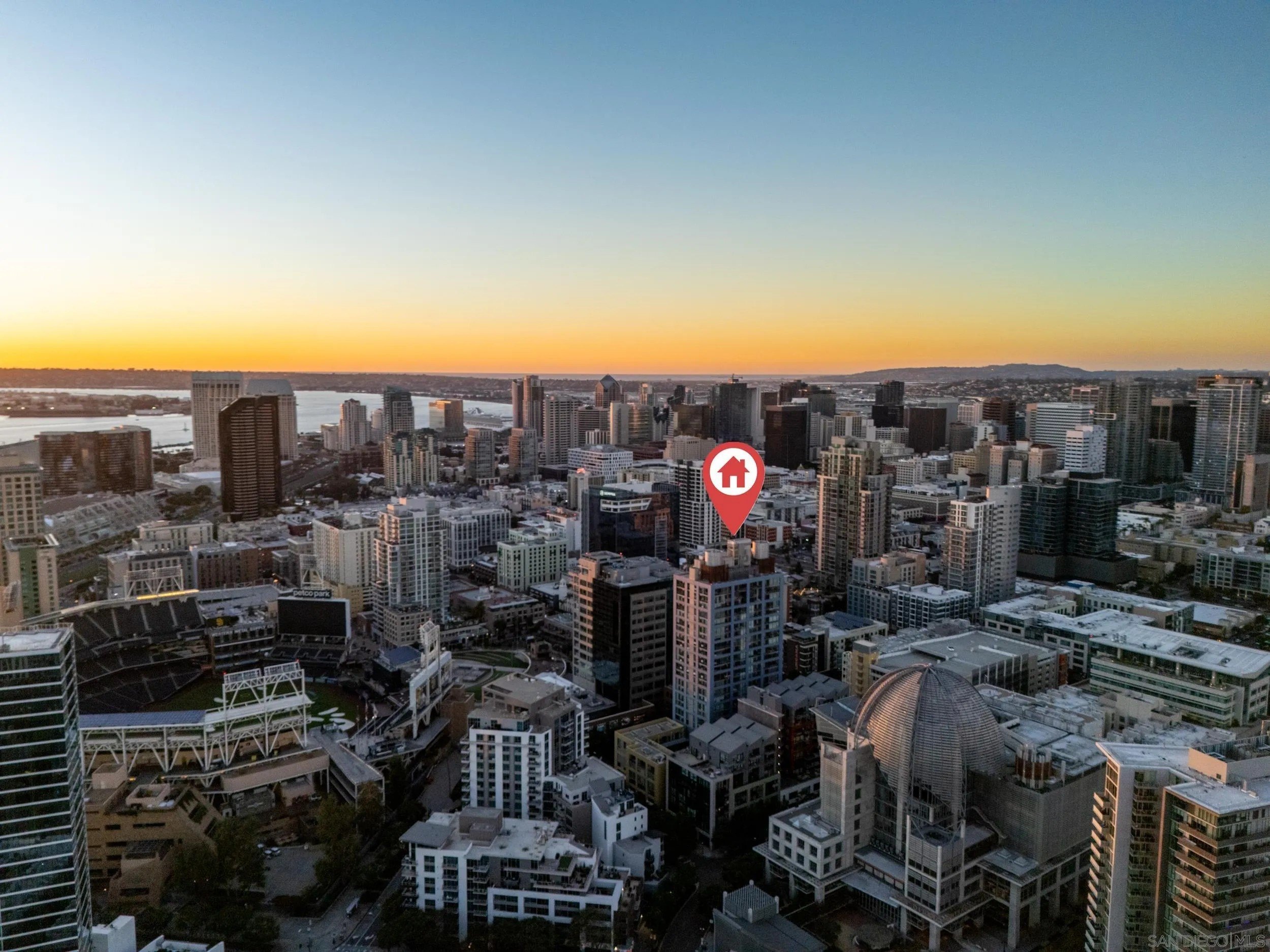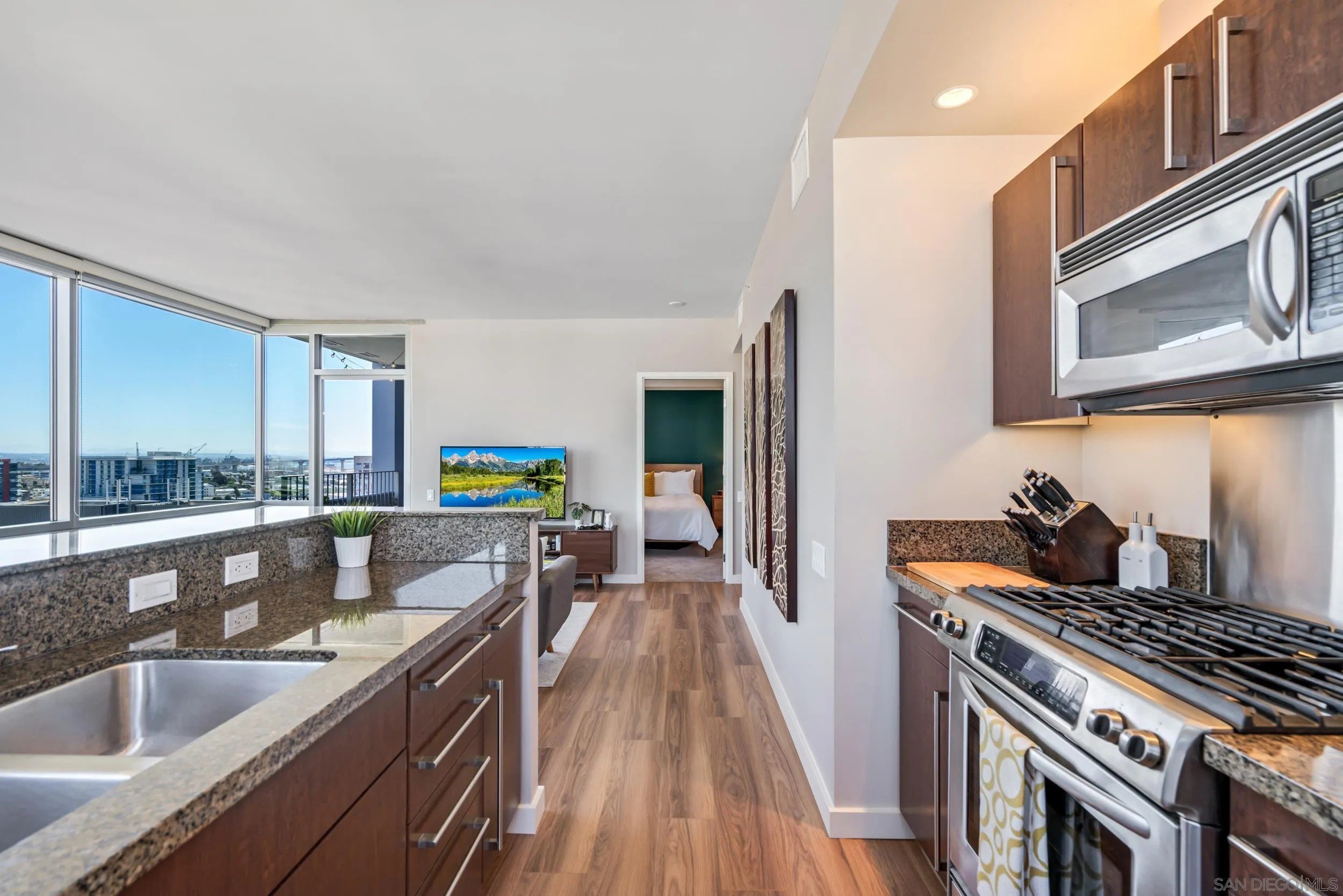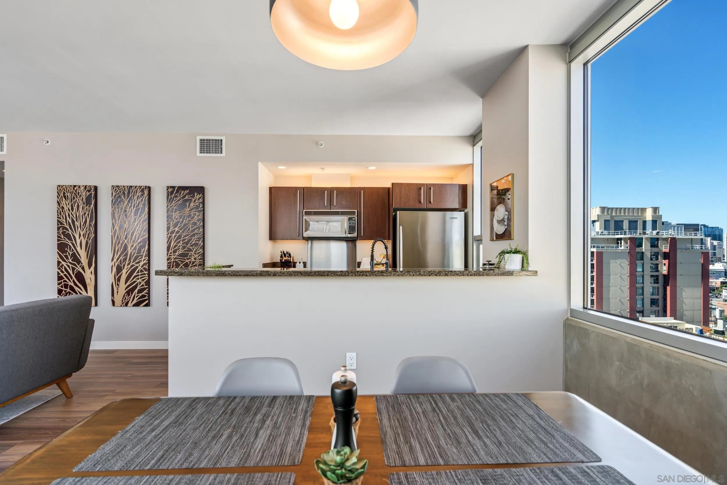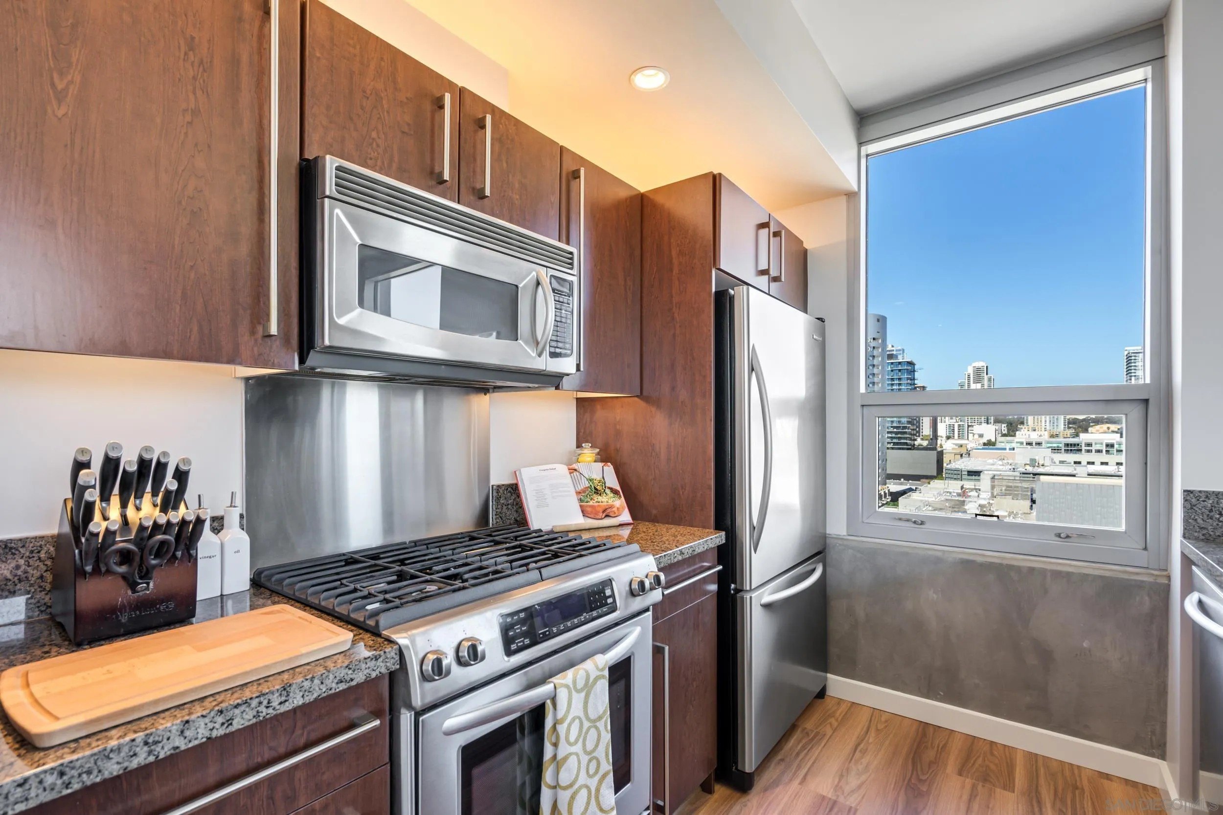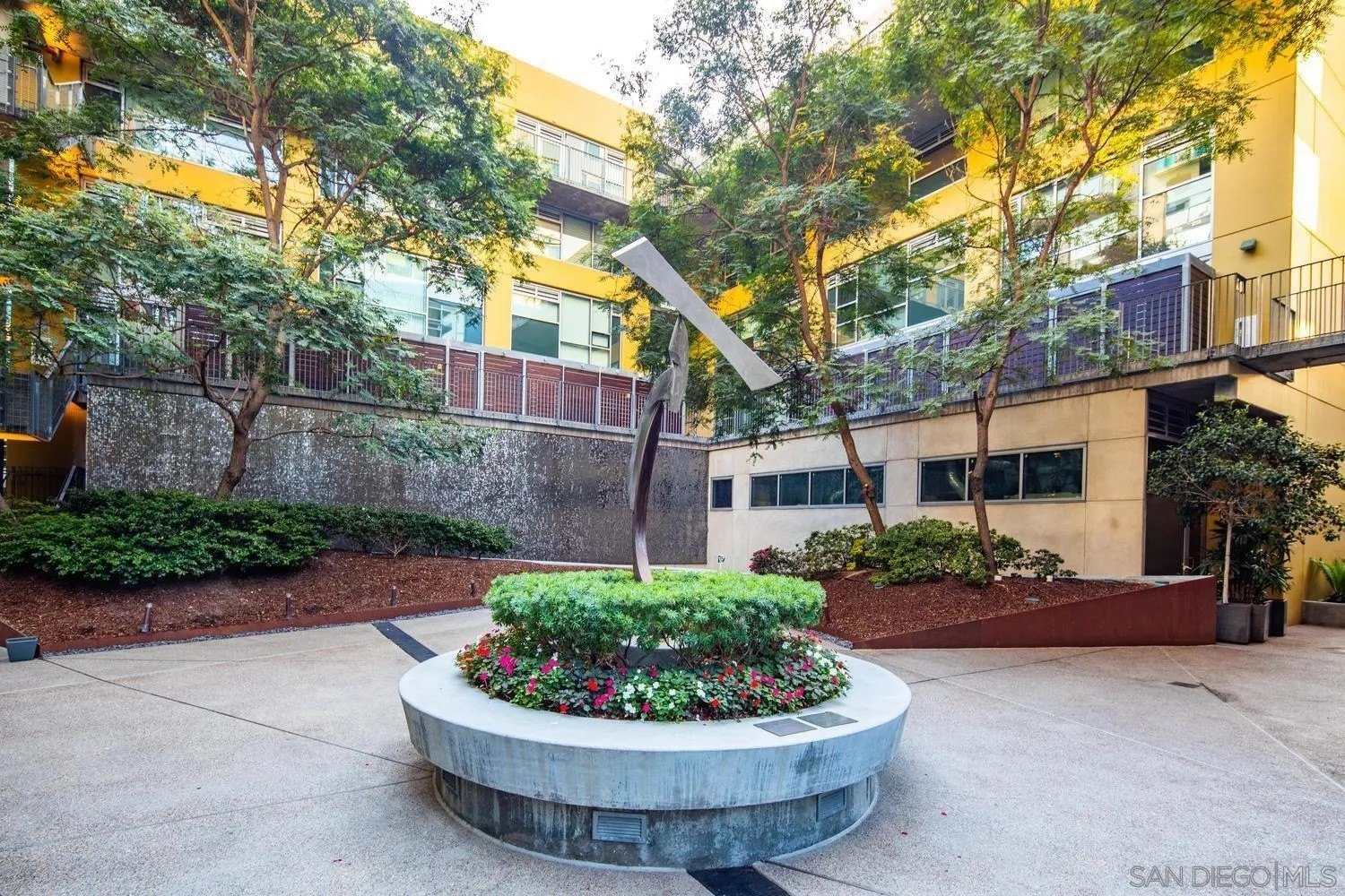 Experience elevated downtown living at ICON, where modern design meets timeless sophistication. This meticulously maintained and upgraded northeast corner residence showcases breathtaking panoramic views of the San Diego Bay, Coronado Bridge, and the sparkling city skyline. Step through the entryway into a light-filled, open-concept floor plan featuring new carpet, wood-look flooring, and fresh designer paint throughout. The gourmet kitchen impresses with stainless steel appliances, sleek granite countertops, and ample cabinetry-perfect for both casual dining and entertaining. The serene primary suite includes a fully built-out closet and a beautifully finished bath with dual vanities. Modern urban comforts include in-unit laundry, two parking spaces, and a private storage unit, providing both convenience and functionality to your downtown lifestyle. ICON is a VA-approved community offering resort-style amenities such as a 24-hour front desk attendant, state-of-the-art fitness center, and the iconic rooftop Skybox terrace with lounge seating, TVs, surround sound, BBQs, heaters, and panoramic city views. Additional amenities include the 5th Inning community recreation room with a full kitchen and business center, a private movie theater, community fireplace, bike and package storage with Amazon lockers, and an interior courtyard featuring sculptural art, a waterfall element, and modern landscaping. Residents also enjoy Google Fiber high-speed internet, on-site property management, and a sleek, contemporary lobby entrance.