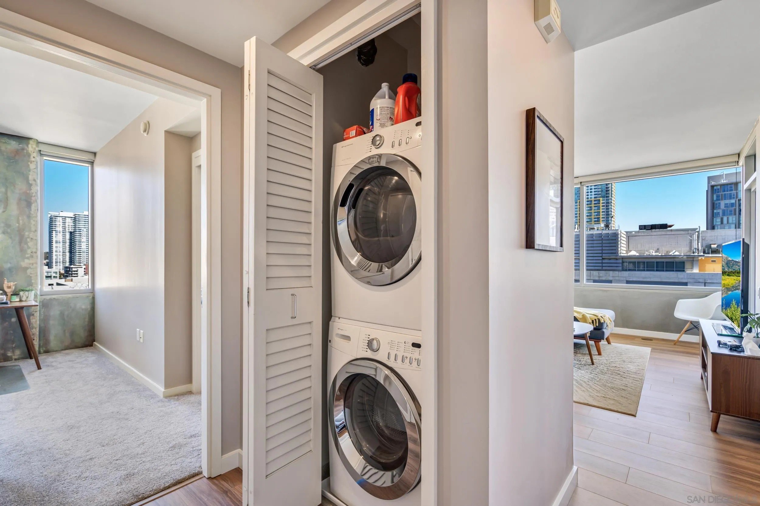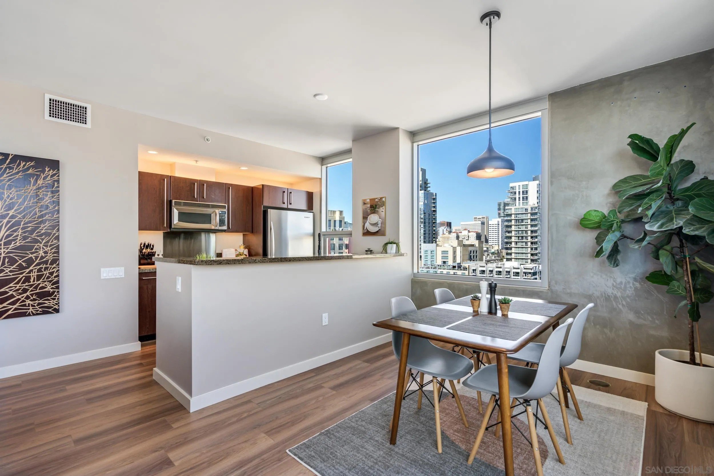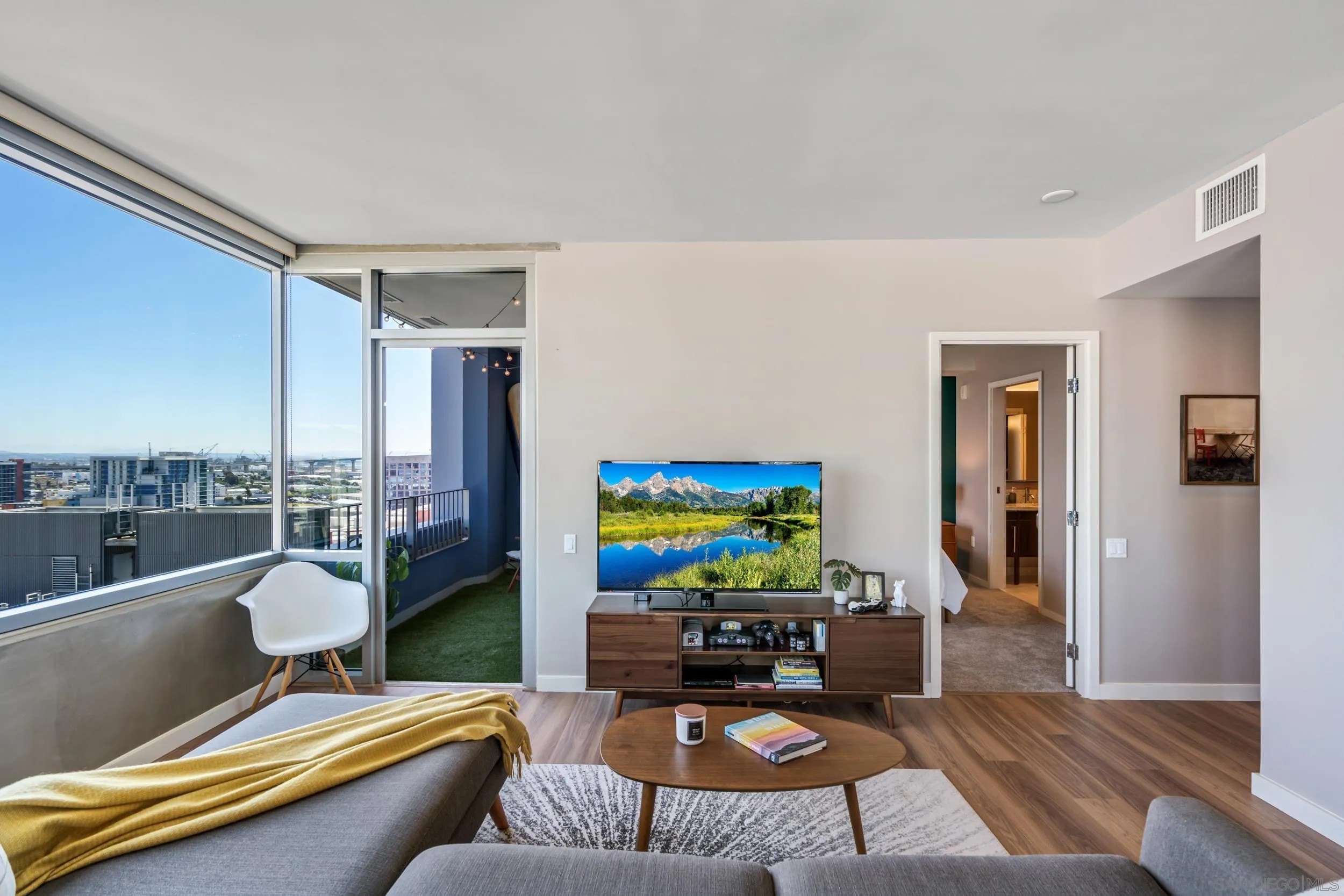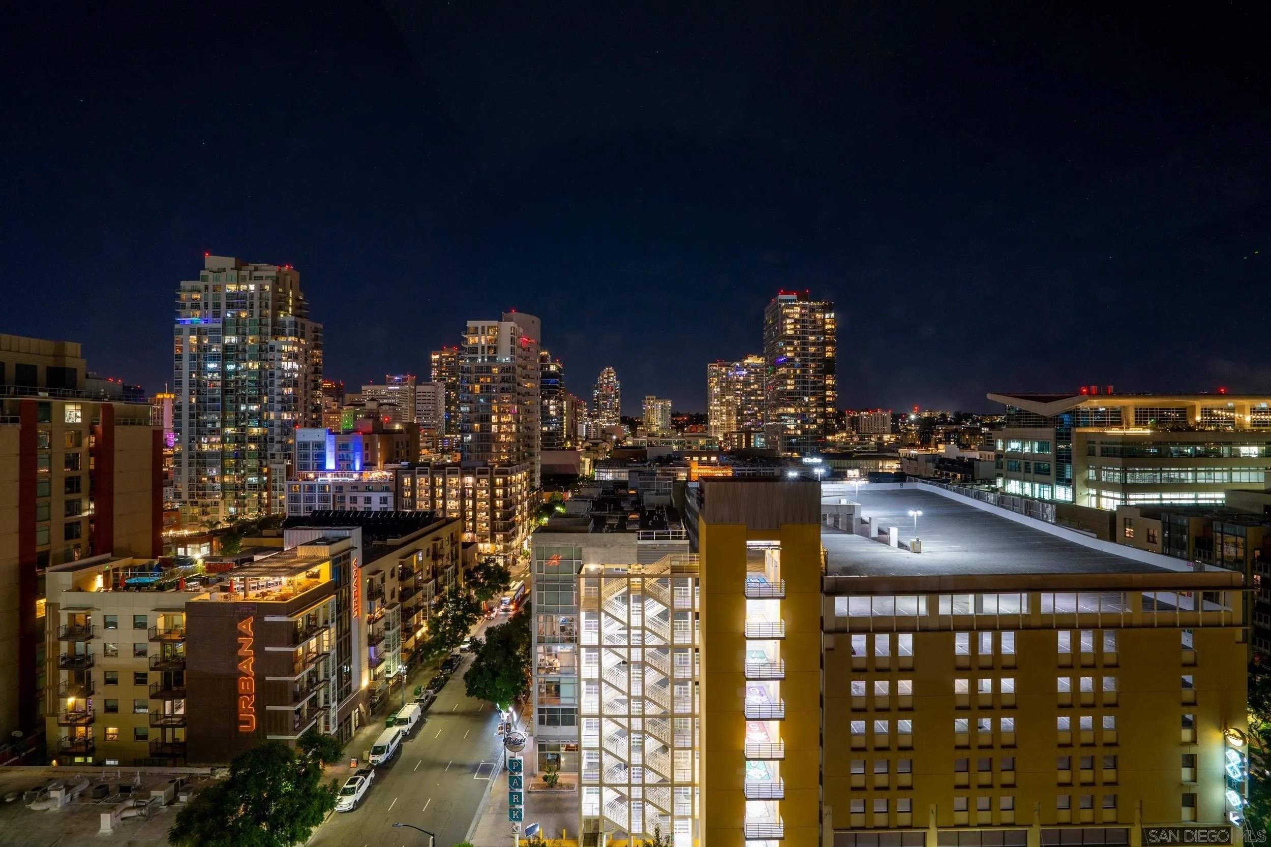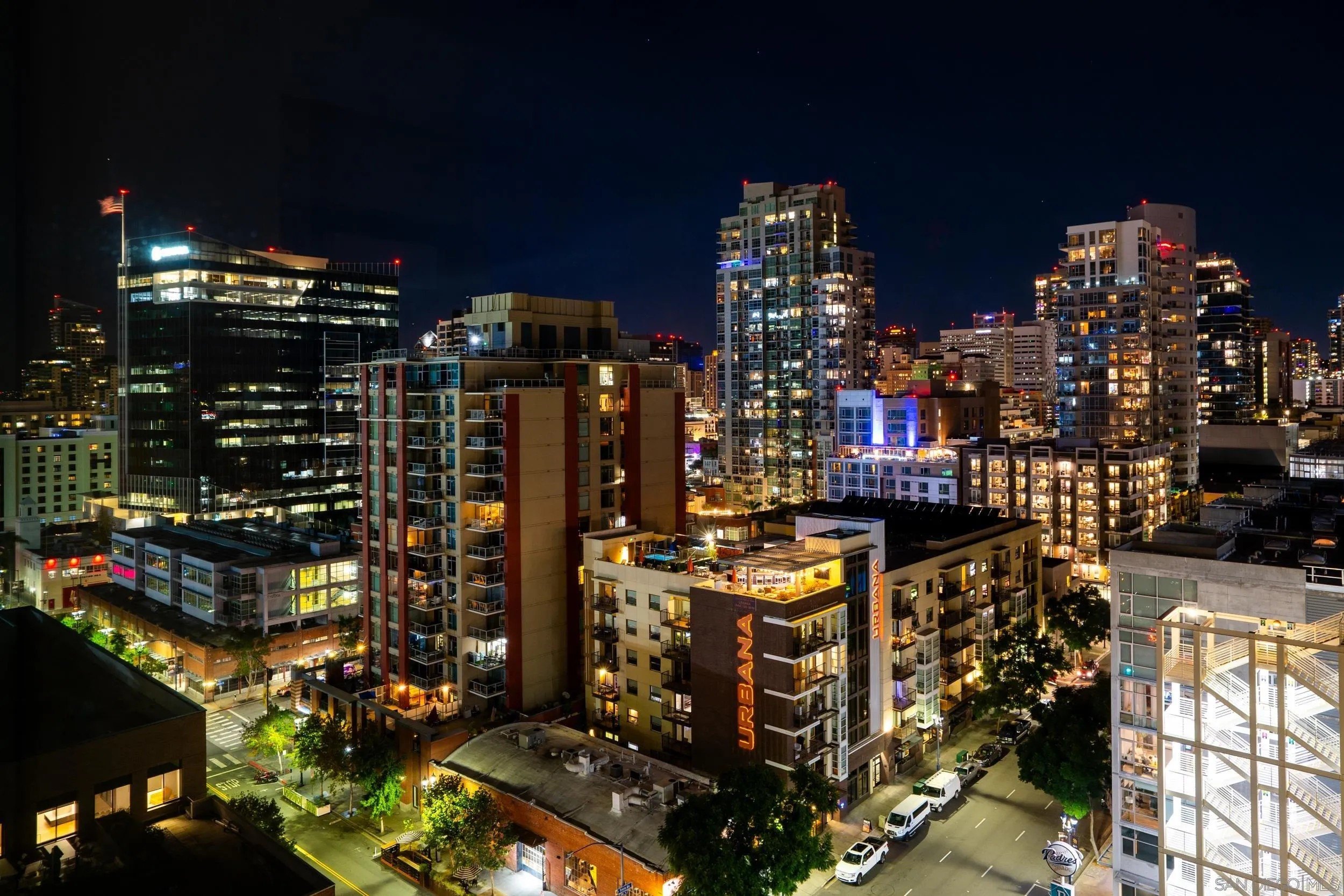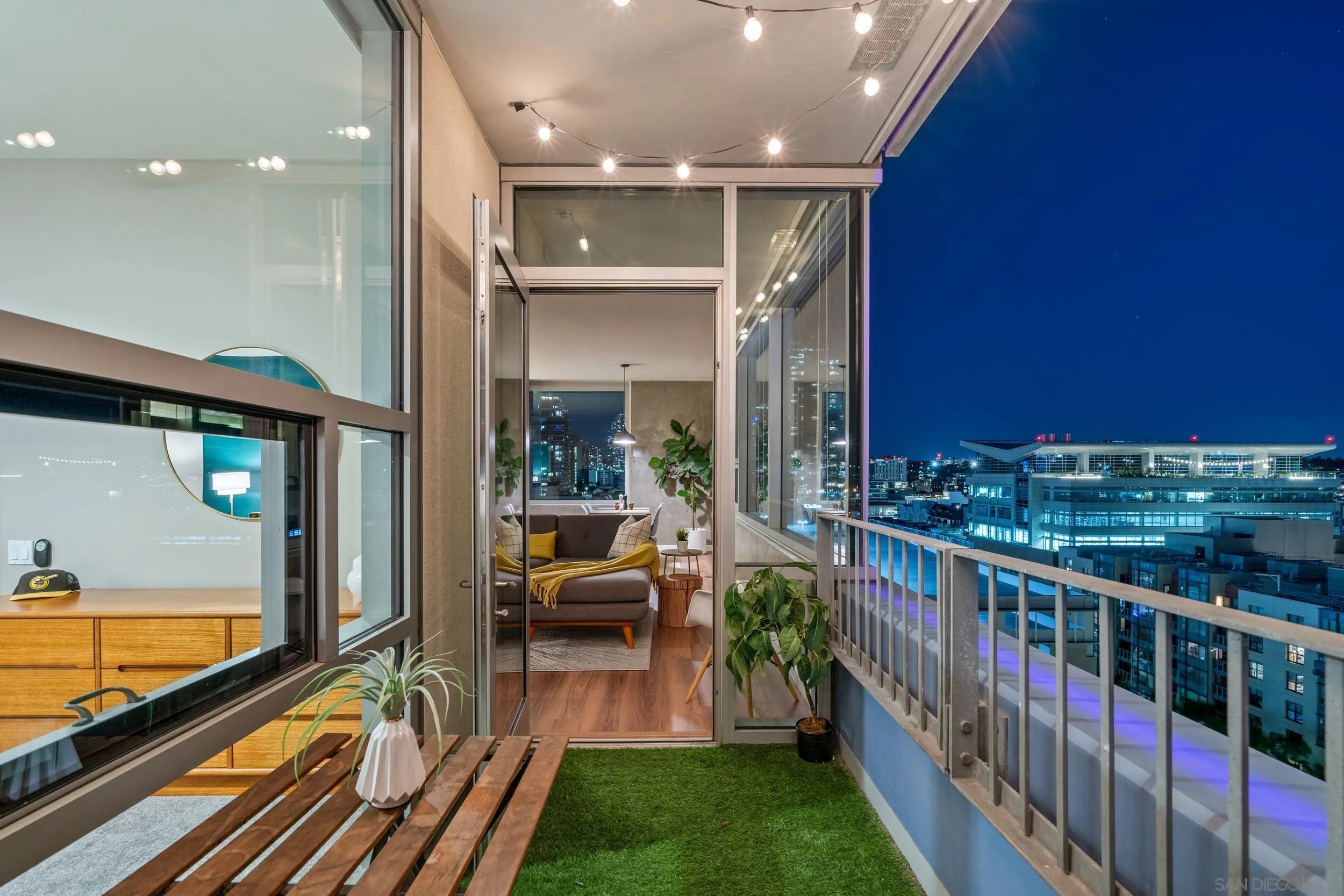 Experience elevated downtown living at ICON, where modern design meets timeless sophistication. This meticulously maintained and upgraded northeast corner residence showcases breathtaking panoramic views of the San Diego Bay, Coronado Bridge, and the sparkling city skyline. Step through the entryway into a light-filled, open-concept floor plan featuring new carpet, wood-look flooring, and fresh designer paint throughout. The gourmet kitchen impresses with stainless steel appliances, sleek granite countertops, and ample cabinetry-perfect for both casual dining and entertaining. The serene primary suite includes a fully built-out closet and a beautifully finished bath with dual vanities. Modern urban comforts include in-unit laundry, two parking spaces, and a private storage unit, providing both convenience and functionality to your downtown lifestyle. ICON is a VA-approved community offering resort-style amenities such as a 24-hour front desk attendant, state-of-the-art fitness center, and the iconic rooftop Skybox terrace with lounge seating, TVs, surround sound, BBQs, heaters, and panoramic city views. Additional amenities include the 5th Inning community recreation room with a full kitchen and business center, a private movie theater, community fireplace, bike and package storage with Amazon lockers, and an interior courtyard featuring sculptural art, a waterfall element, and modern landscaping. Residents also enjoy Google Fiber high-speed internet, on-site property management, and a sleek, contemporary lobby entrance.