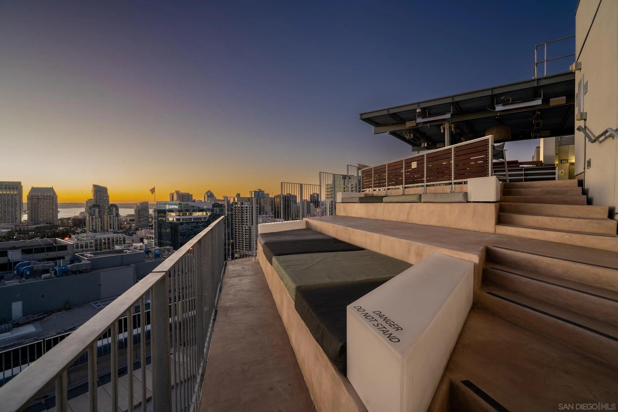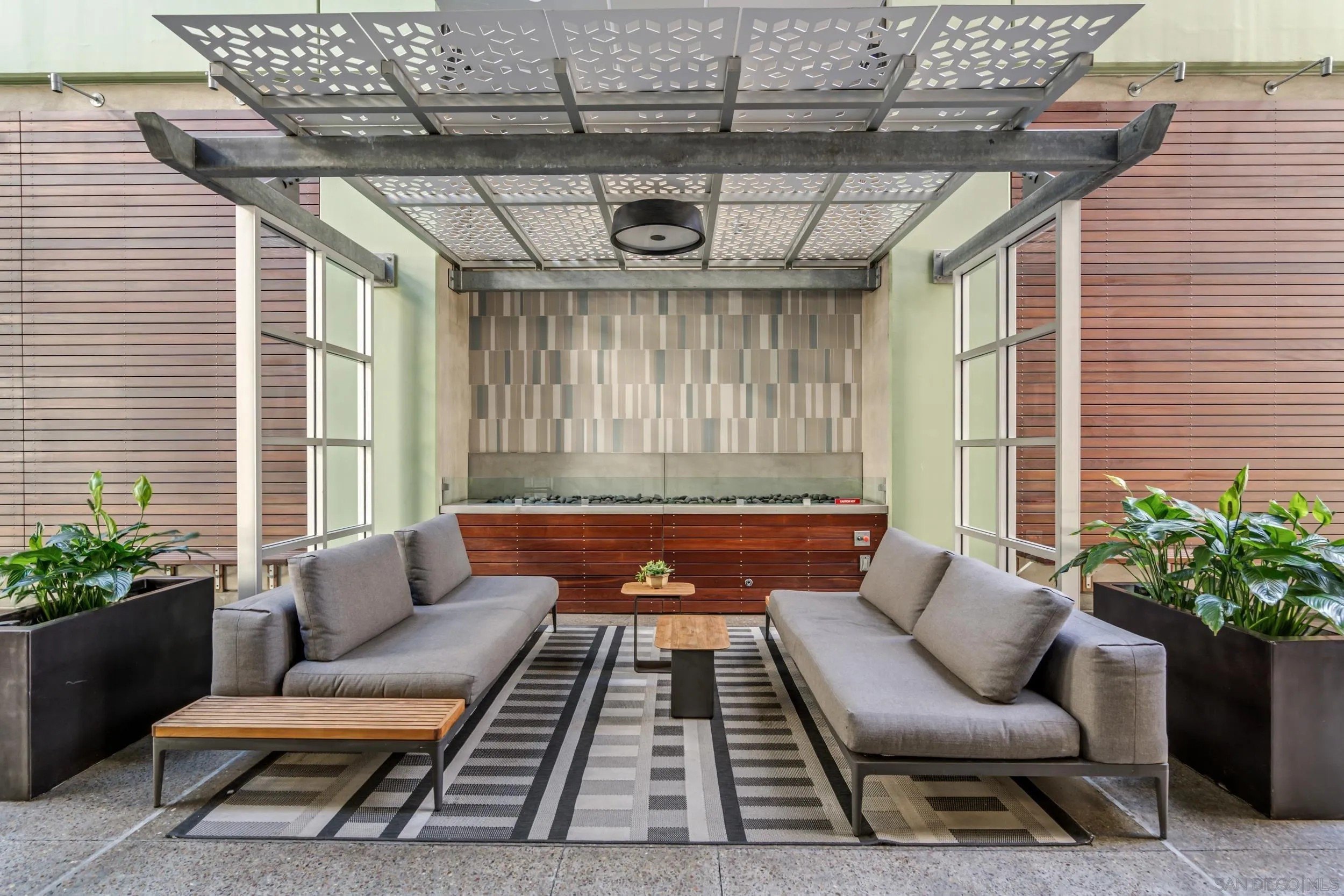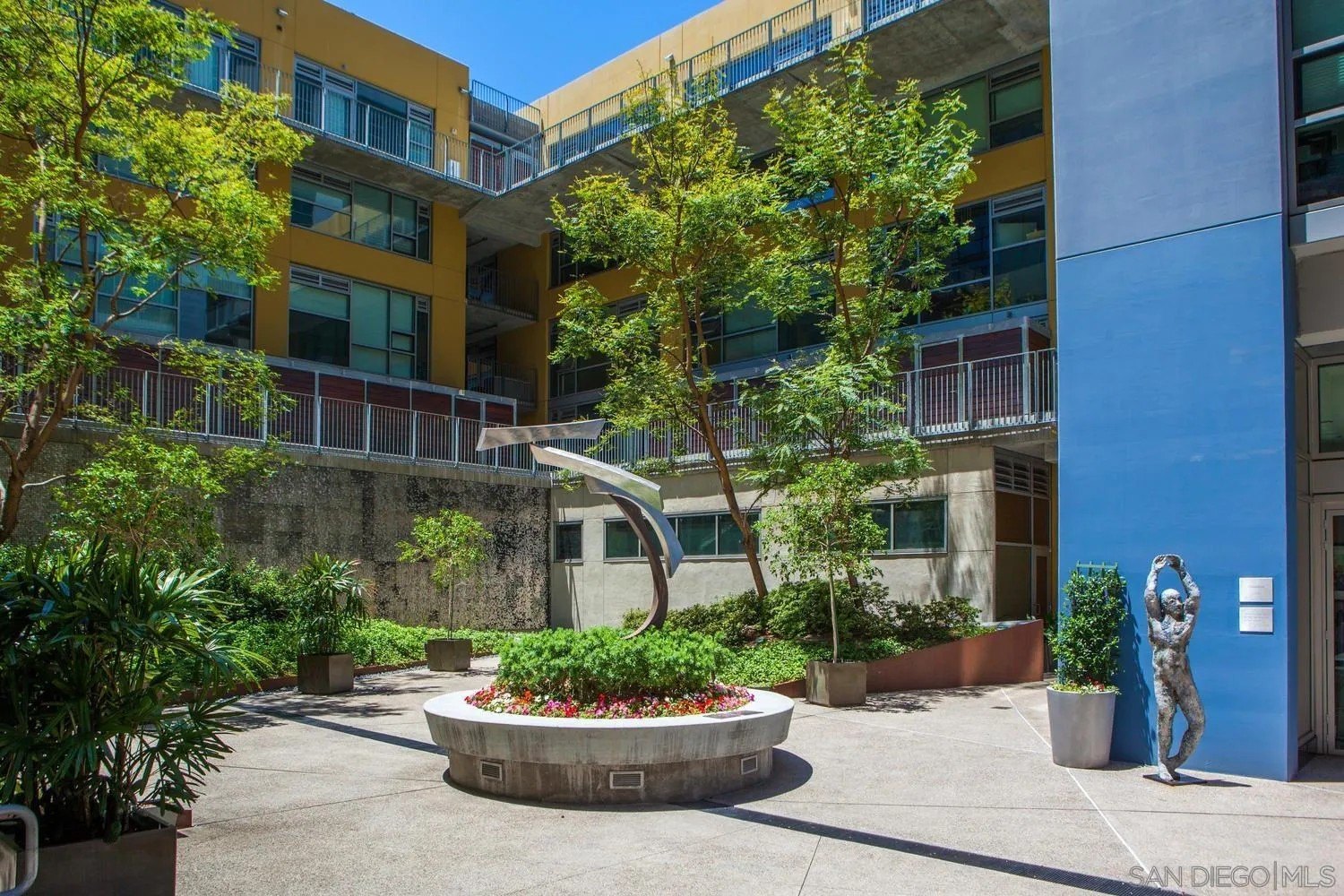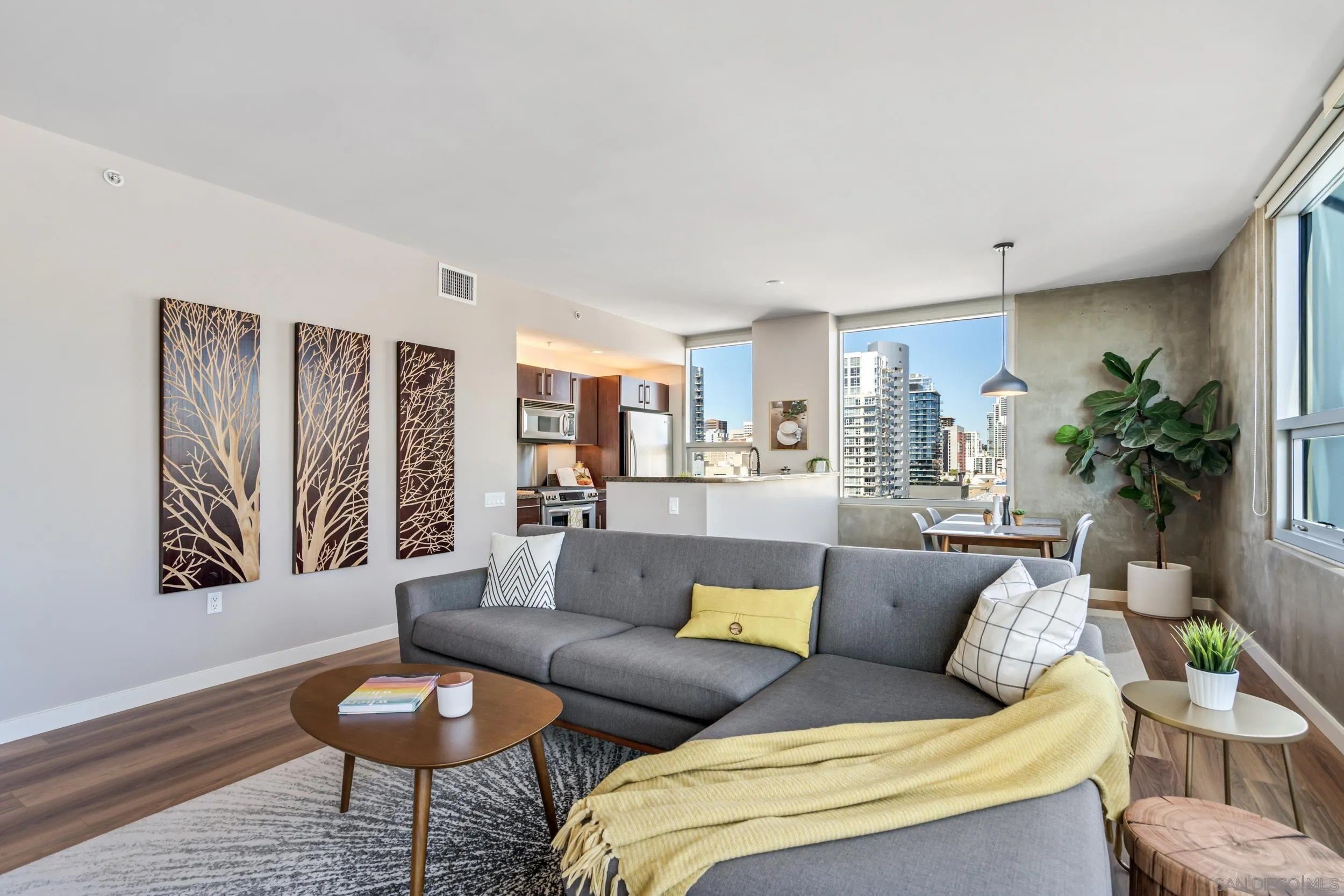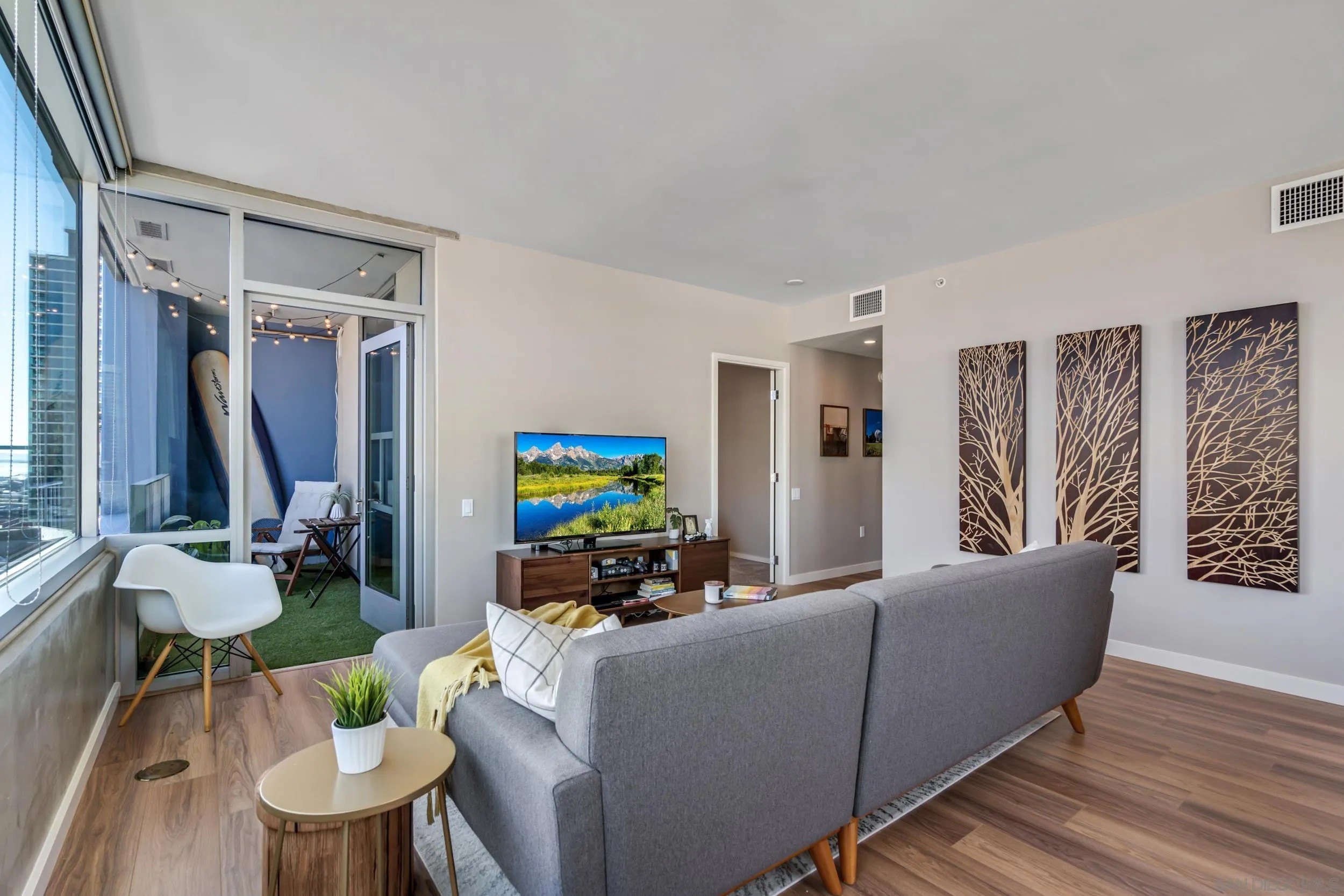 Experience elevated downtown living at ICON, where modern design meets timeless sophistication. This meticulously maintained and upgraded northeast corner residence showcases breathtaking panoramic views of the San Diego Bay, Coronado Bridge, and the sparkling city skyline. Step through the entryway into a light-filled, open-concept floor plan featuring new carpet, wood-look flooring, and fresh designer paint throughout. The gourmet kitchen impresses with stainless steel appliances, sleek granite countertops, and ample cabinetry-perfect for both casual dining and entertaining. The serene primary suite includes a fully built-out closet and a beautifully finished bath with dual vanities. Modern urban comforts include in-unit laundry, two parking spaces, and a private storage unit, providing both convenience and functionality to your downtown lifestyle. ICON is a VA-approved community offering resort-style amenities such as a 24-hour front desk attendant, state-of-the-art fitness center, and the iconic rooftop Skybox terrace with lounge seating, TVs, surround sound, BBQs, heaters, and panoramic city views. Additional amenities include the 5th Inning community recreation room with a full kitchen and business center, a private movie theater, community fireplace, bike and package storage with Amazon lockers, and an interior courtyard featuring sculptural art, a waterfall element, and modern landscaping. Residents also enjoy Google Fiber high-speed internet, on-site property management, and a sleek, contemporary lobby entrance.