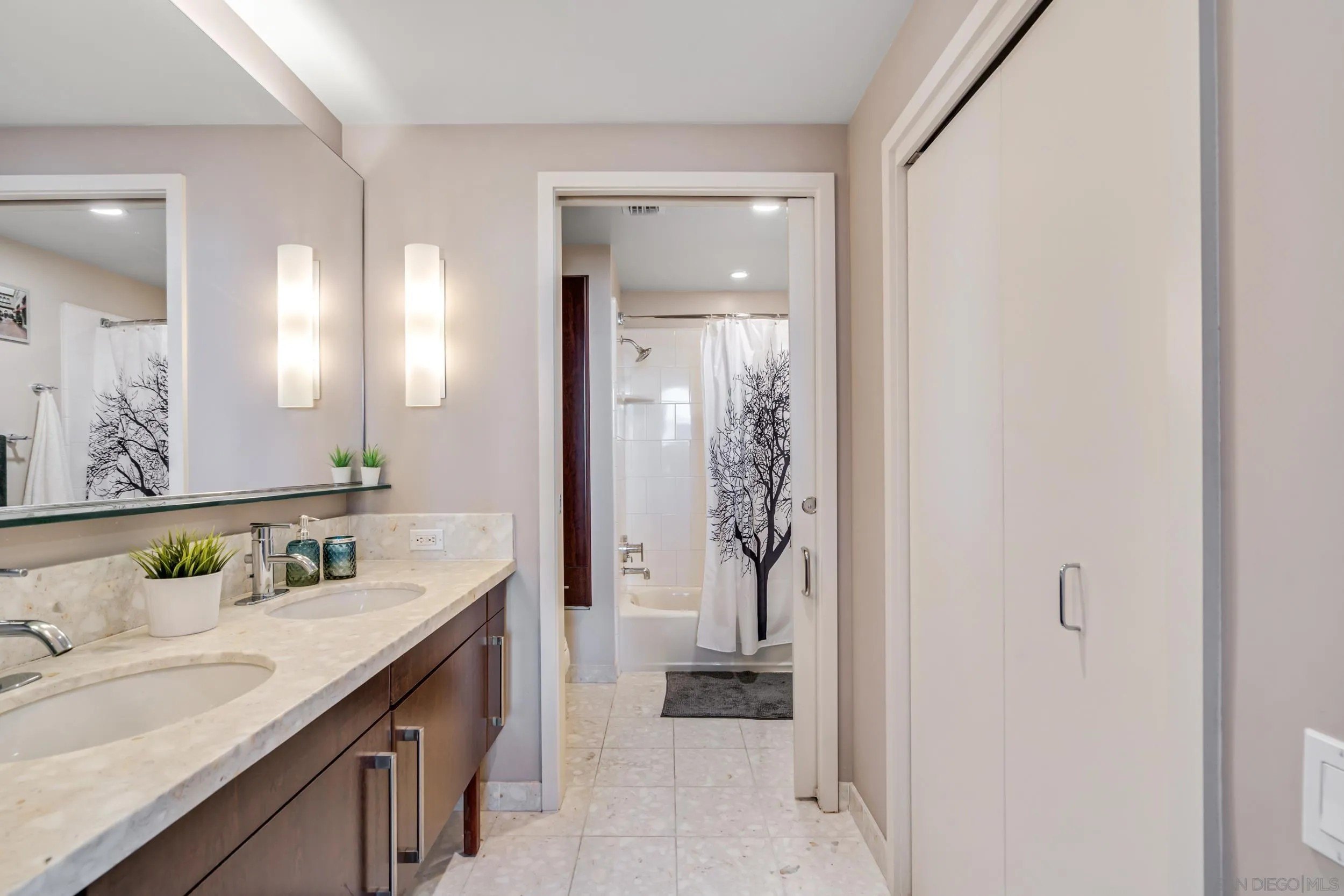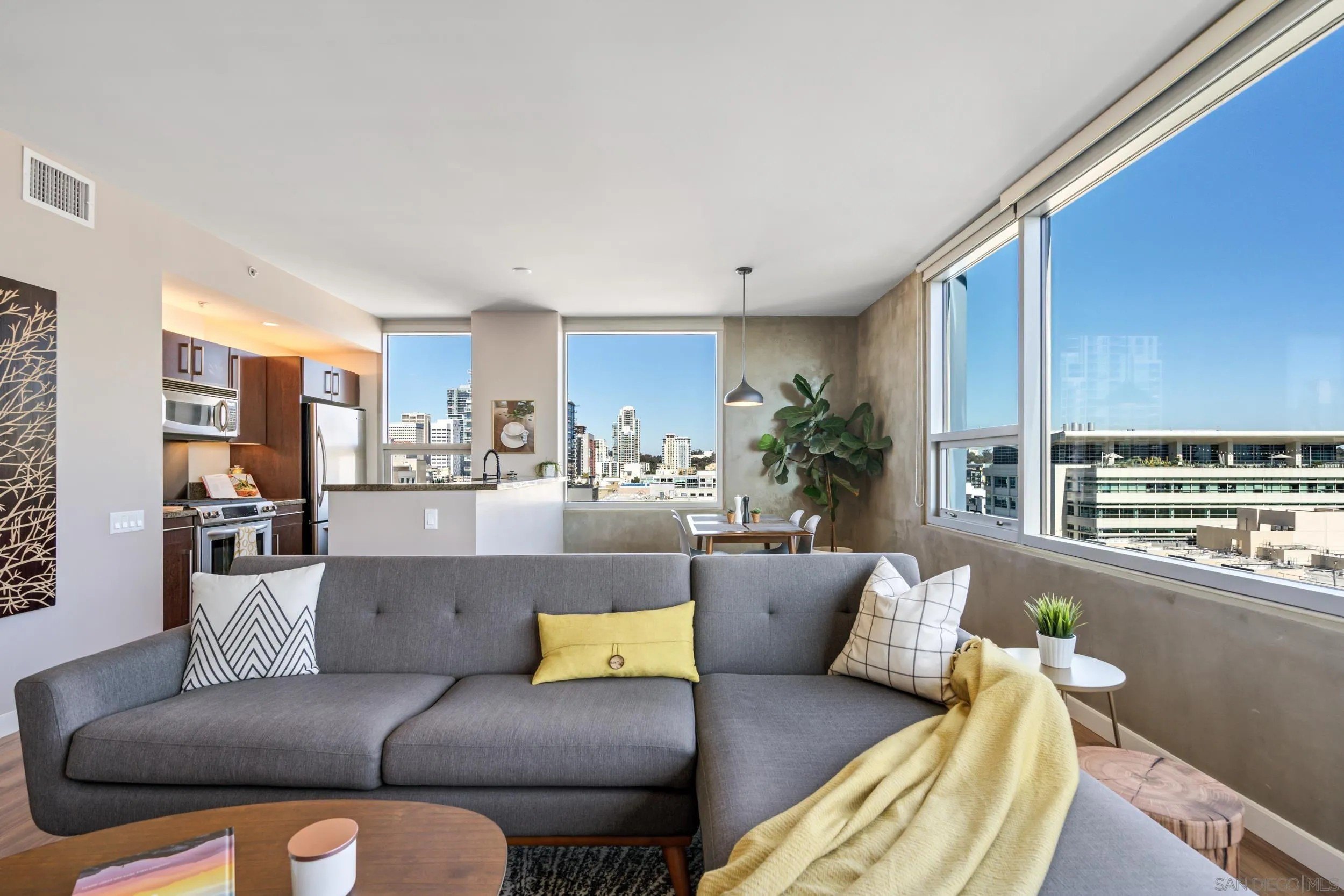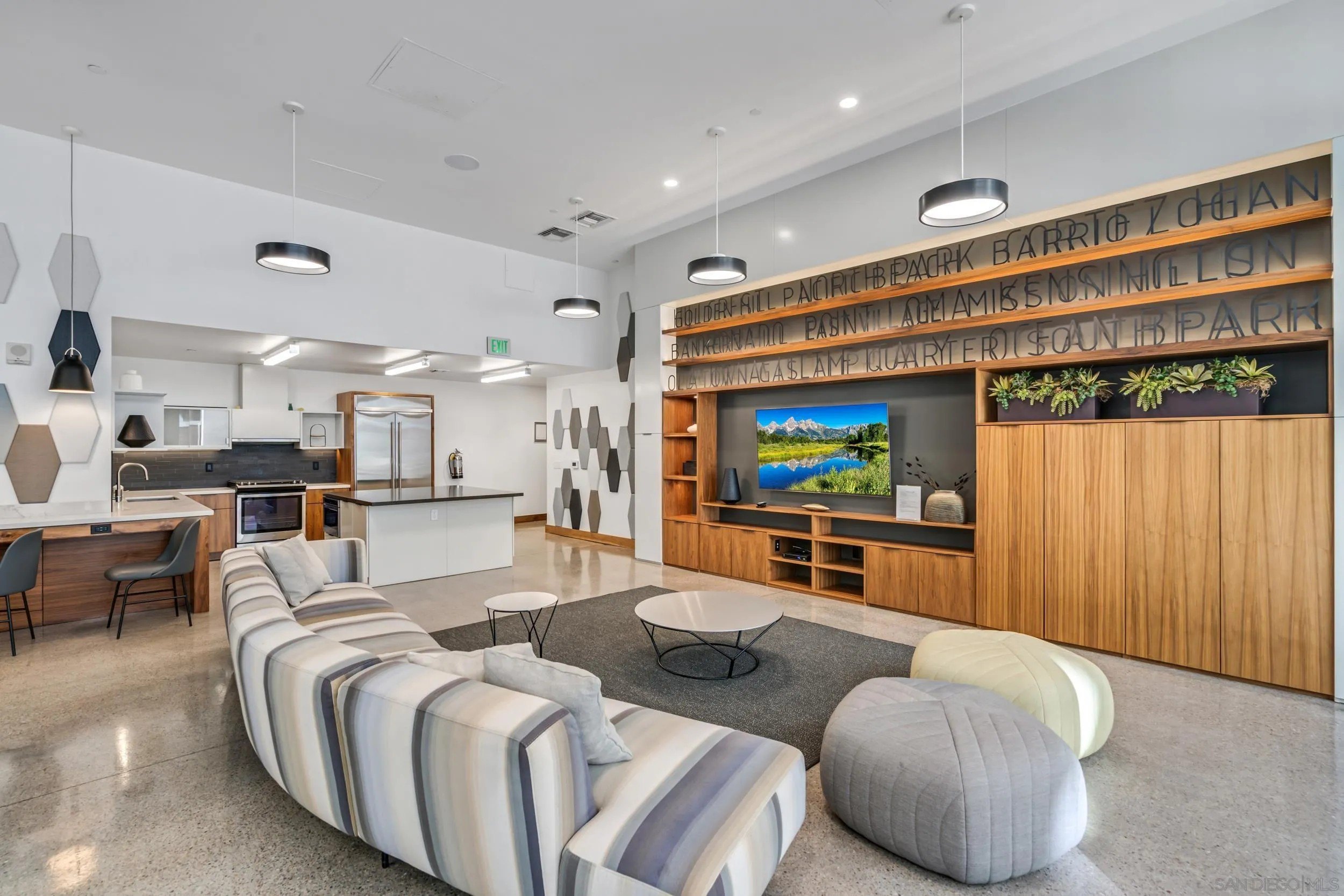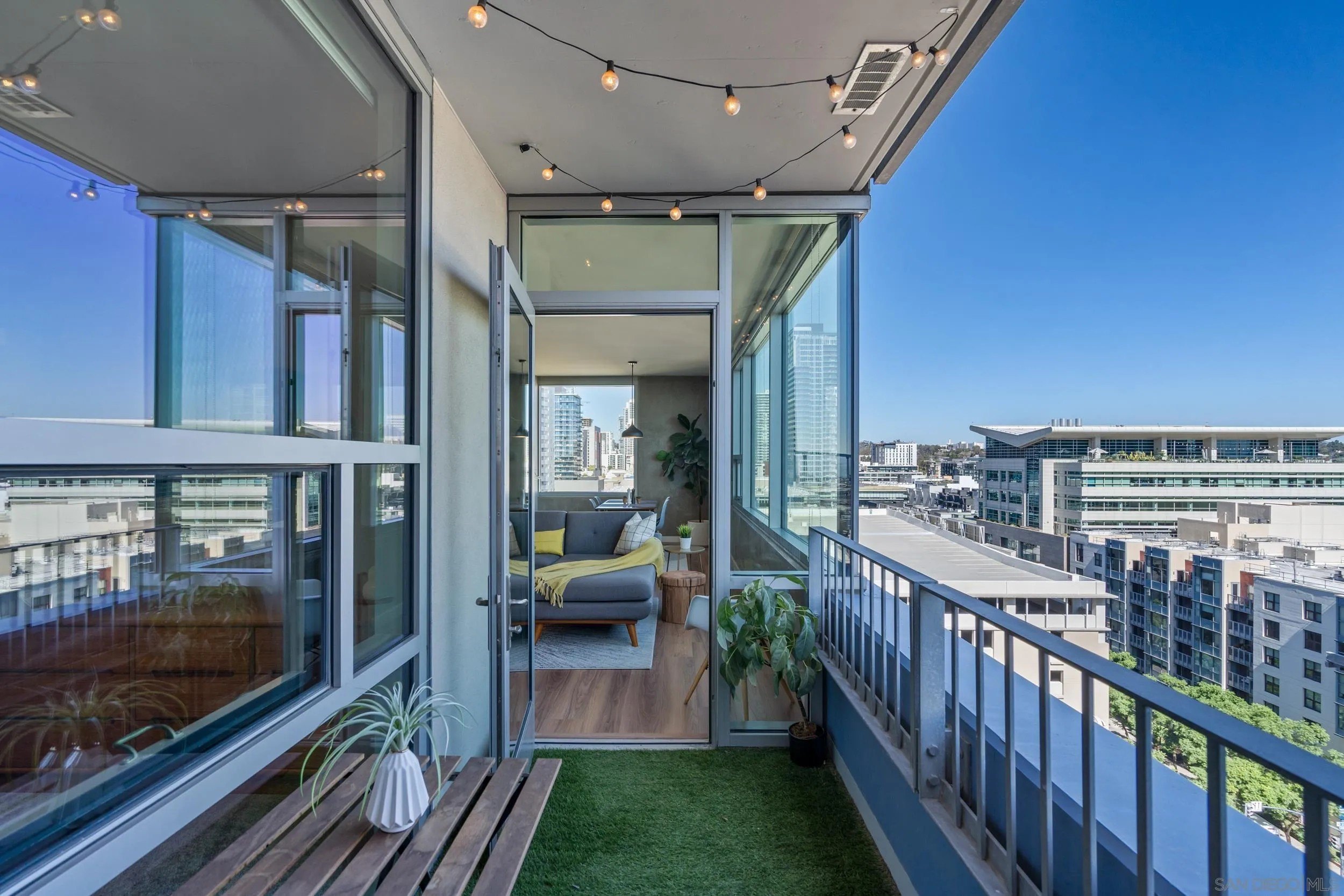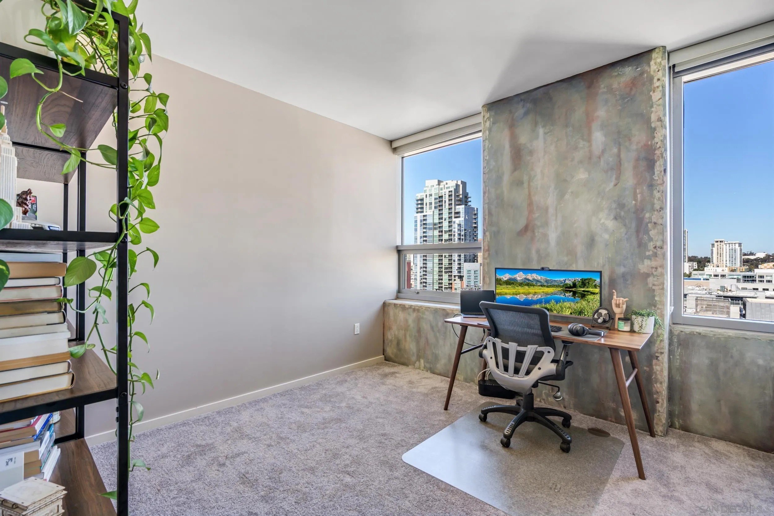 Experience elevated downtown living at ICON, where modern design meets timeless sophistication. This meticulously maintained and upgraded northeast corner residence showcases breathtaking panoramic views of the San Diego Bay, Coronado Bridge, and the sparkling city skyline. Step through the entryway into a light-filled, open-concept floor plan featuring new carpet, wood-look flooring, and fresh designer paint throughout. The gourmet kitchen impresses with stainless steel appliances, sleek granite countertops, and ample cabinetry-perfect for both casual dining and entertaining. The serene primary suite includes a fully built-out closet and a beautifully finished bath with dual vanities. Modern urban comforts include in-unit laundry, two parking spaces, and a private storage unit, providing both convenience and functionality to your downtown lifestyle. ICON is a VA-approved community offering resort-style amenities such as a 24-hour front desk attendant, state-of-the-art fitness center, and the iconic rooftop Skybox terrace with lounge seating, TVs, surround sound, BBQs, heaters, and panoramic city views. Additional amenities include the 5th Inning community recreation room with a full kitchen and business center, a private movie theater, community fireplace, bike and package storage with Amazon lockers, and an interior courtyard featuring sculptural art, a waterfall element, and modern landscaping. Residents also enjoy Google Fiber high-speed internet, on-site property management, and a sleek, contemporary lobby entrance.