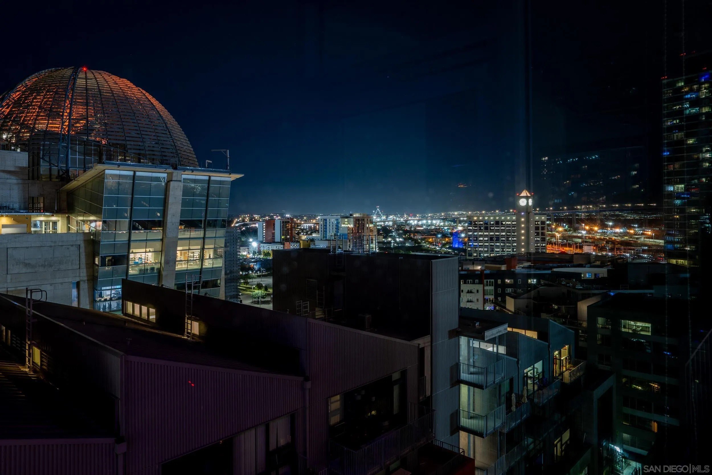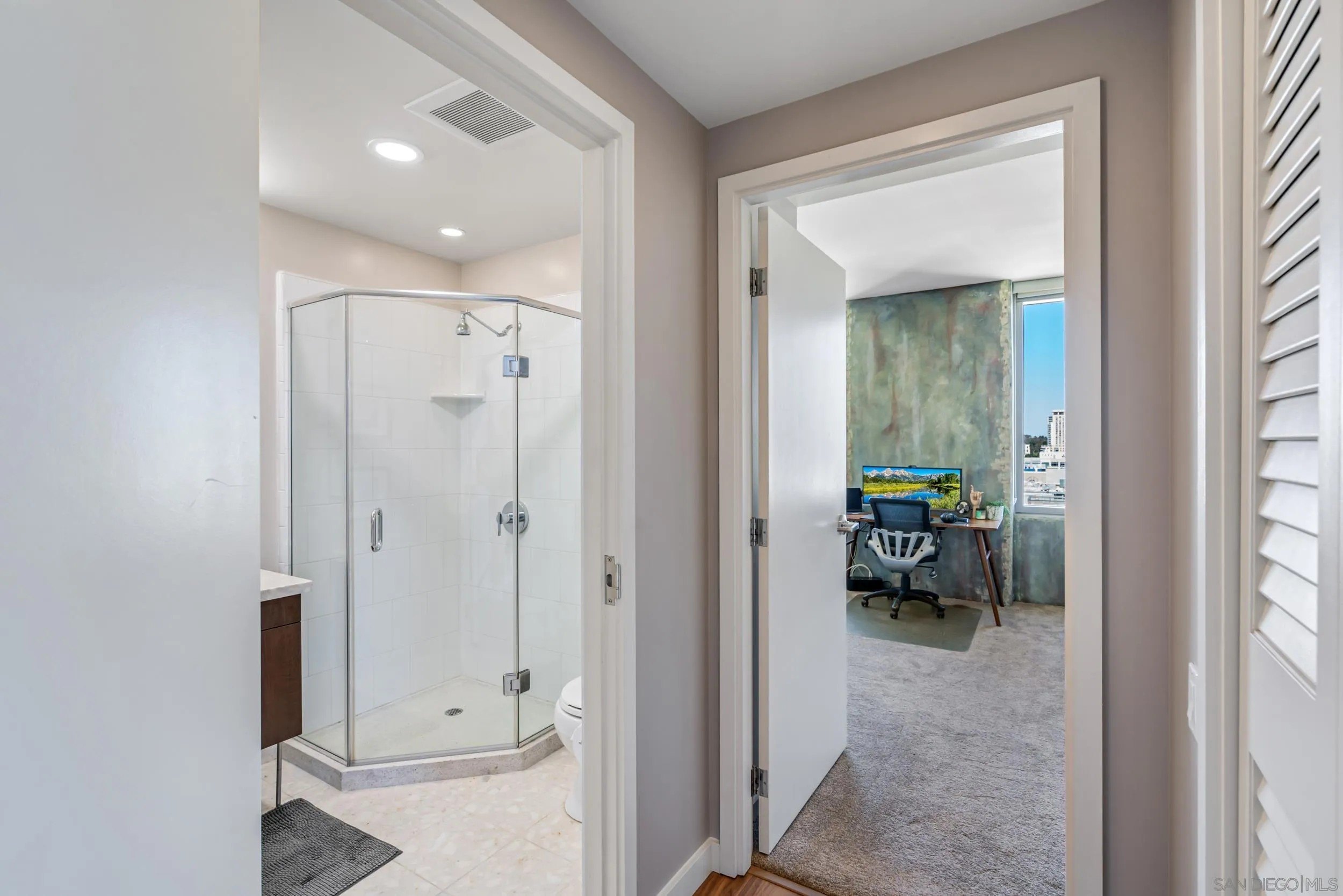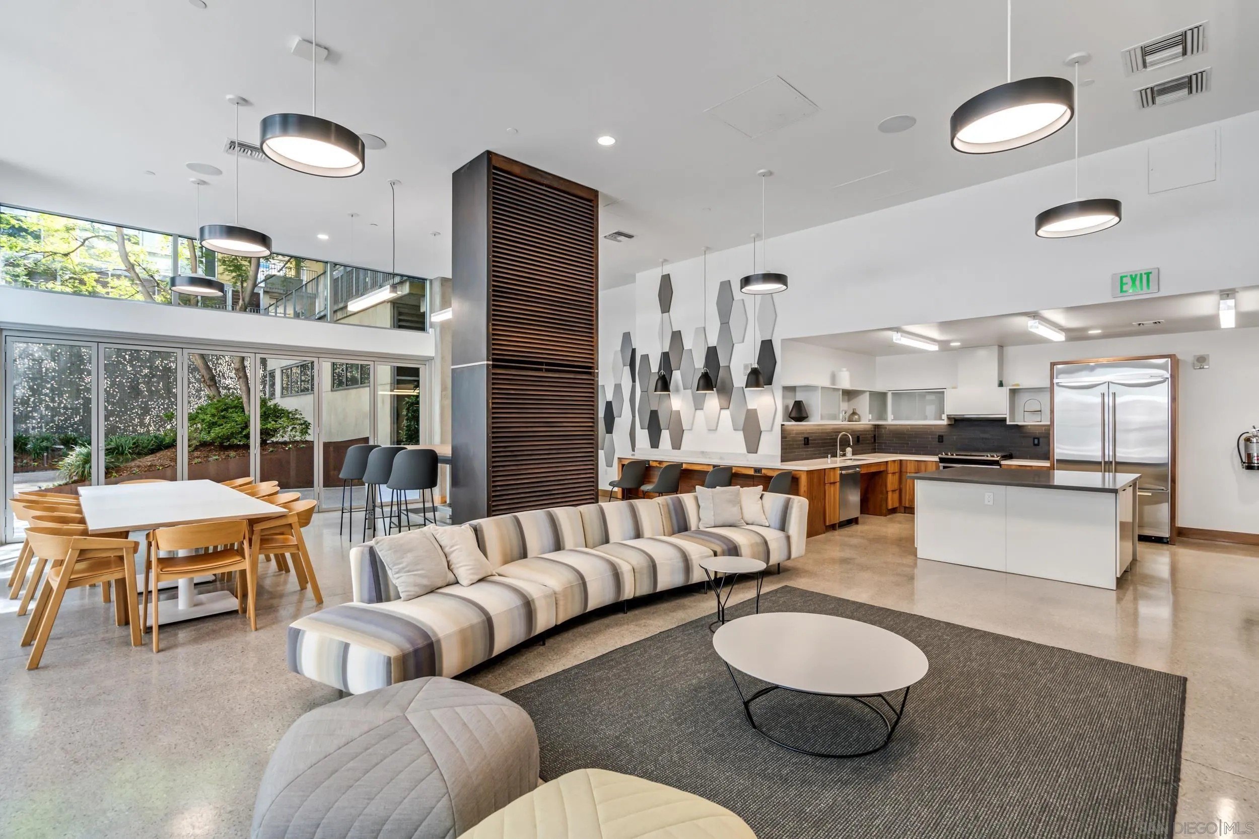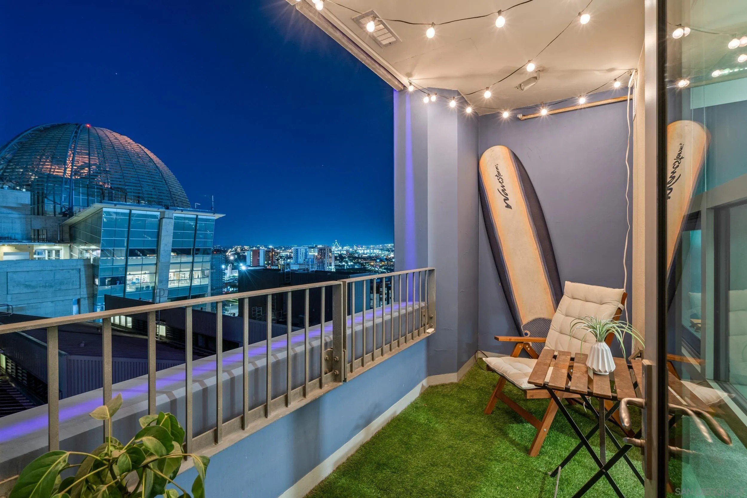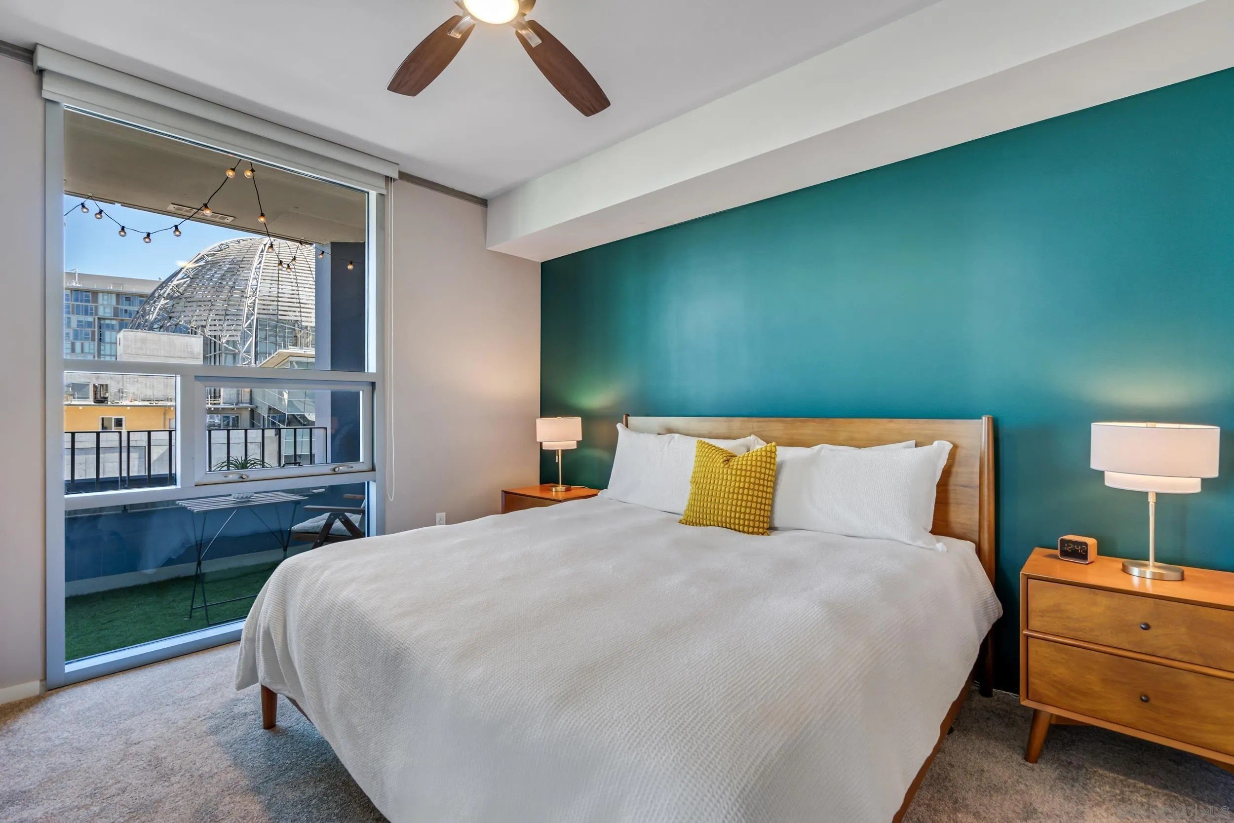 Experience elevated downtown living at ICON, where modern design meets timeless sophistication. This meticulously maintained and upgraded northeast corner residence showcases breathtaking panoramic views of the San Diego Bay, Coronado Bridge, and the sparkling city skyline. Step through the entryway into a light-filled, open-concept floor plan featuring new carpet, wood-look flooring, and fresh designer paint throughout. The gourmet kitchen impresses with stainless steel appliances, sleek granite countertops, and ample cabinetry-perfect for both casual dining and entertaining. The serene primary suite includes a fully built-out closet and a beautifully finished bath with dual vanities. Modern urban comforts include in-unit laundry, two parking spaces, and a private storage unit, providing both convenience and functionality to your downtown lifestyle. ICON is a VA-approved community offering resort-style amenities such as a 24-hour front desk attendant, state-of-the-art fitness center, and the iconic rooftop Skybox terrace with lounge seating, TVs, surround sound, BBQs, heaters, and panoramic city views. Additional amenities include the 5th Inning community recreation room with a full kitchen and business center, a private movie theater, community fireplace, bike and package storage with Amazon lockers, and an interior courtyard featuring sculptural art, a waterfall element, and modern landscaping. Residents also enjoy Google Fiber high-speed internet, on-site property management, and a sleek, contemporary lobby entrance.