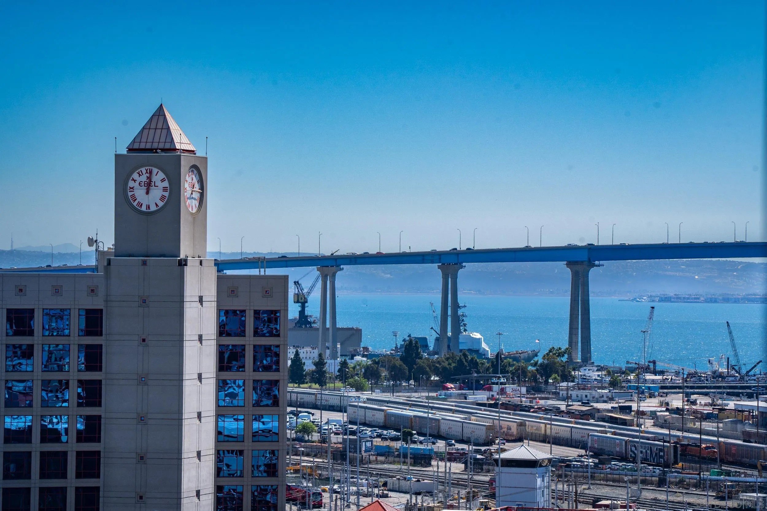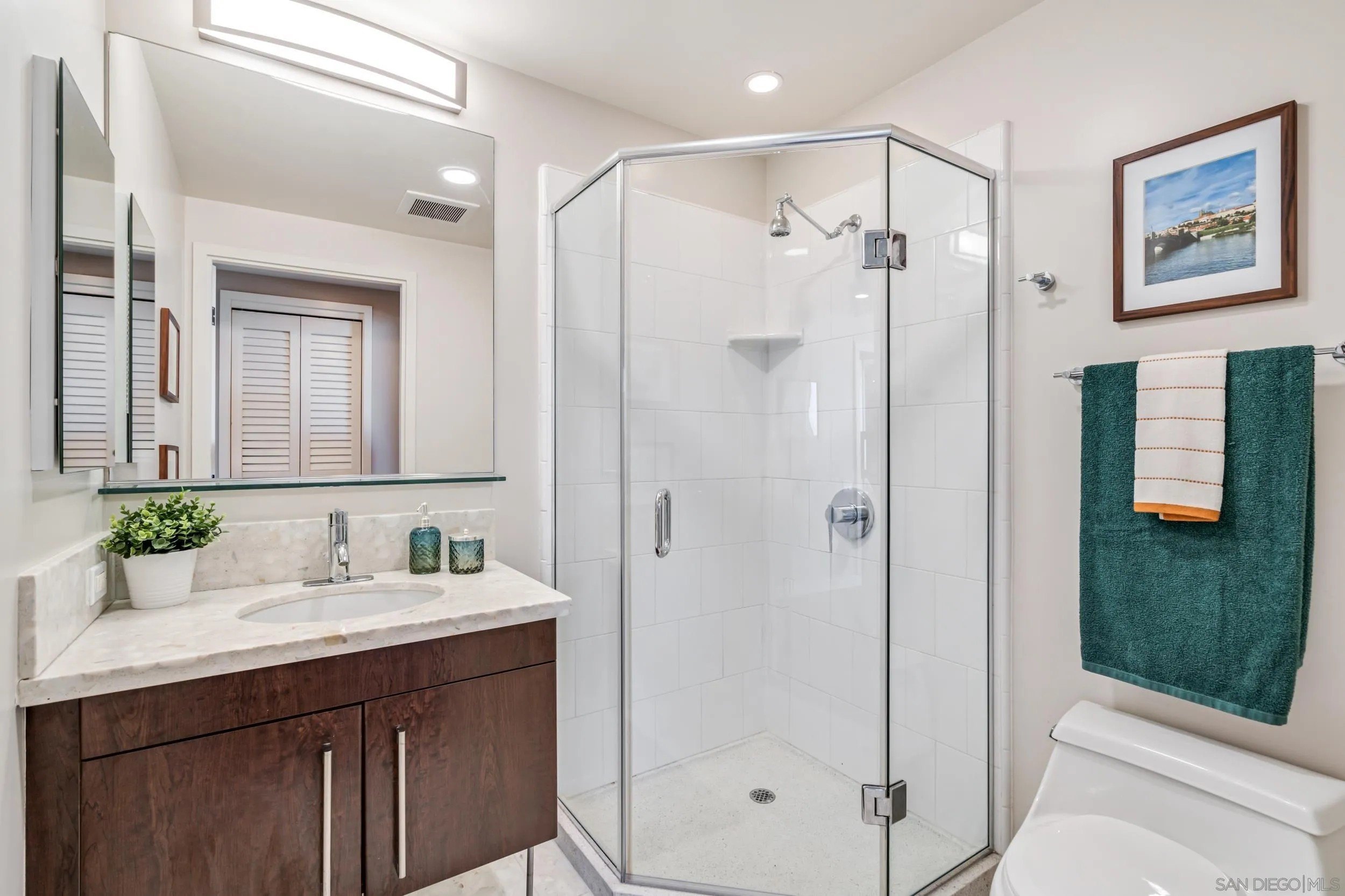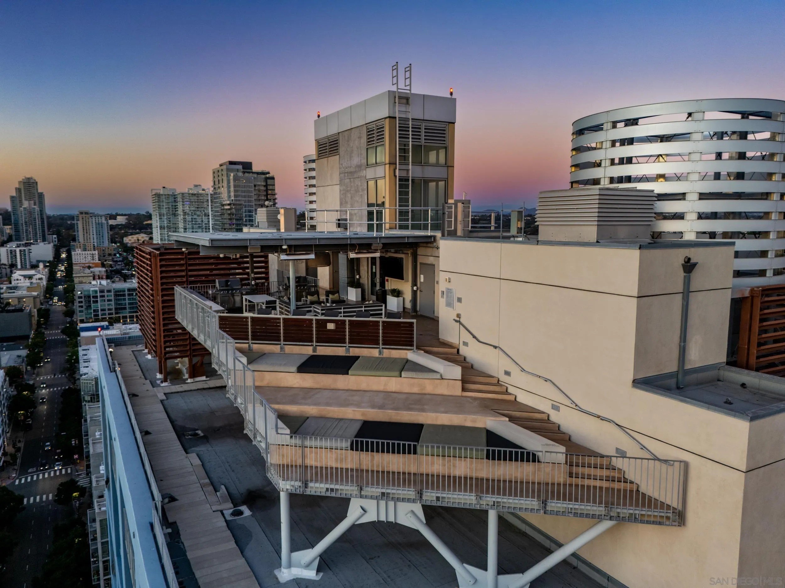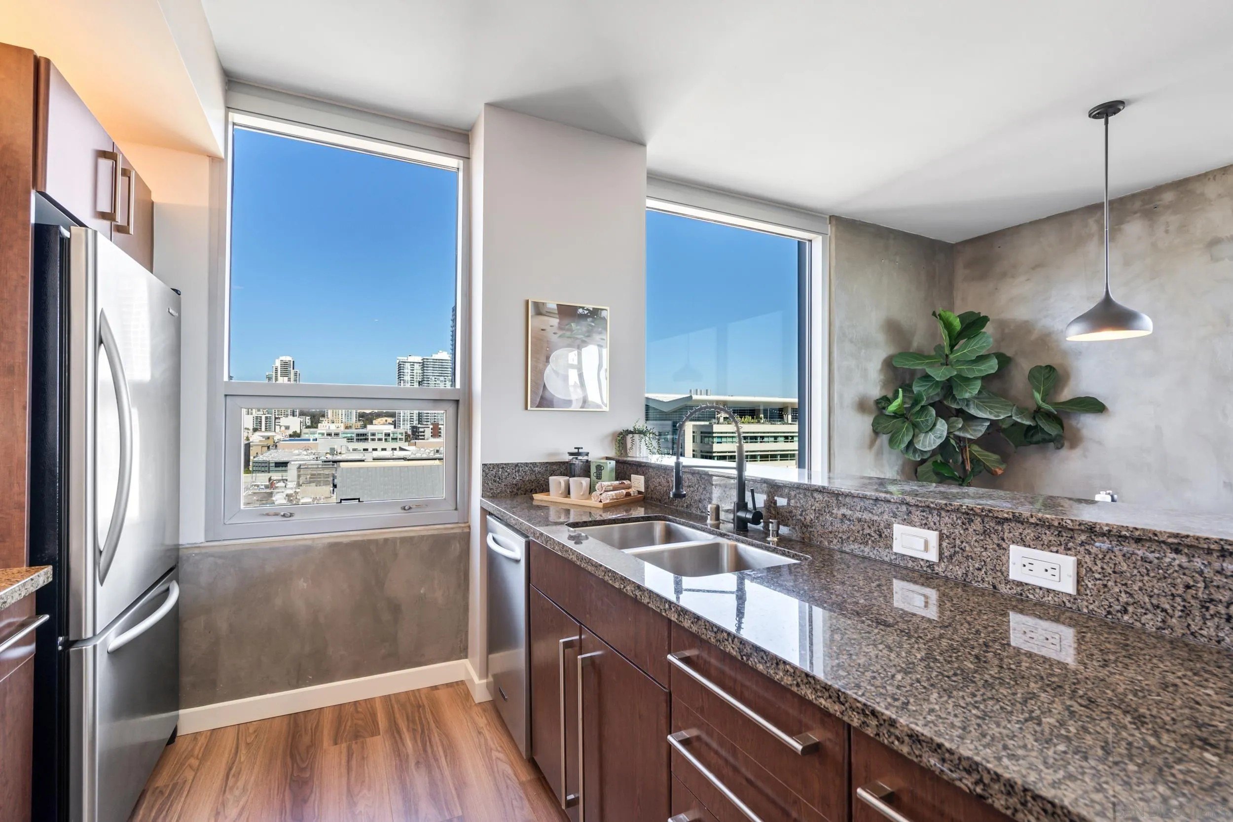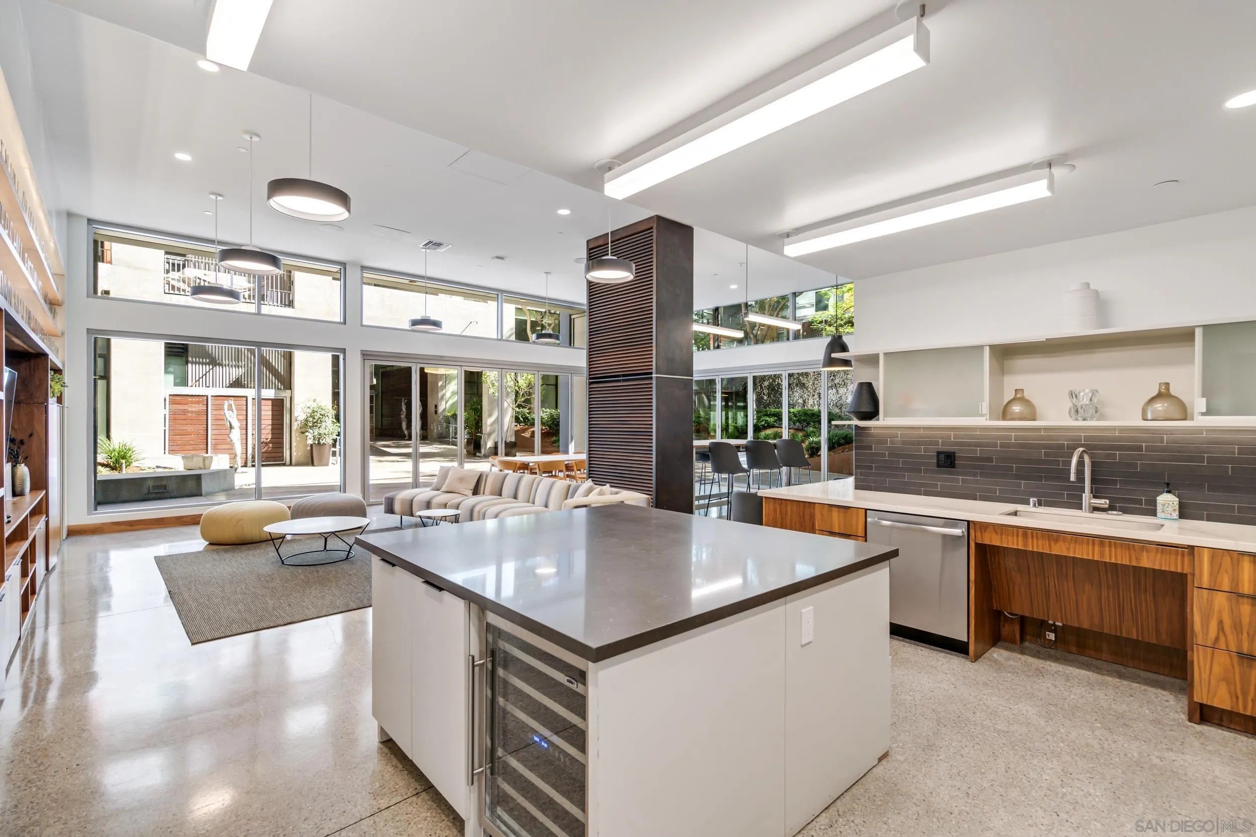Experience elevated downtown living at ICON, where modern design meets timeless sophistication. This meticulously maintained and upgraded northeast corner residence showcases breathtaking panoramic views of the San Diego Bay, Coronado Bridge, and the sparkling city skyline. Step through the entryway into a light-filled, open-concept floor plan featuring new carpet, wood-look flooring, and fresh designer paint throughout. The gourmet kitchen impresses with stainless steel appliances, sleek granite countertops, and ample cabinetry-perfect for both casual dining and entertaining. The serene primary suite includes a fully built-out closet and a beautifully finished bath with dual vanities. Modern urban comforts include in-unit laundry, two parking spaces, and a private storage unit, providing both convenience and functionality to your downtown lifestyle. ICON is a VA-approved community offering resort-style amenities such as a 24-hour front desk attendant, state-of-the-art fitness center, and the iconic rooftop Skybox terrace with lounge seating, TVs, surround sound, BBQs, heaters, and panoramic city views. Additional amenities include the 5th Inning community recreation room with a full kitchen and business center, a private movie theater, community fireplace, bike and package storage with Amazon lockers, and an interior courtyard featuring sculptural art, a waterfall element, and modern landscaping. Residents also enjoy Google Fiber high-speed internet, on-site property management, and a sleek, contemporary lobby entrance.