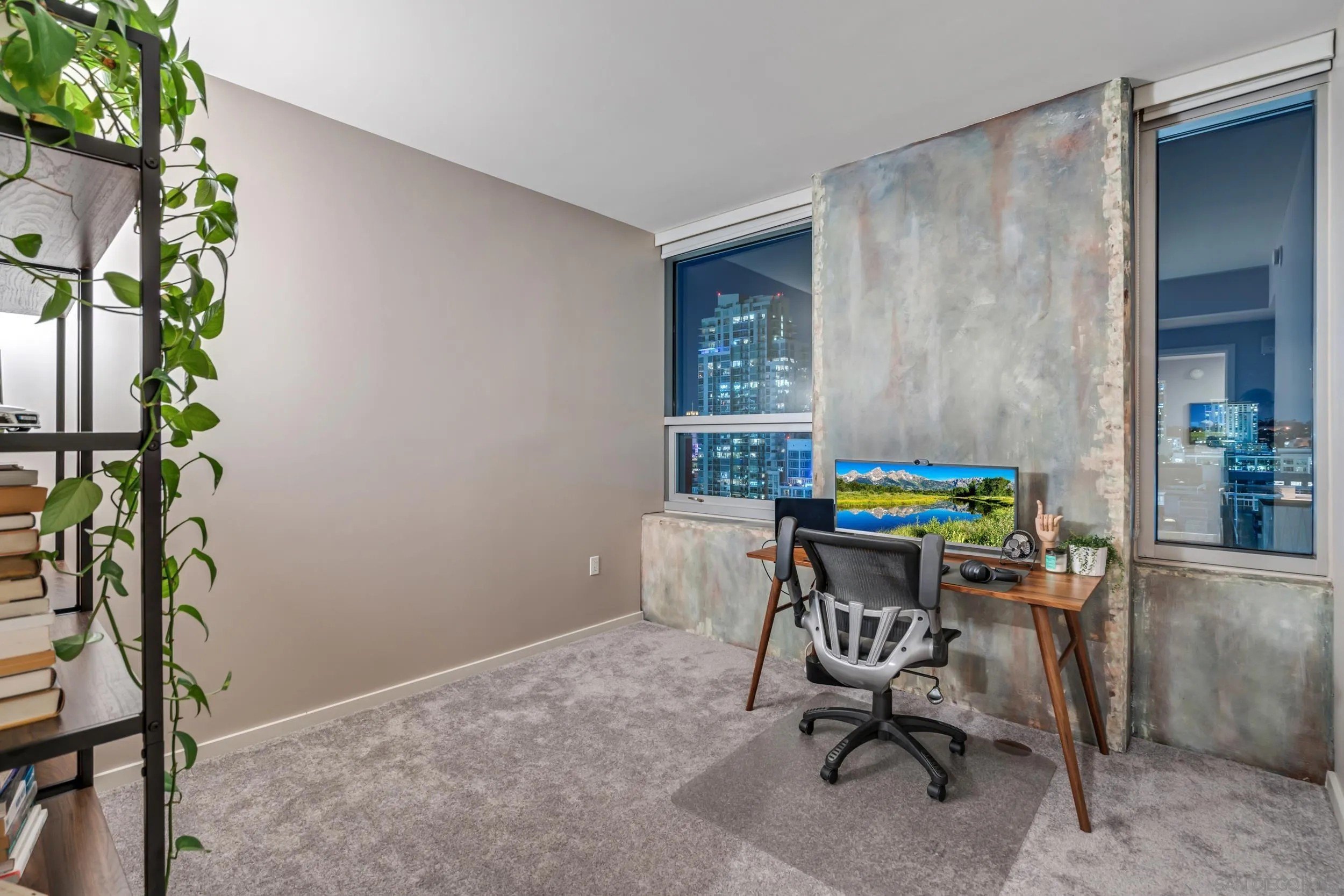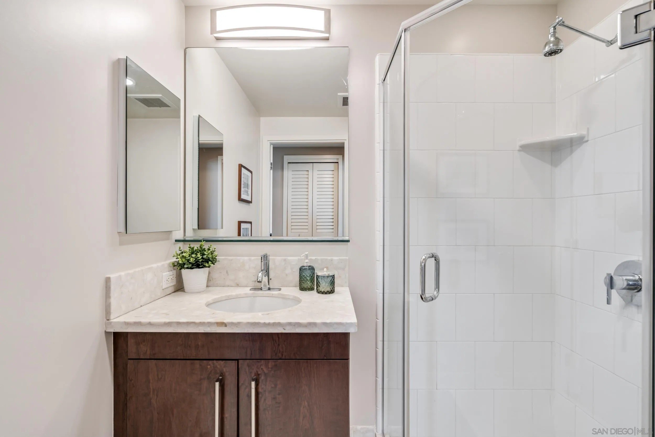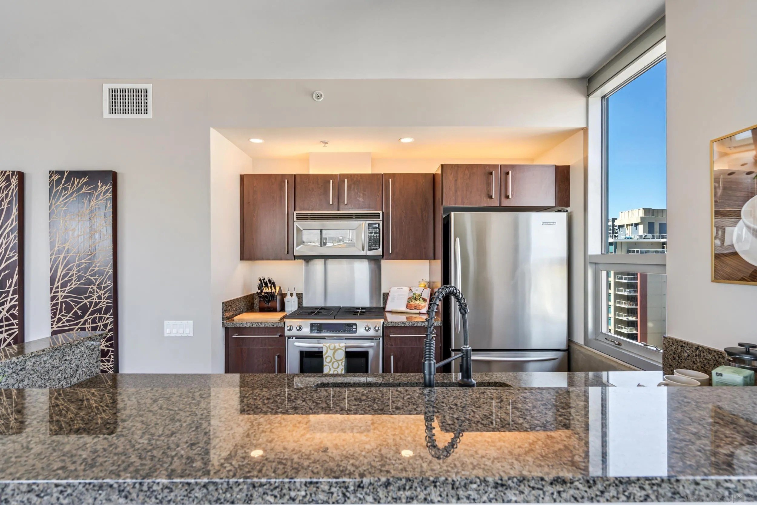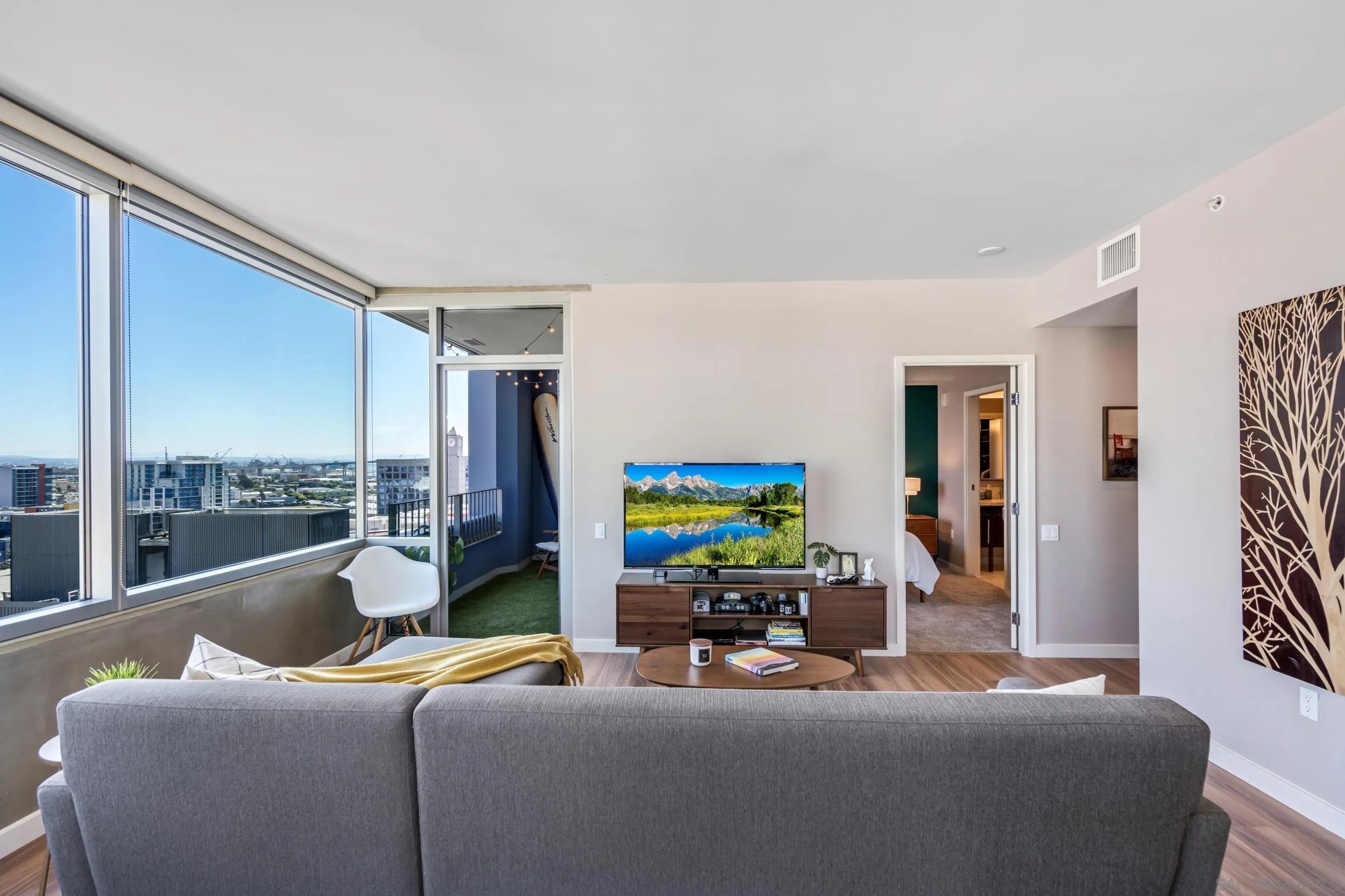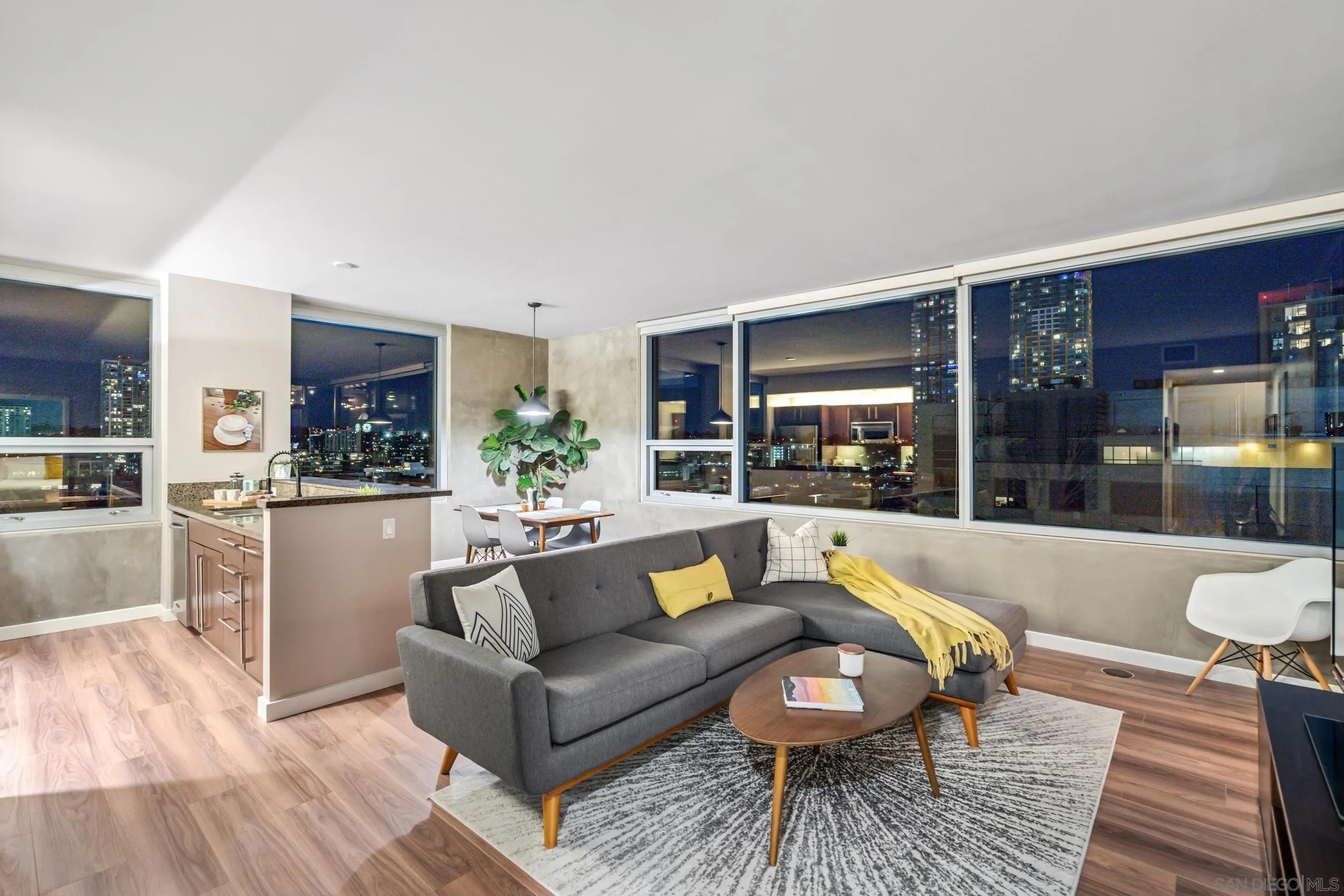 Experience elevated downtown living at ICON, where modern design meets timeless sophistication. This meticulously maintained and upgraded northeast corner residence showcases breathtaking panoramic views of the San Diego Bay, Coronado Bridge, and the sparkling city skyline. Step through the entryway into a light-filled, open-concept floor plan featuring new carpet, wood-look flooring, and fresh designer paint throughout. The gourmet kitchen impresses with stainless steel appliances, sleek granite countertops, and ample cabinetry-perfect for both casual dining and entertaining. The serene primary suite includes a fully built-out closet and a beautifully finished bath with dual vanities. Modern urban comforts include in-unit laundry, two parking spaces, and a private storage unit, providing both convenience and functionality to your downtown lifestyle. ICON is a VA-approved community offering resort-style amenities such as a 24-hour front desk attendant, state-of-the-art fitness center, and the iconic rooftop Skybox terrace with lounge seating, TVs, surround sound, BBQs, heaters, and panoramic city views. Additional amenities include the 5th Inning community recreation room with a full kitchen and business center, a private movie theater, community fireplace, bike and package storage with Amazon lockers, and an interior courtyard featuring sculptural art, a waterfall element, and modern landscaping. Residents also enjoy Google Fiber high-speed internet, on-site property management, and a sleek, contemporary lobby entrance.