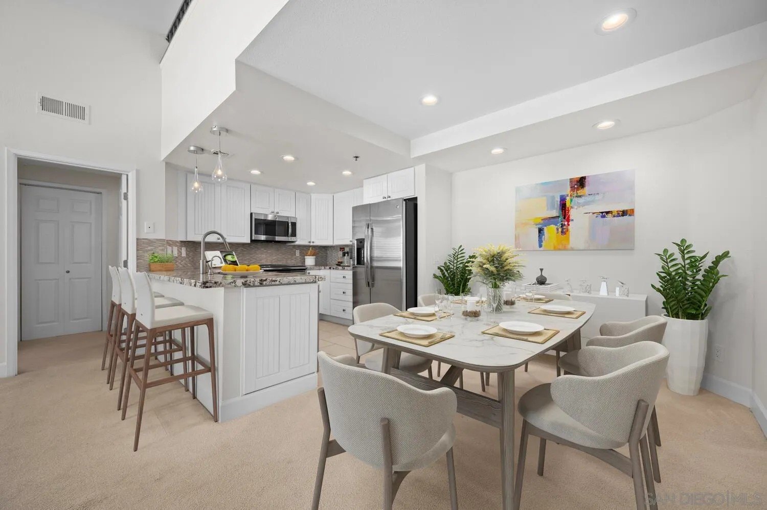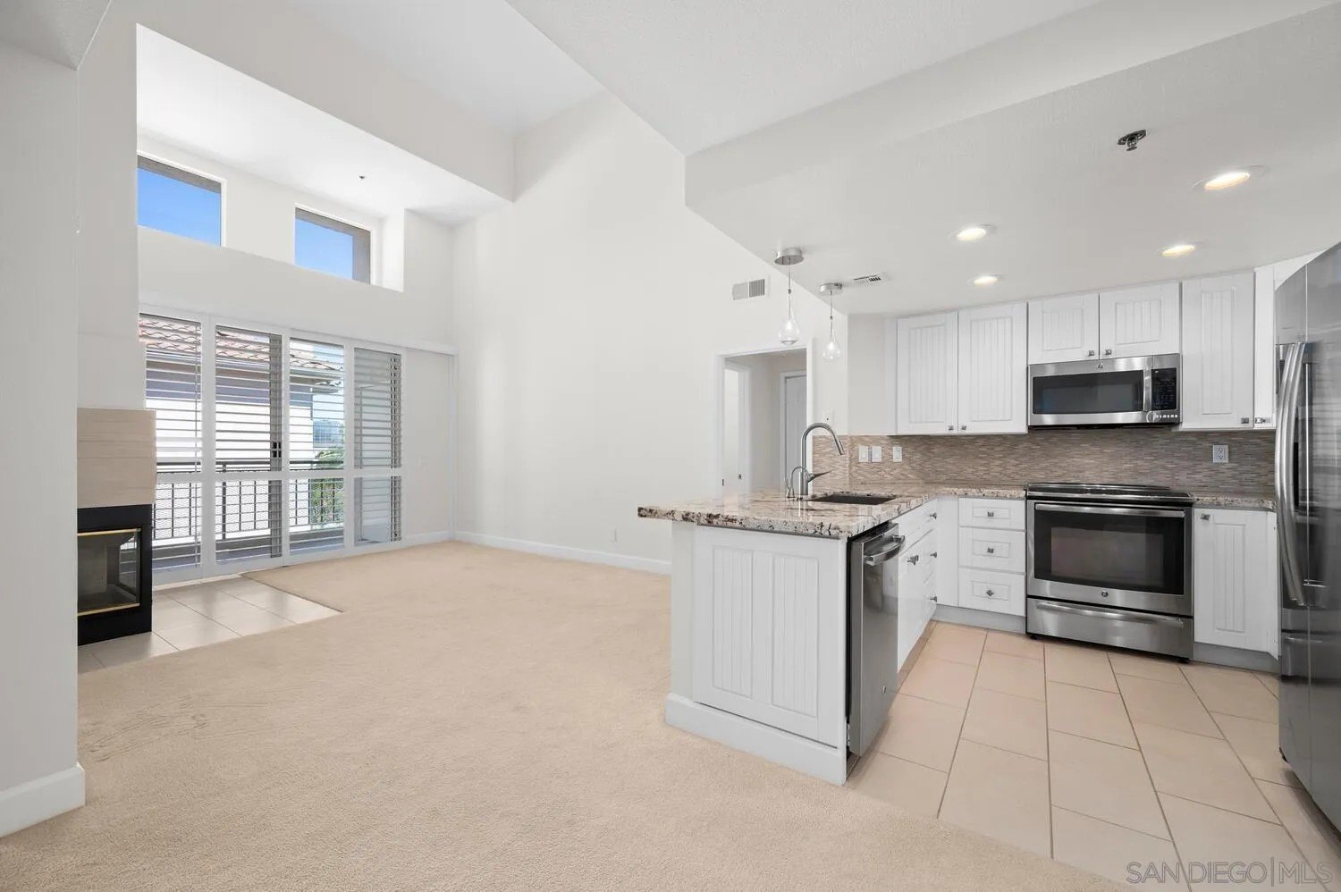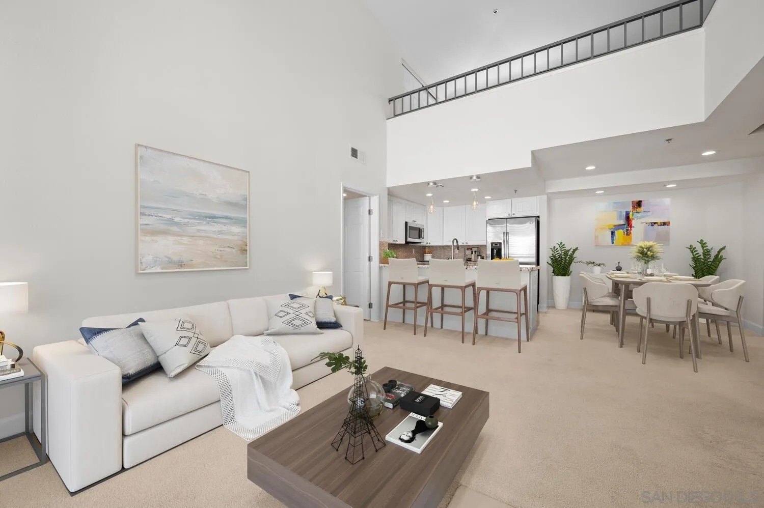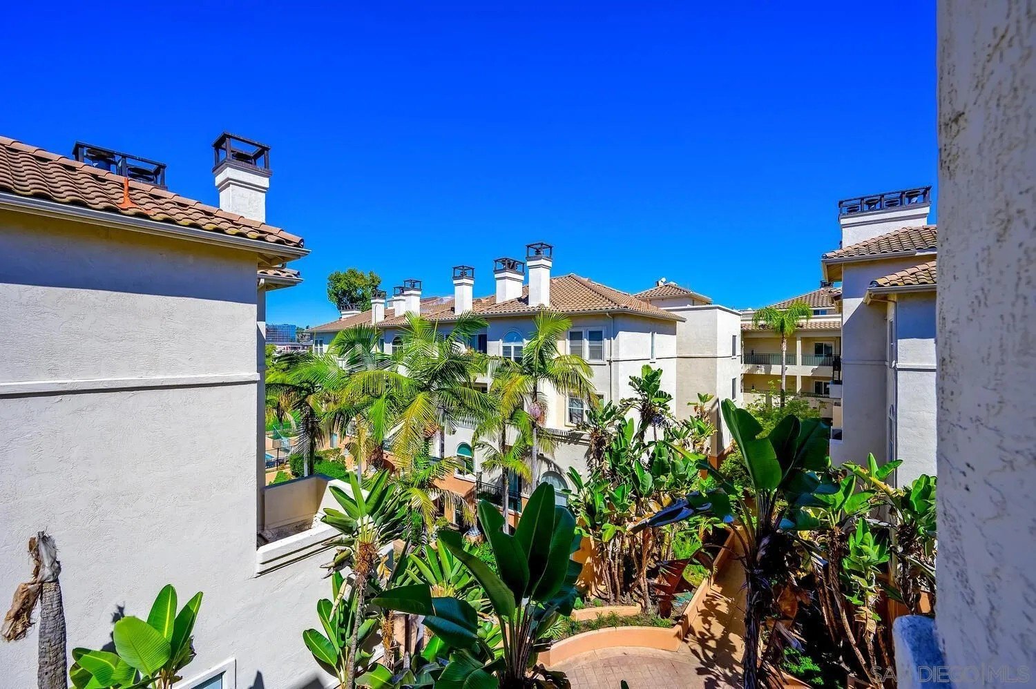 Experience elevated living in the heart of Mission Valley in this stunning top-floor end-unit condominium. With only one shared wall, enjoy exceptional peace and quiet along with soaring vaulted ceilings and a private balcony that create an open and airy atmosphere with tranquil views of the community's inner courtyard. The thoughtfully designed split floor plan features spacious primary and secondary suites on opposite sides of the home, separated by open-concept living areas for maximum privacy.